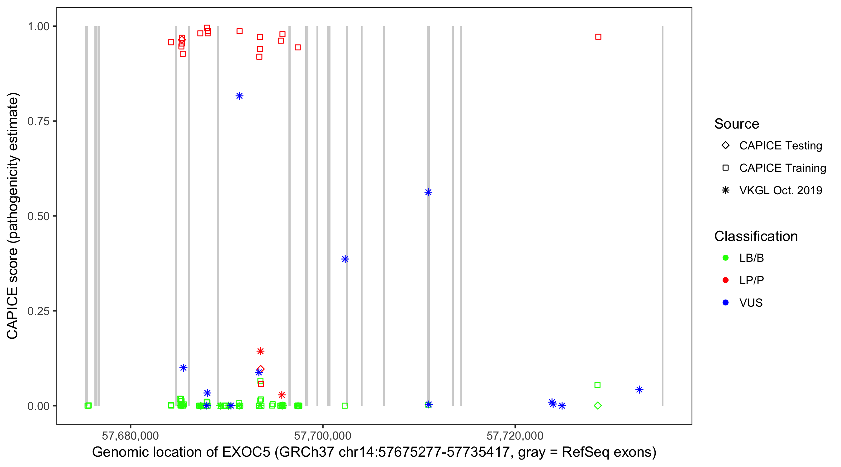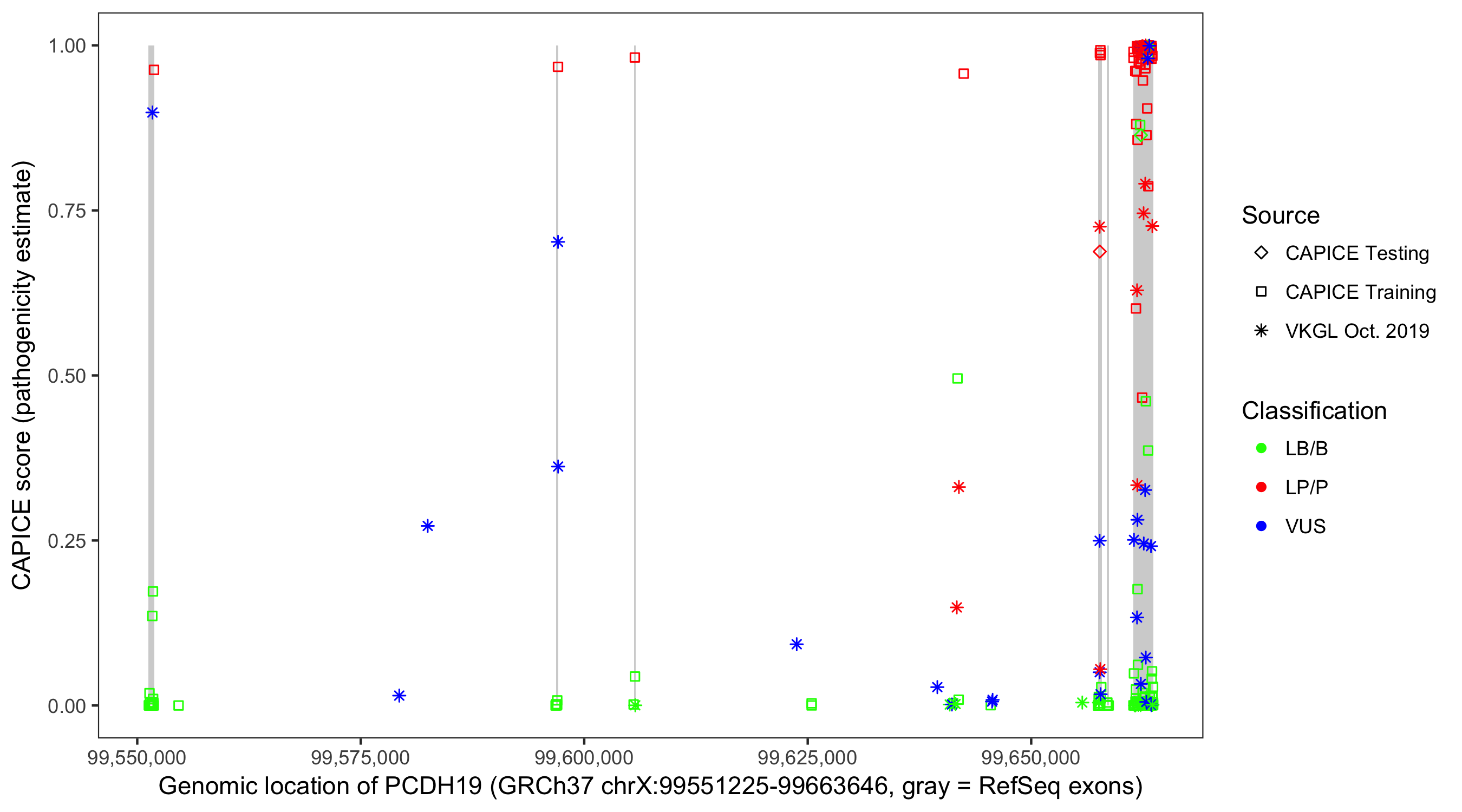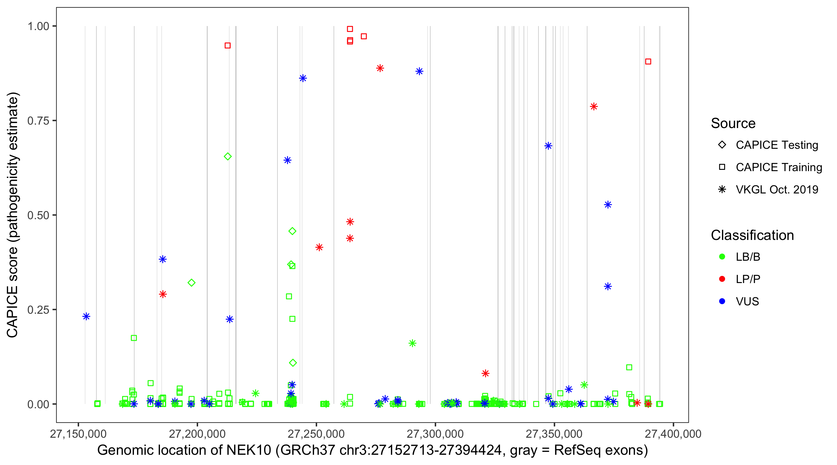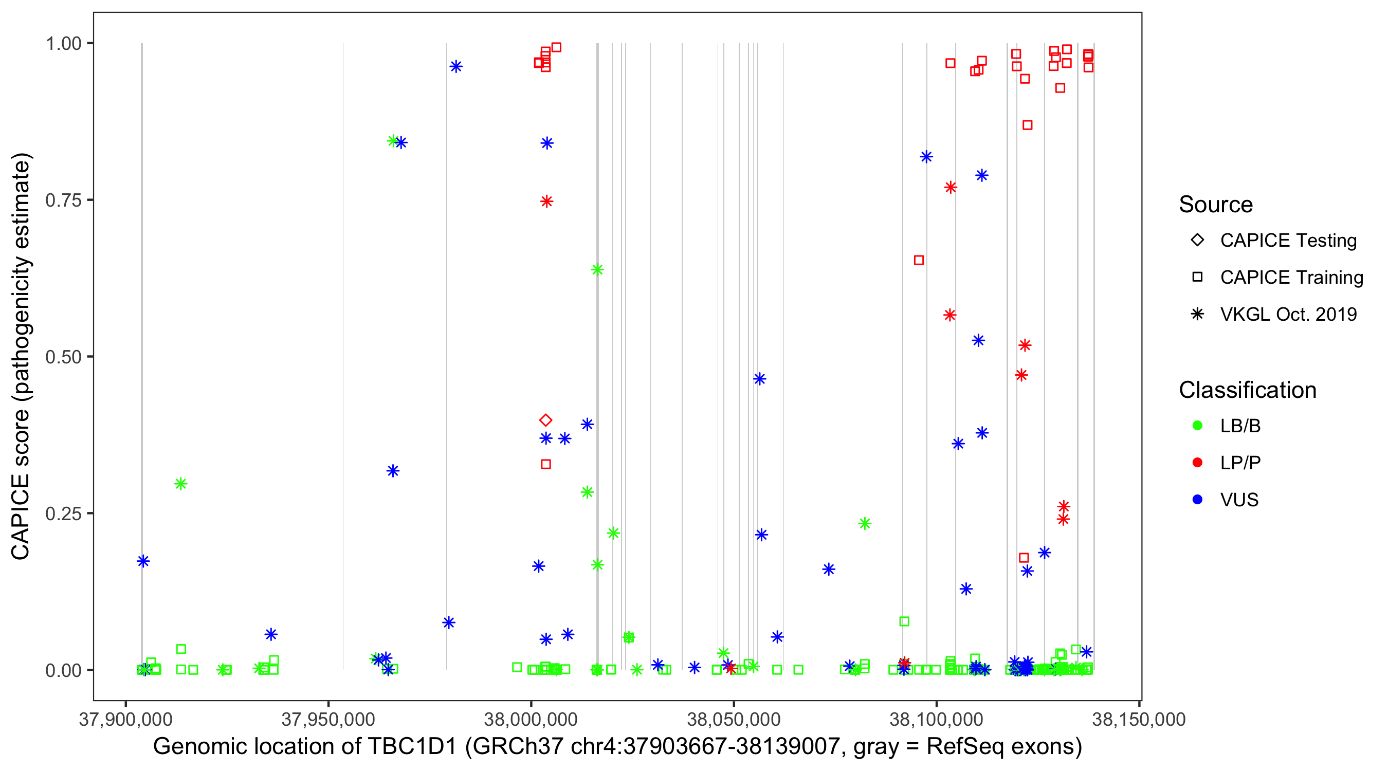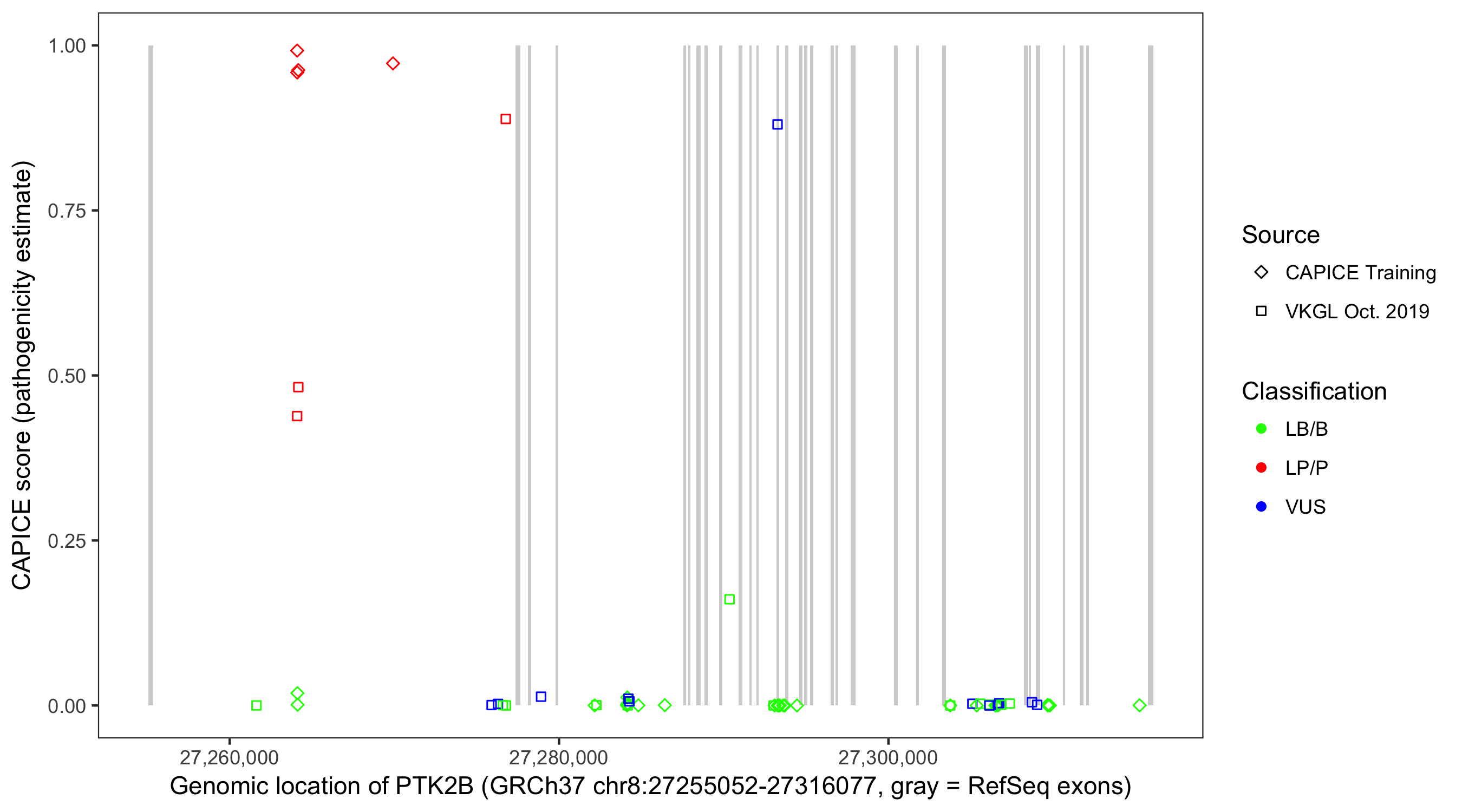 Shown are CAPICE train/test variants plus VKGL Oct 2019.