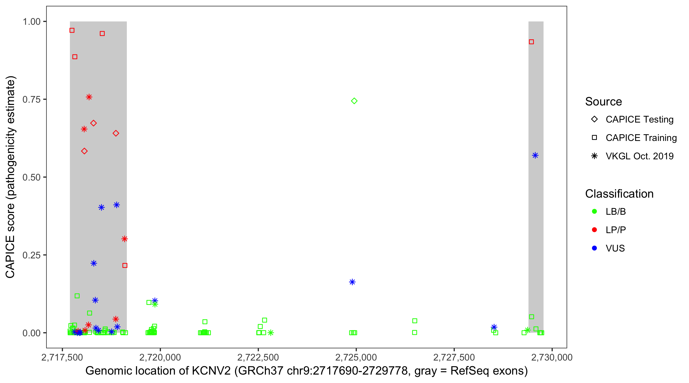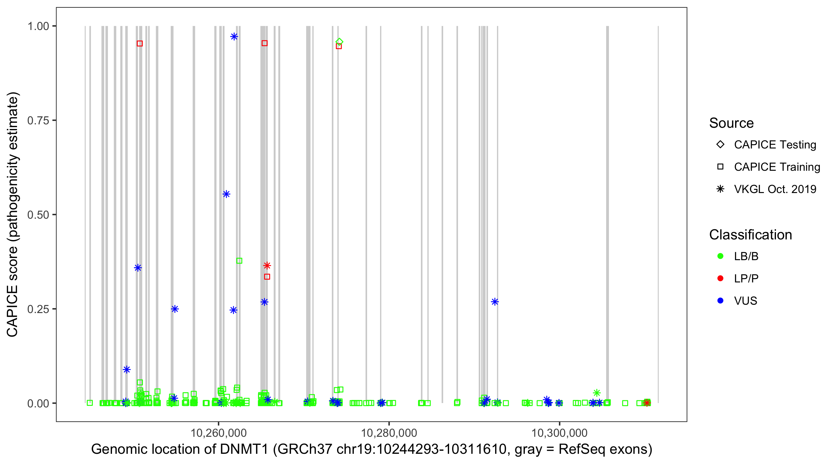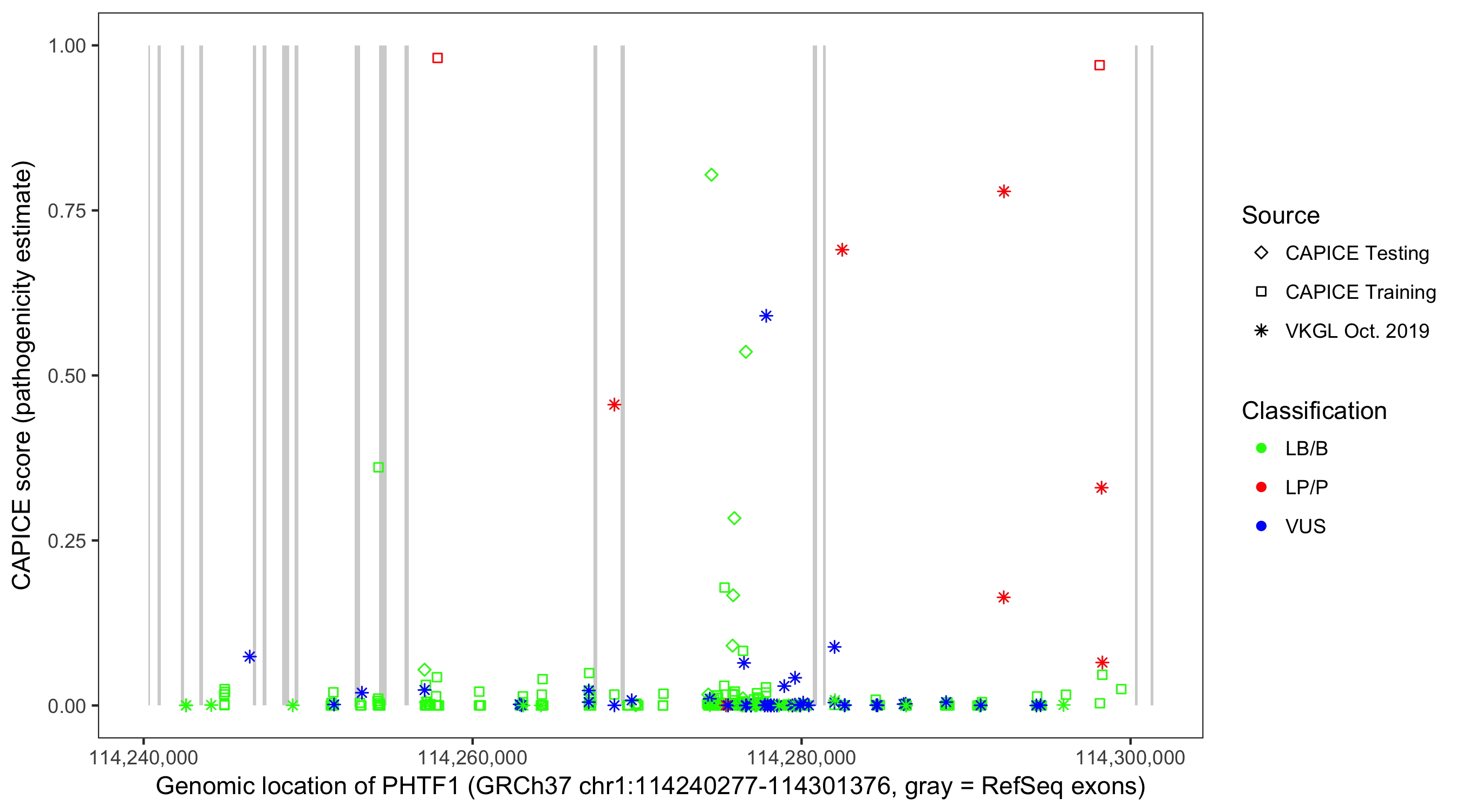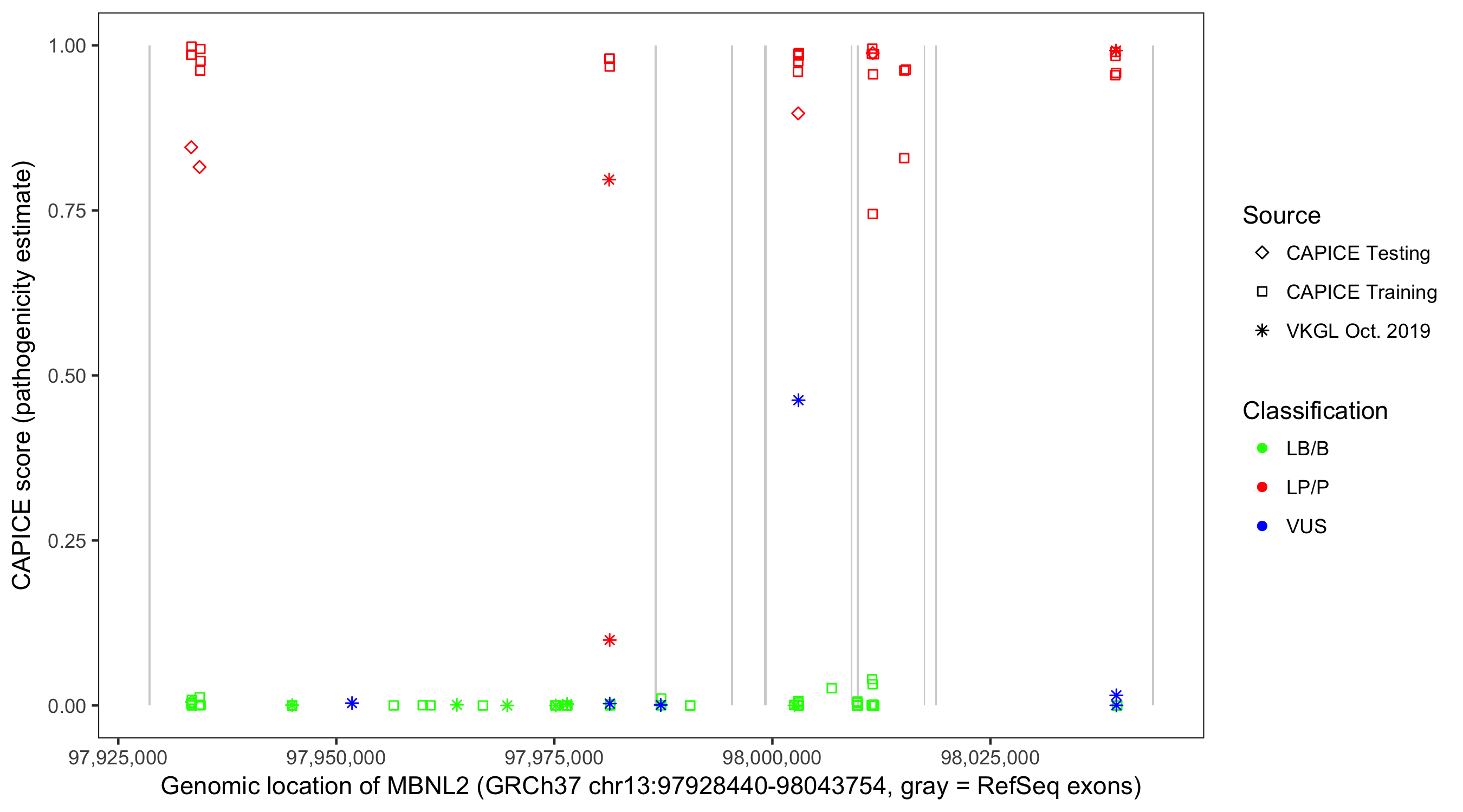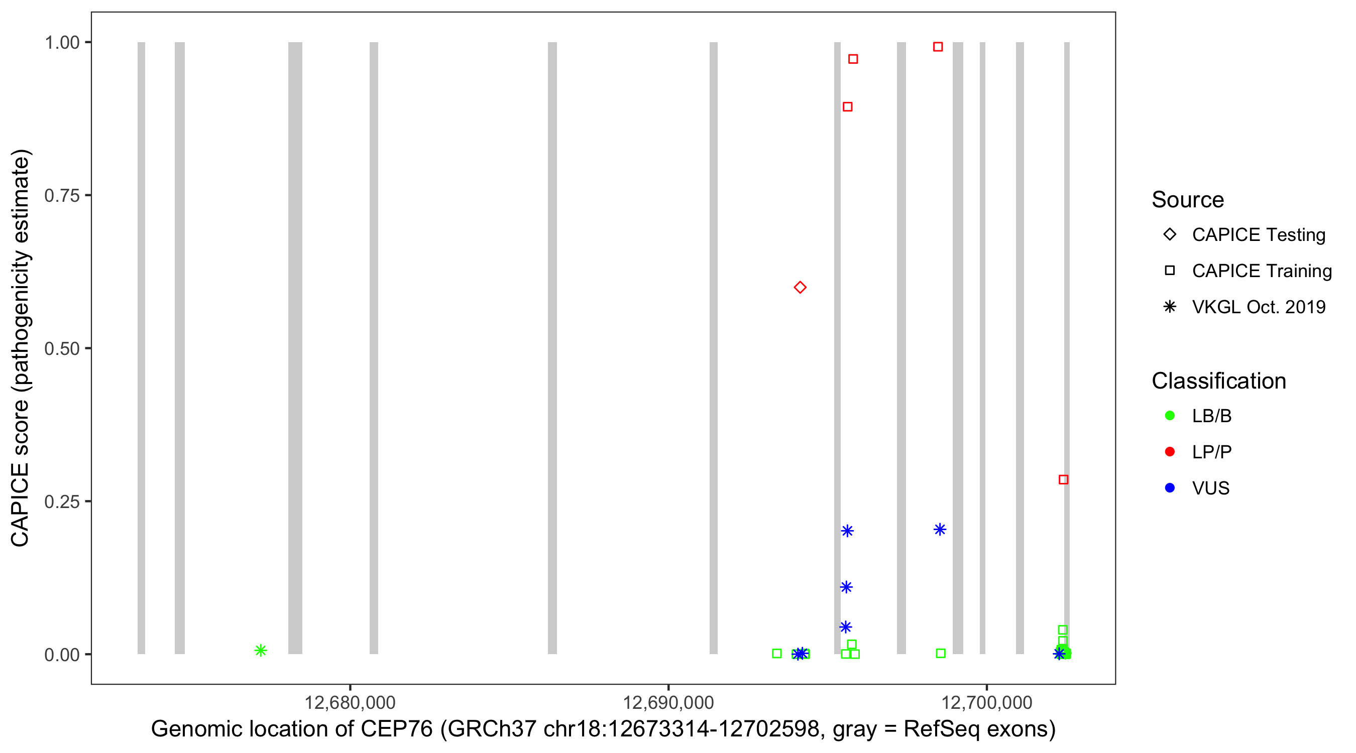 Shown are CAPICE train/test variants plus VKGL Oct 2019.