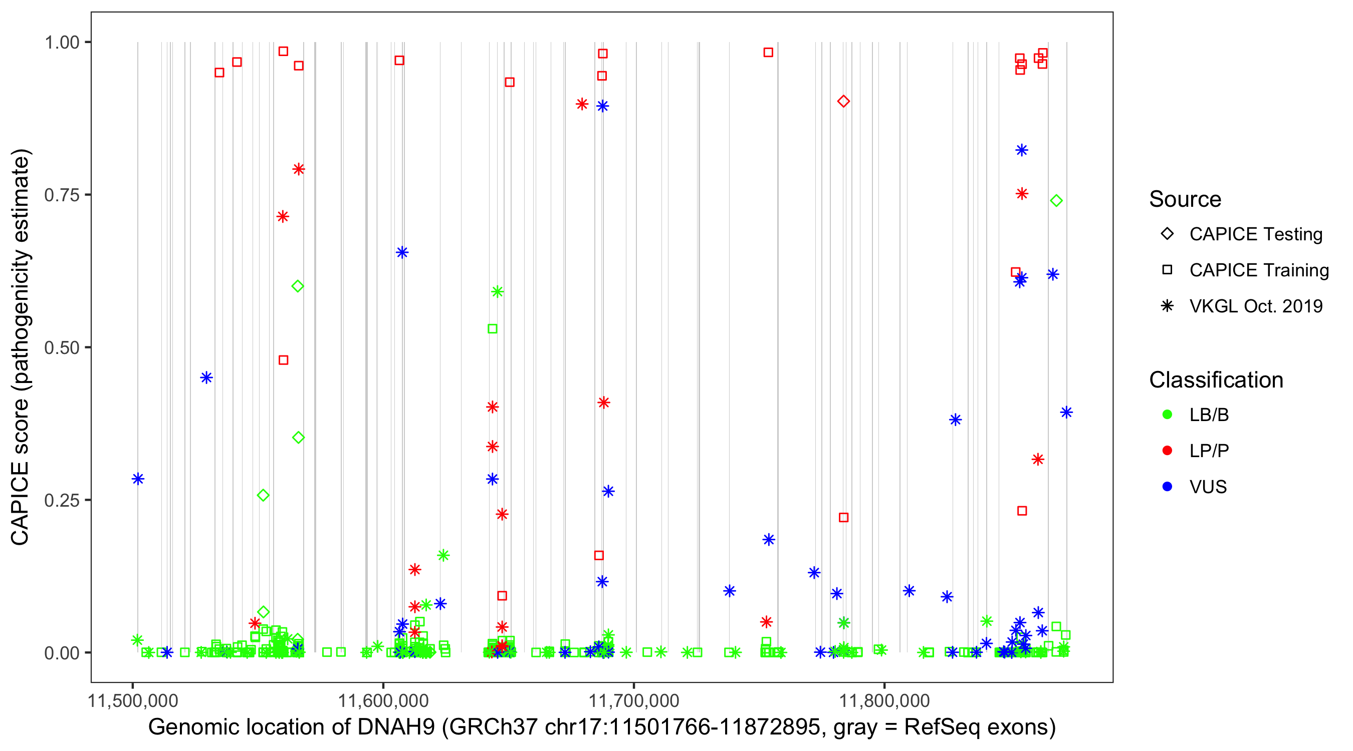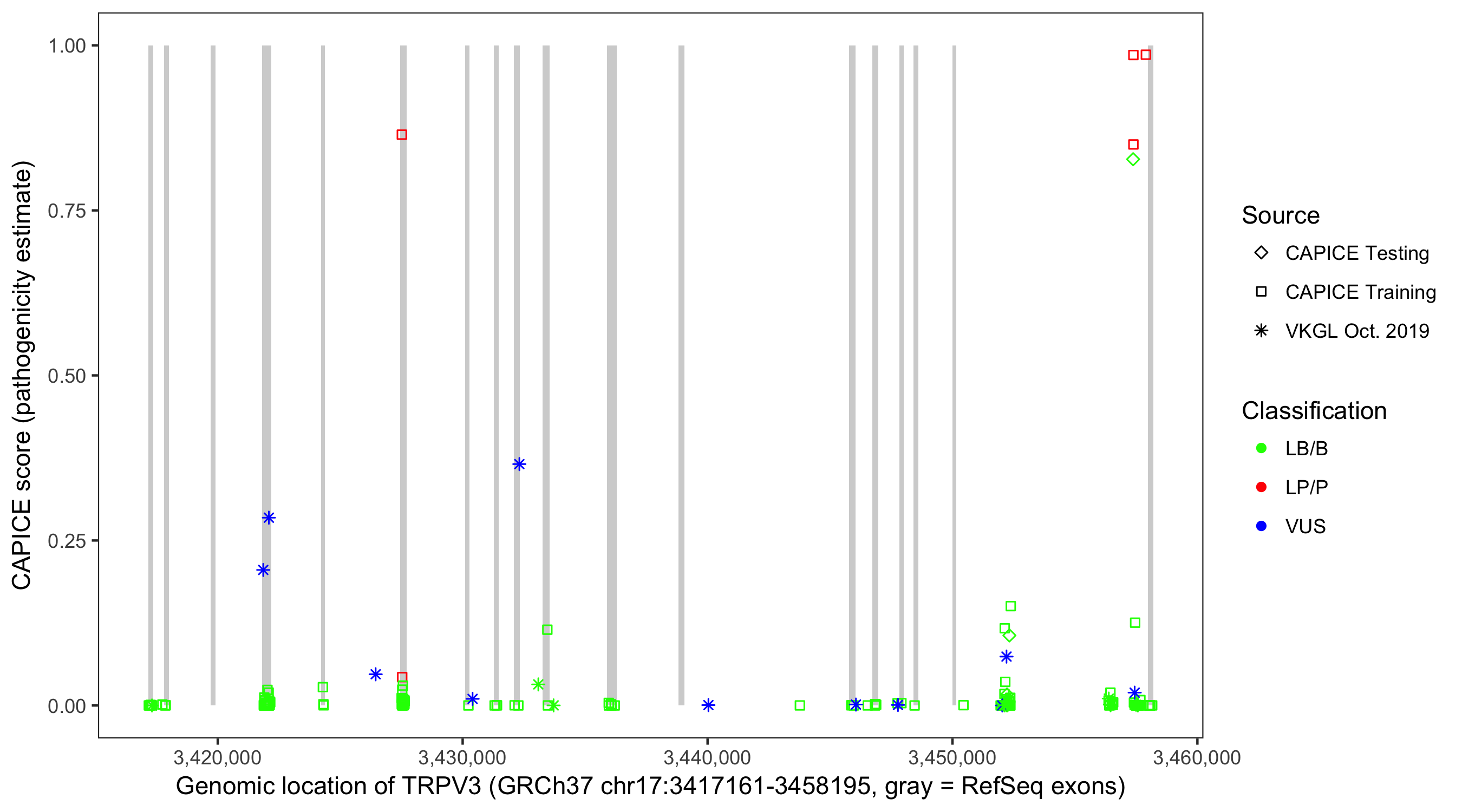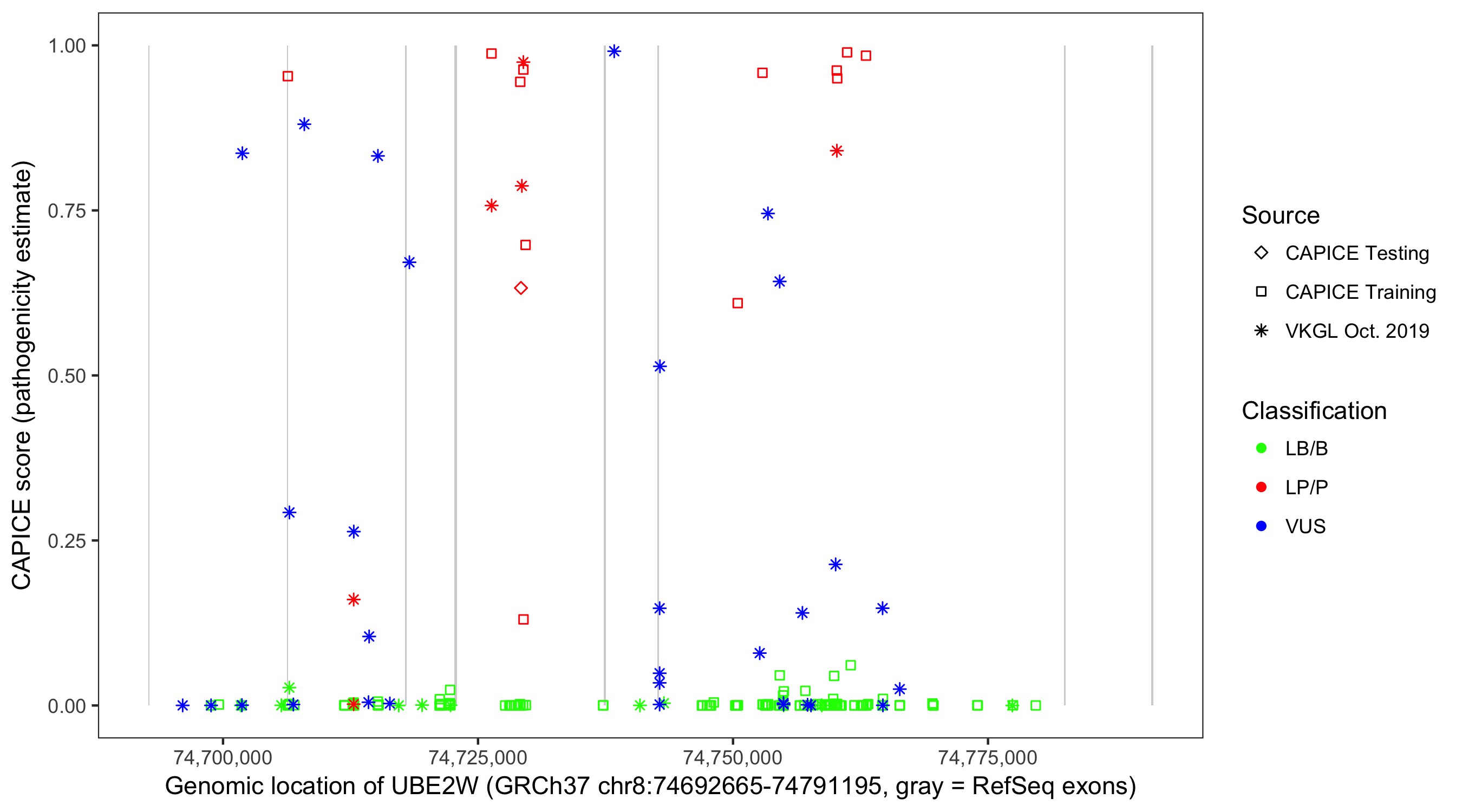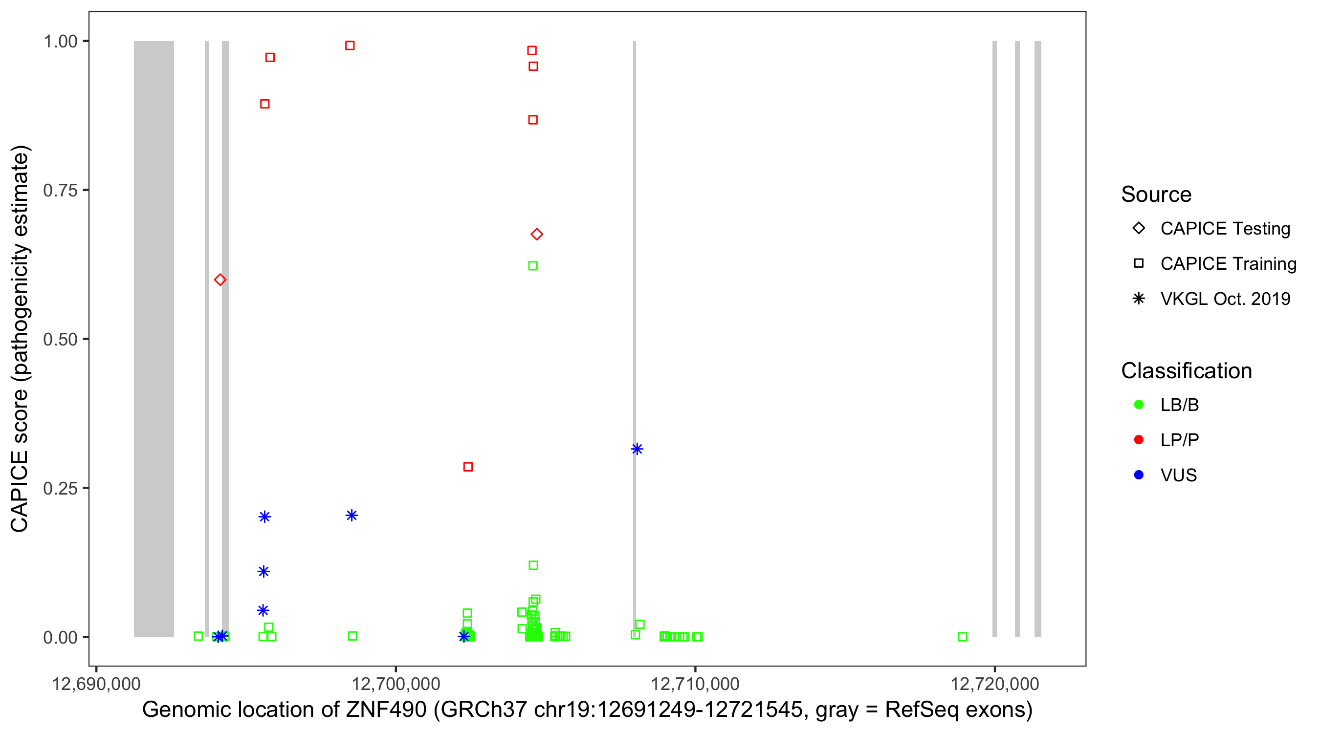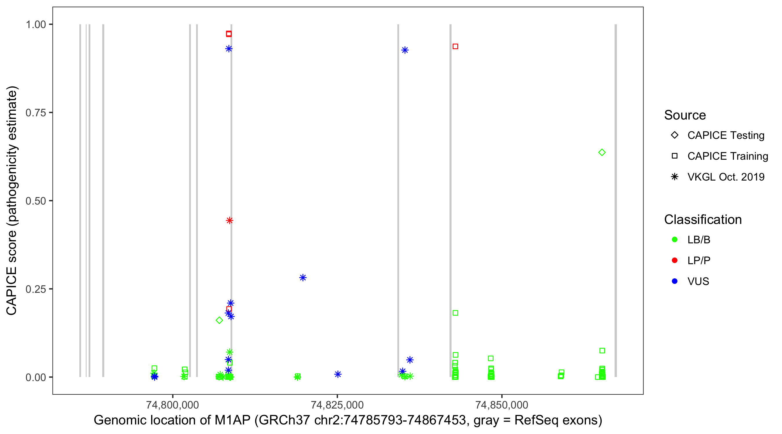 Shown are CAPICE train/test variants plus VKGL Oct 2019.