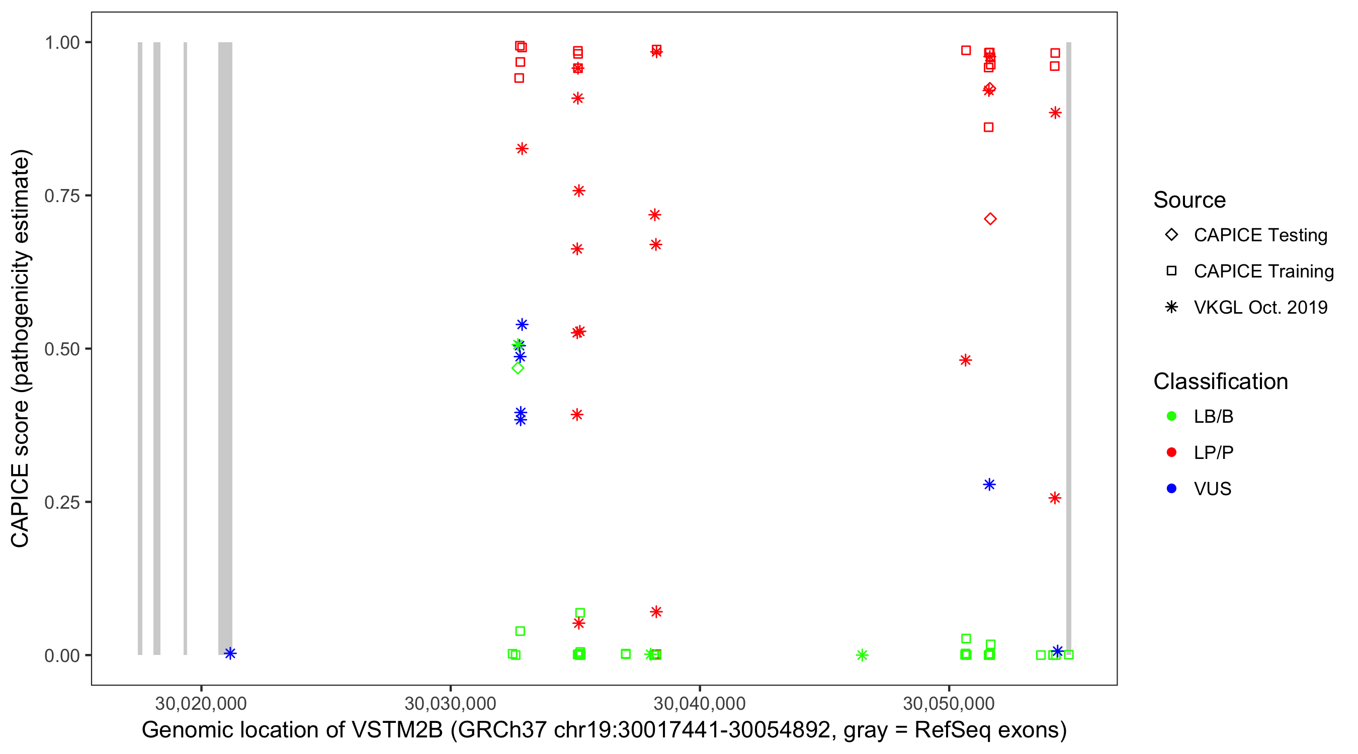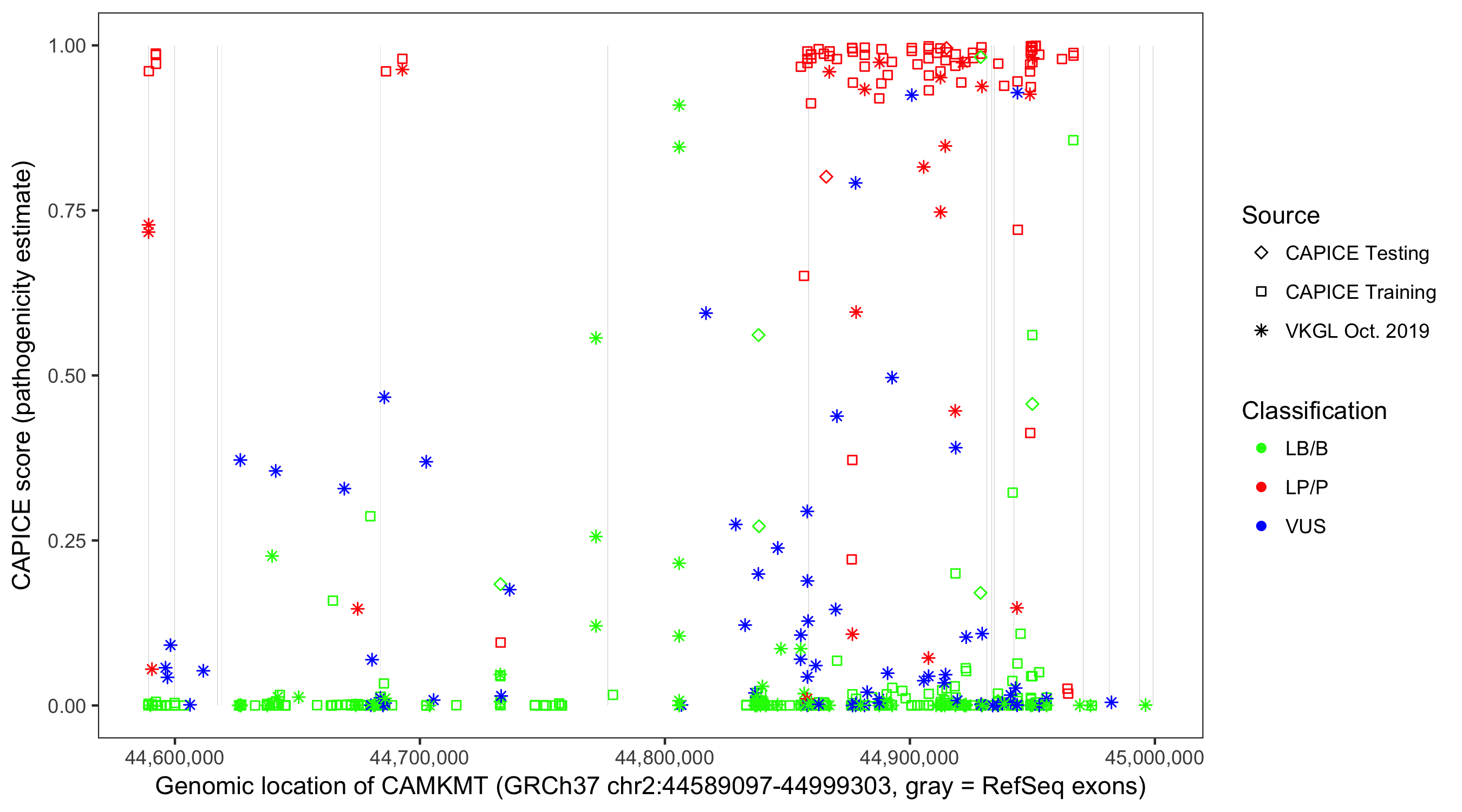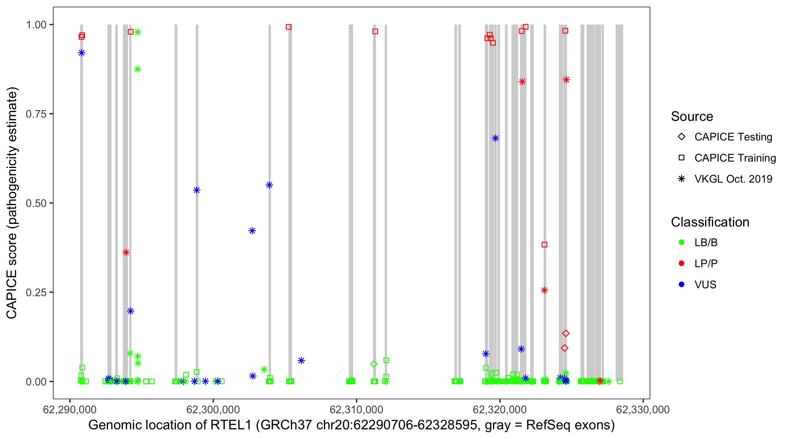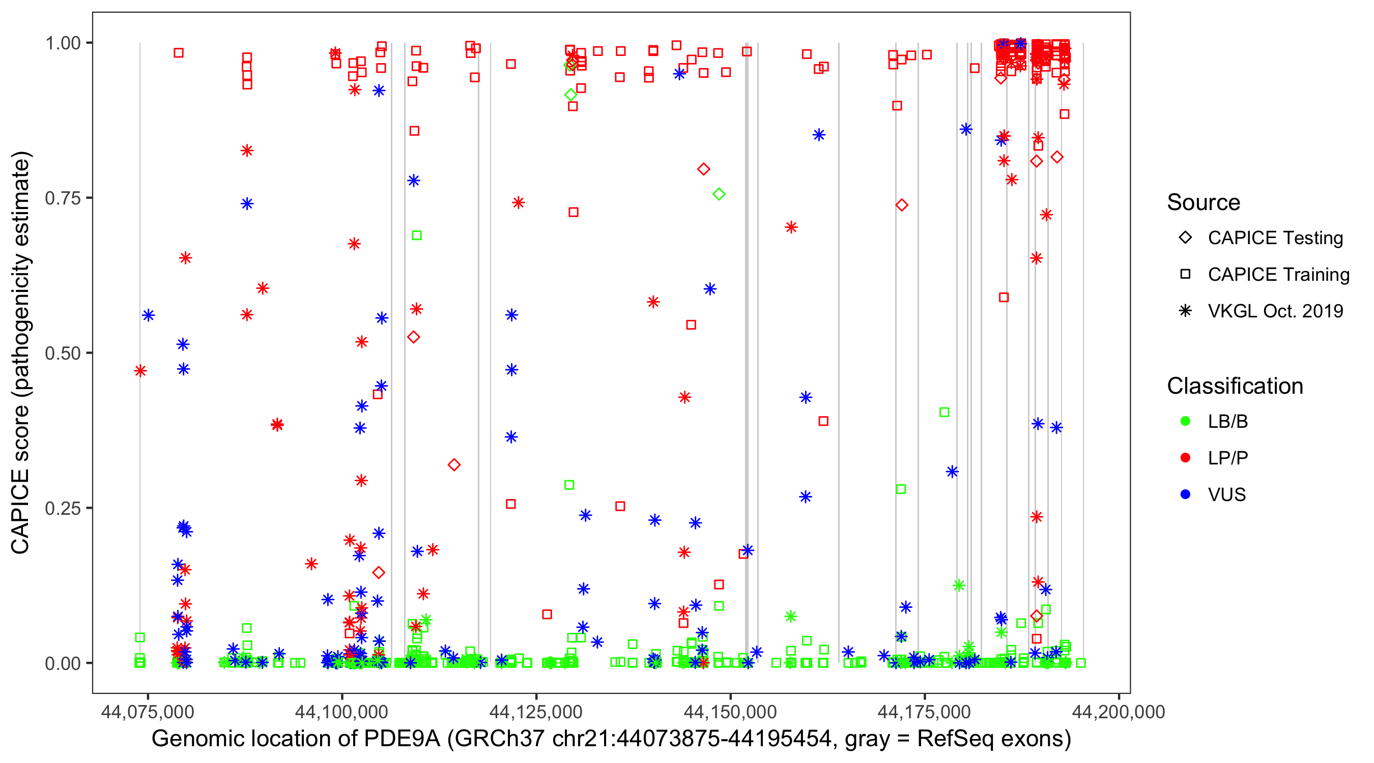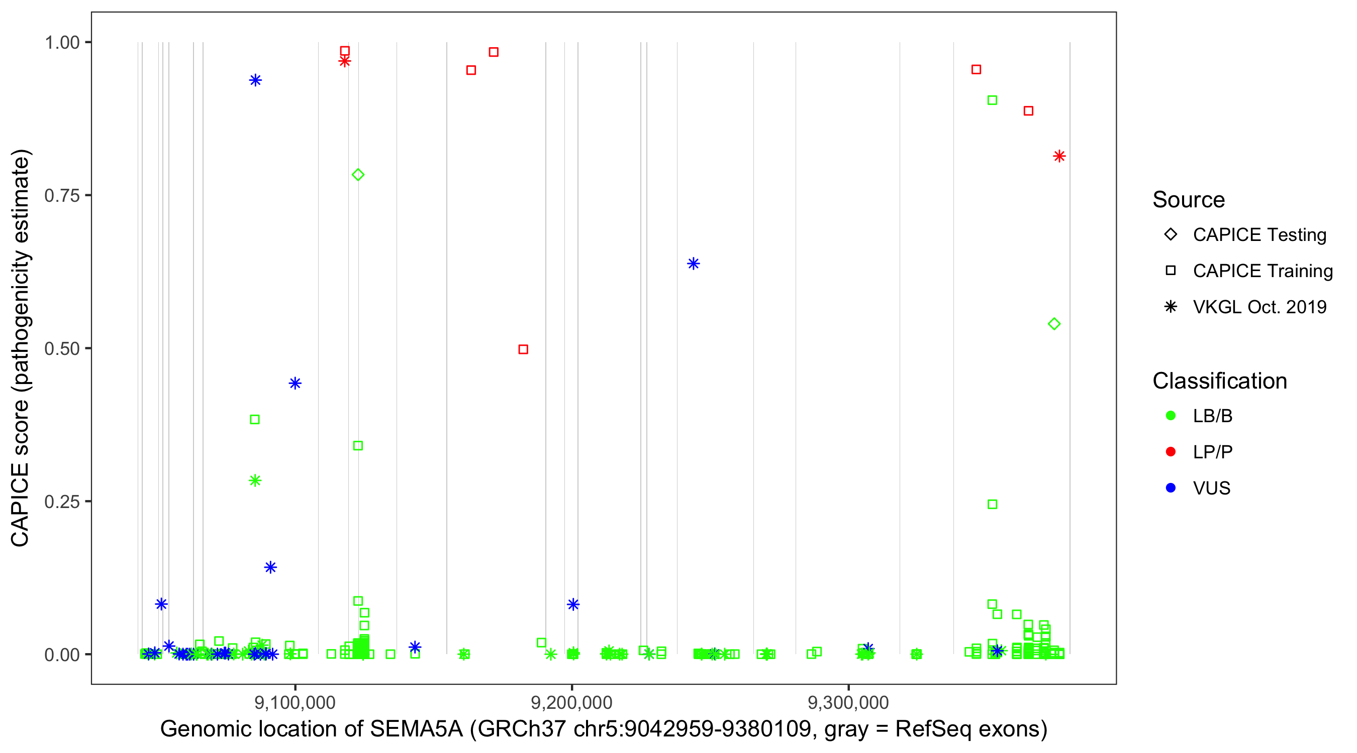 Shown are CAPICE train/test variants plus VKGL Oct 2019.
