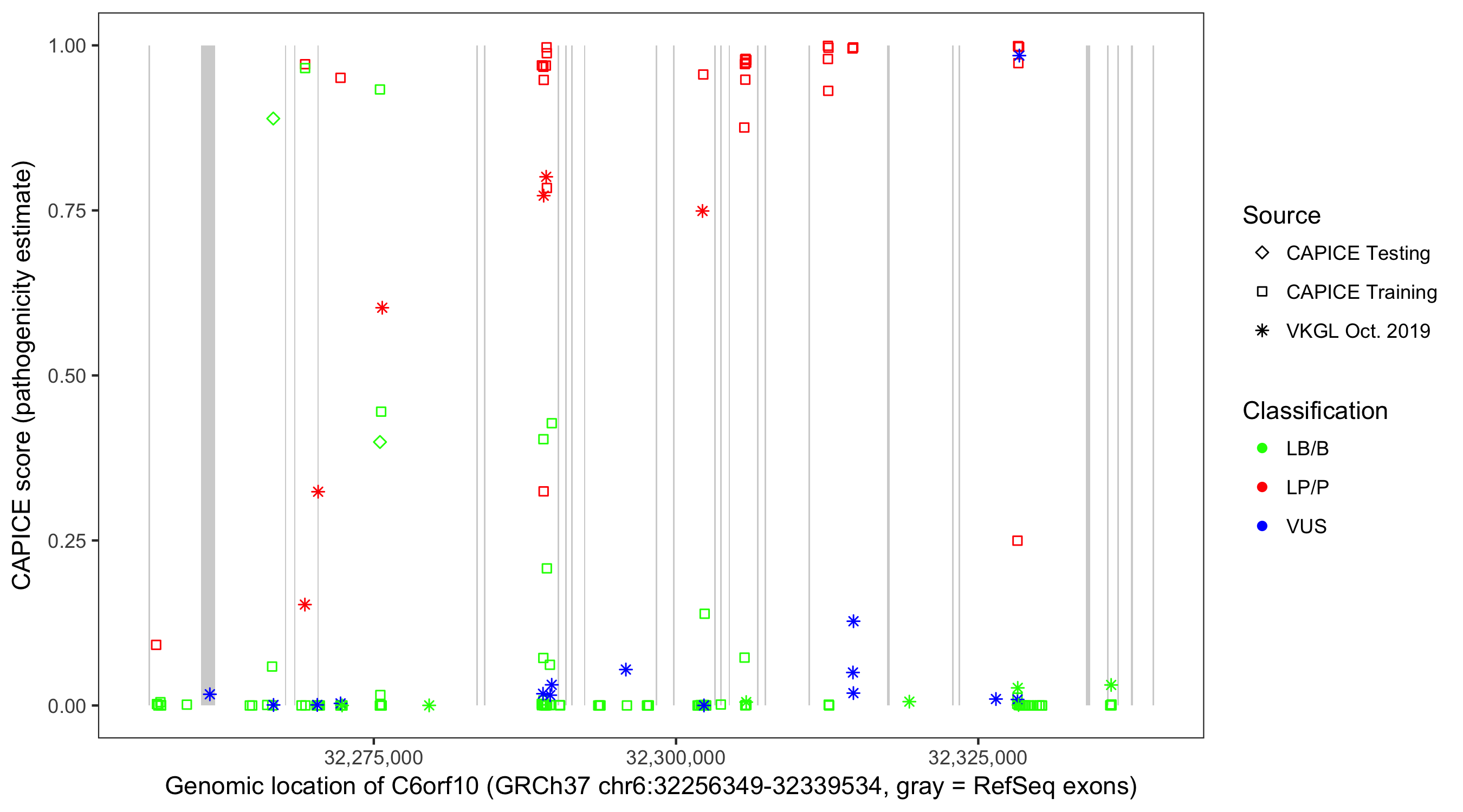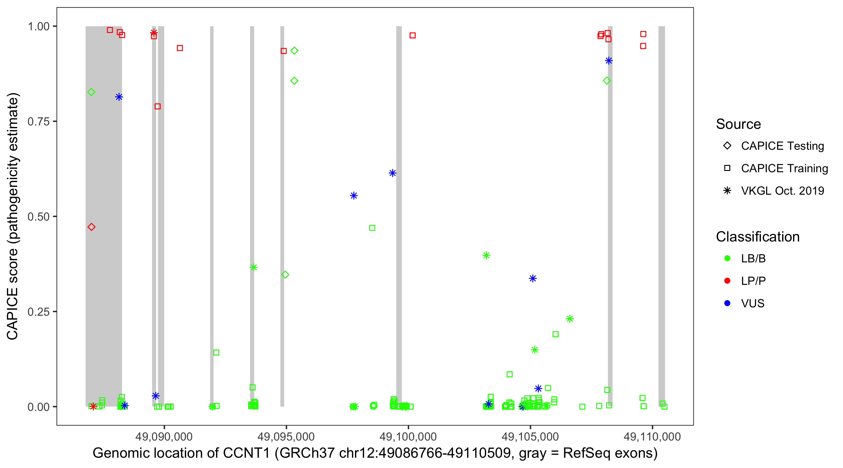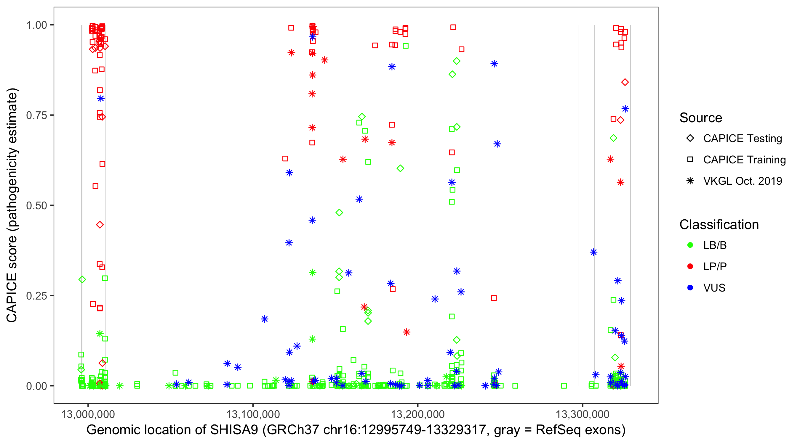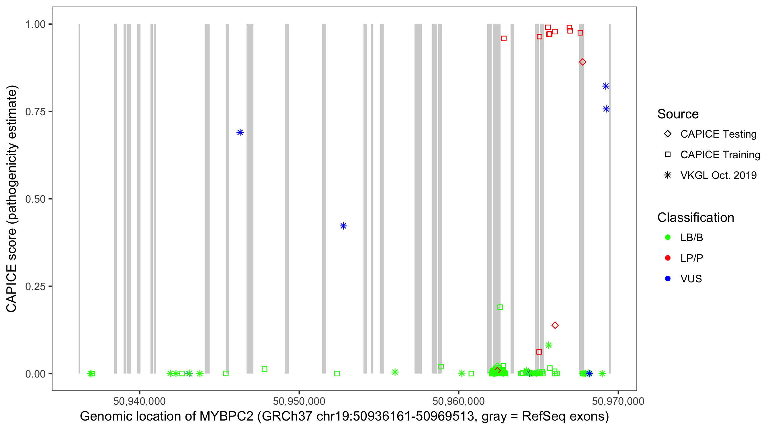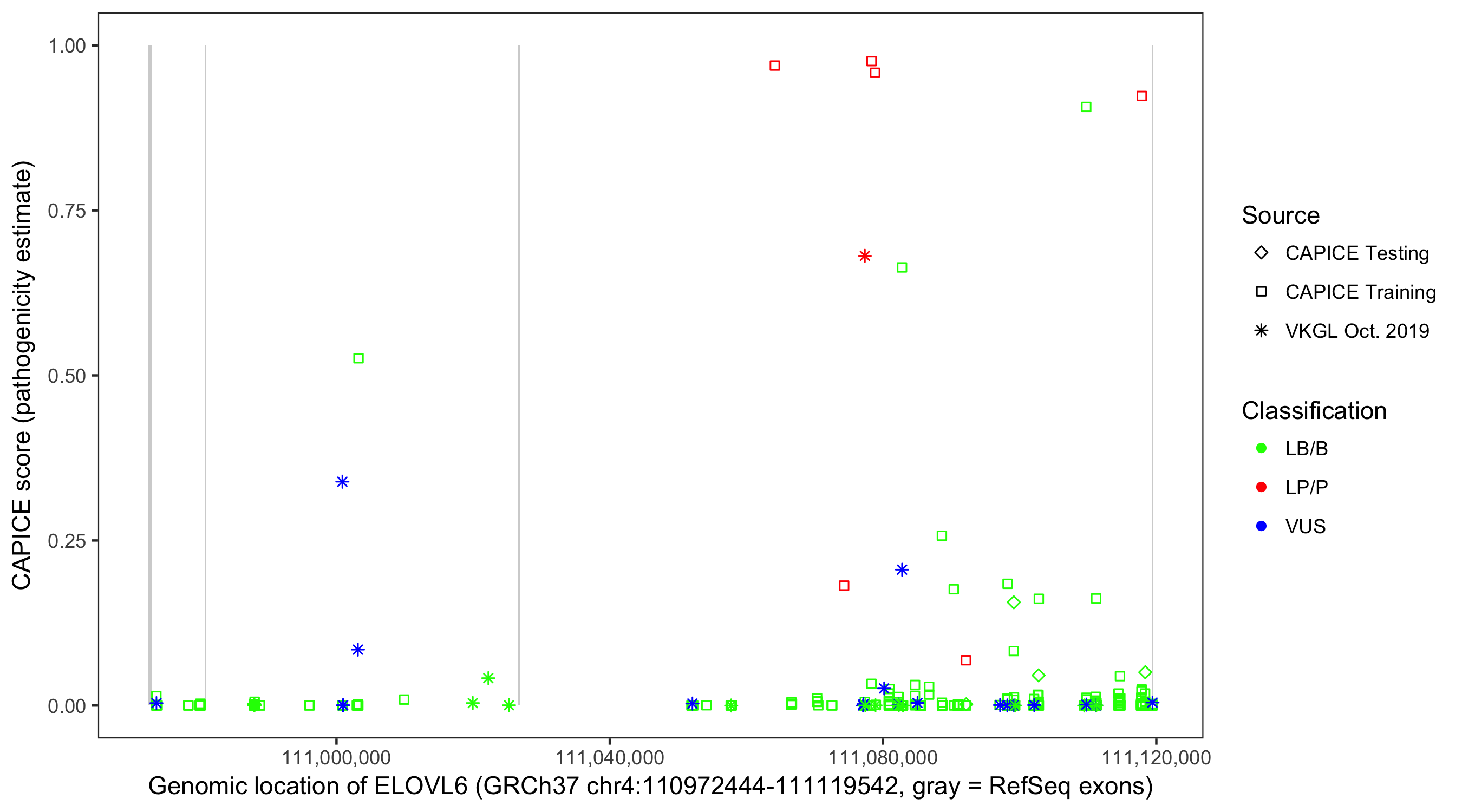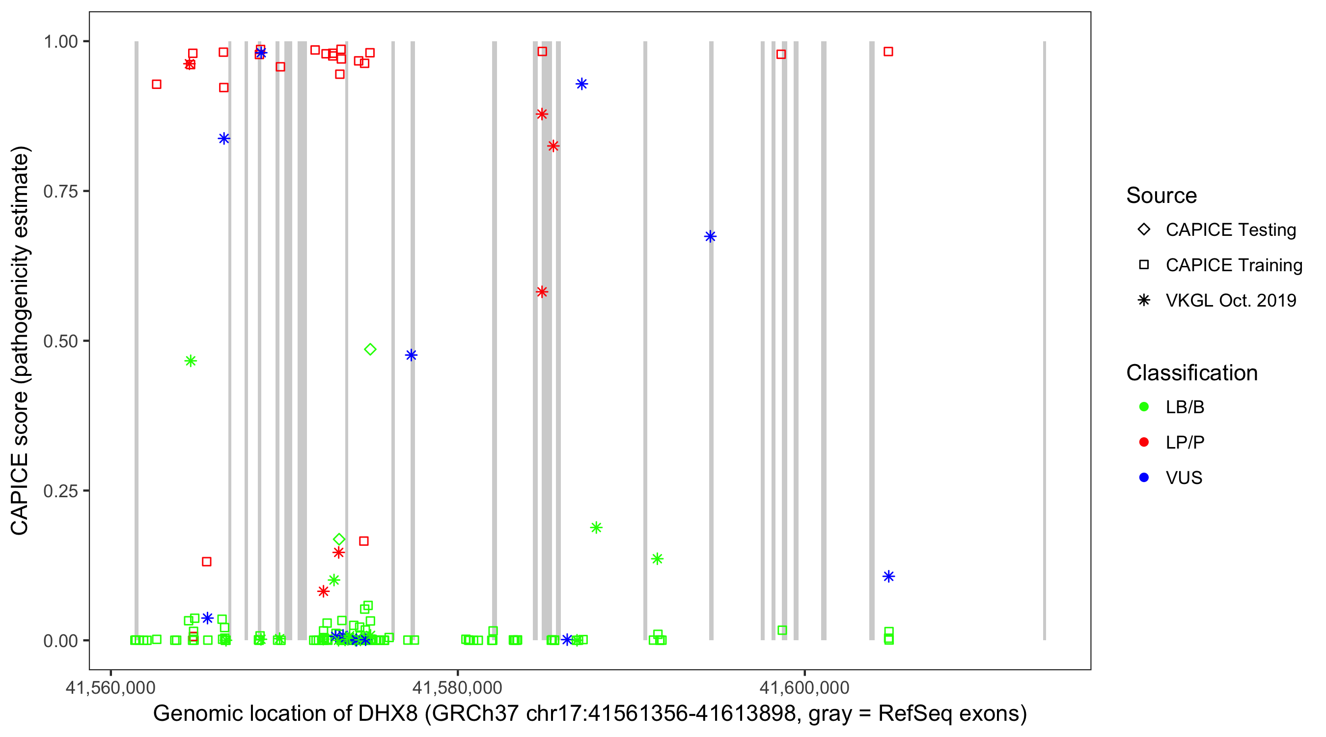 Shown are CAPICE train/test variants plus VKGL Oct 2019.