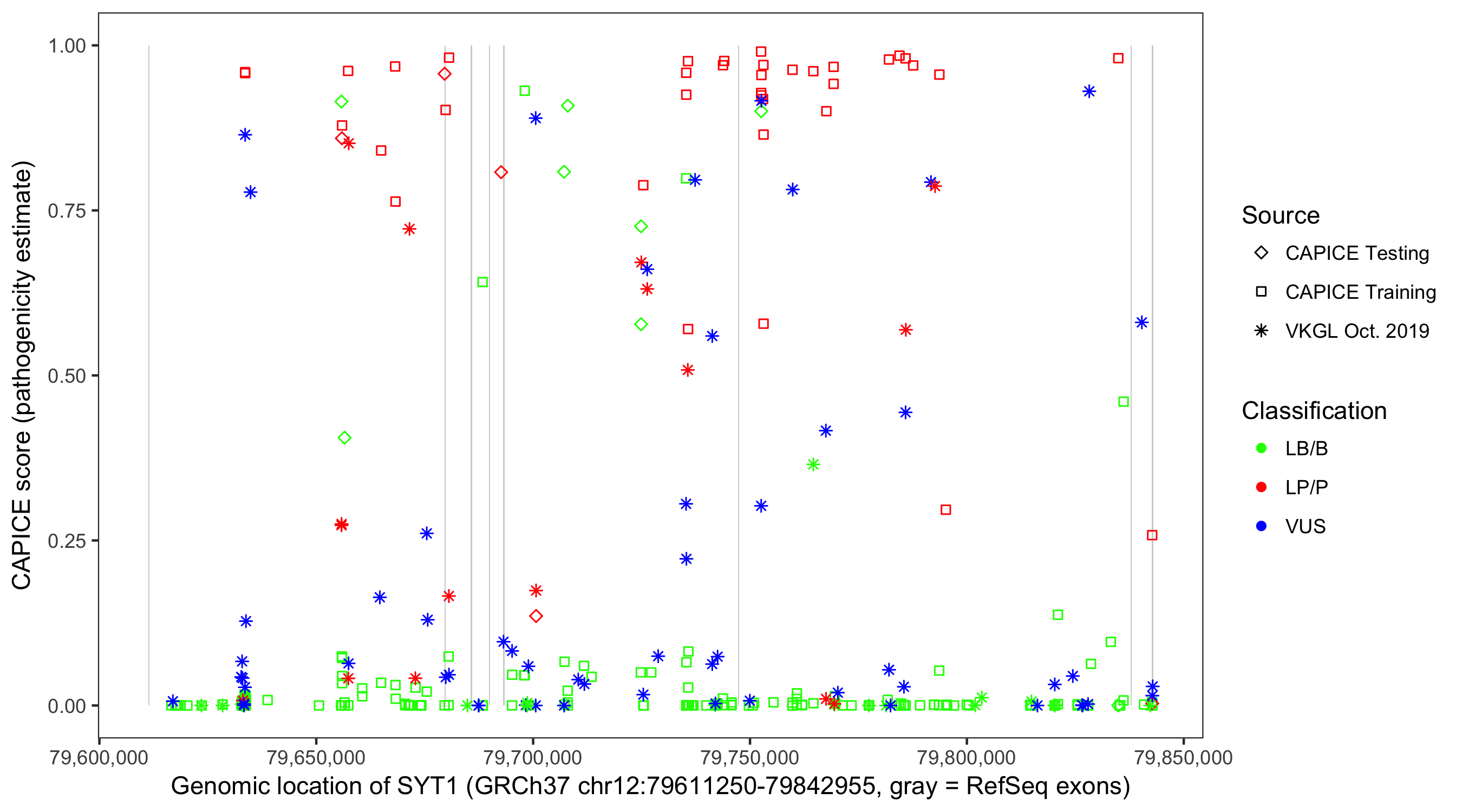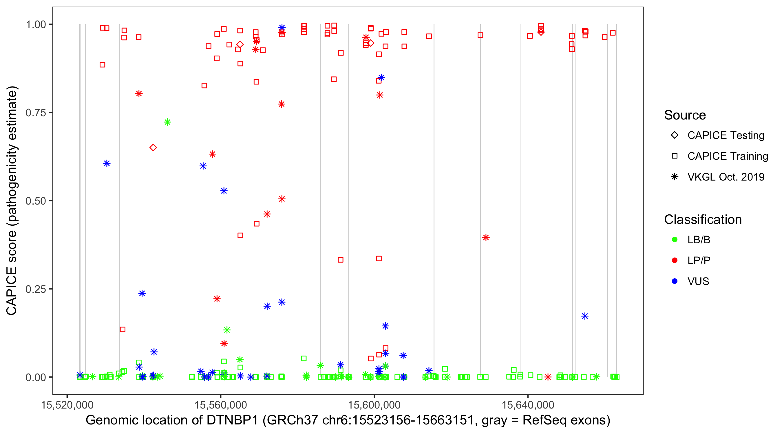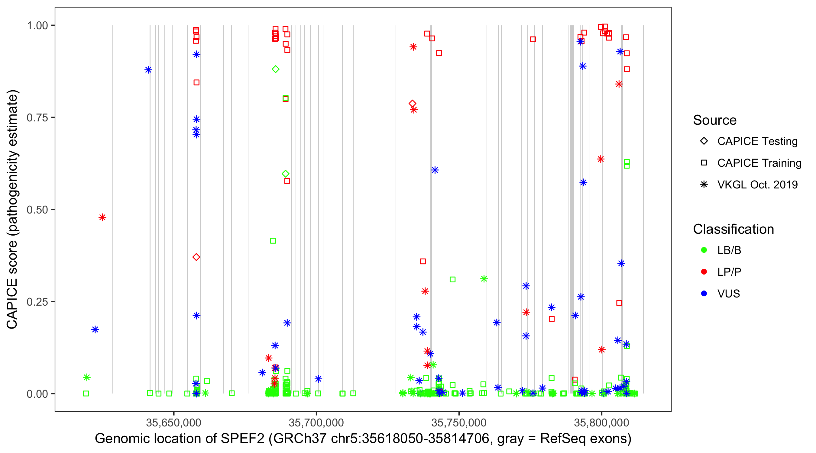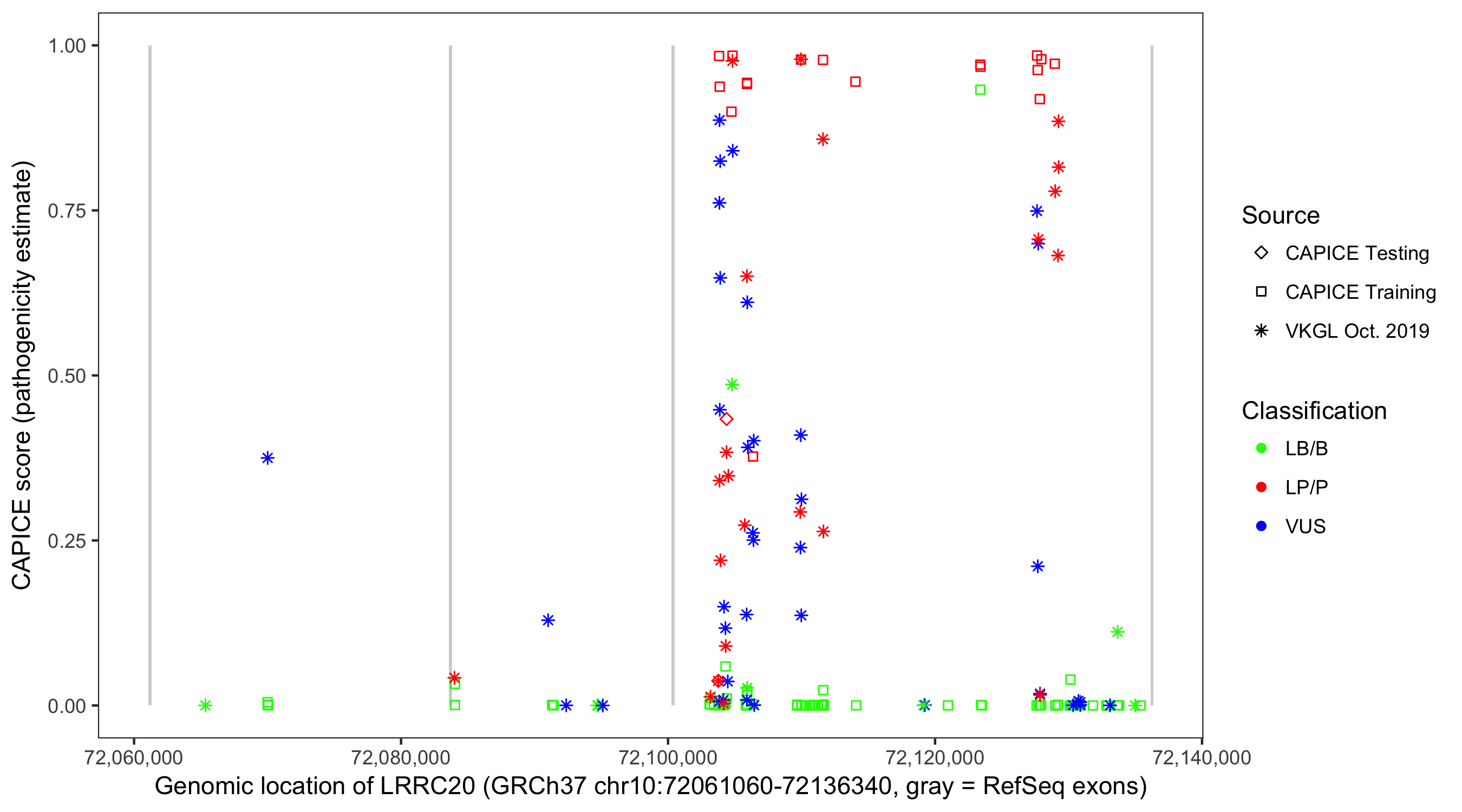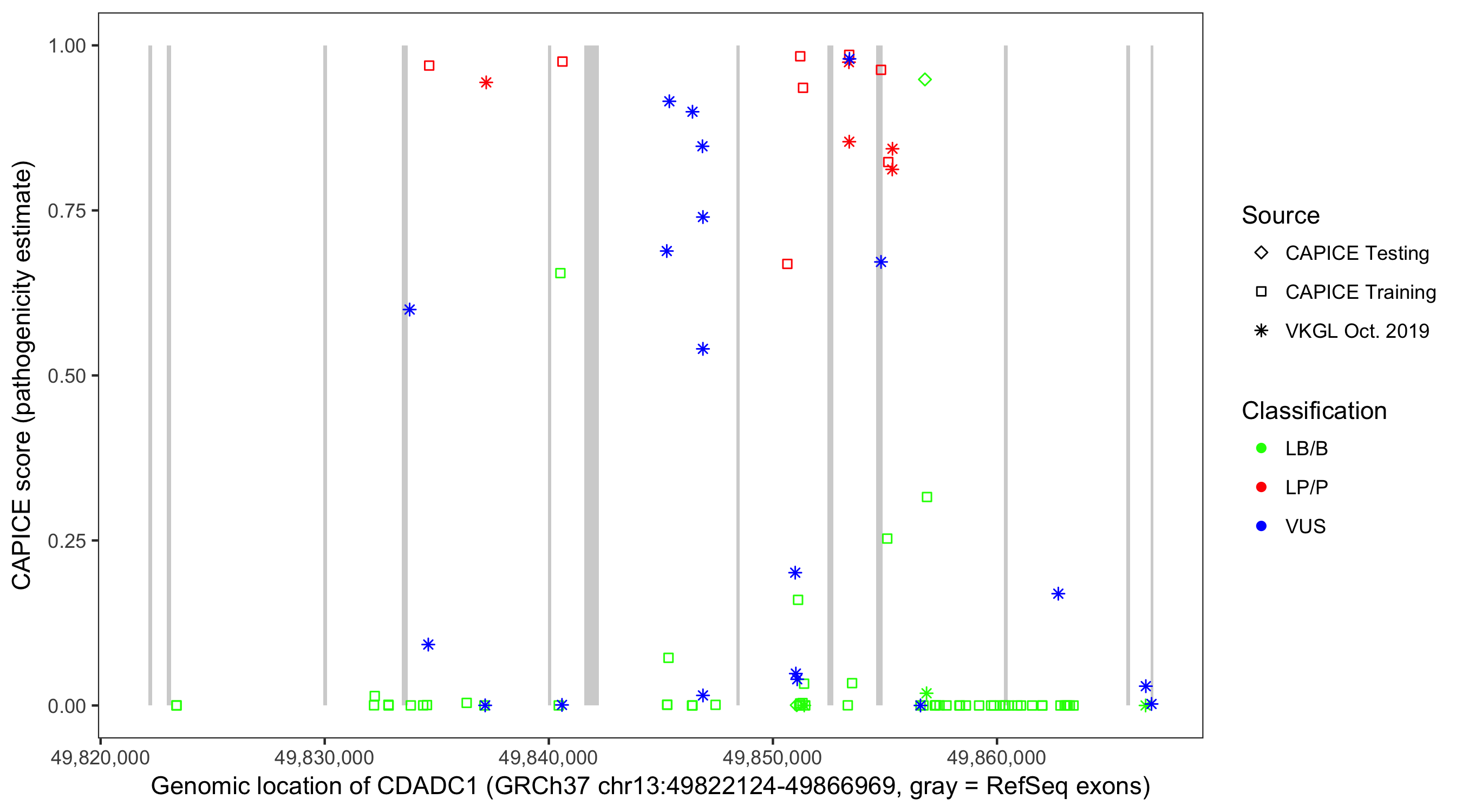 Shown are CAPICE train/test variants plus VKGL Oct 2019.