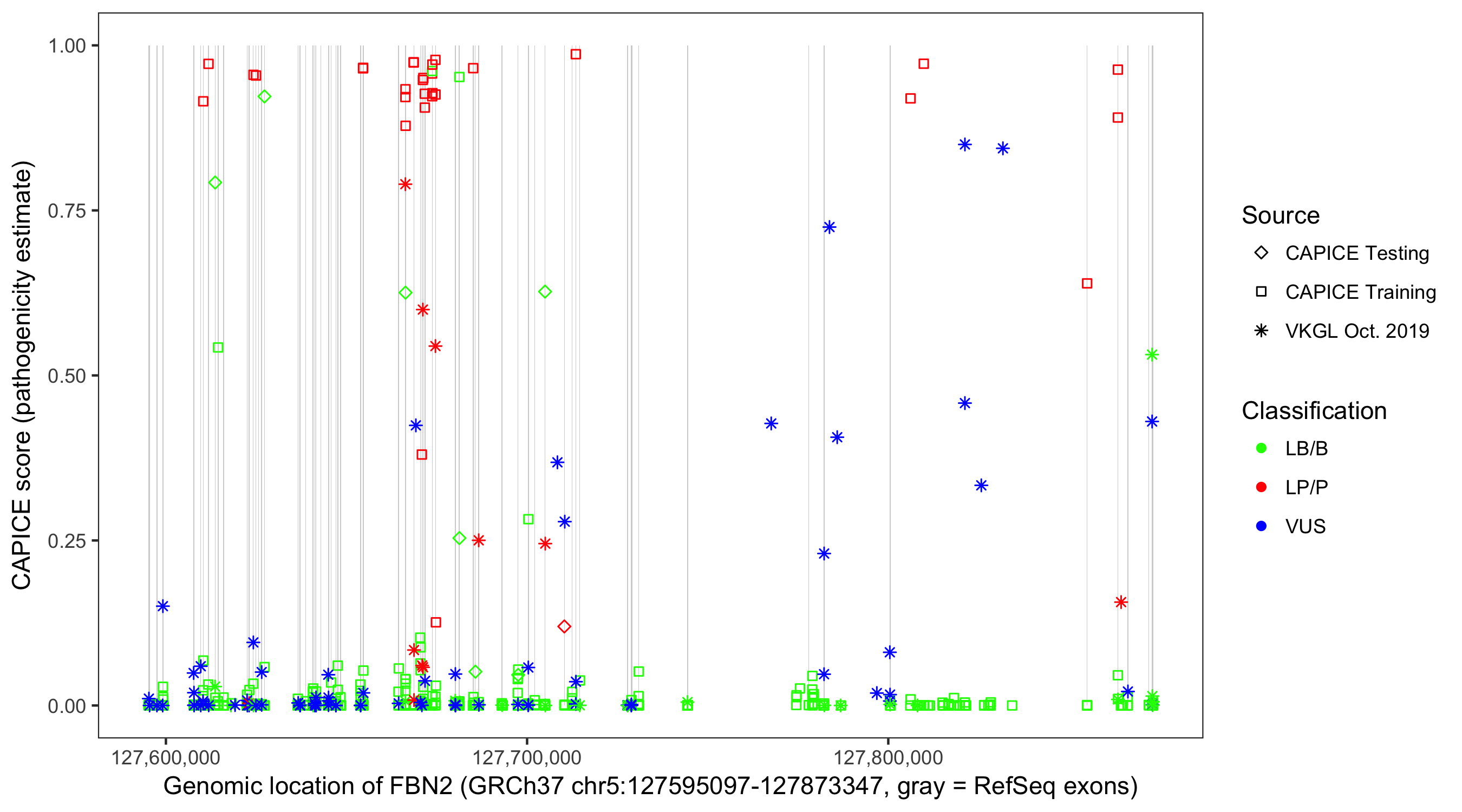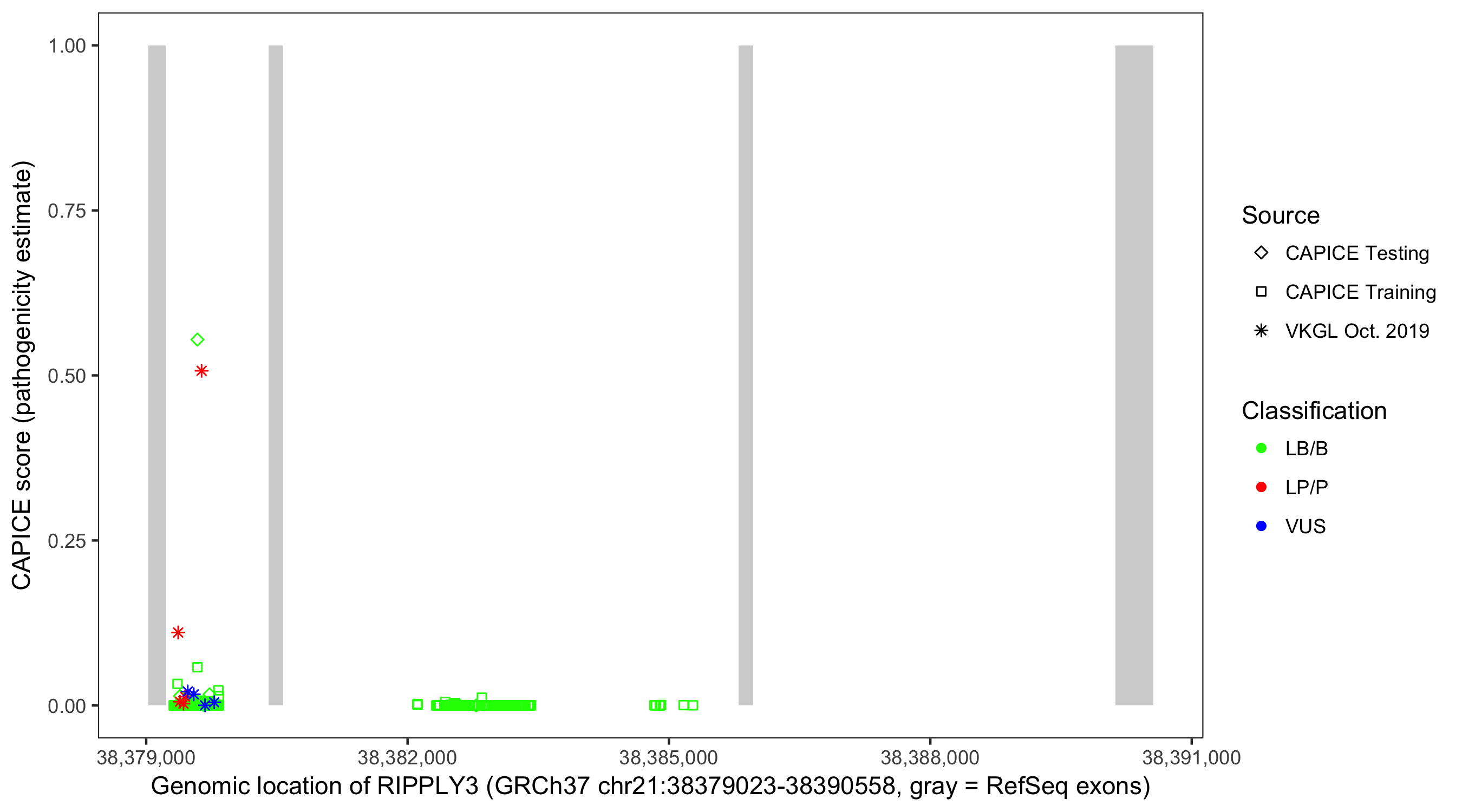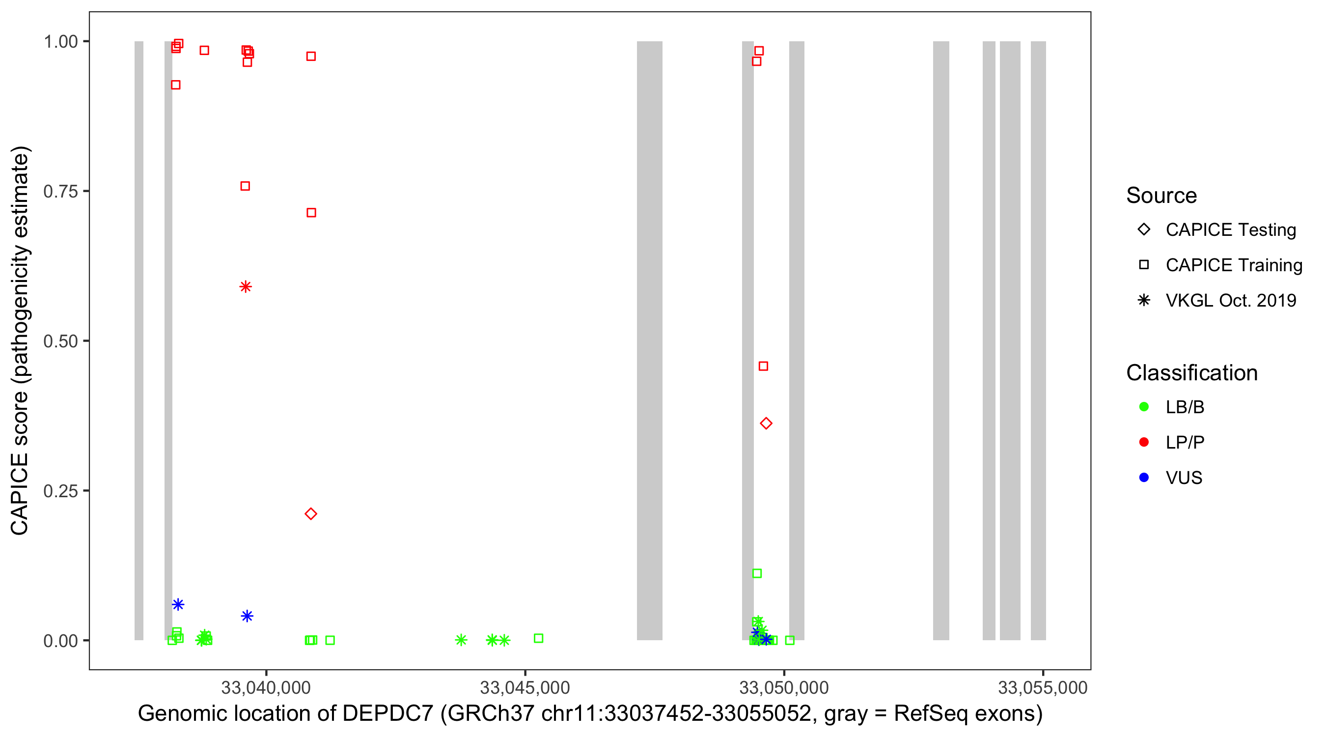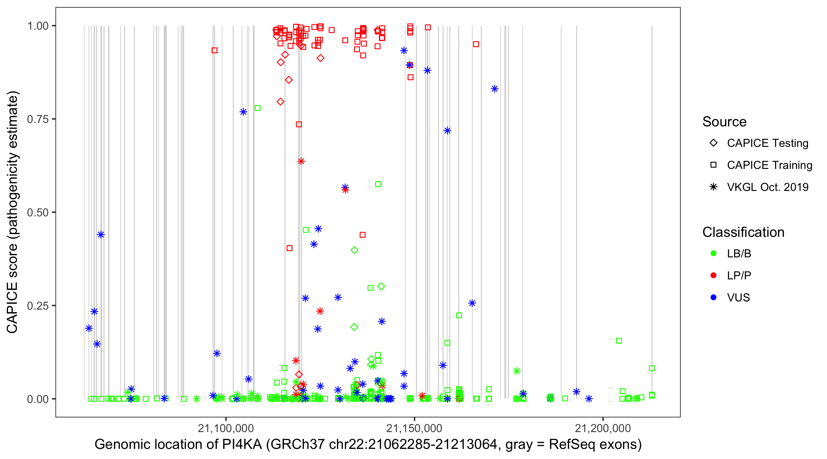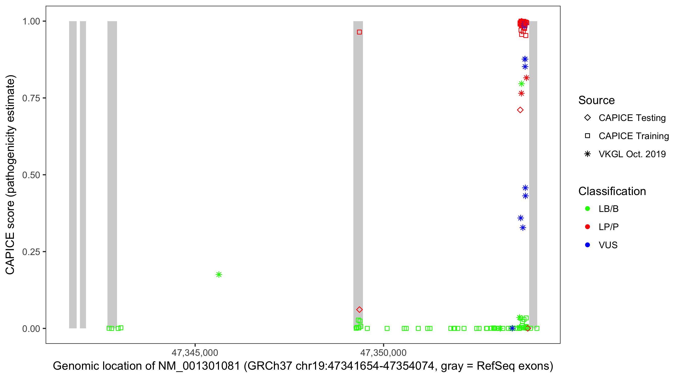 Shown are CAPICE train/test variants plus VKGL Oct 2019.