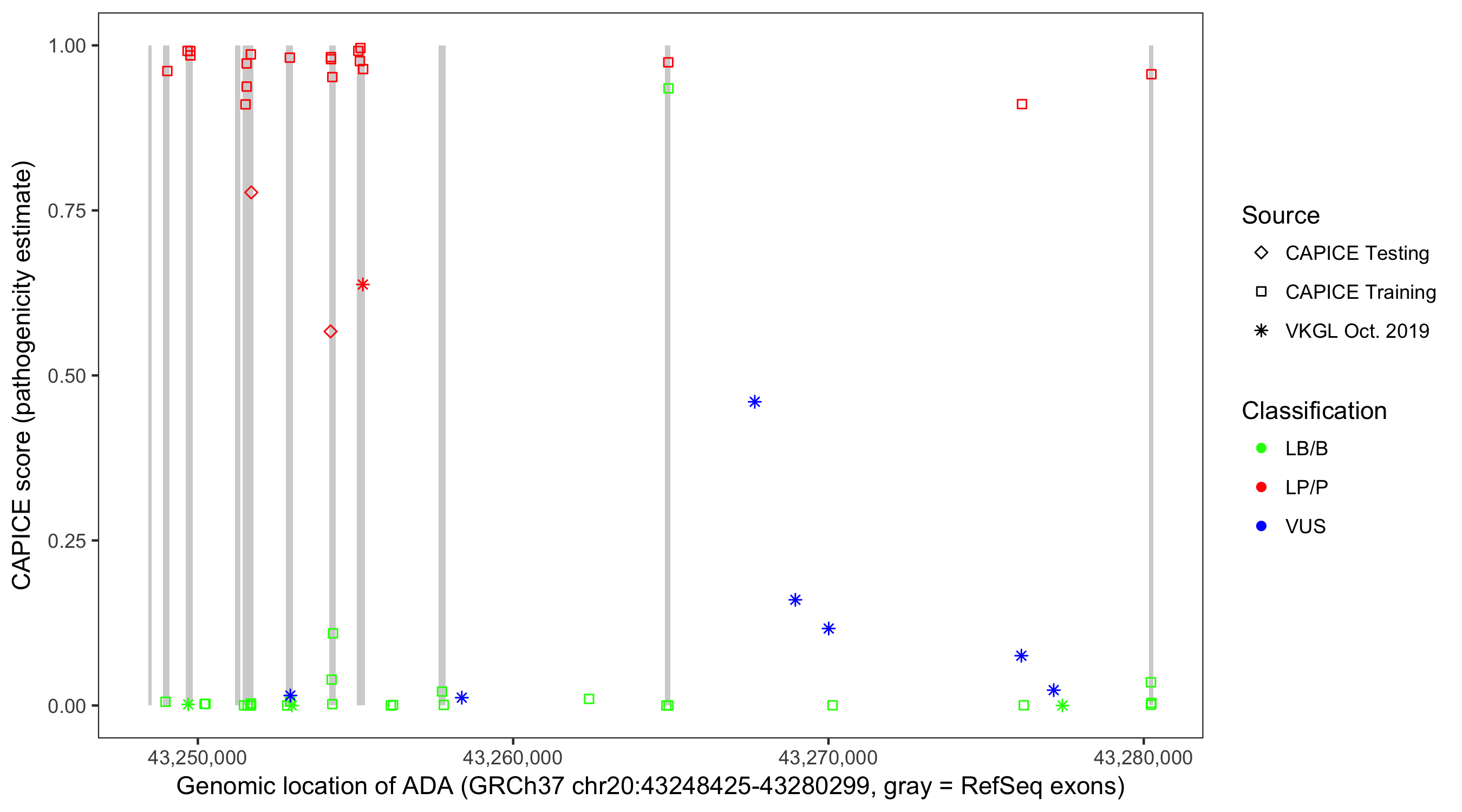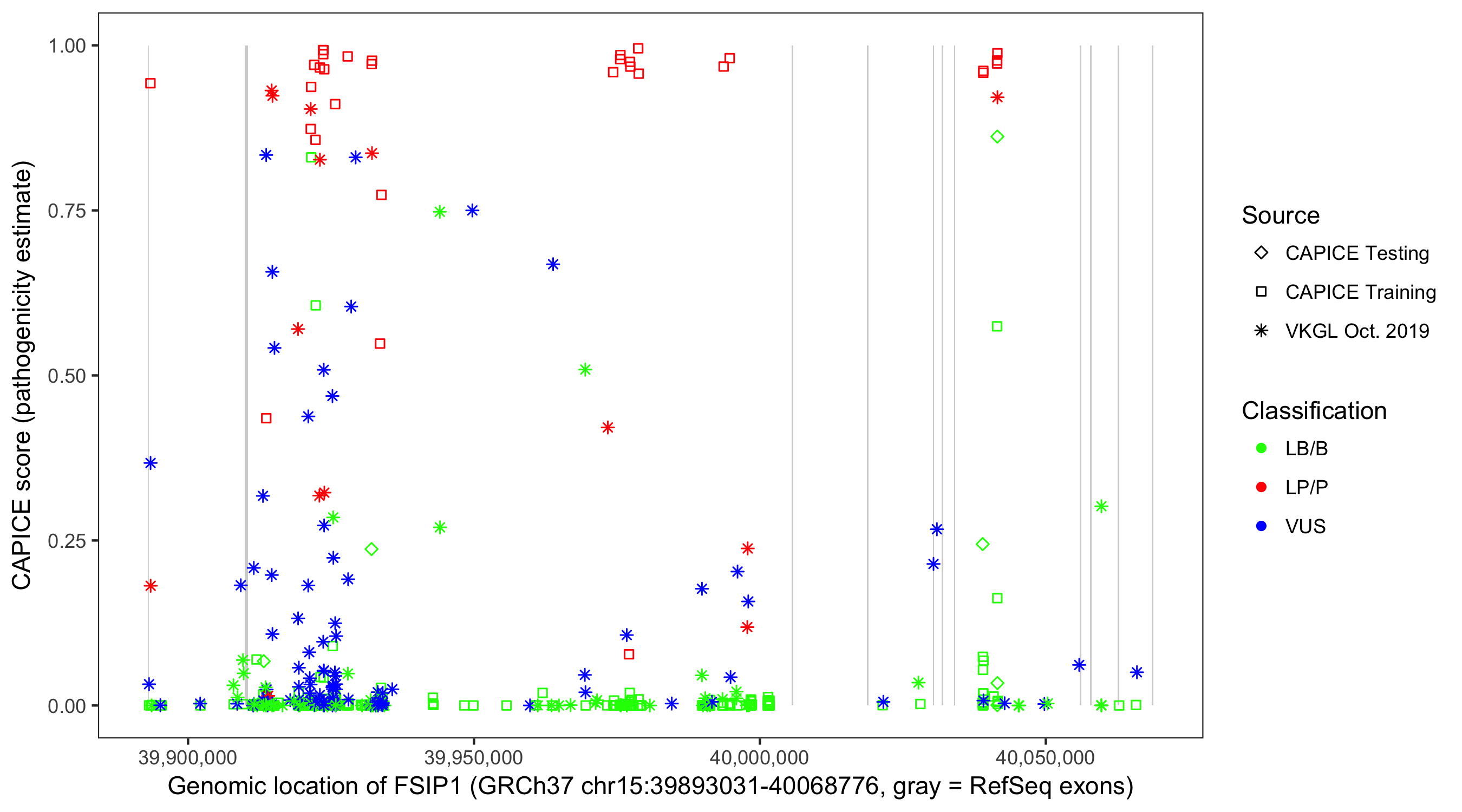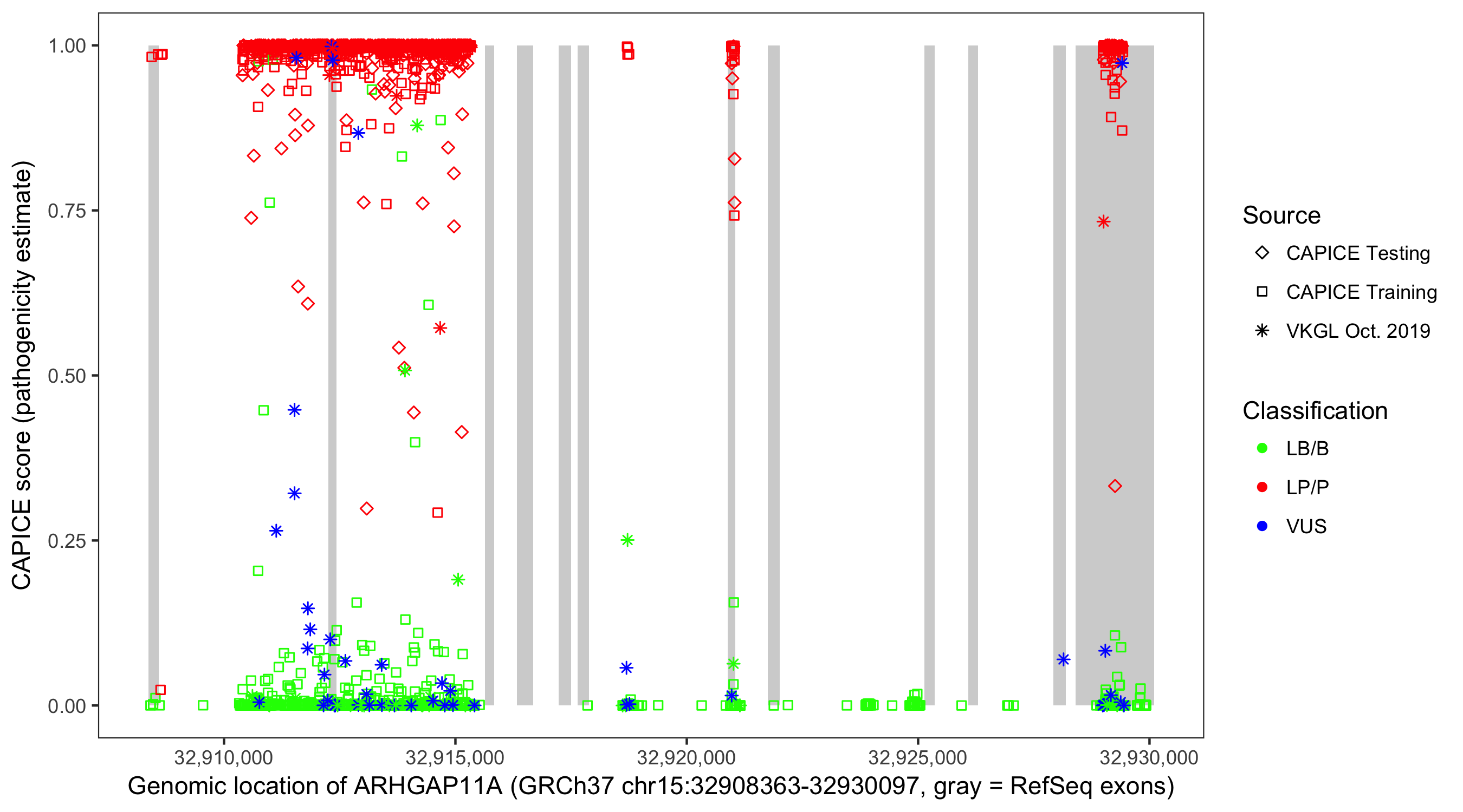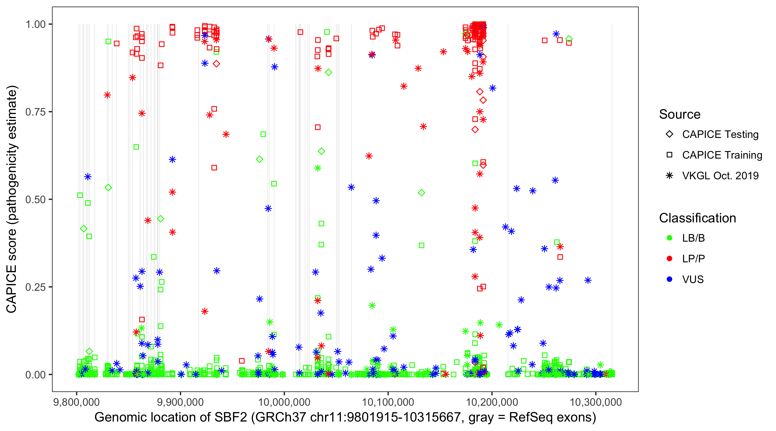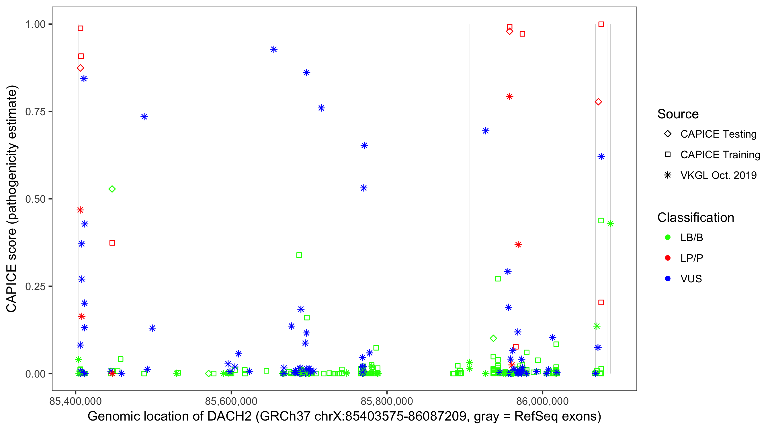 Shown are CAPICE train/test variants plus VKGL Oct 2019.
