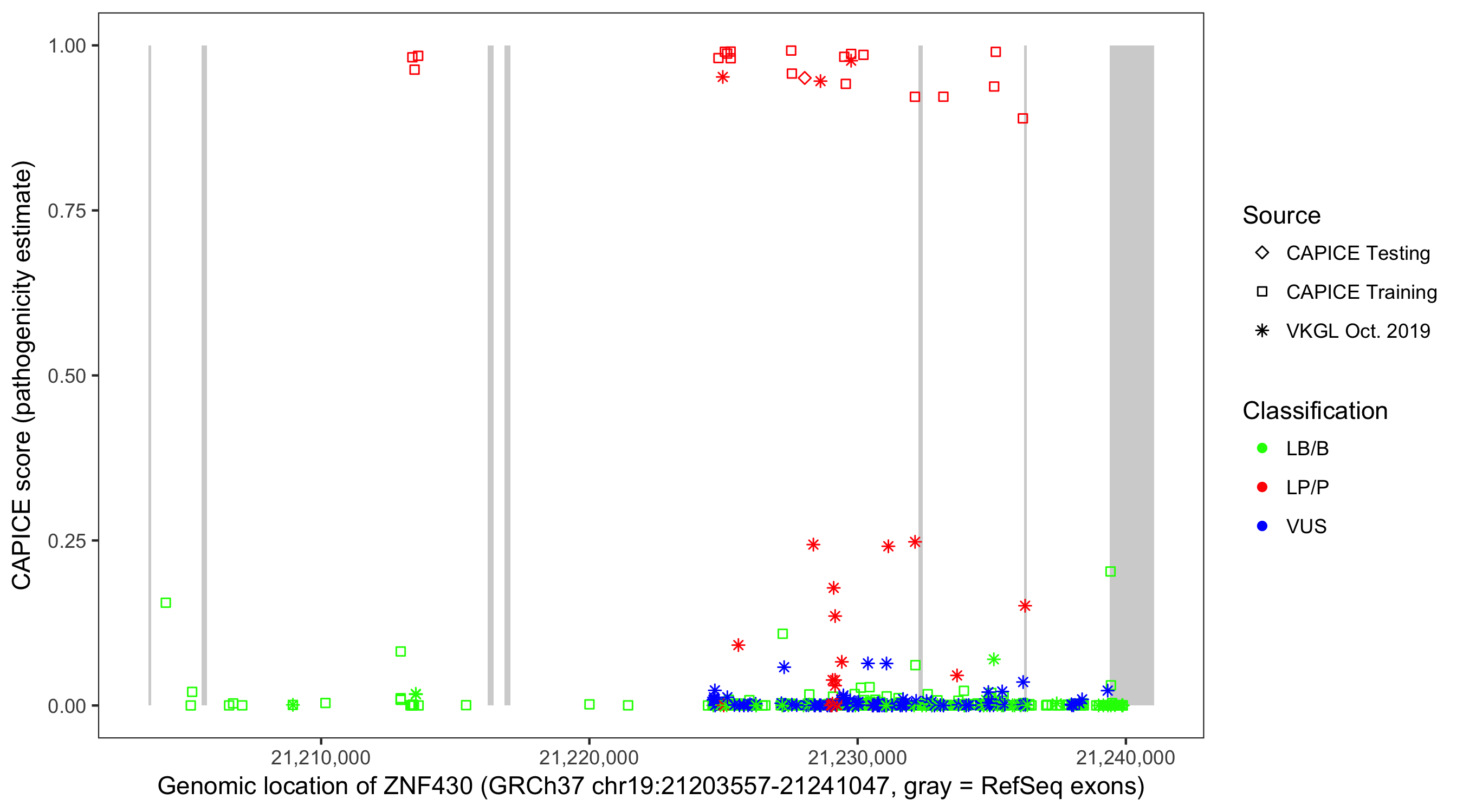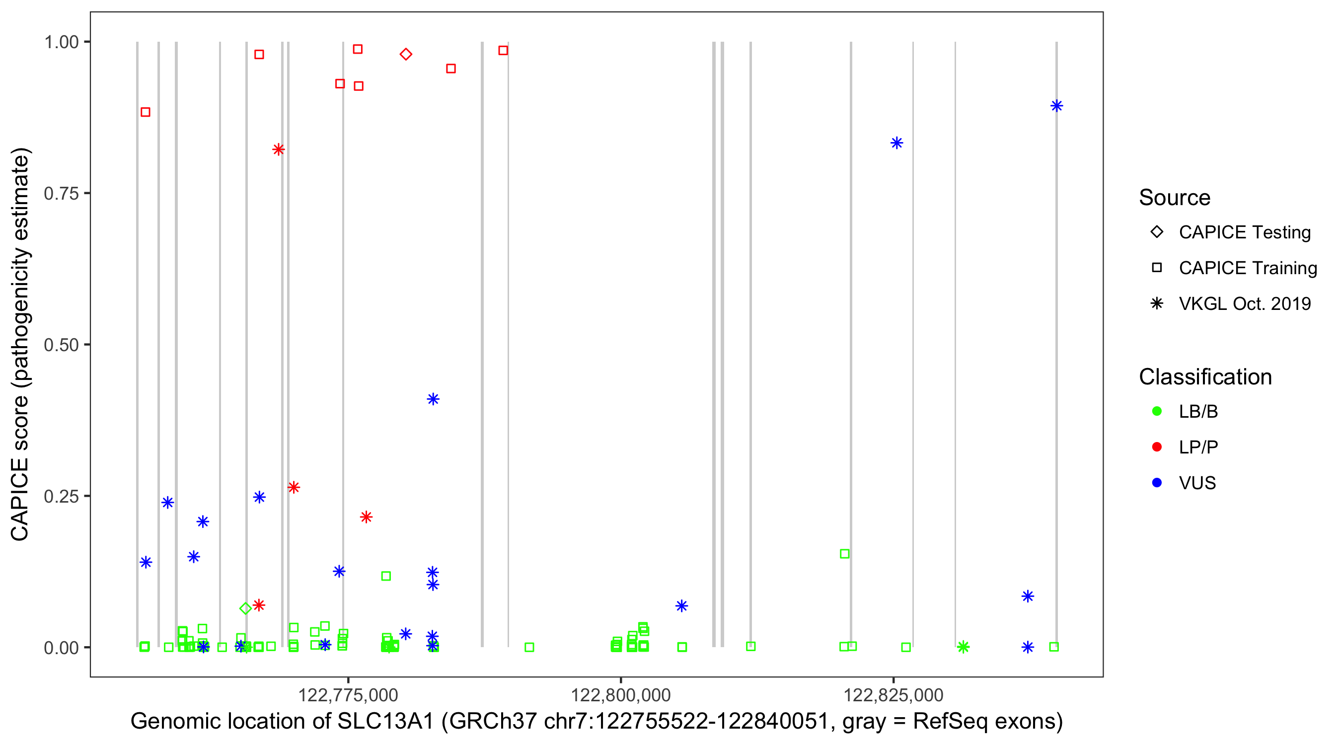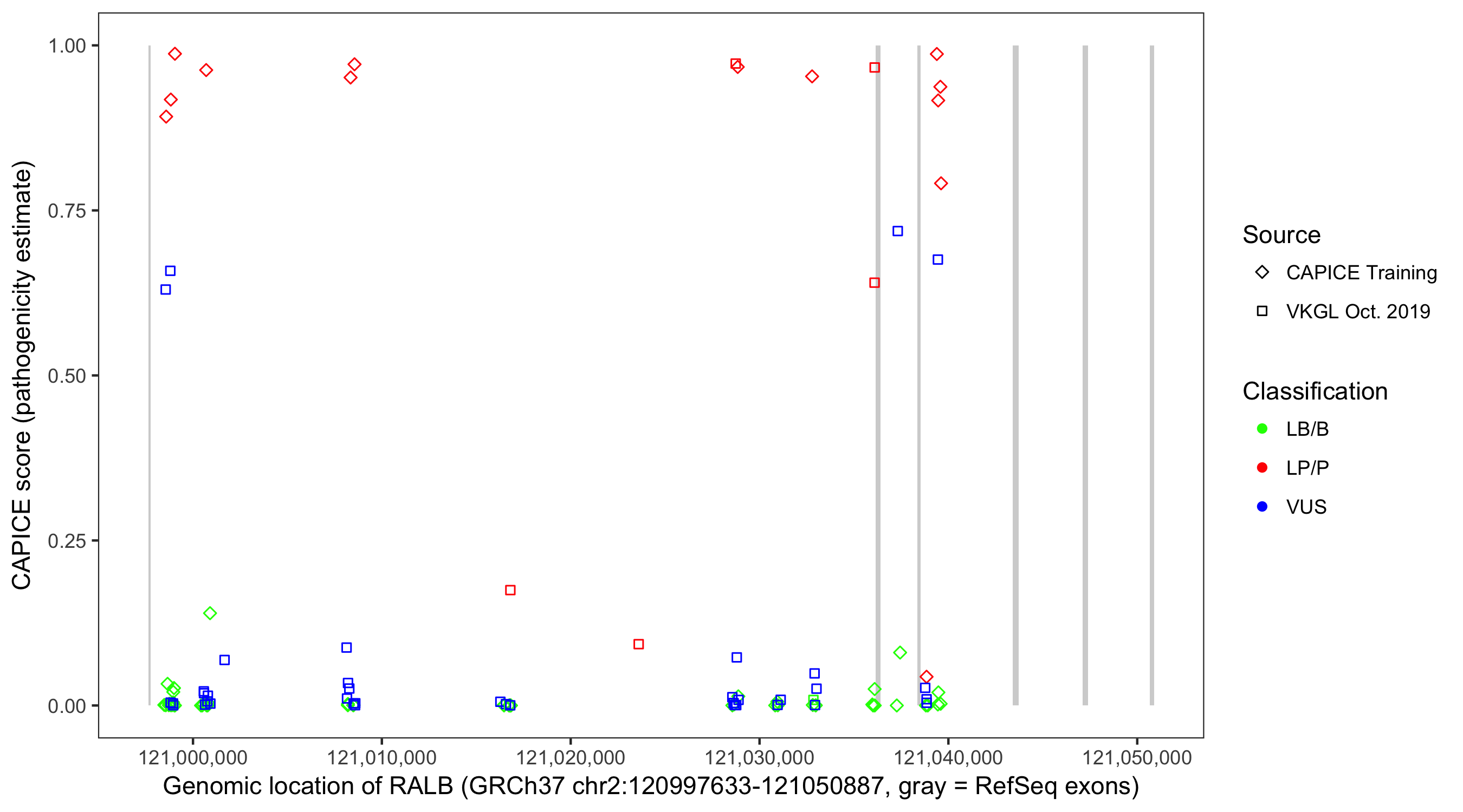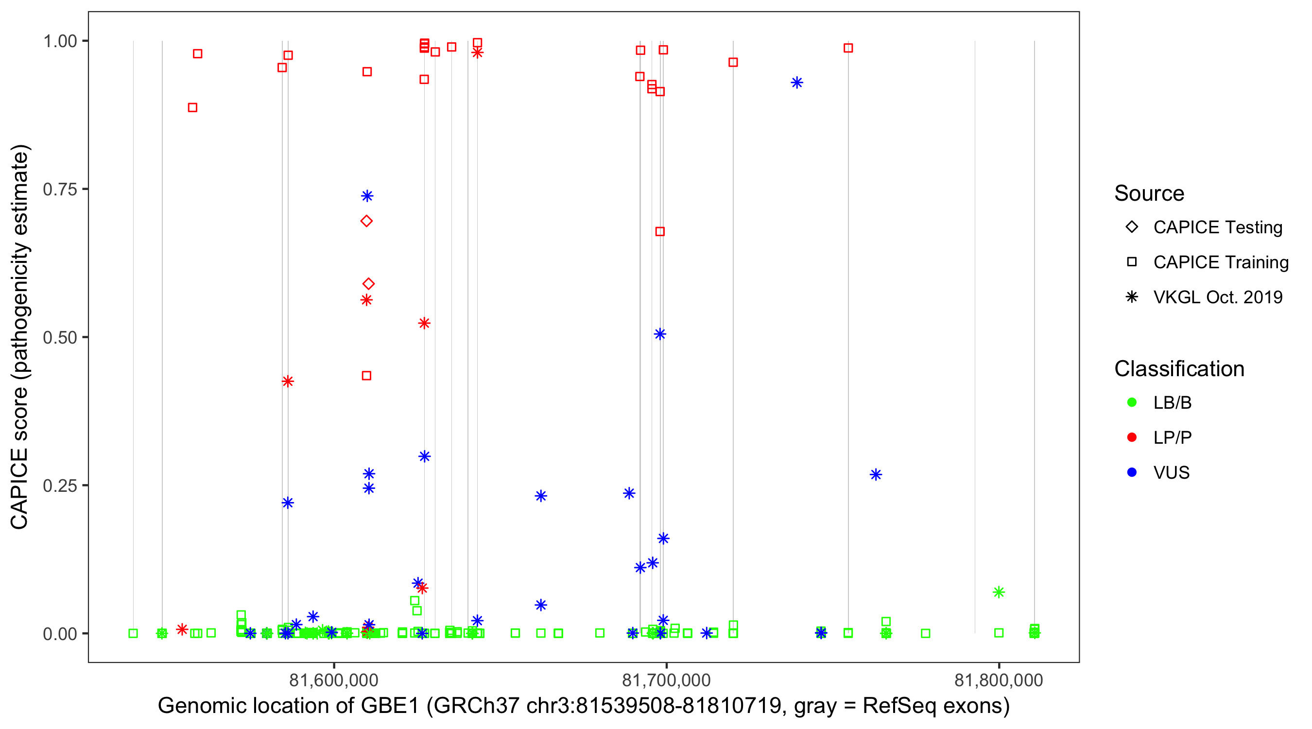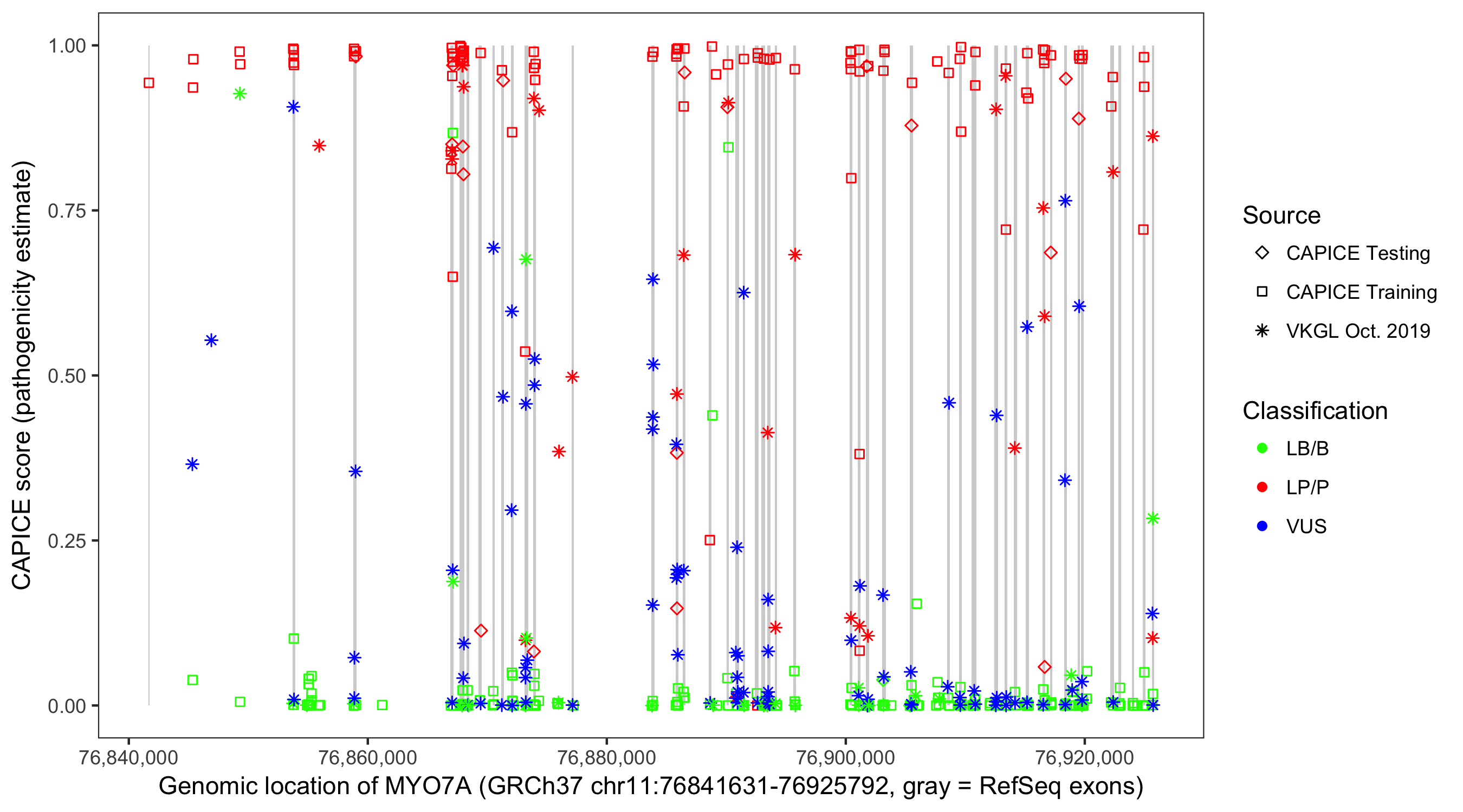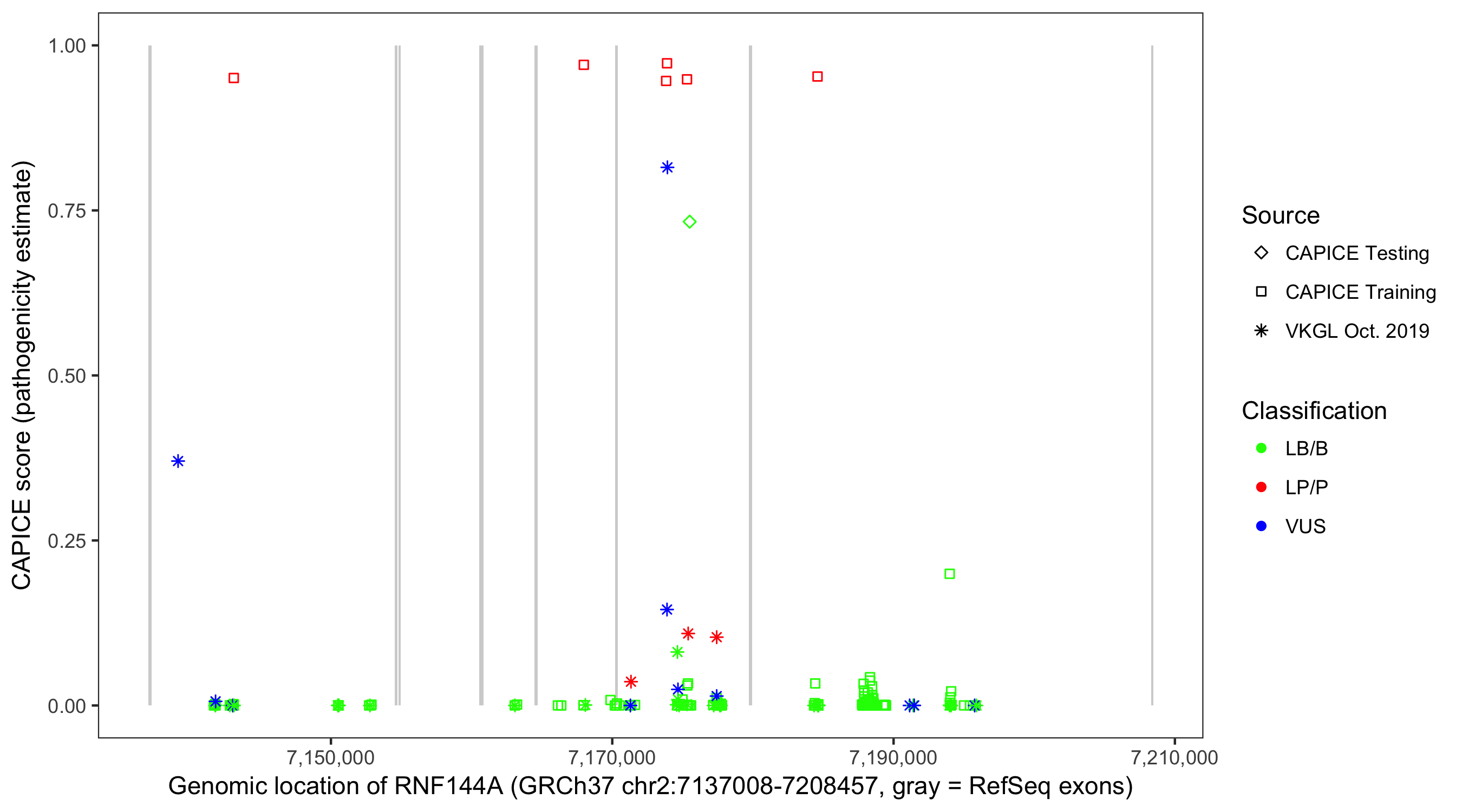Shown are CAPICE train/test variants plus VKGL Oct 2019.