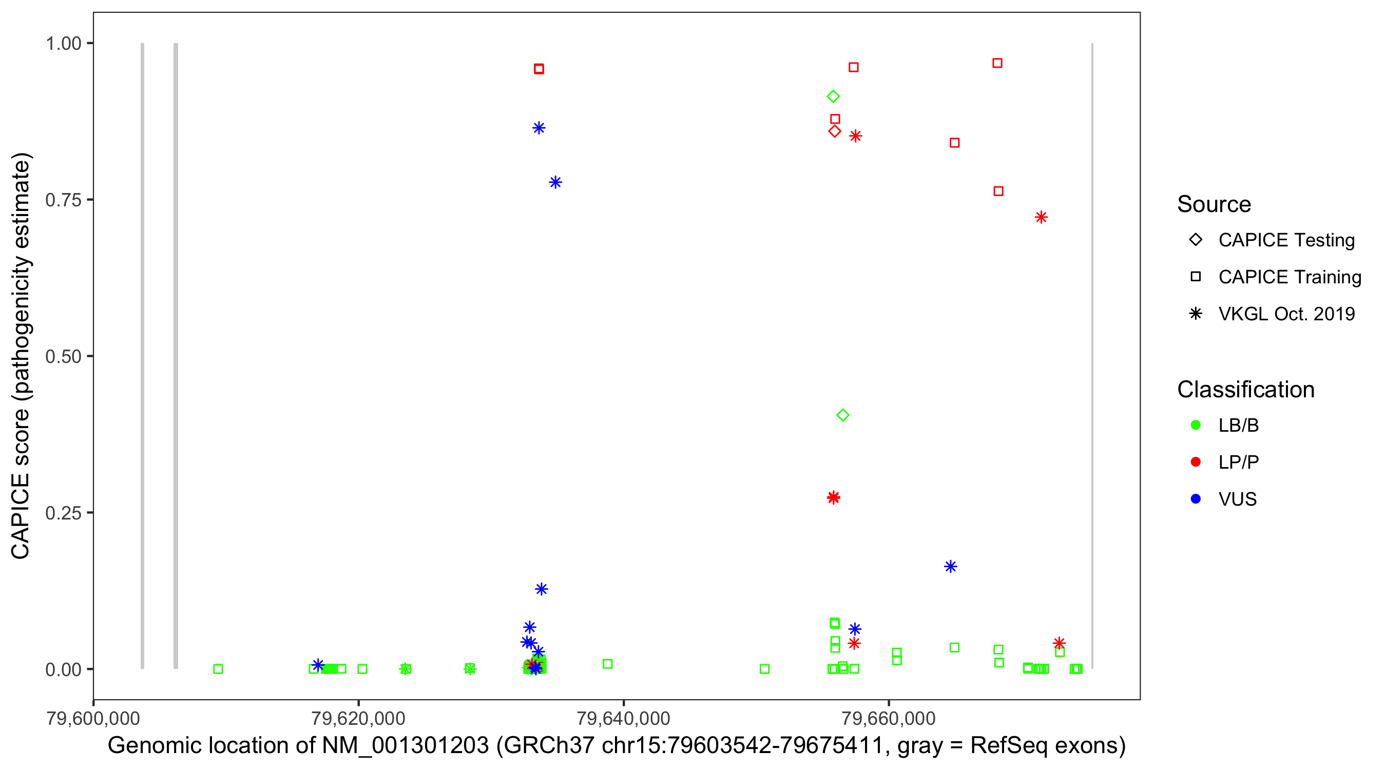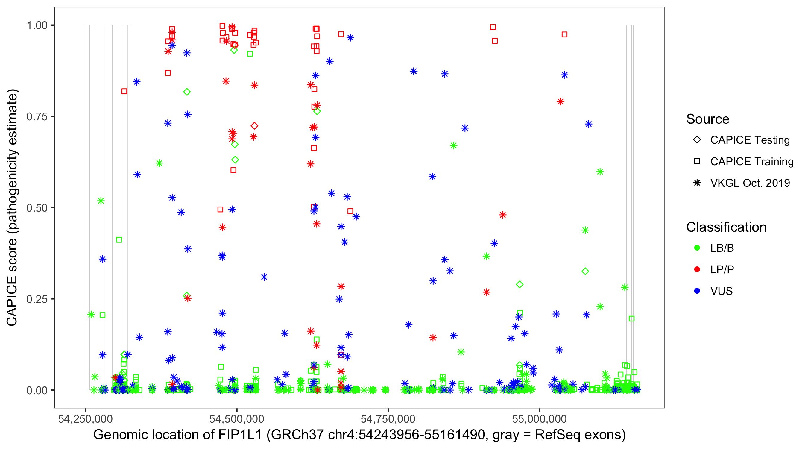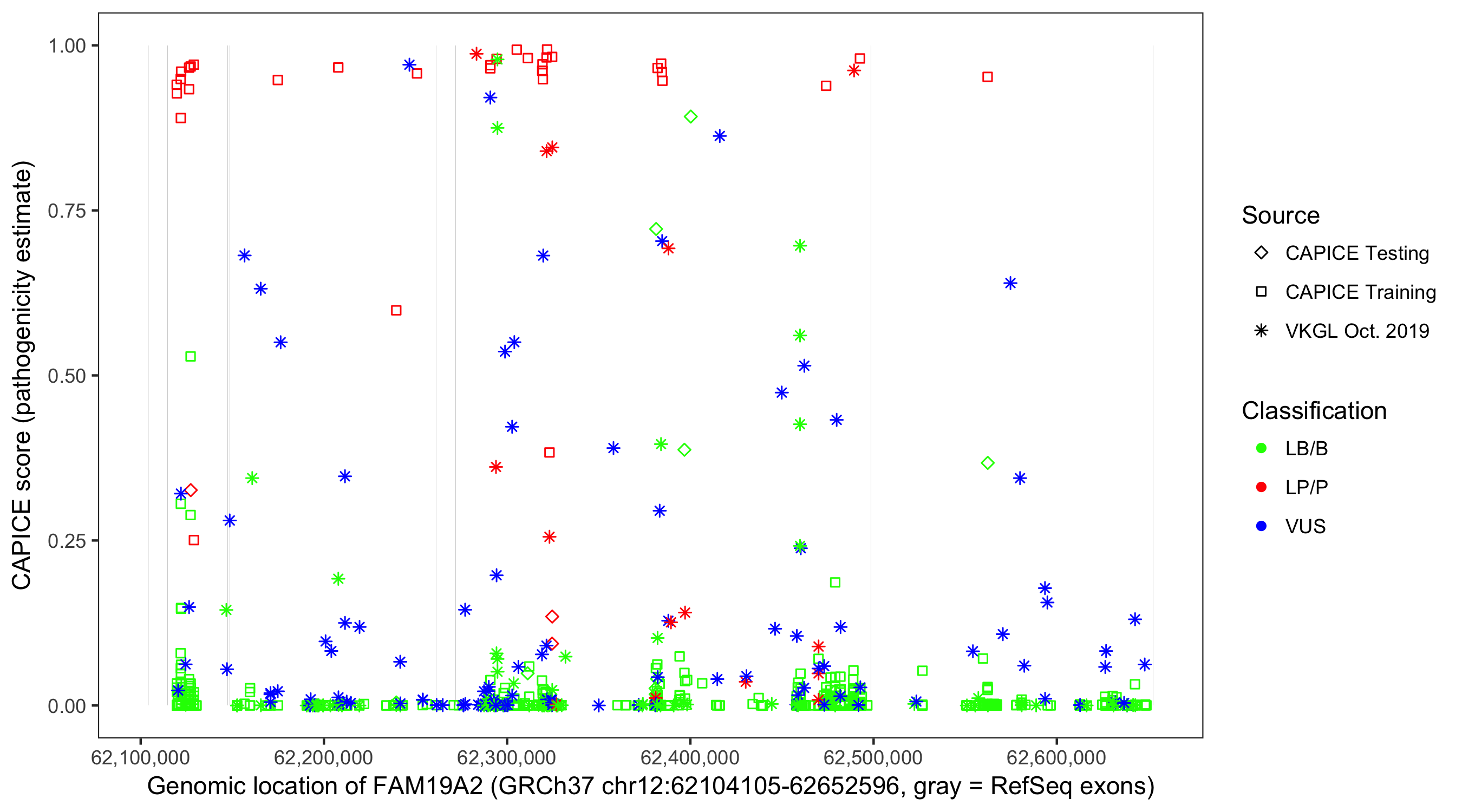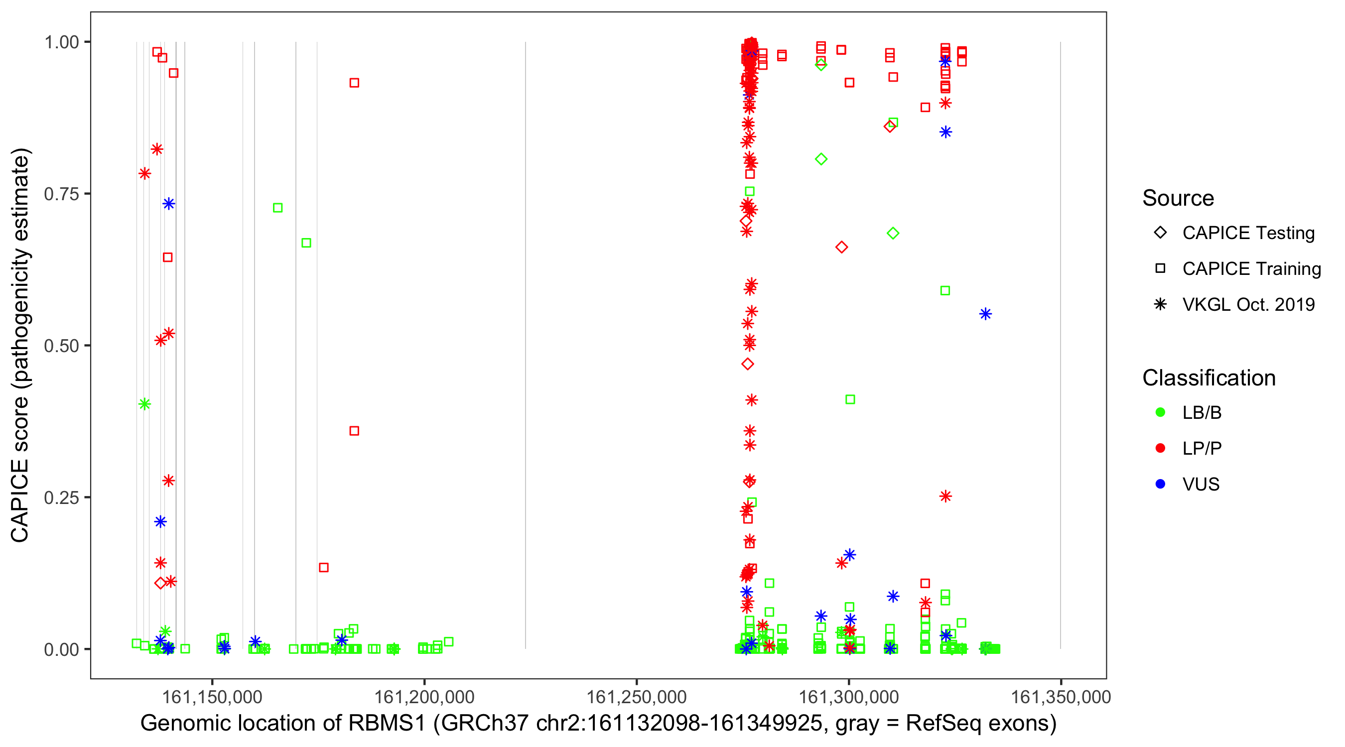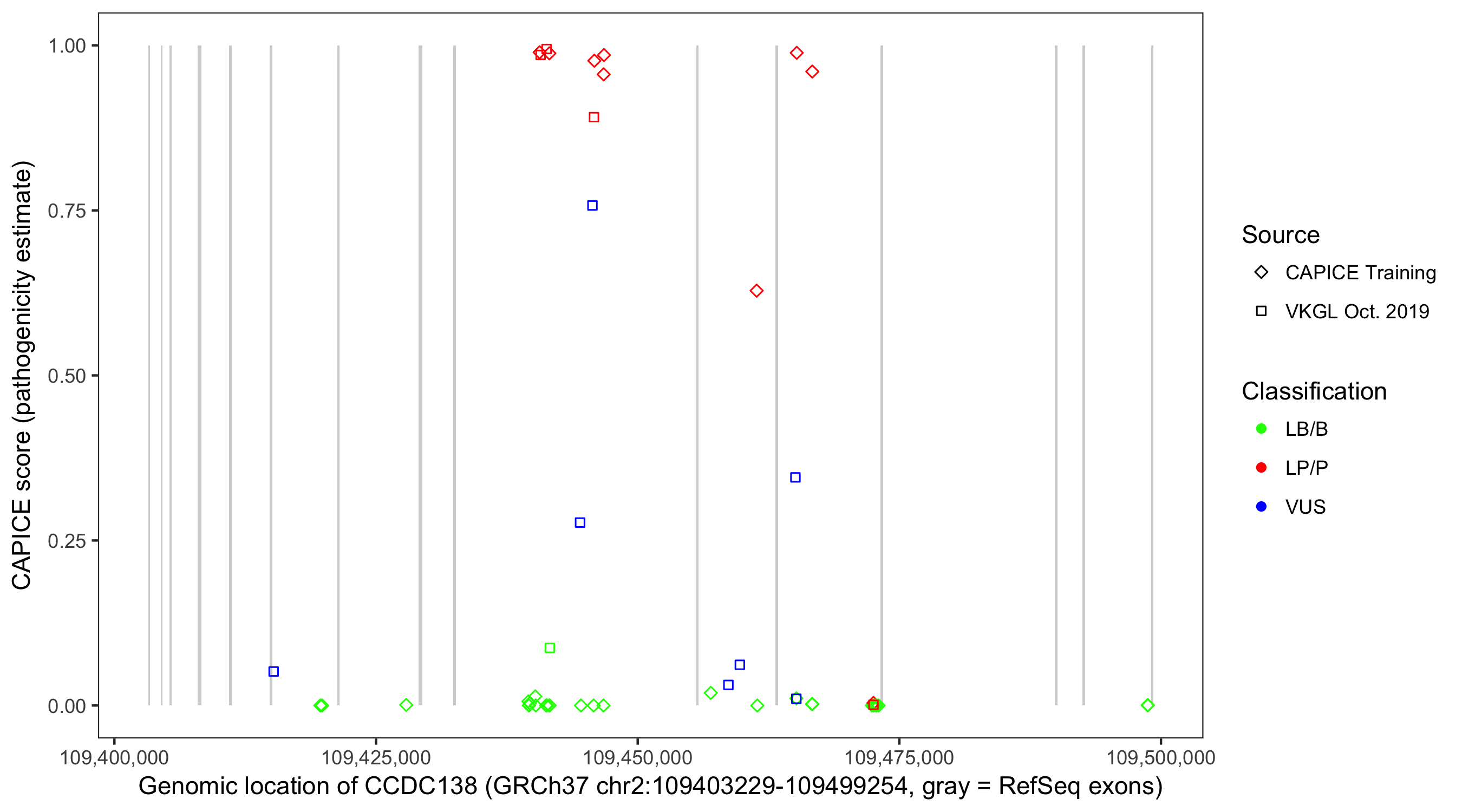 Shown are CAPICE train/test variants plus VKGL Oct 2019.