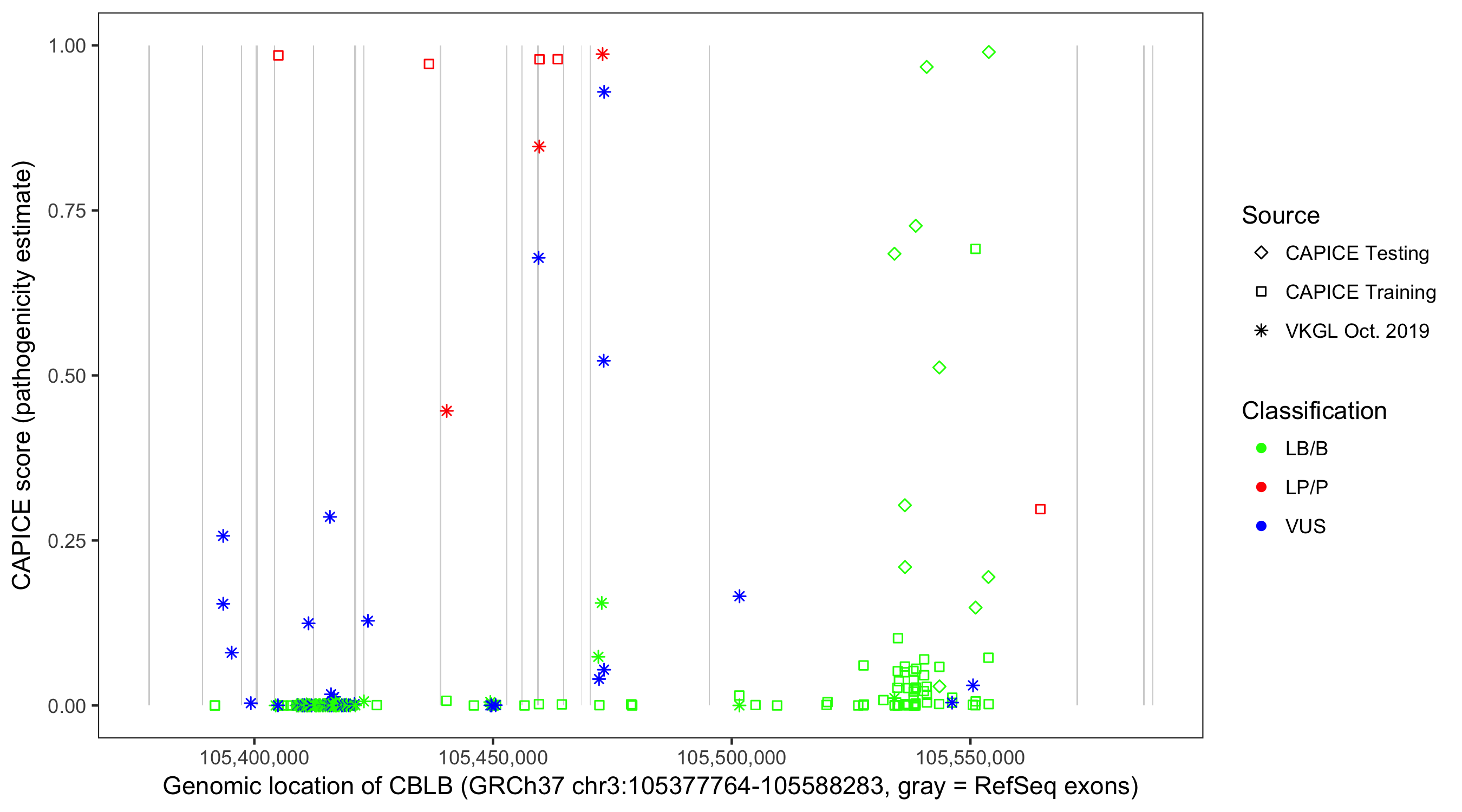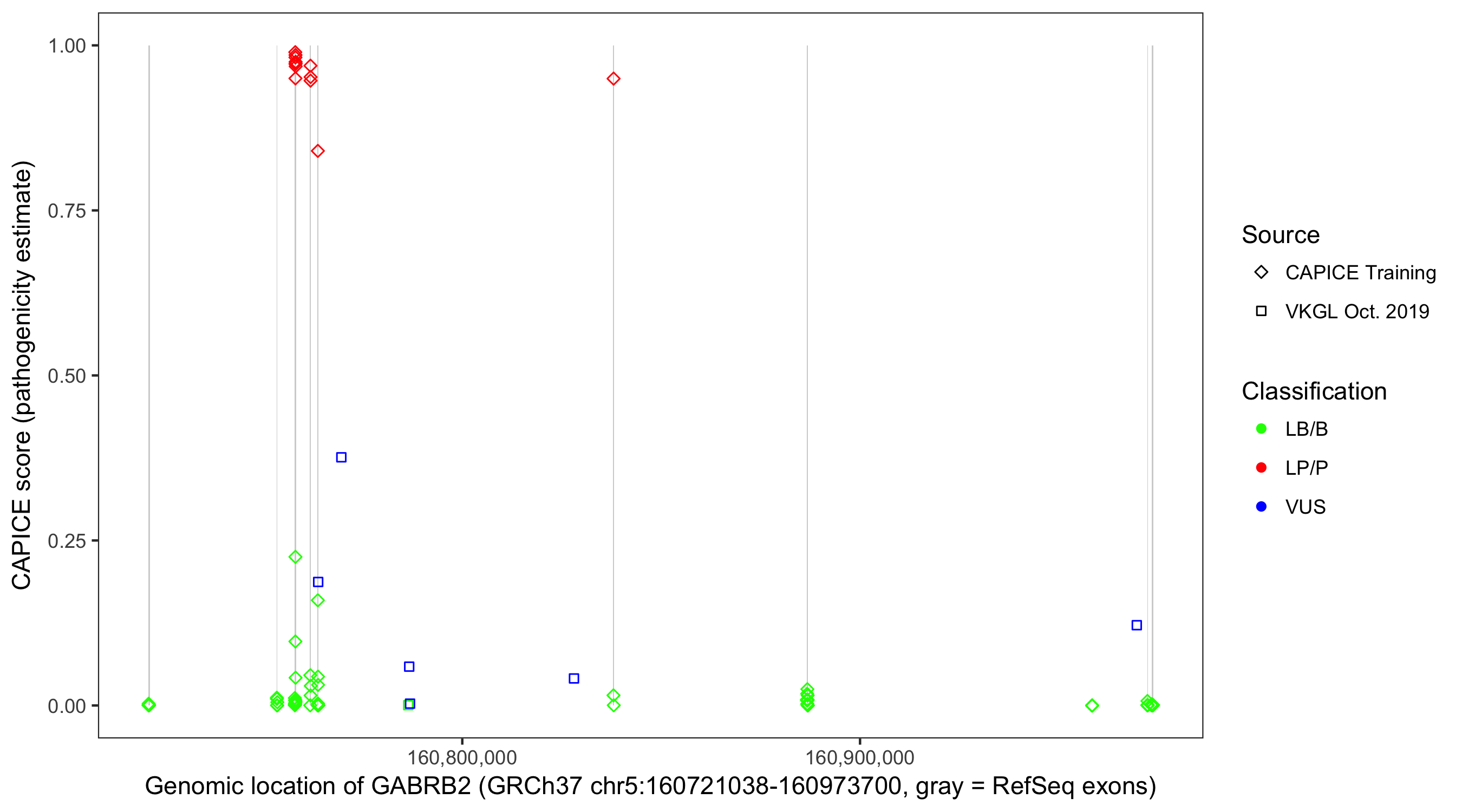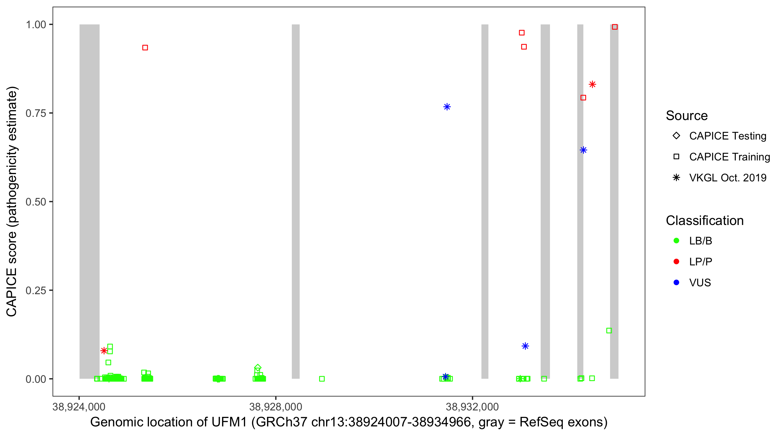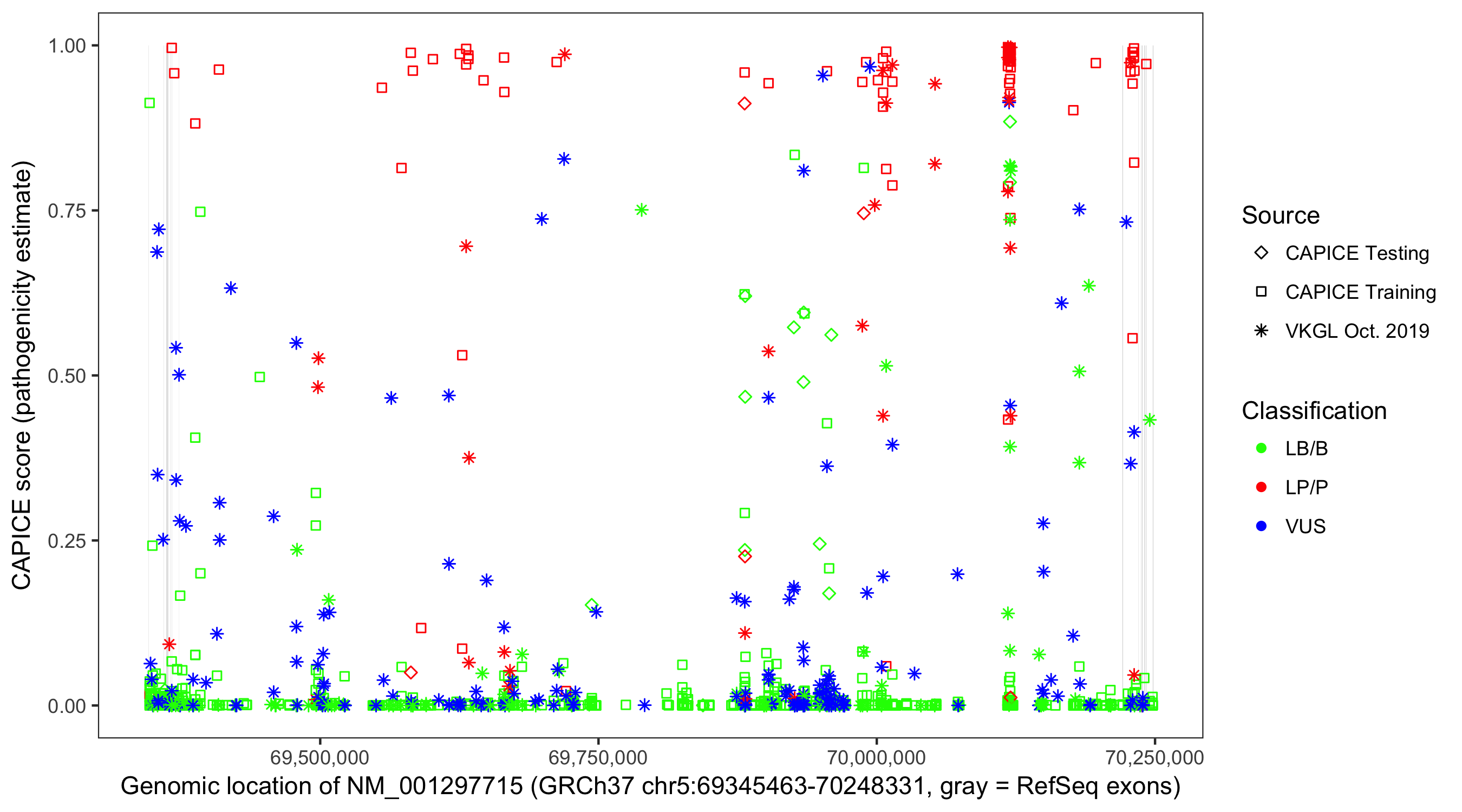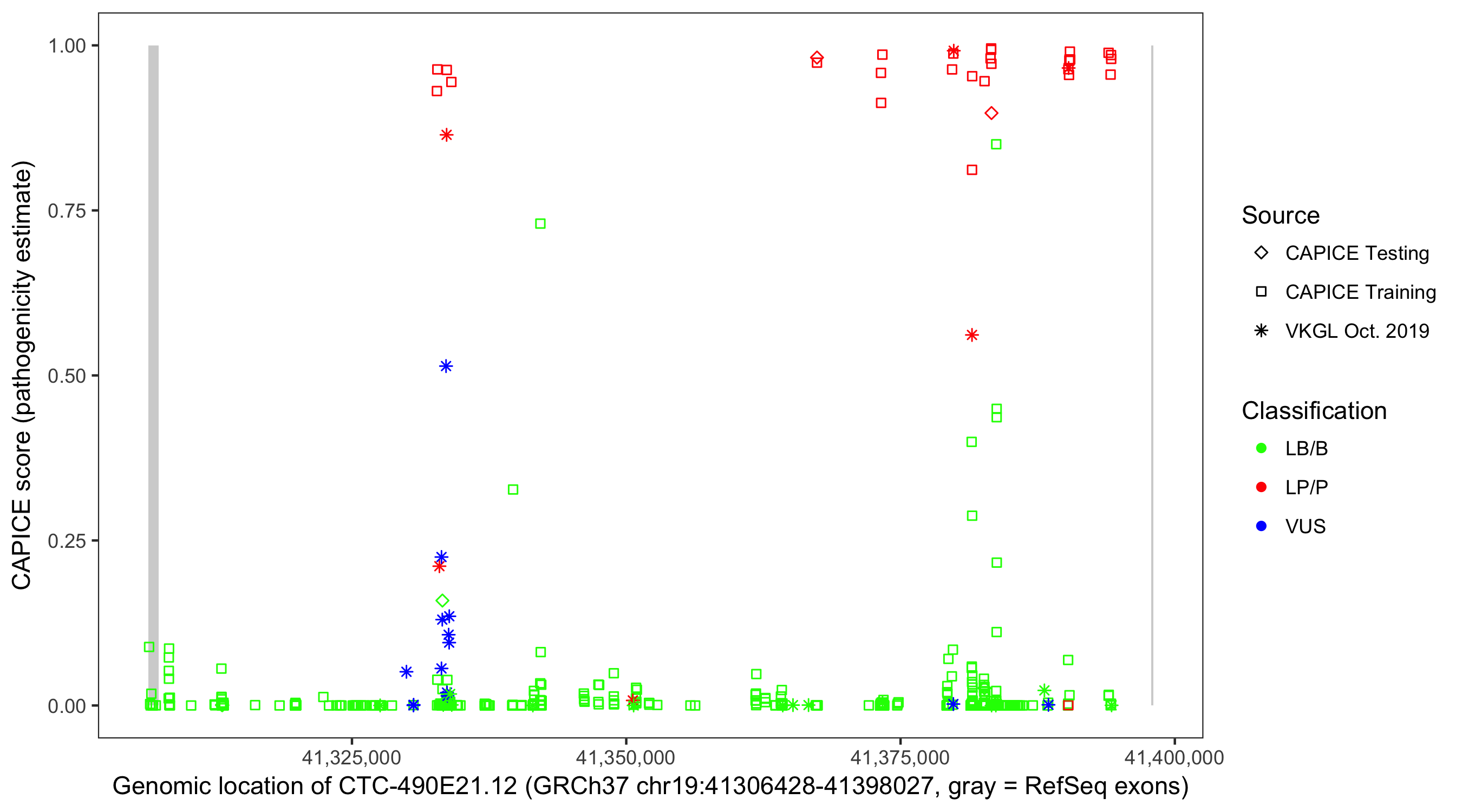 Shown are CAPICE train/test variants plus VKGL Oct 2019.