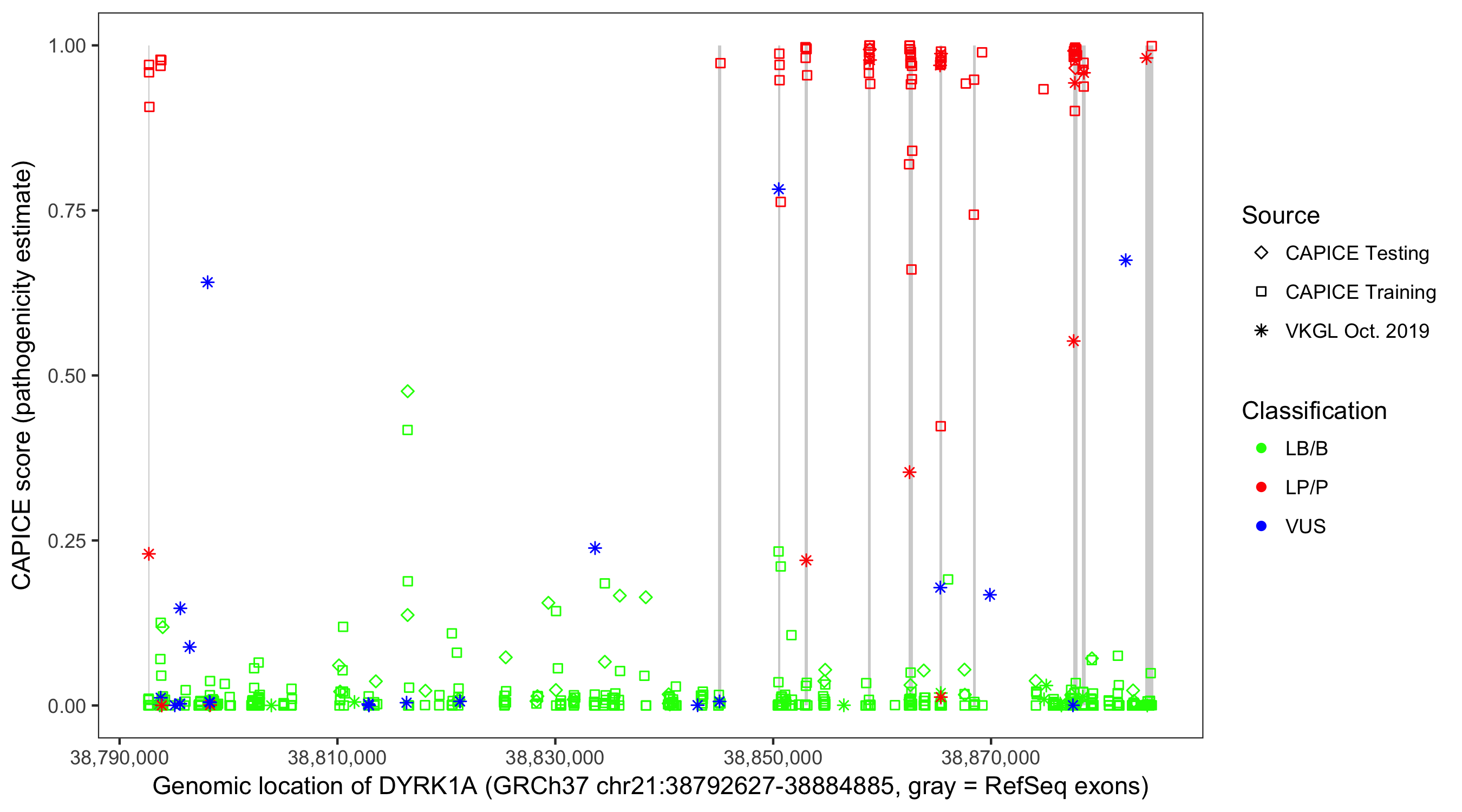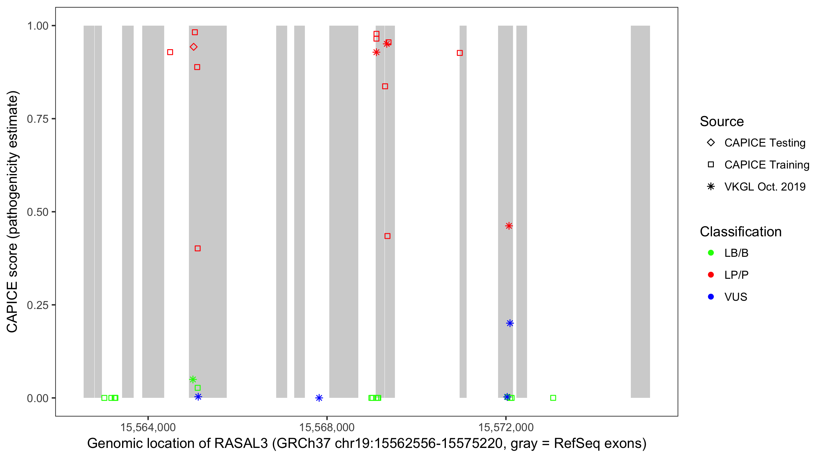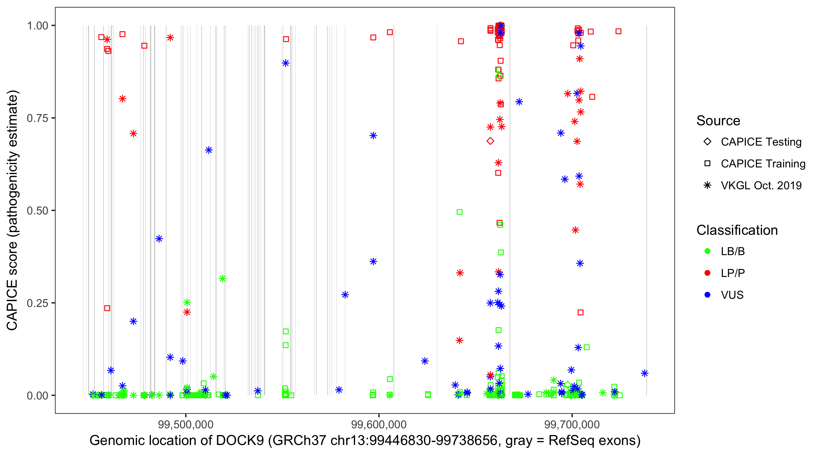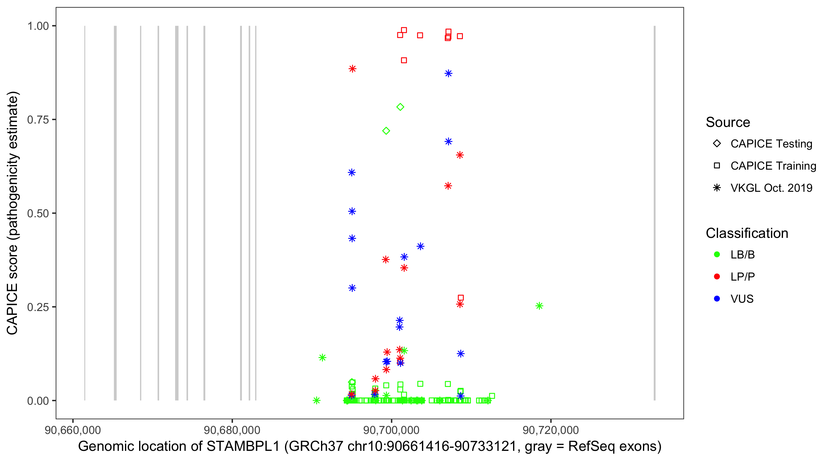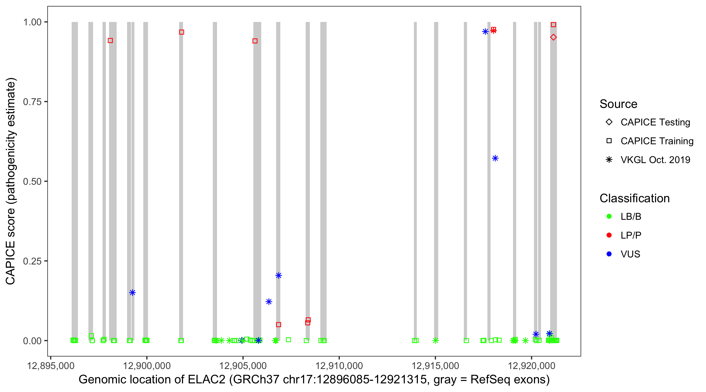 Shown are CAPICE train/test variants plus VKGL Oct 2019.