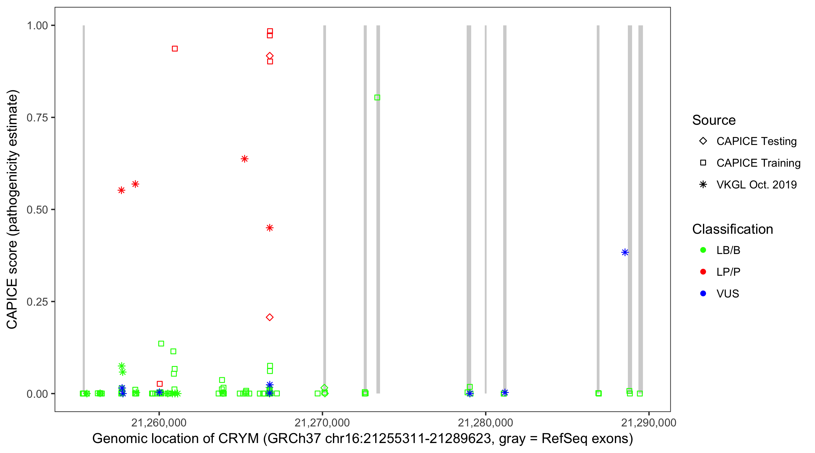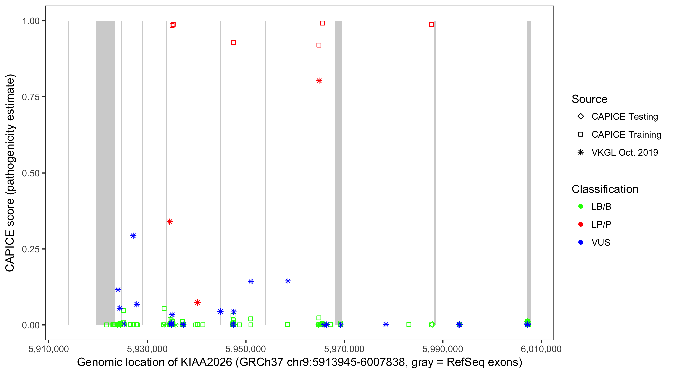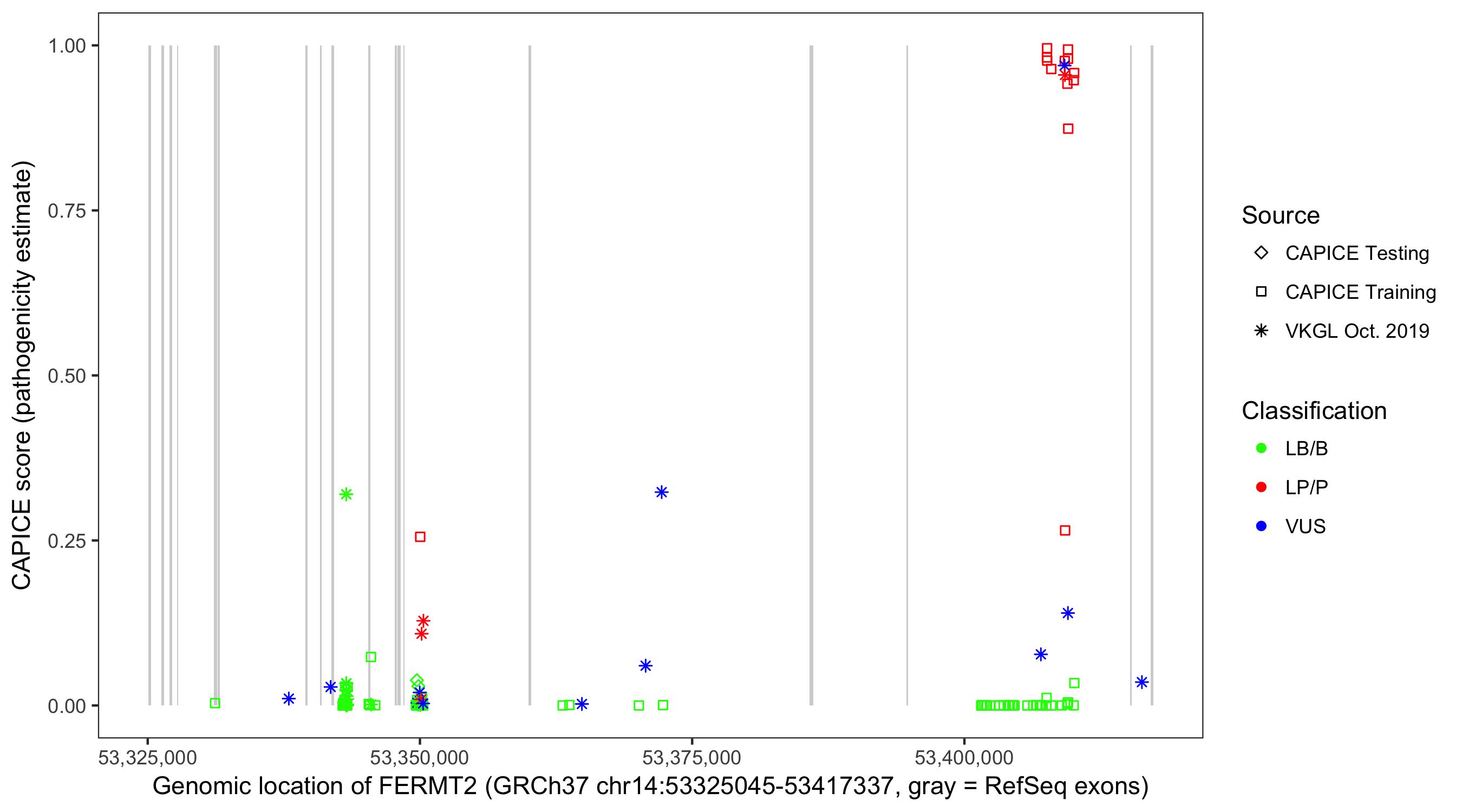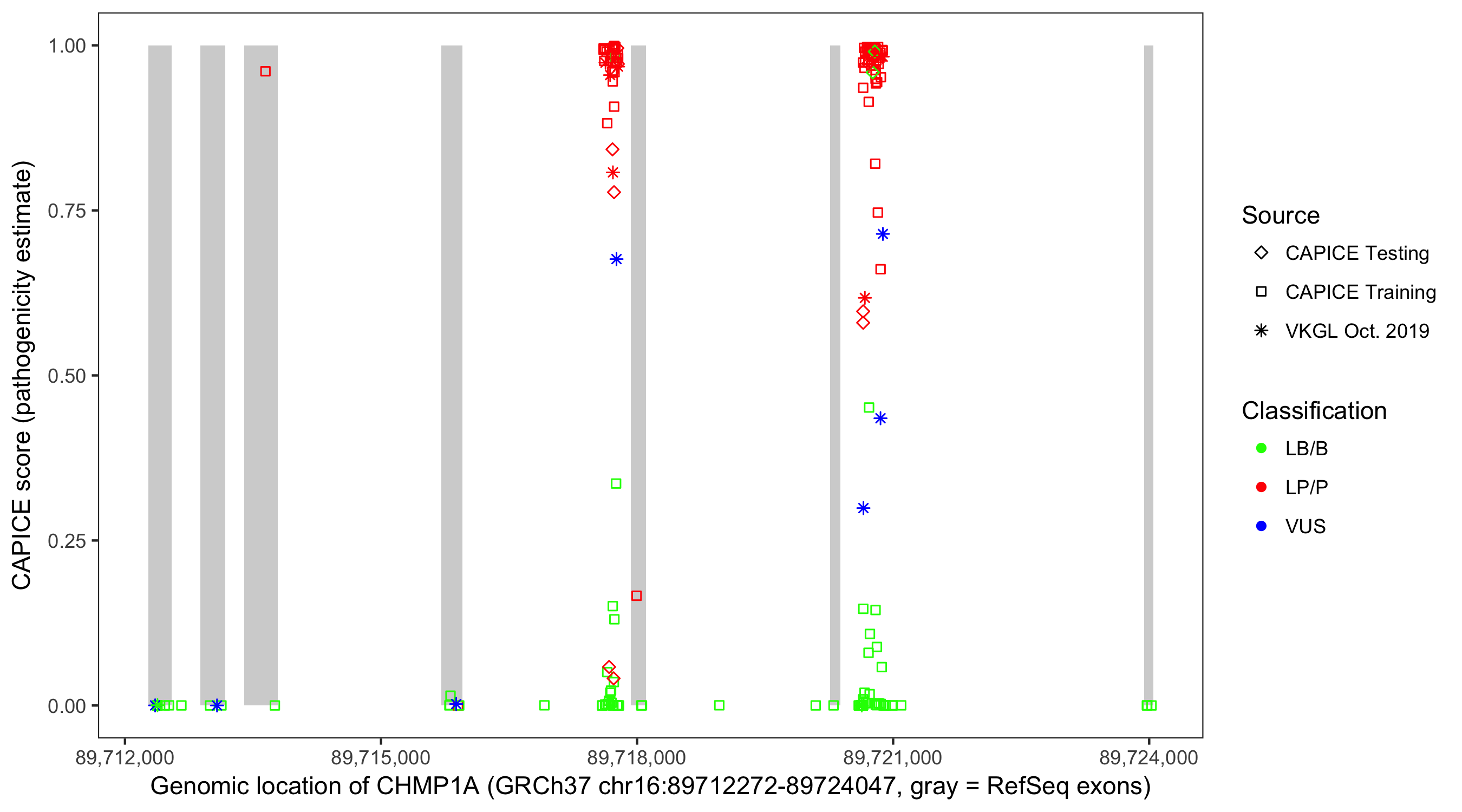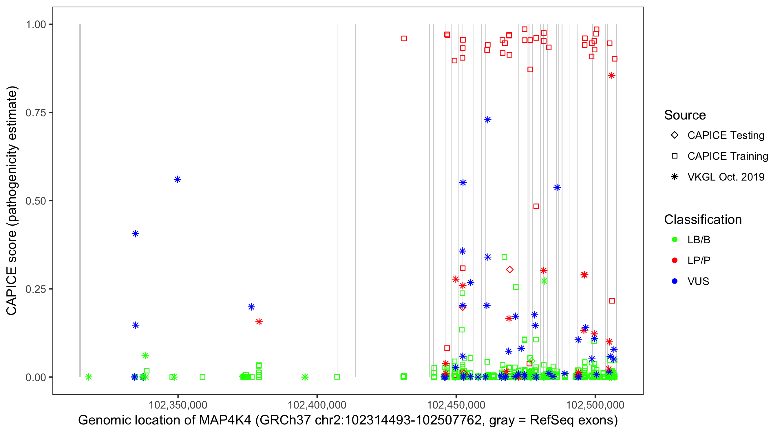 Shown are CAPICE train/test variants plus VKGL Oct 2019.