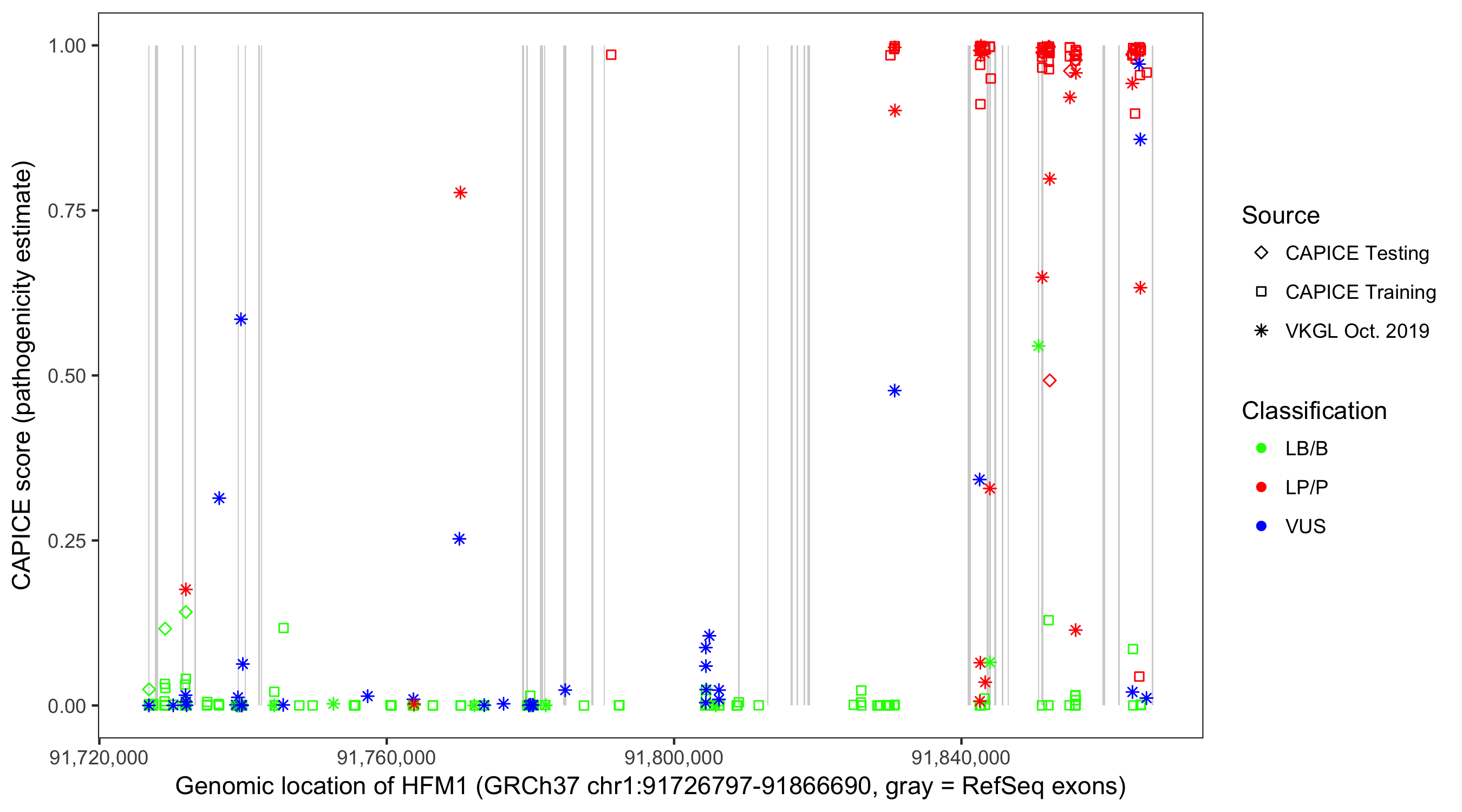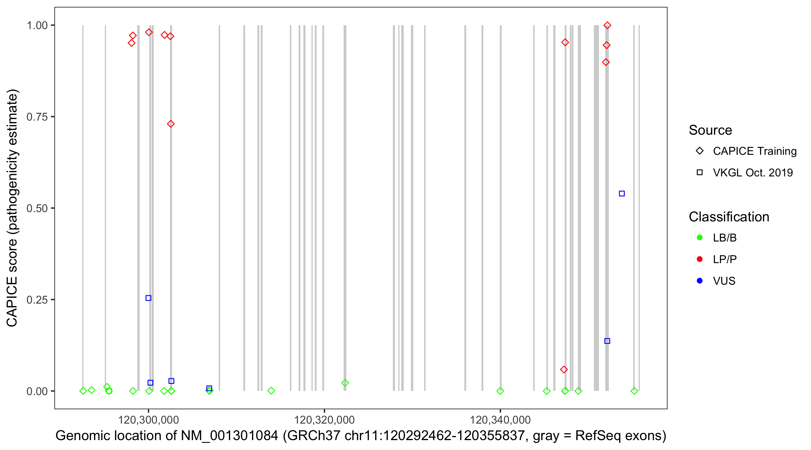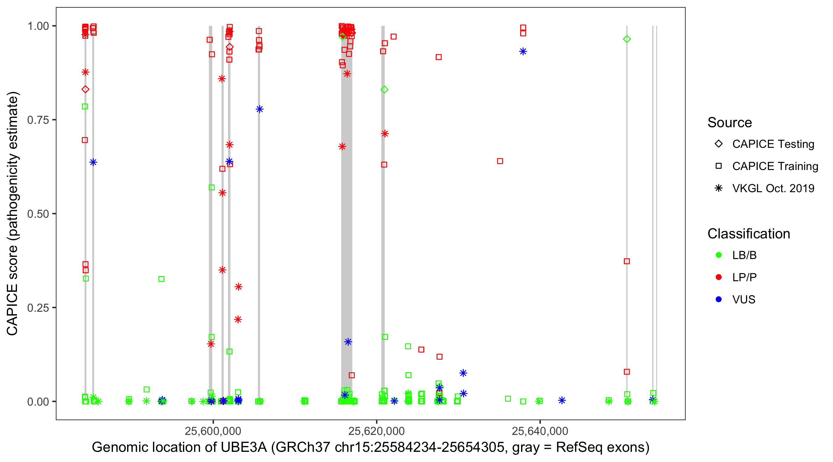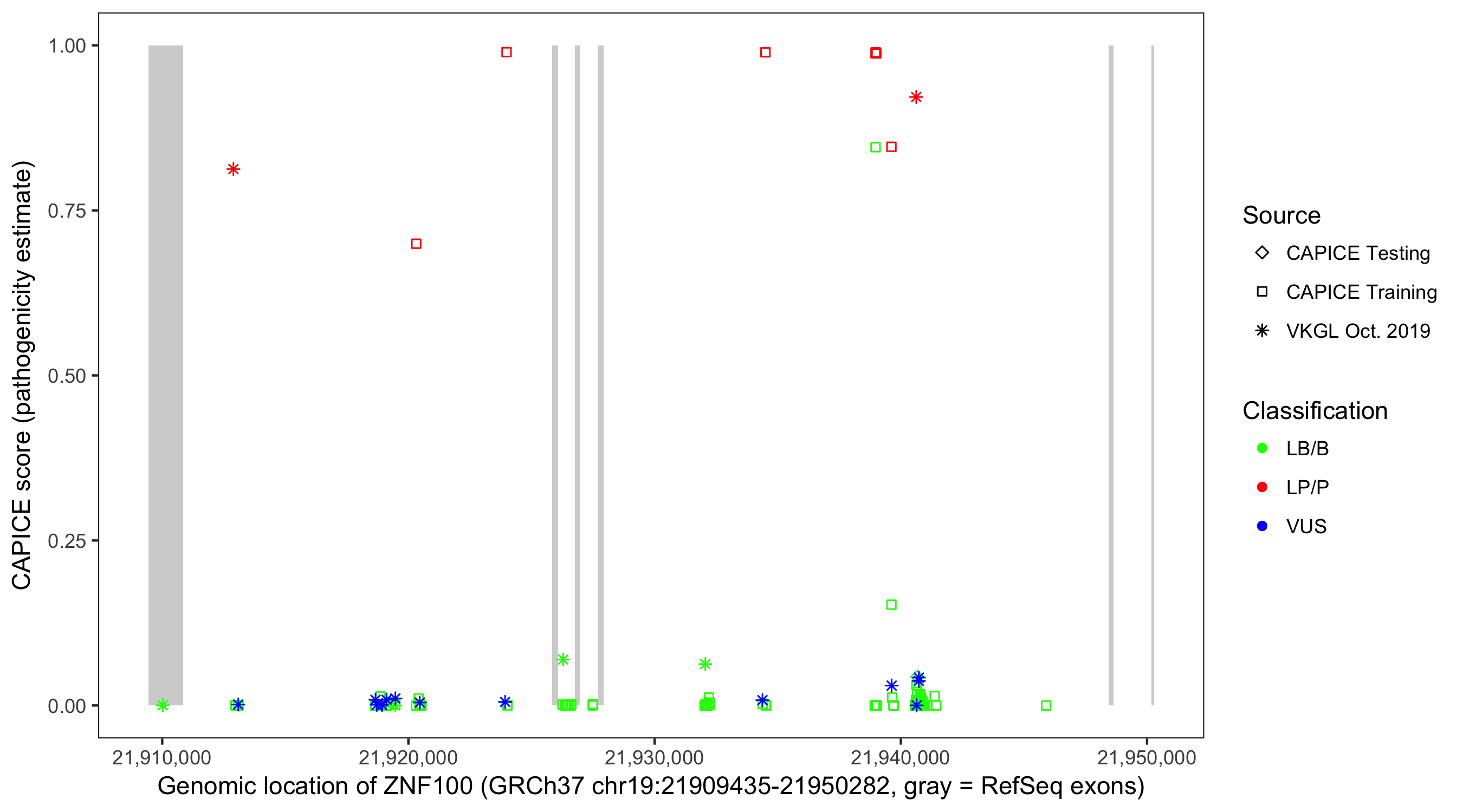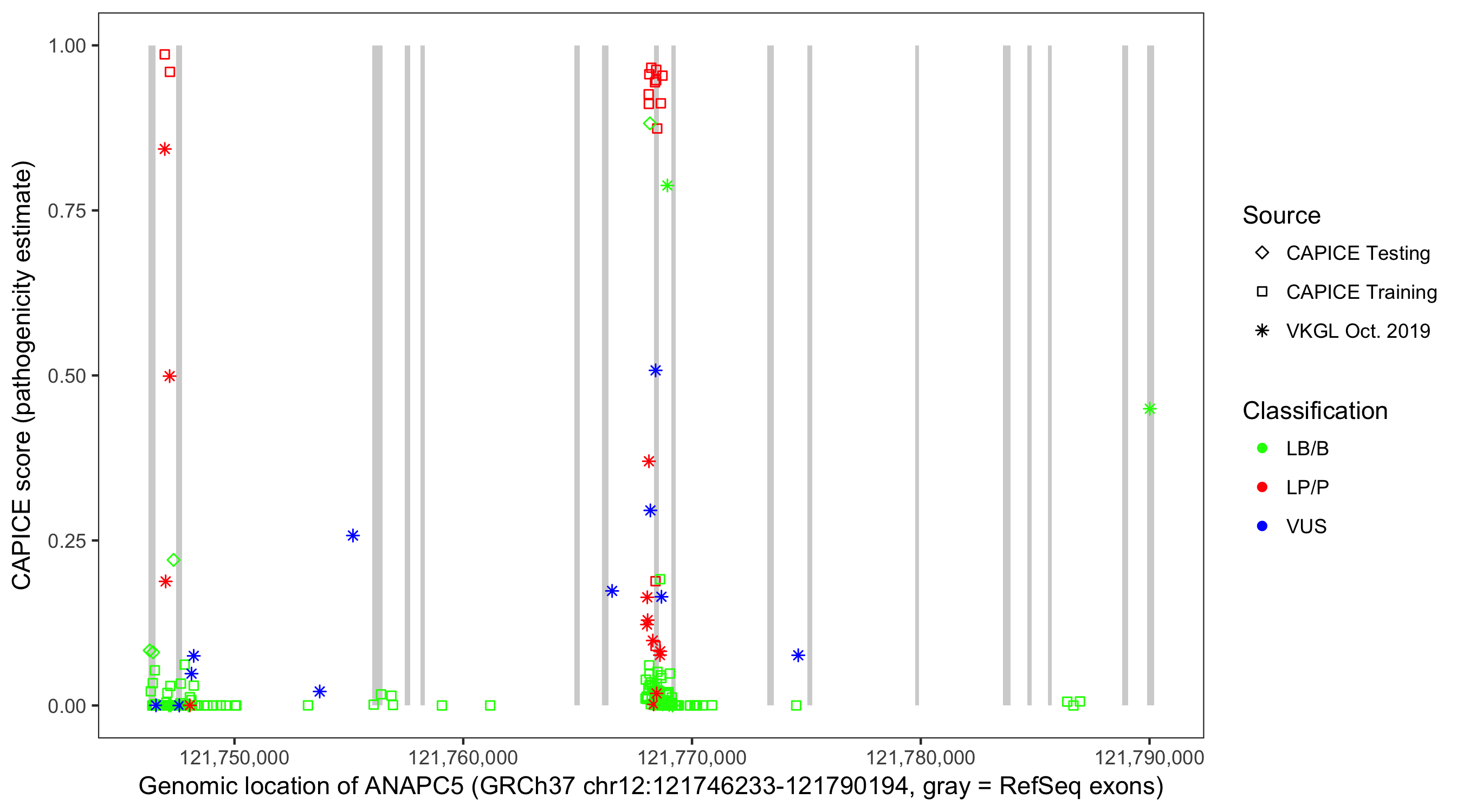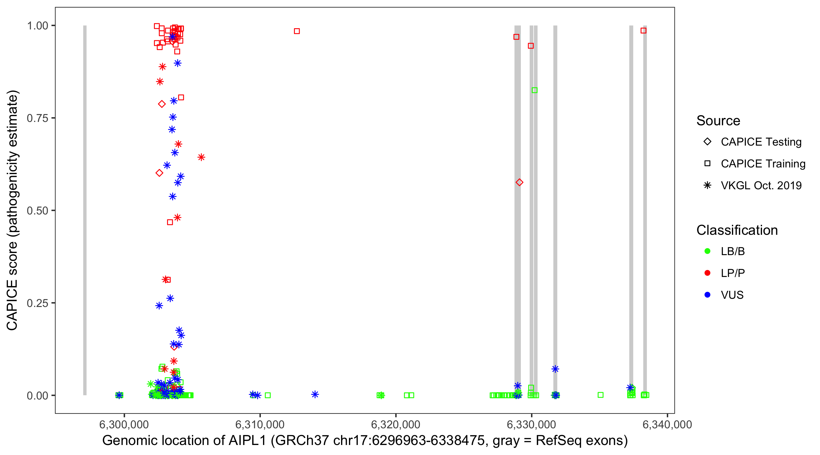 Shown are CAPICE train/test variants plus VKGL Oct 2019.