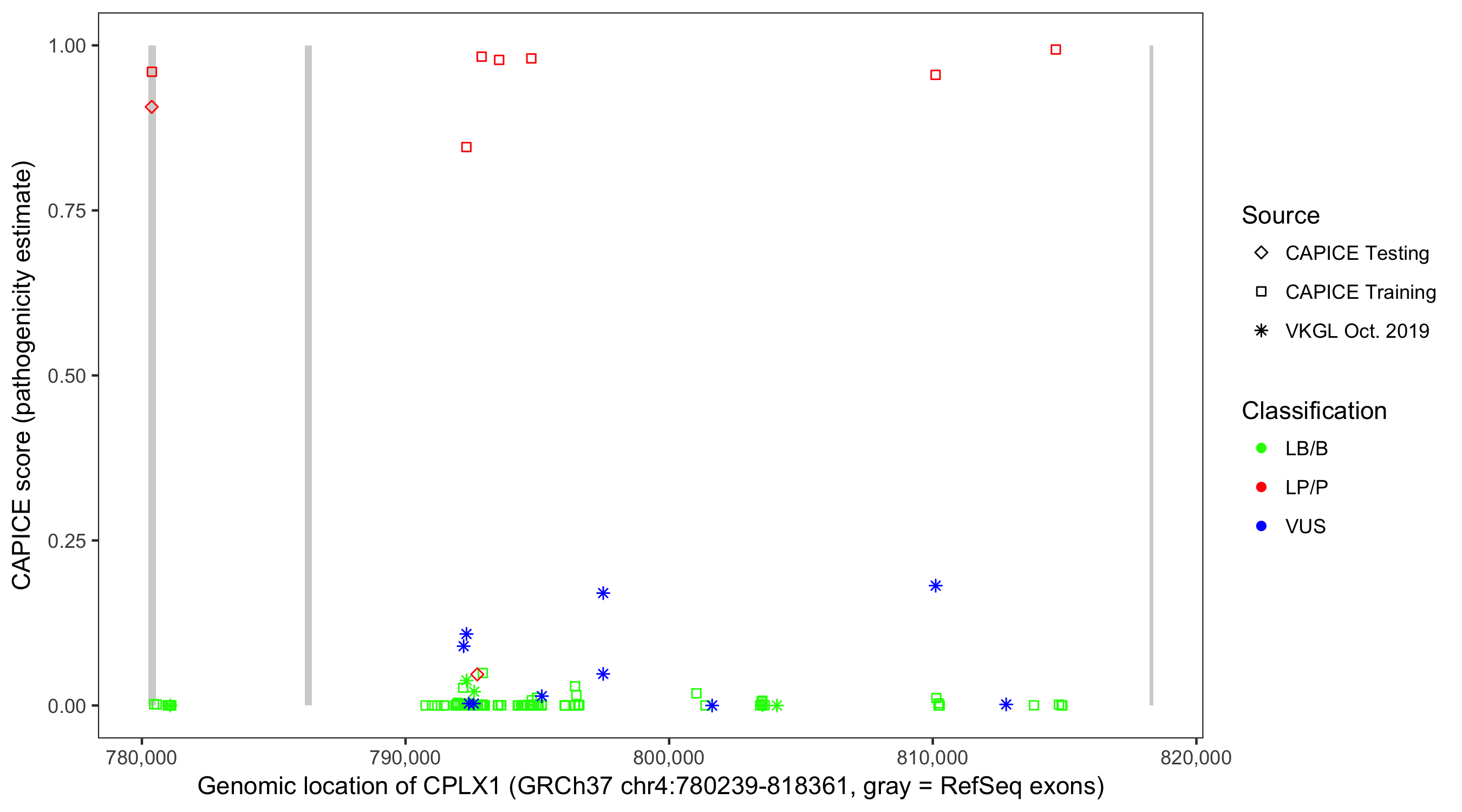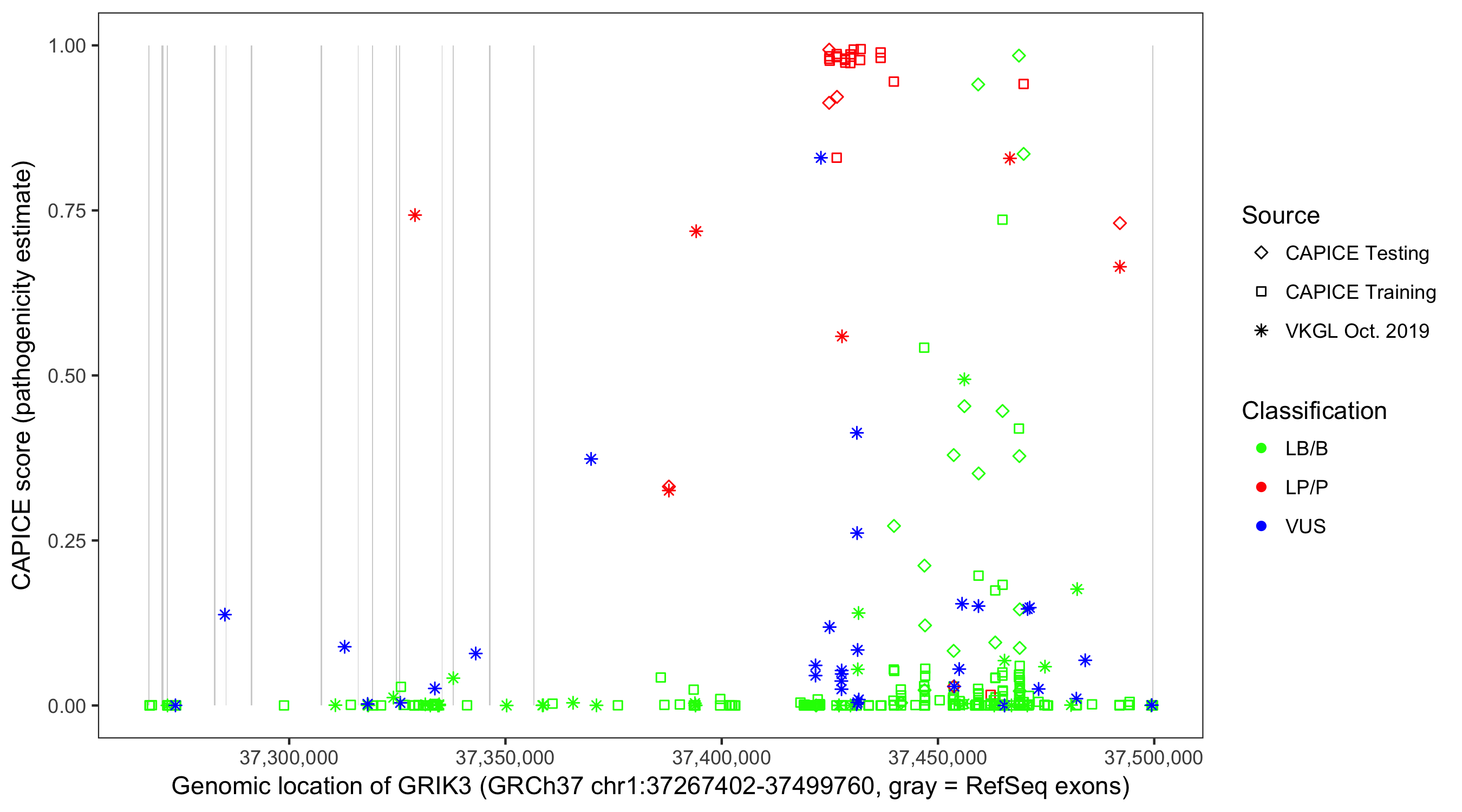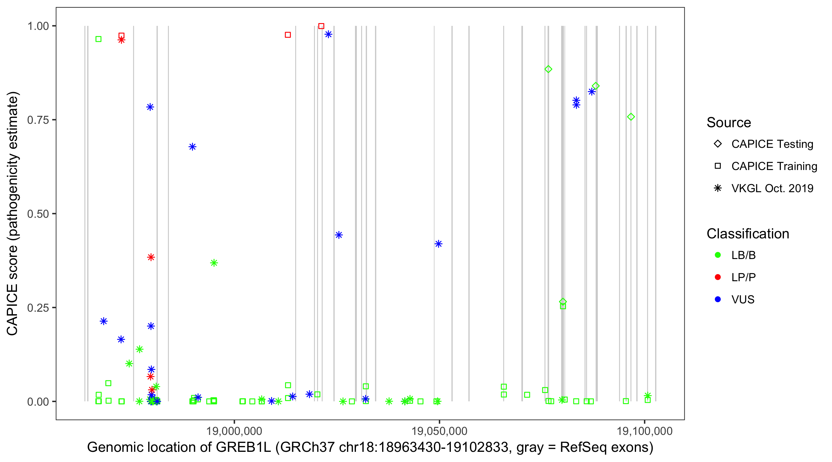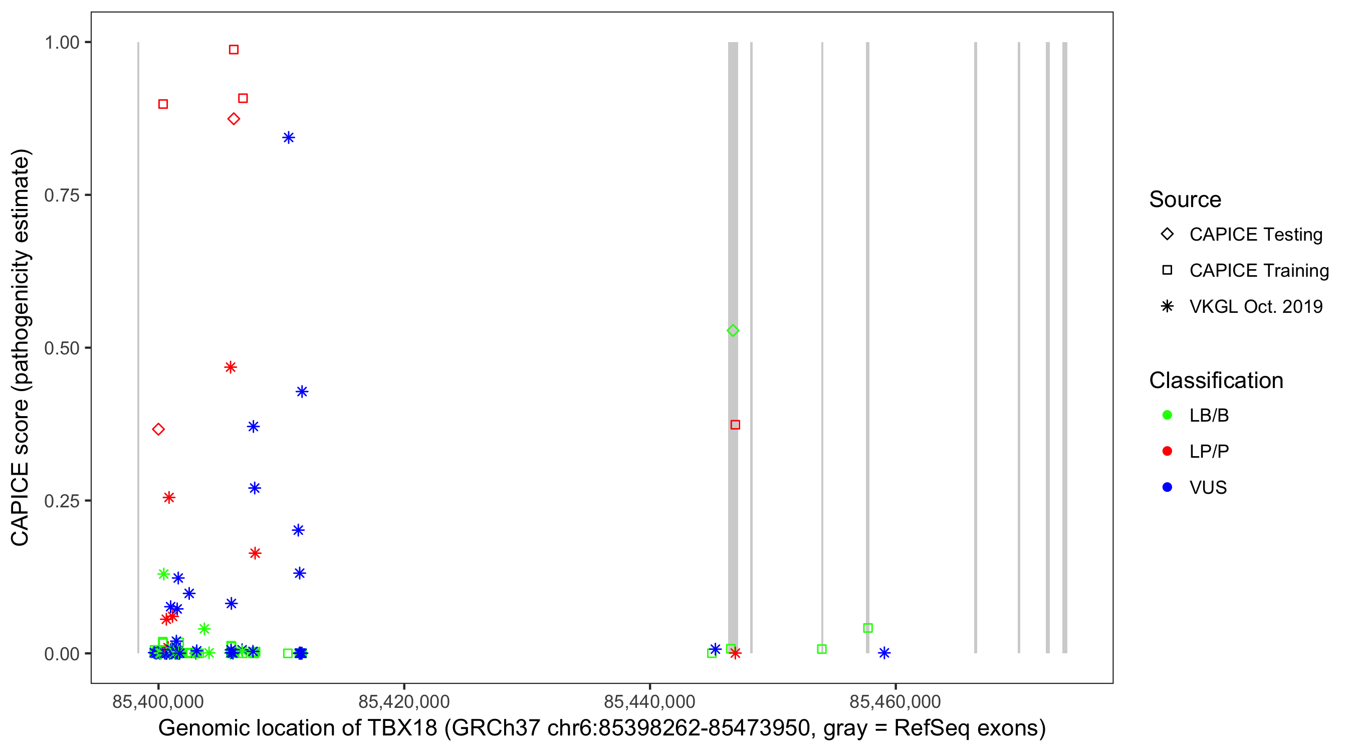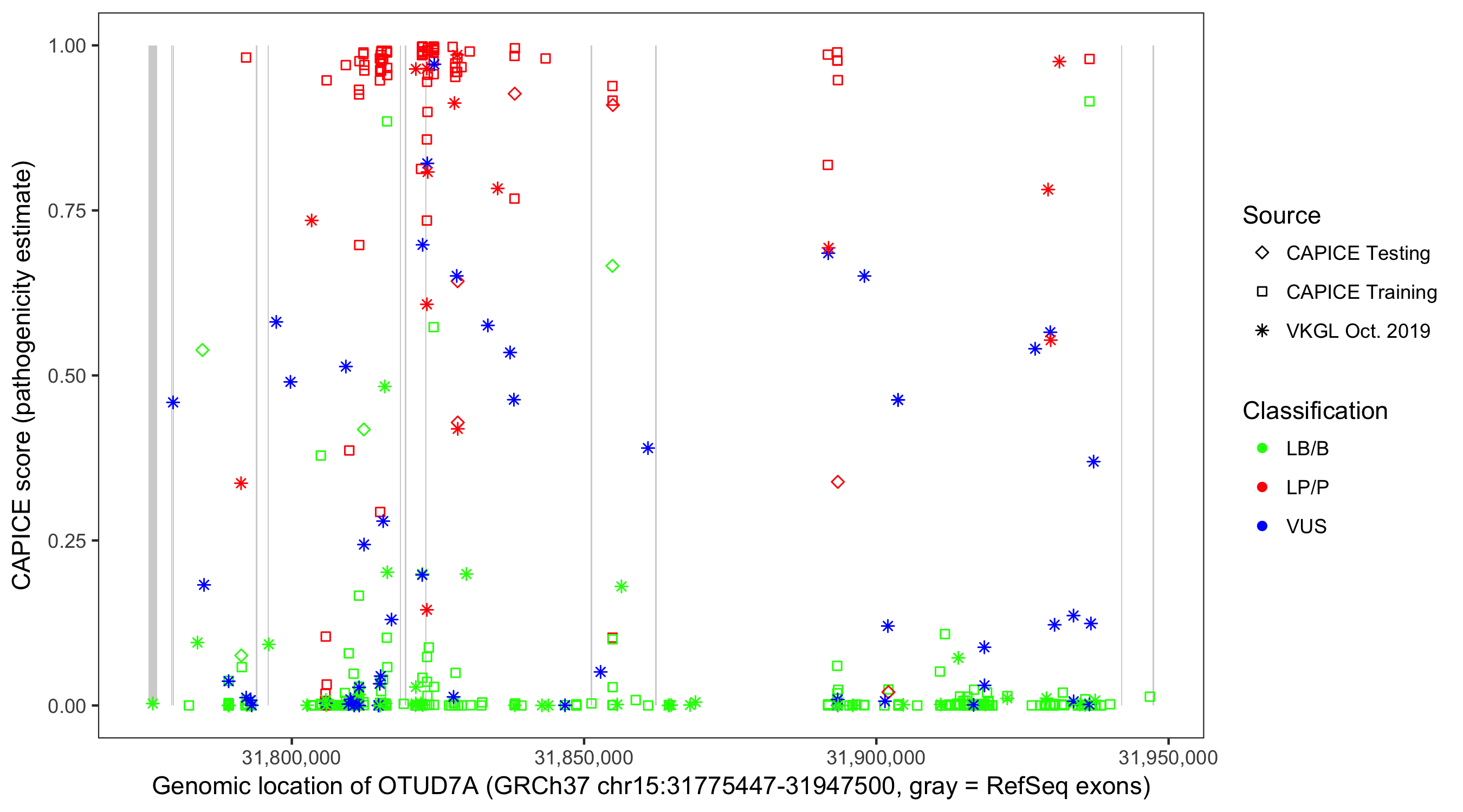 Shown are CAPICE train/test variants plus VKGL Oct 2019.