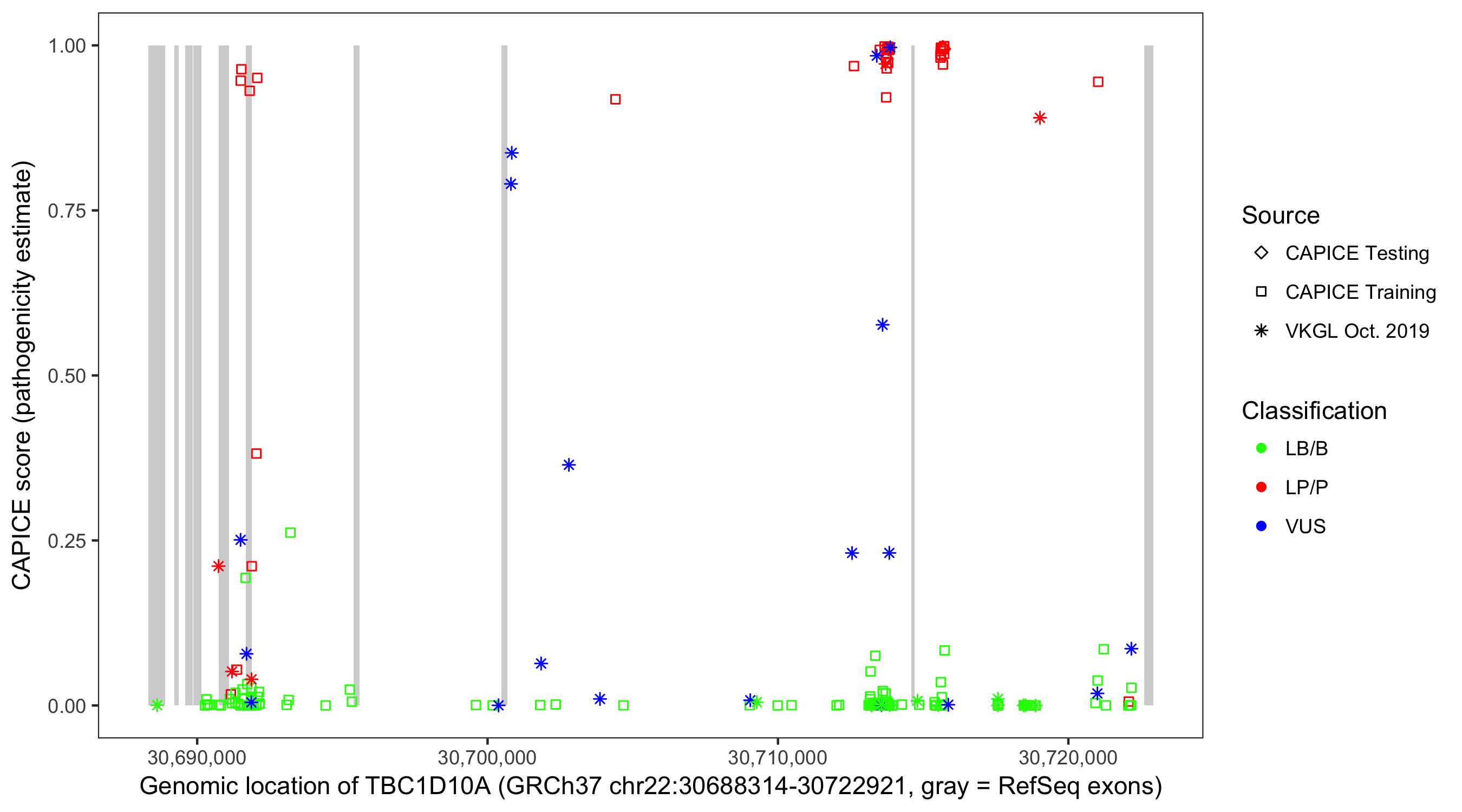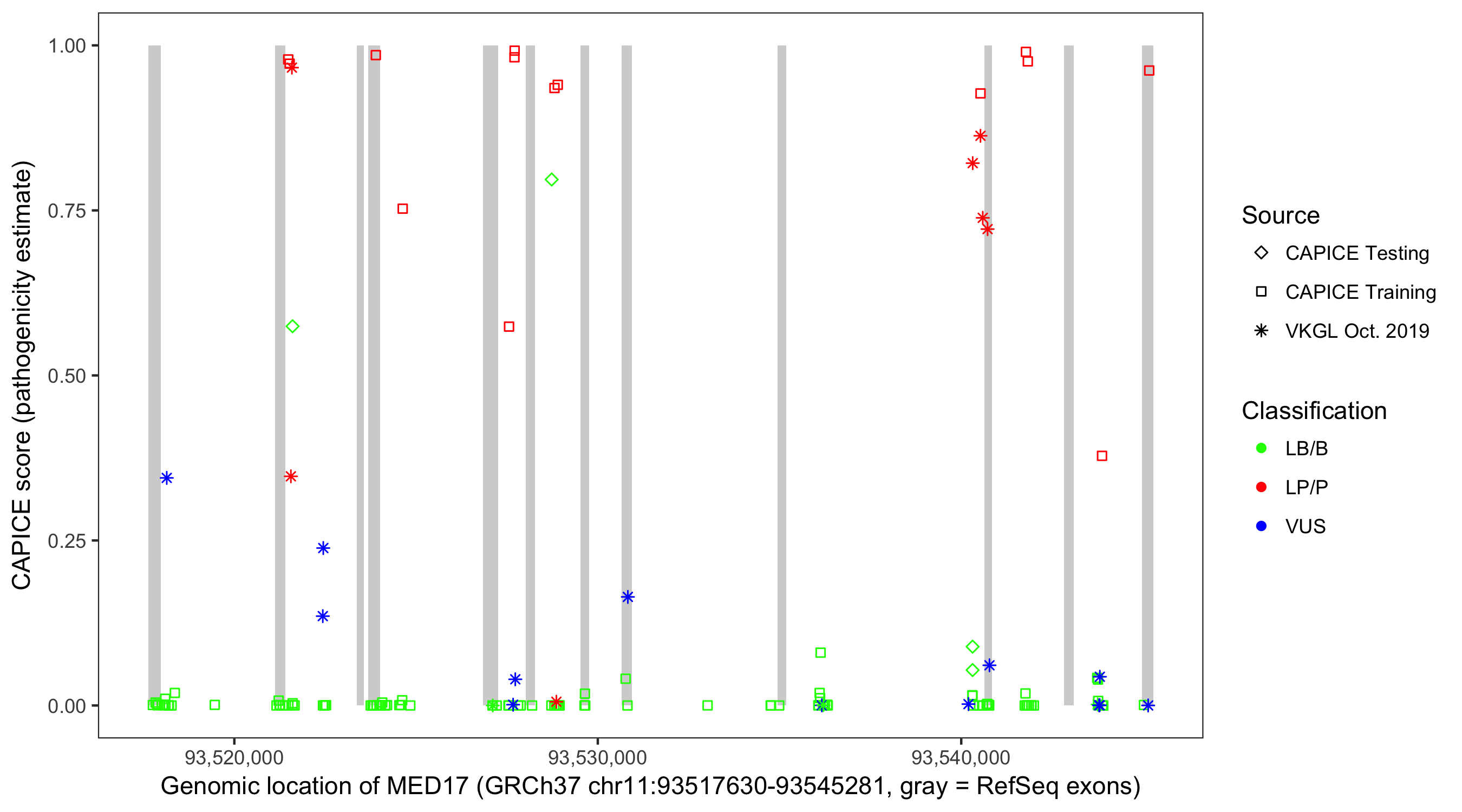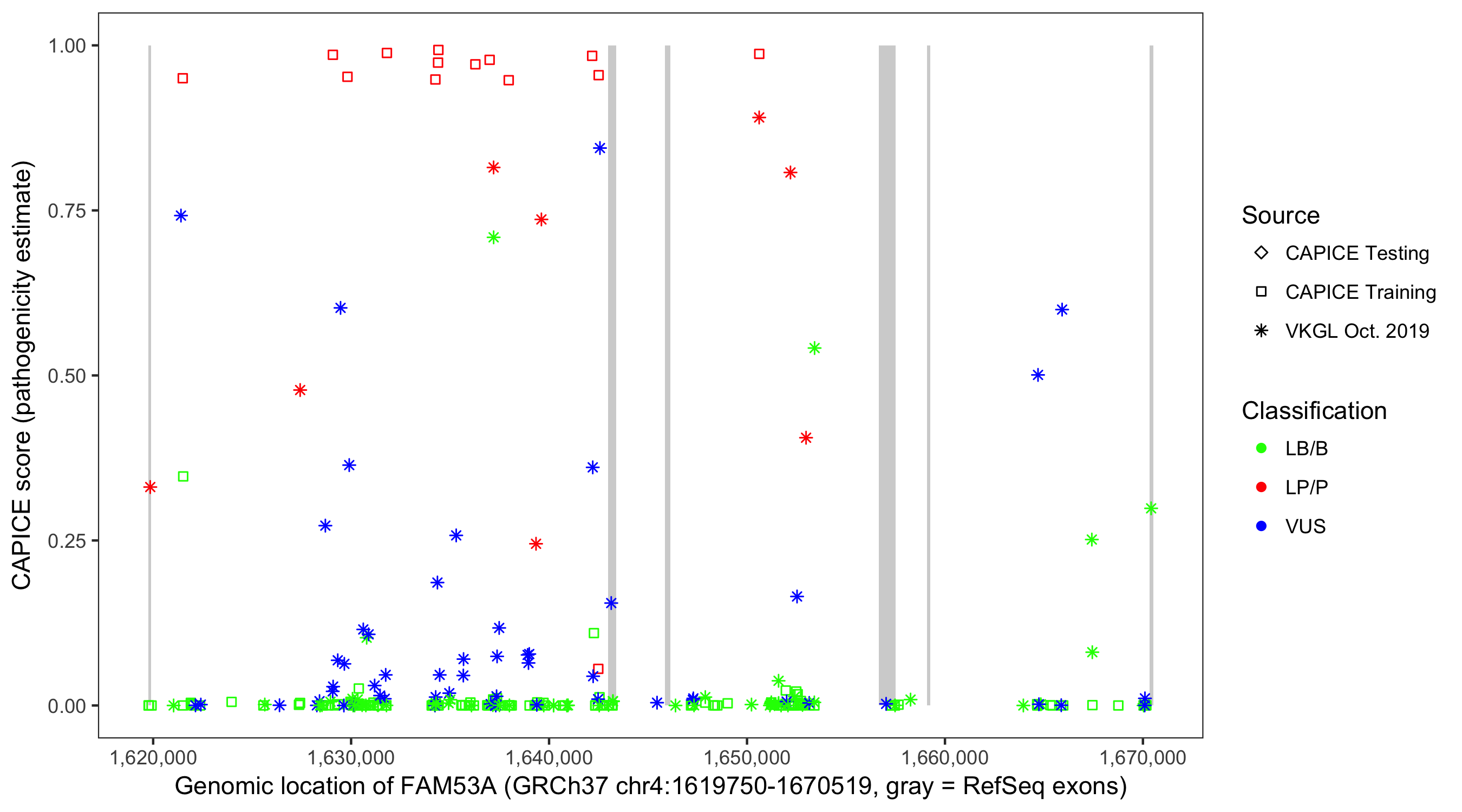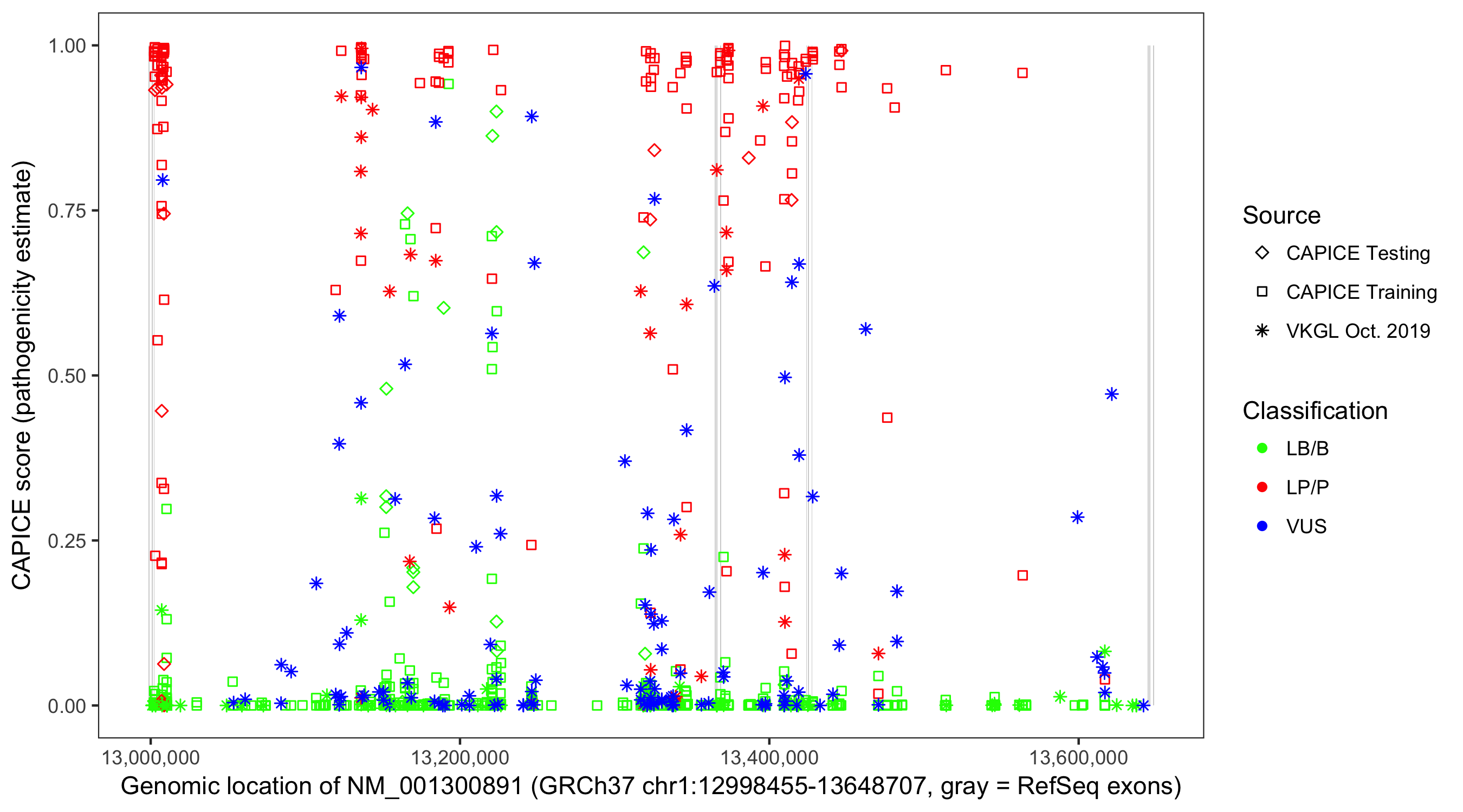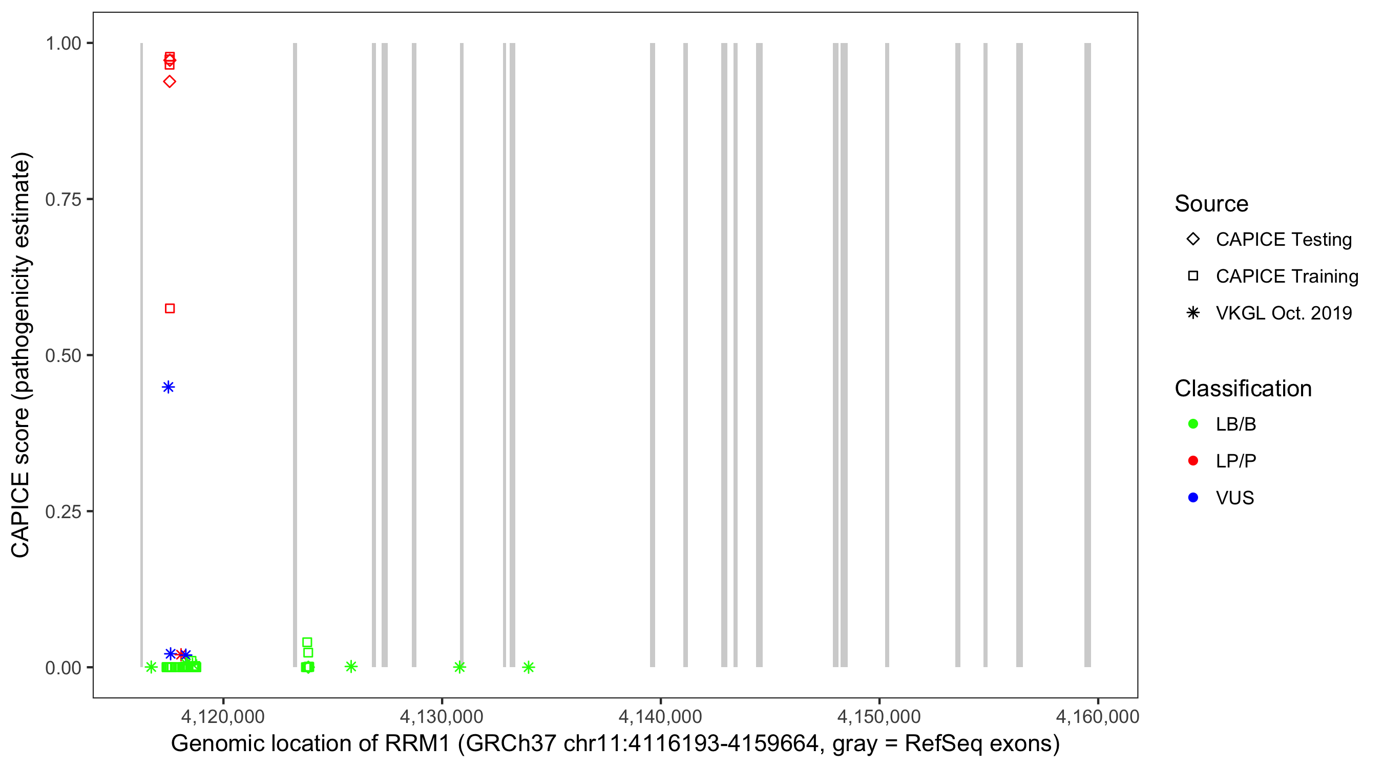 Shown are CAPICE train/test variants plus VKGL Oct 2019.