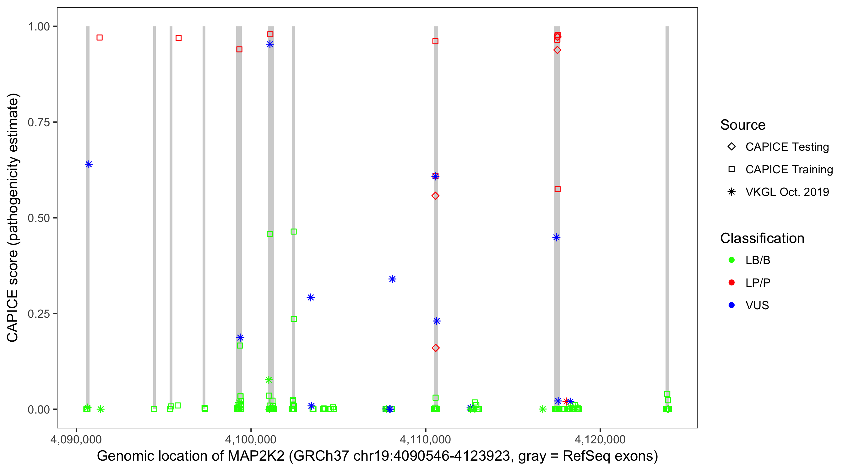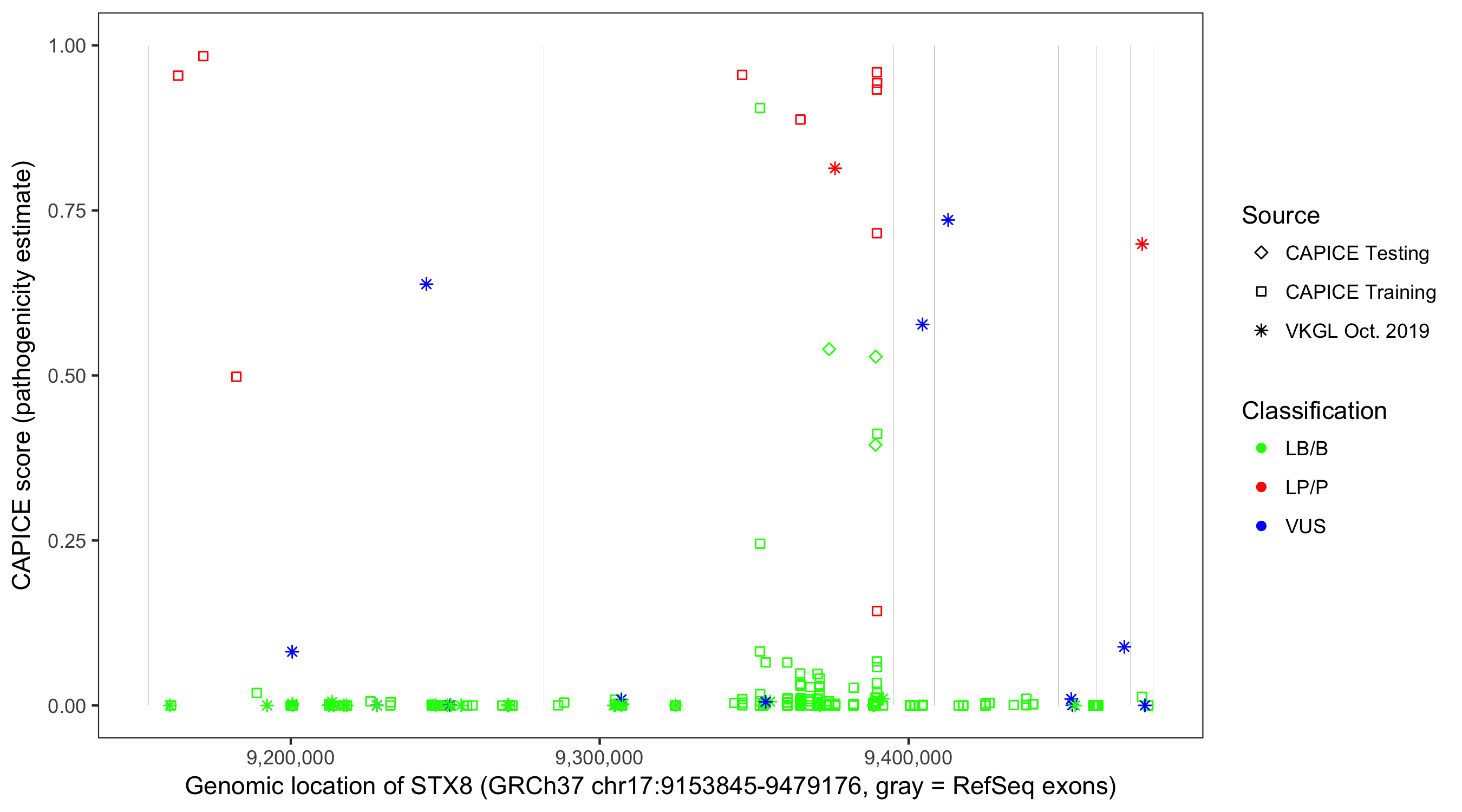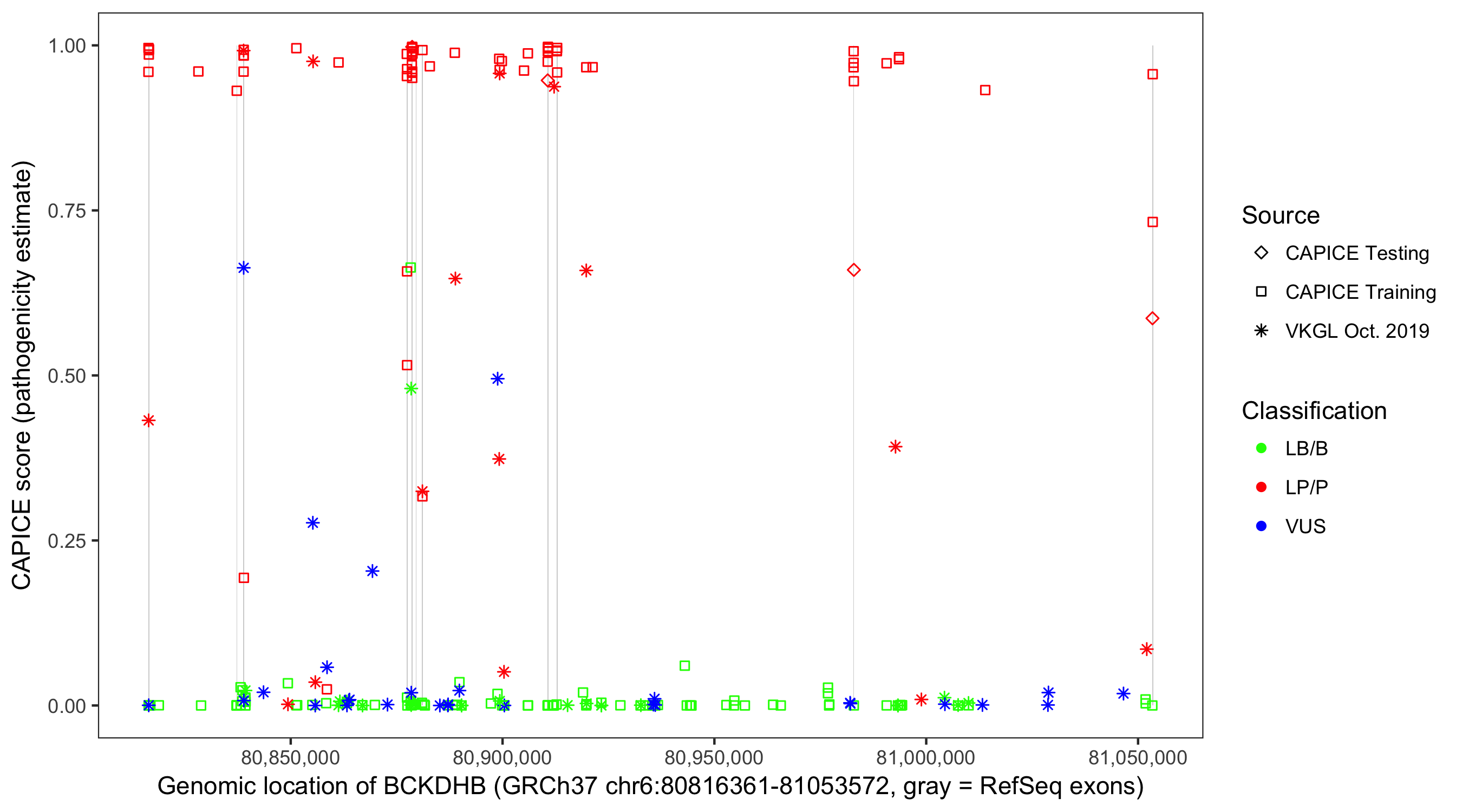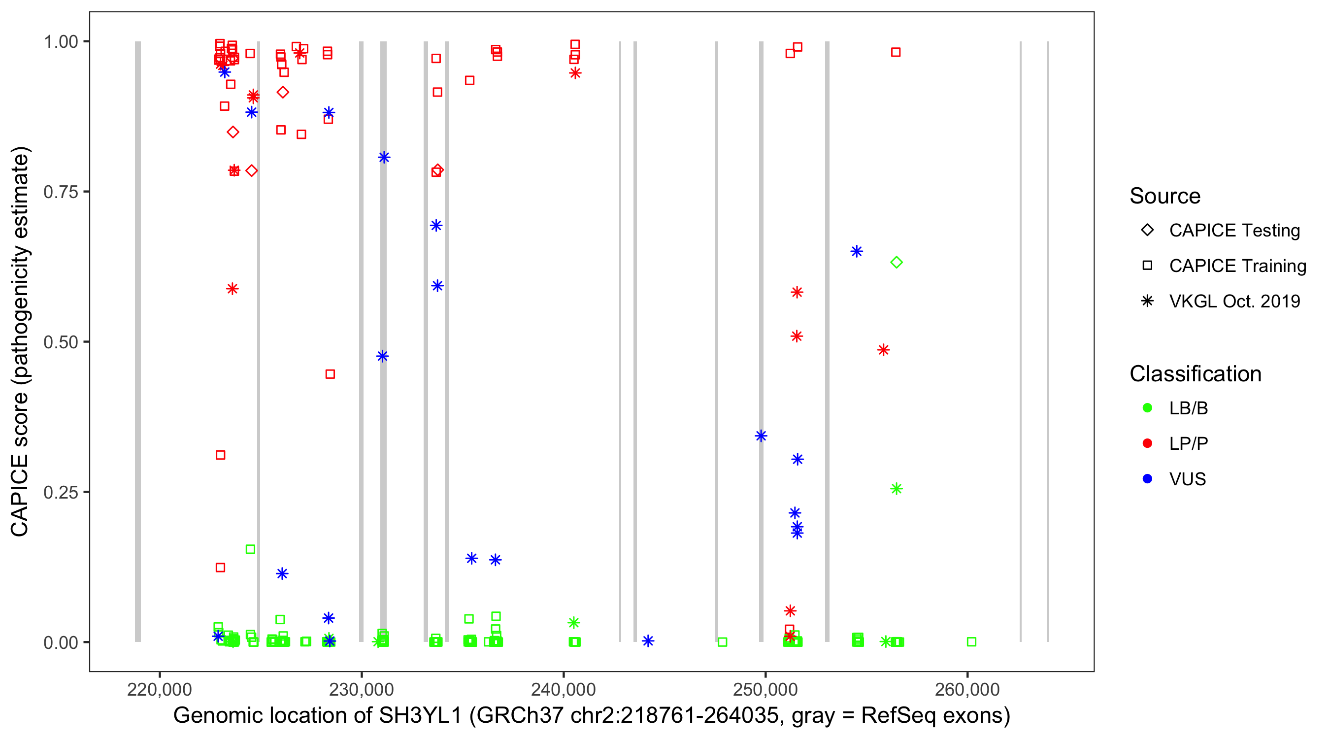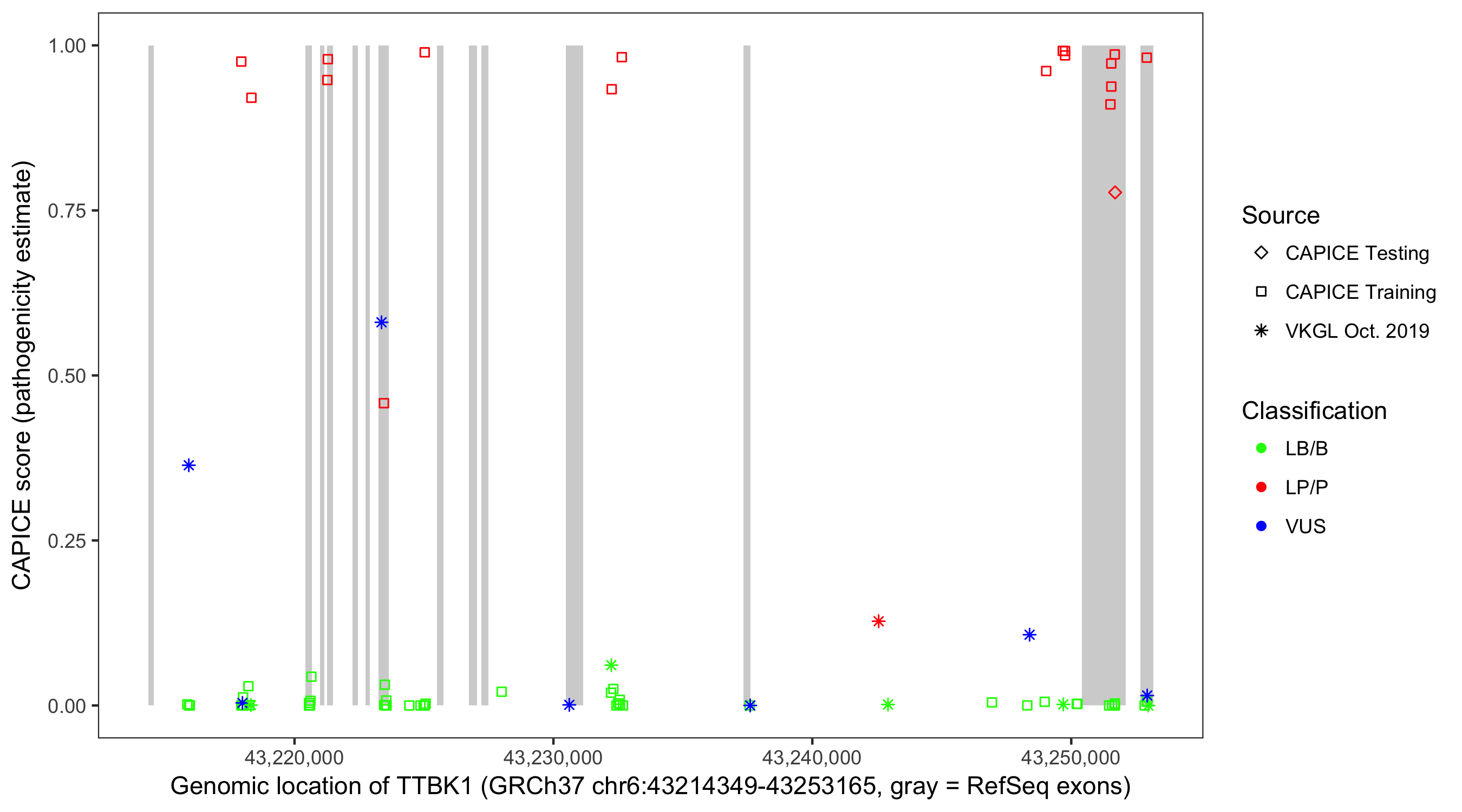 Shown are CAPICE train/test variants plus VKGL Oct 2019.
