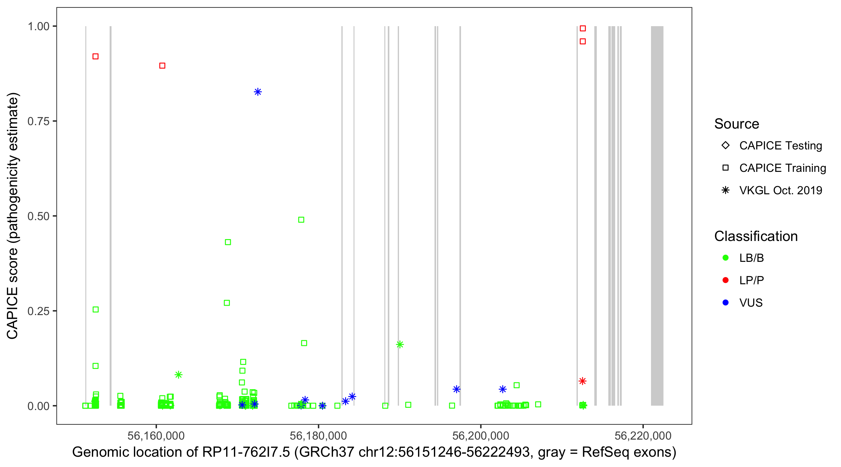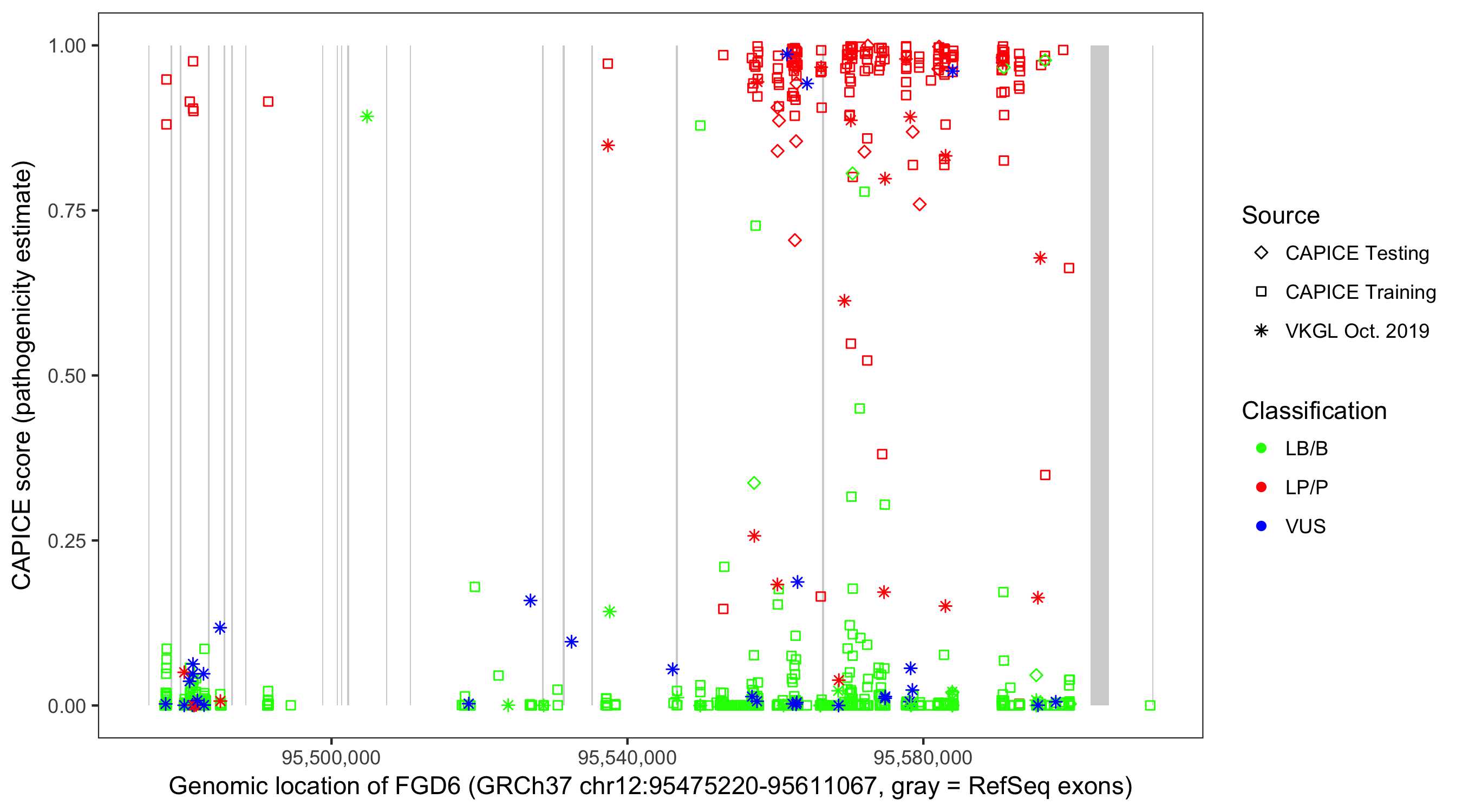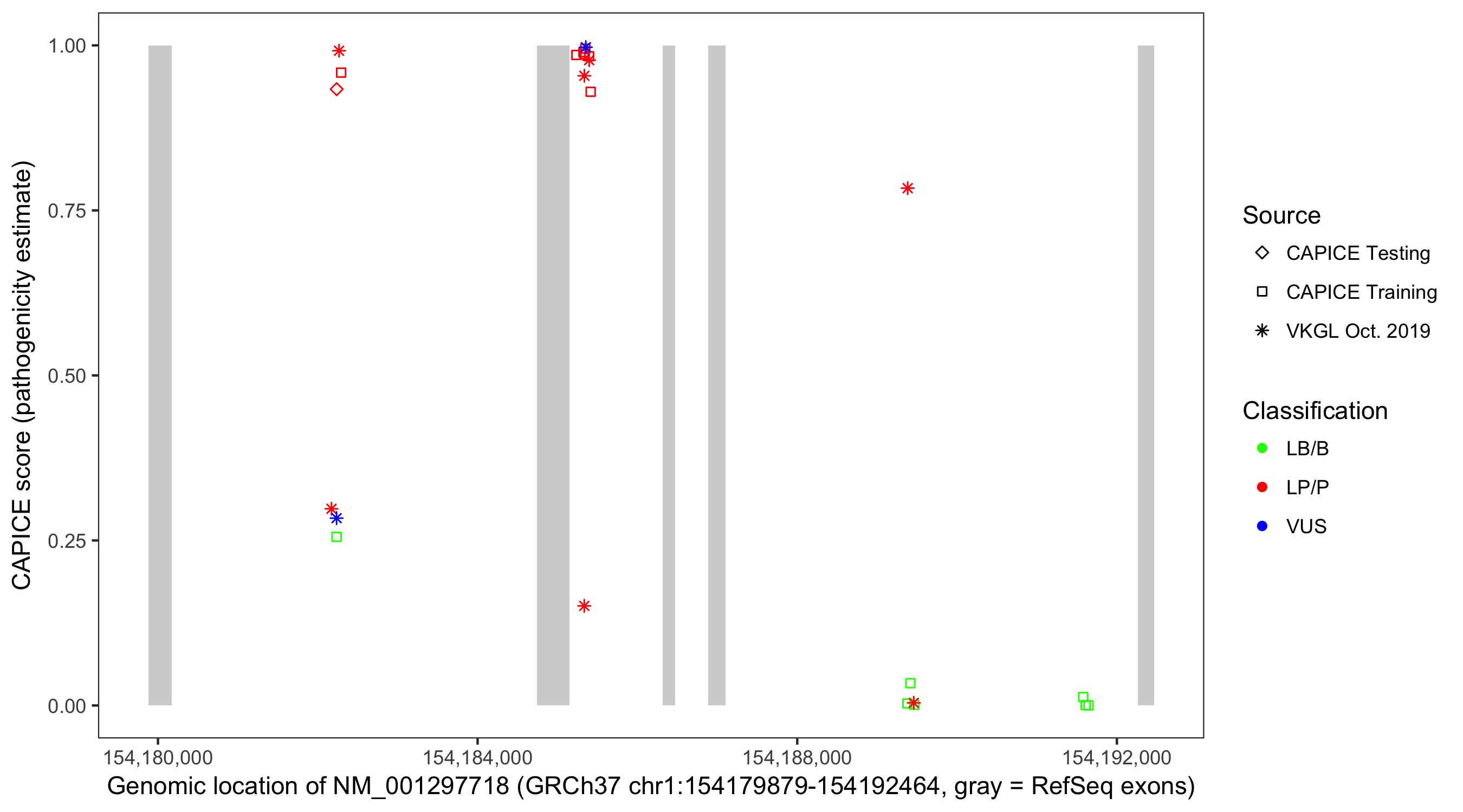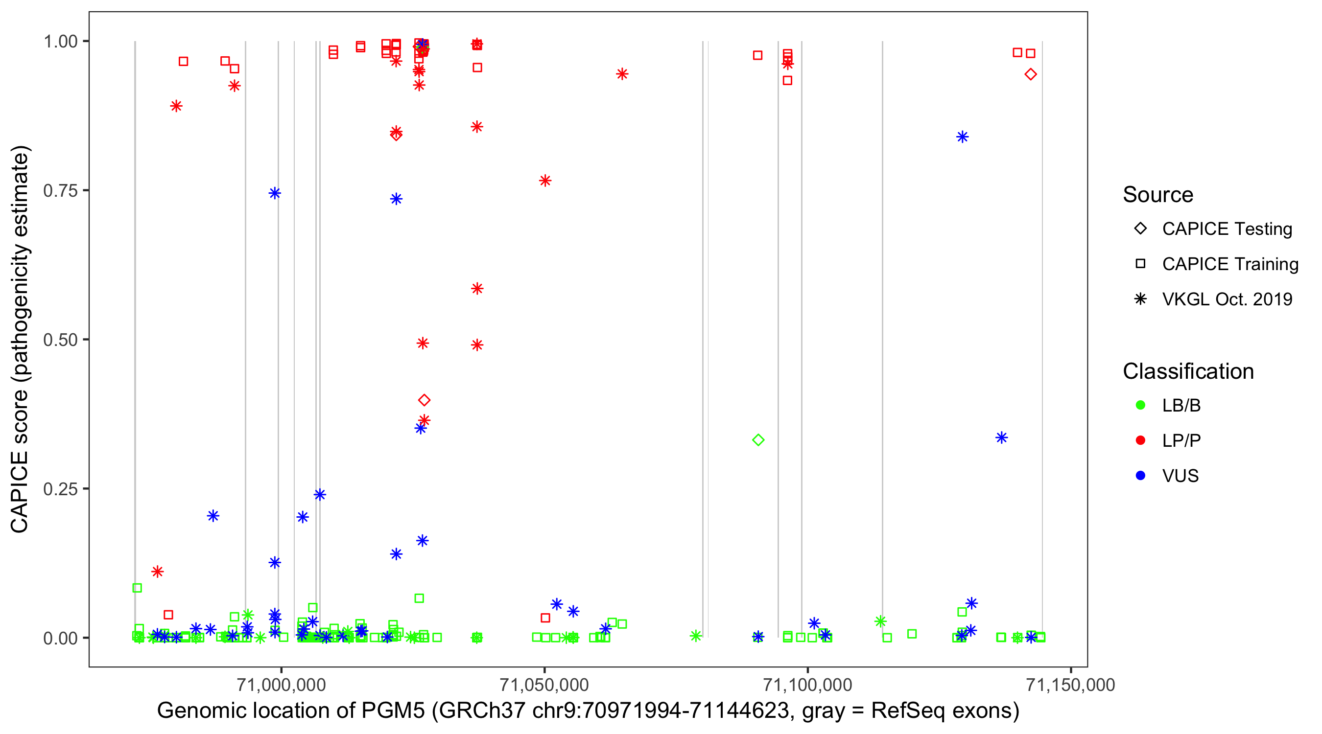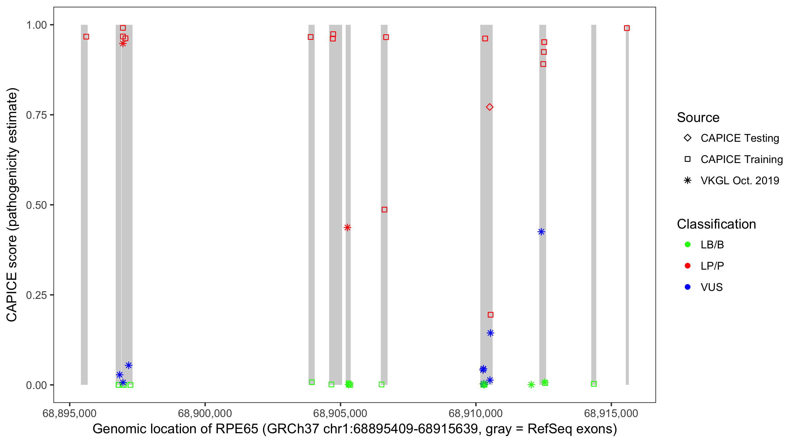 Shown are CAPICE train/test variants plus VKGL Oct 2019.