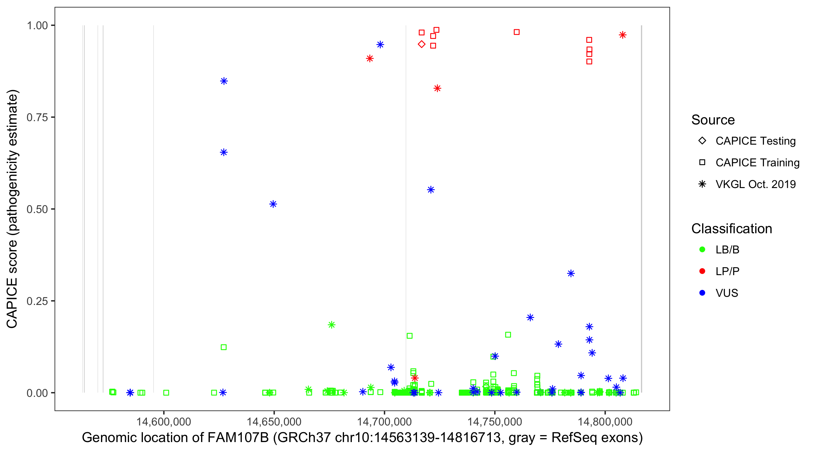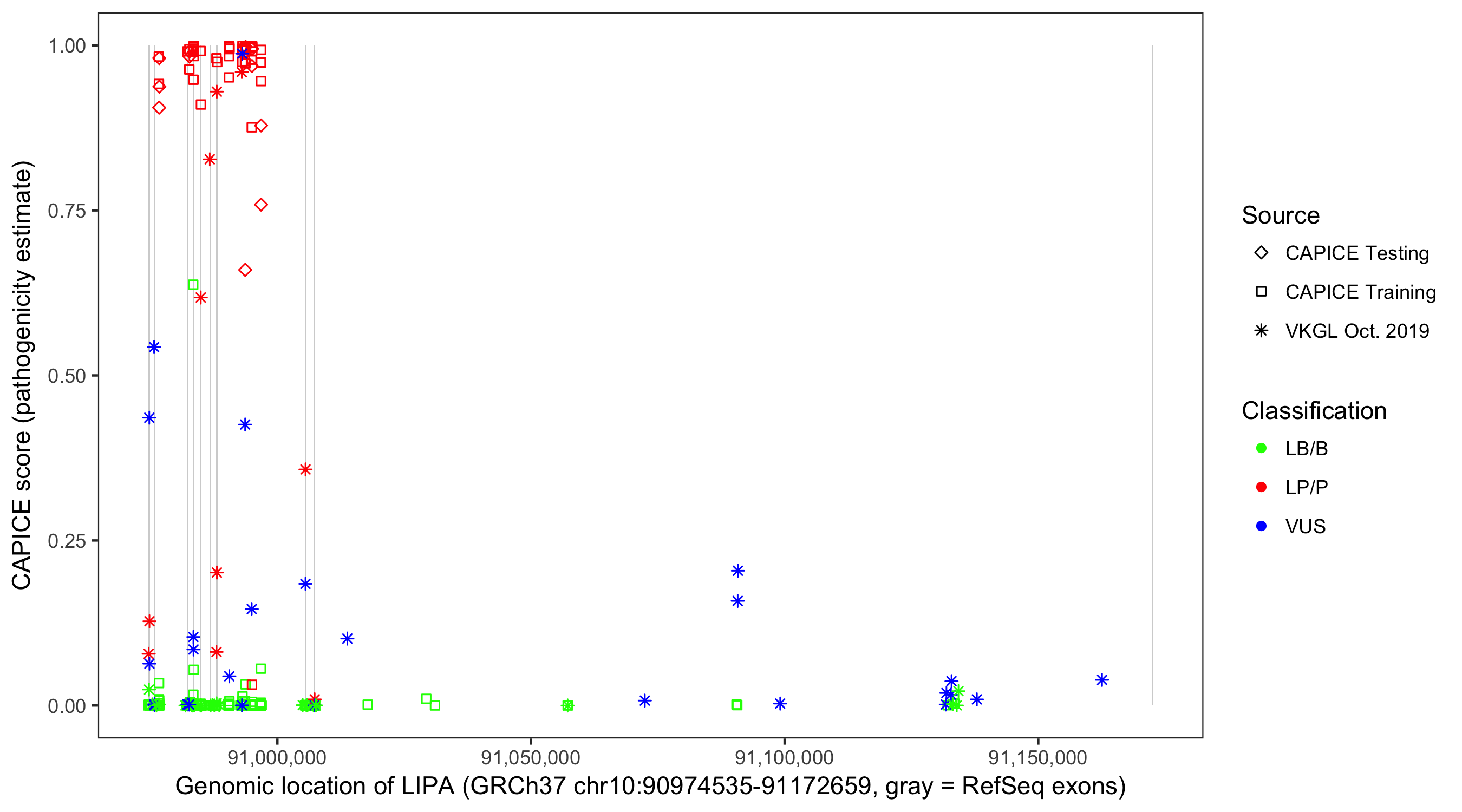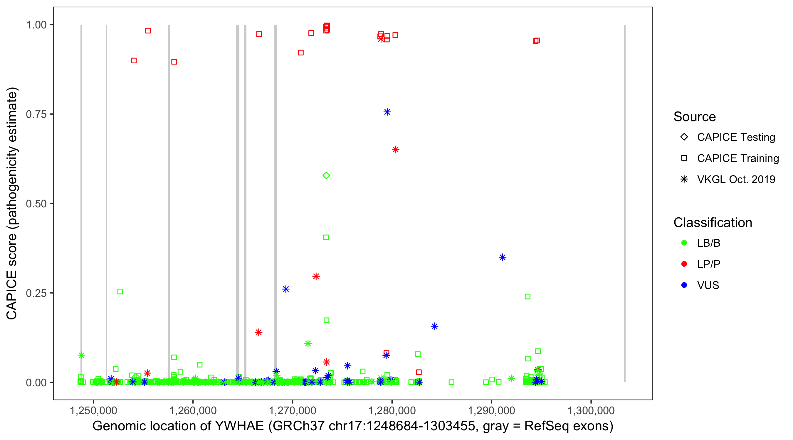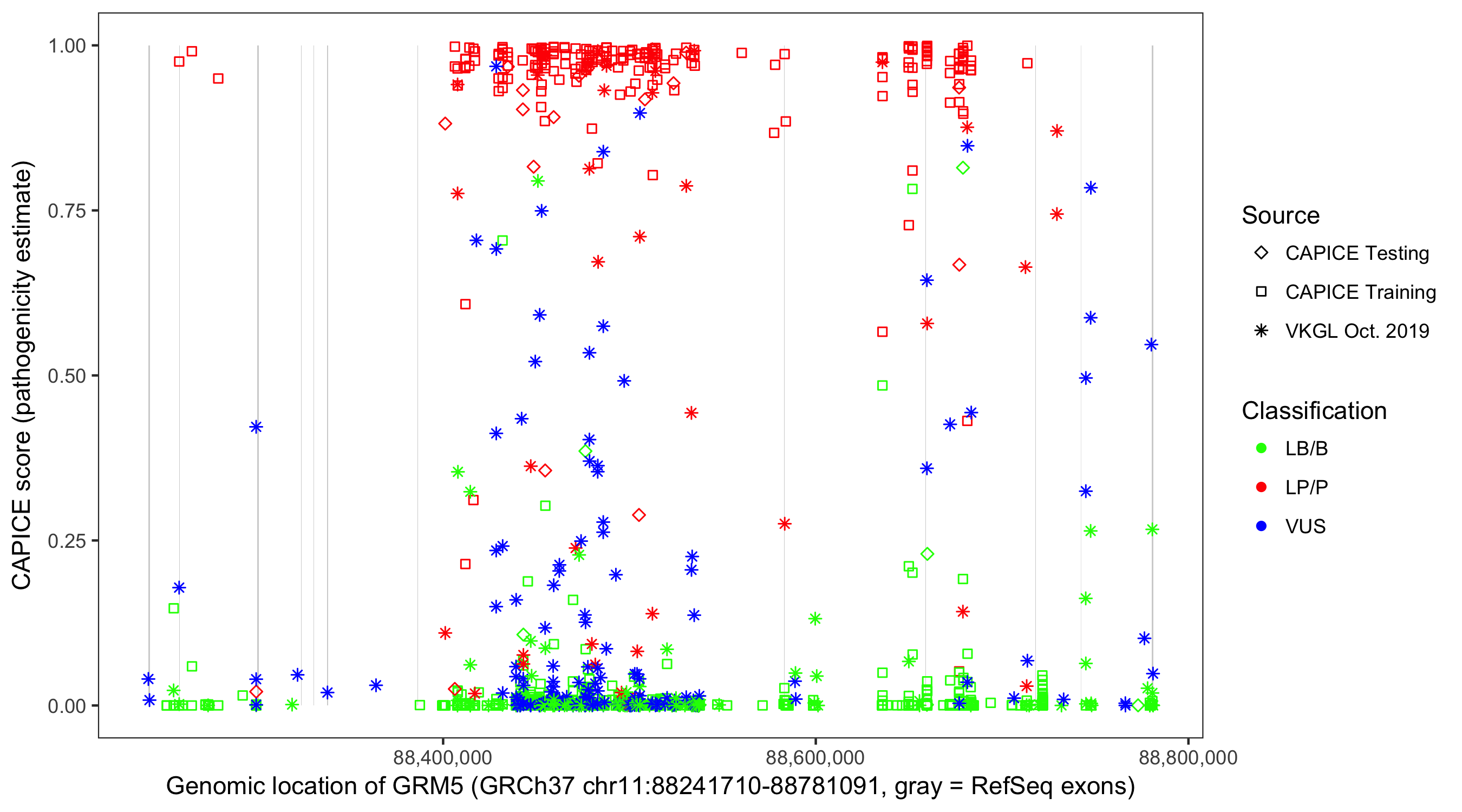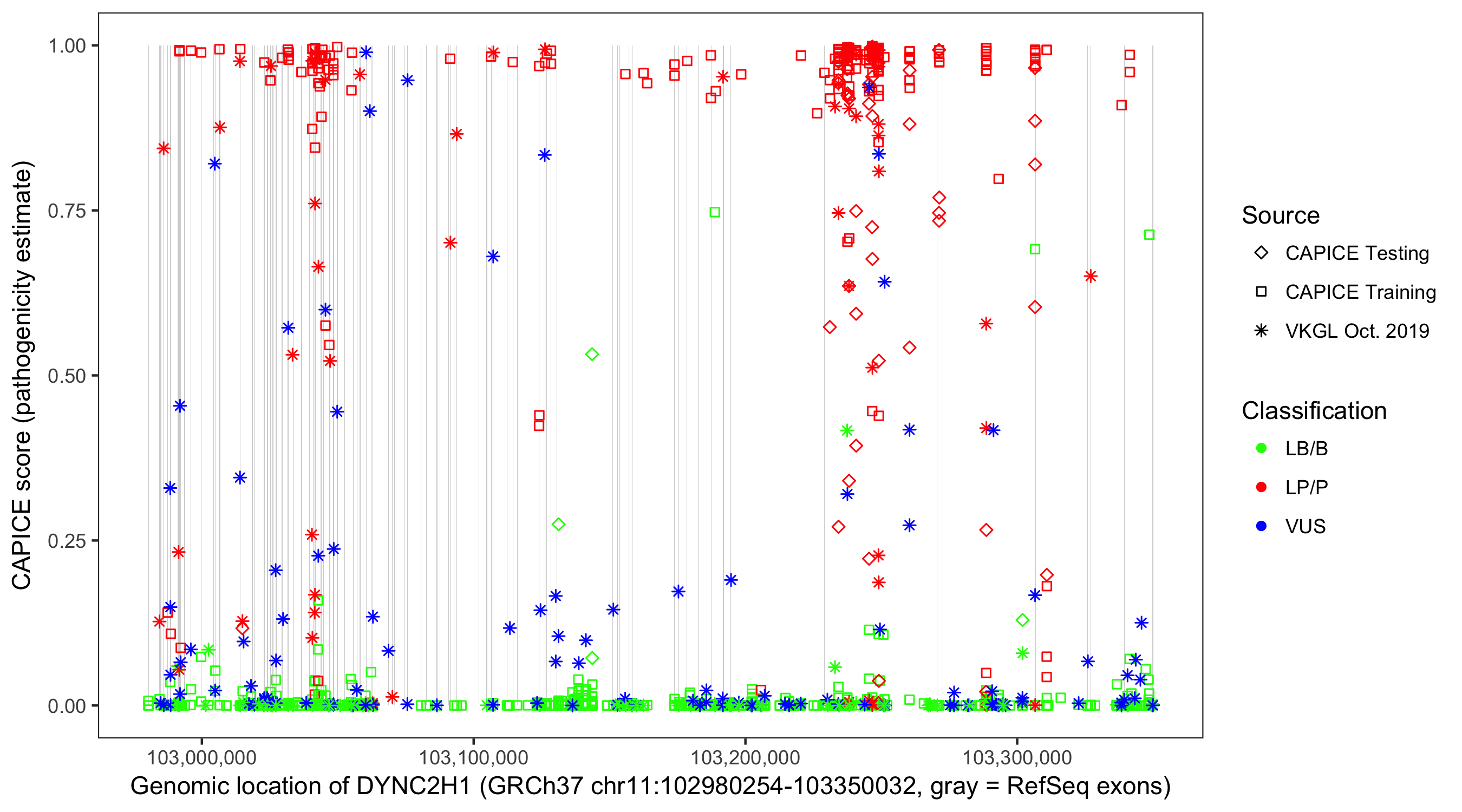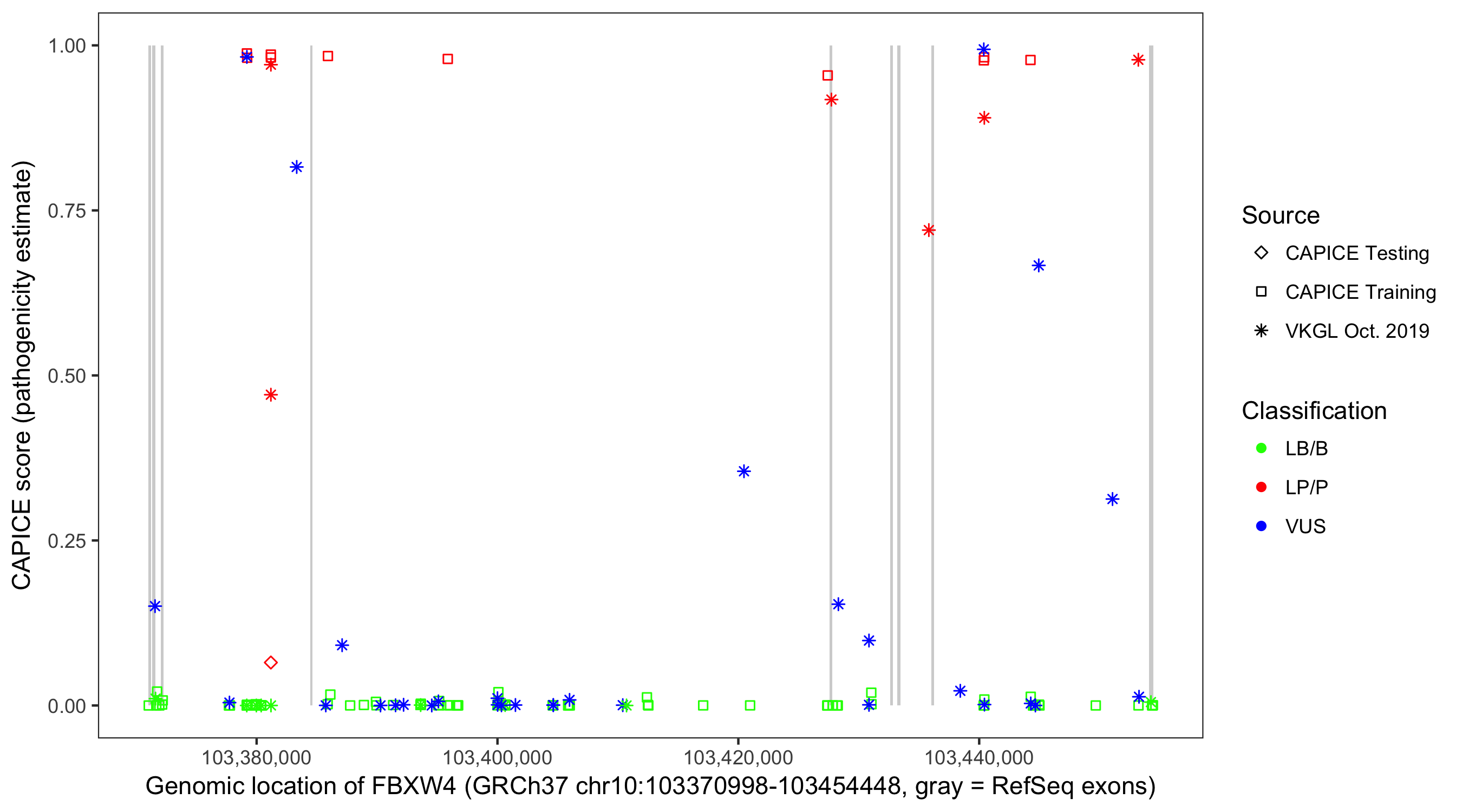Shown are CAPICE train/test variants plus VKGL Oct 2019.