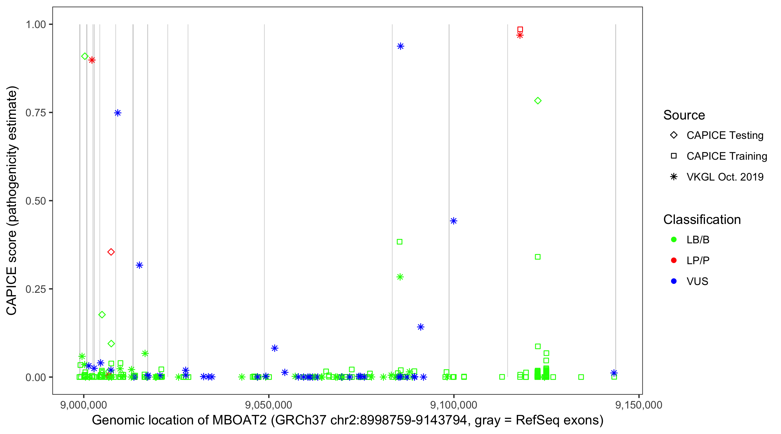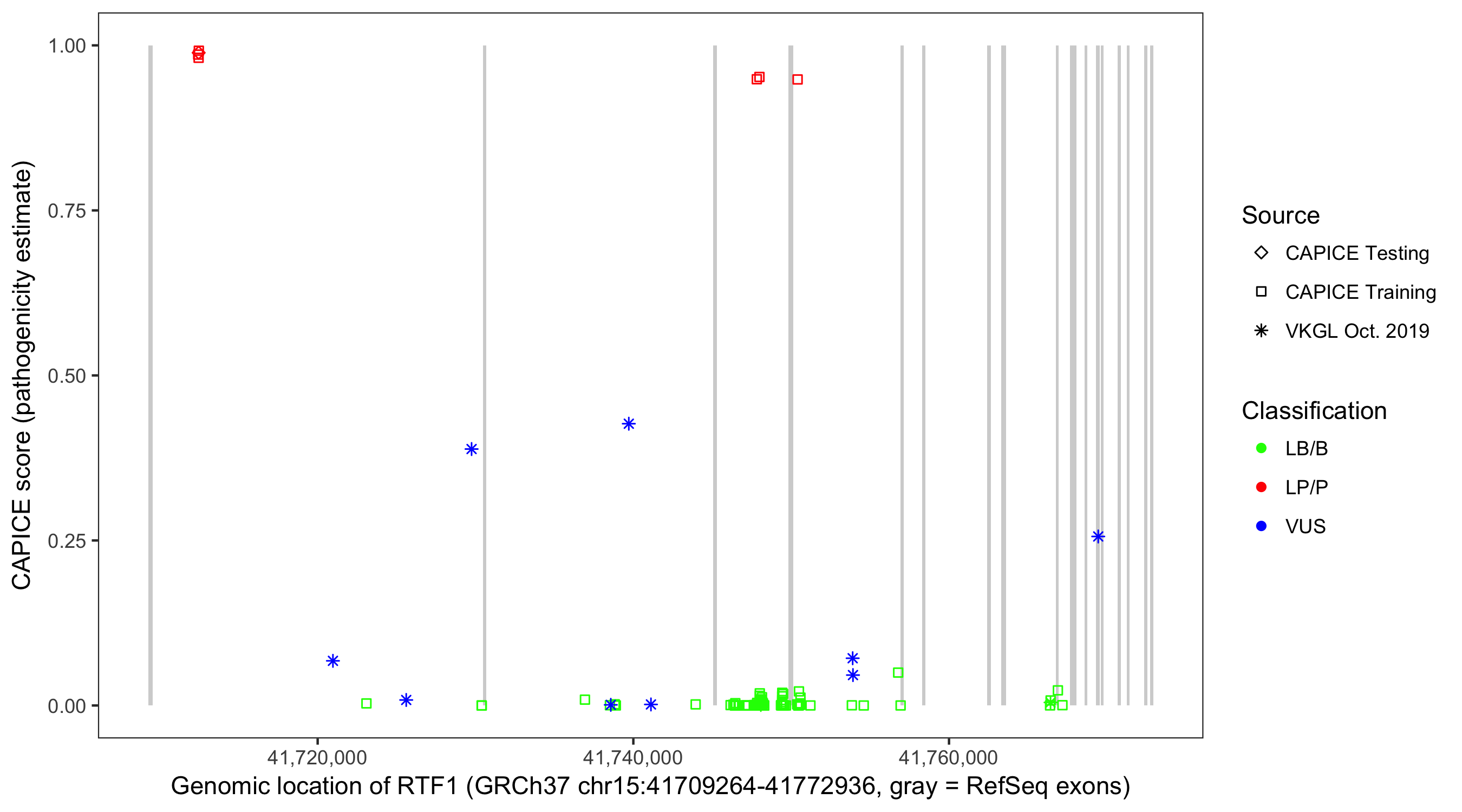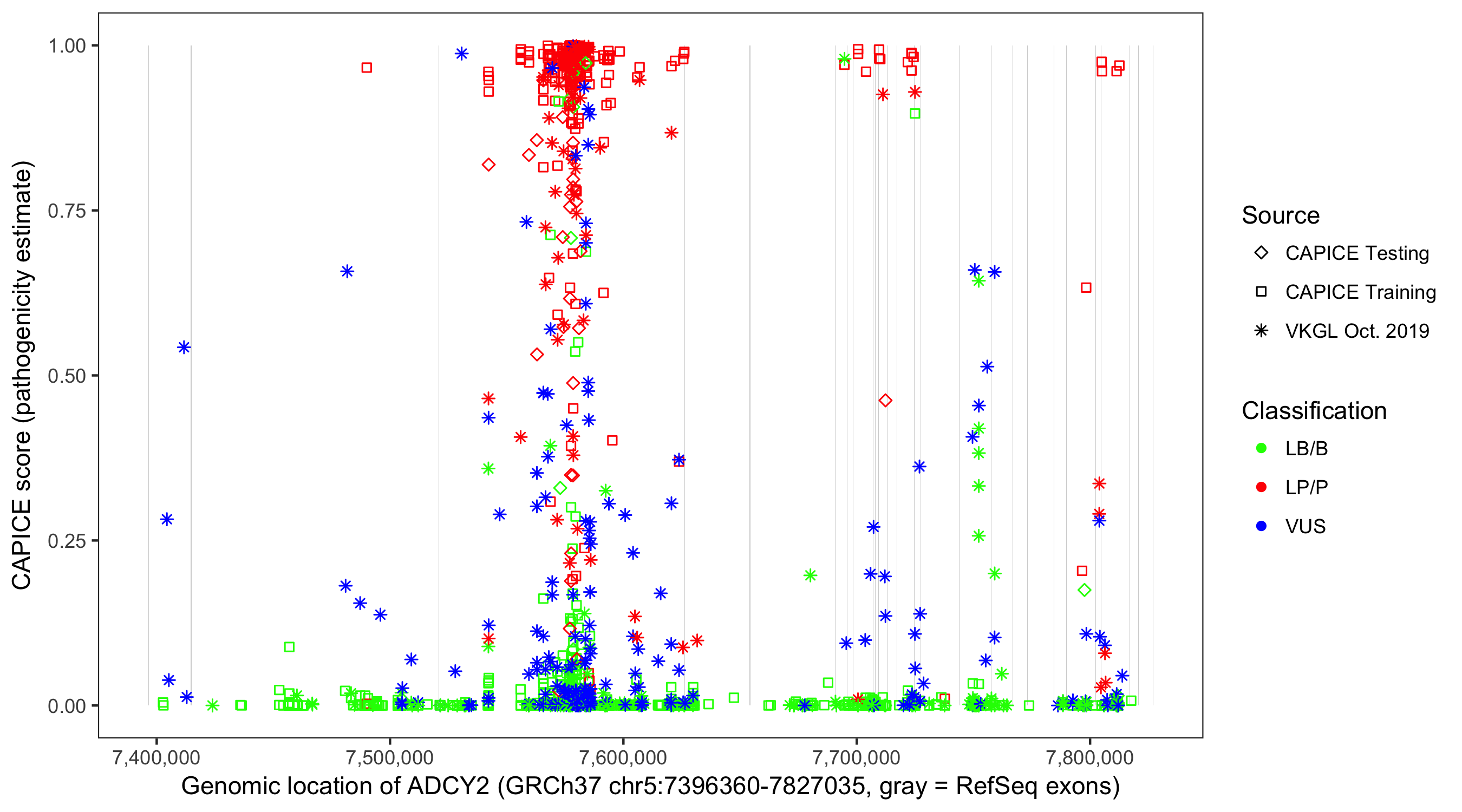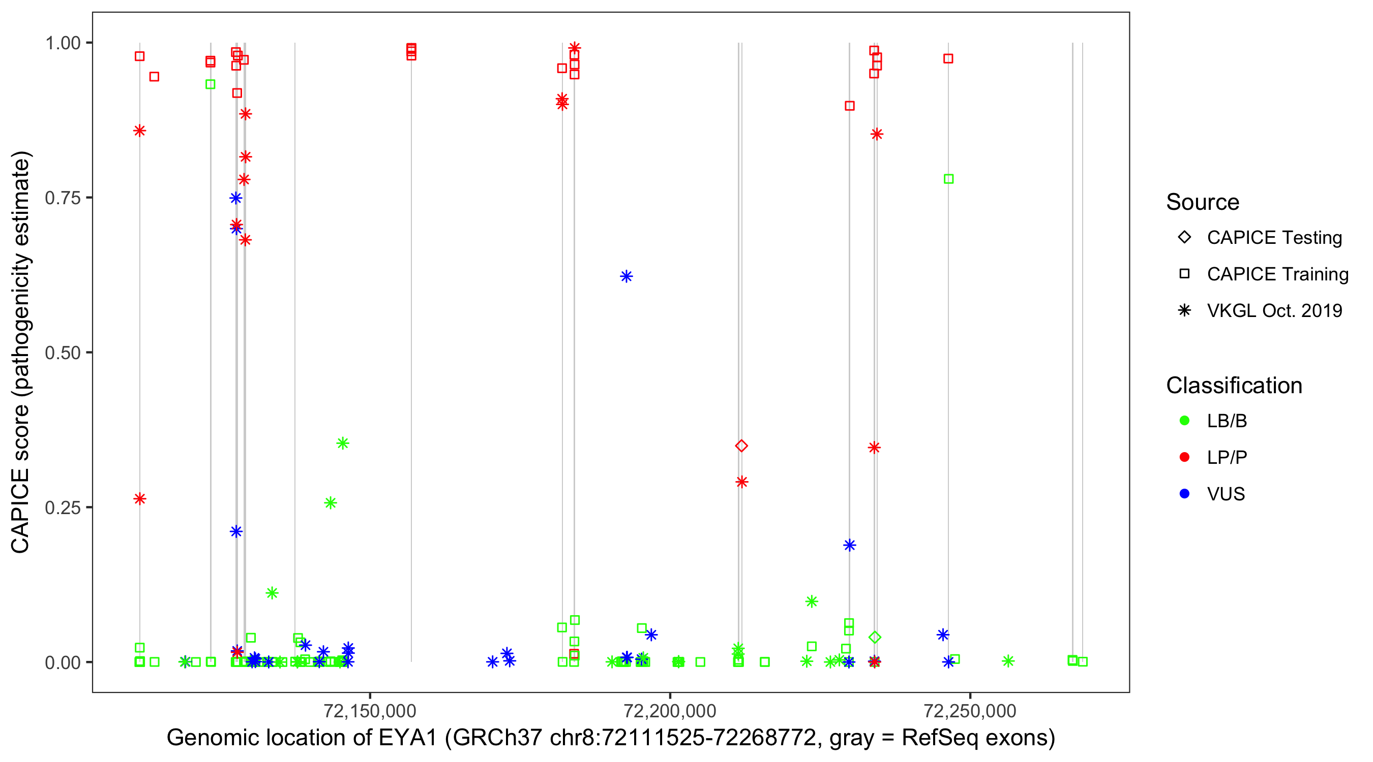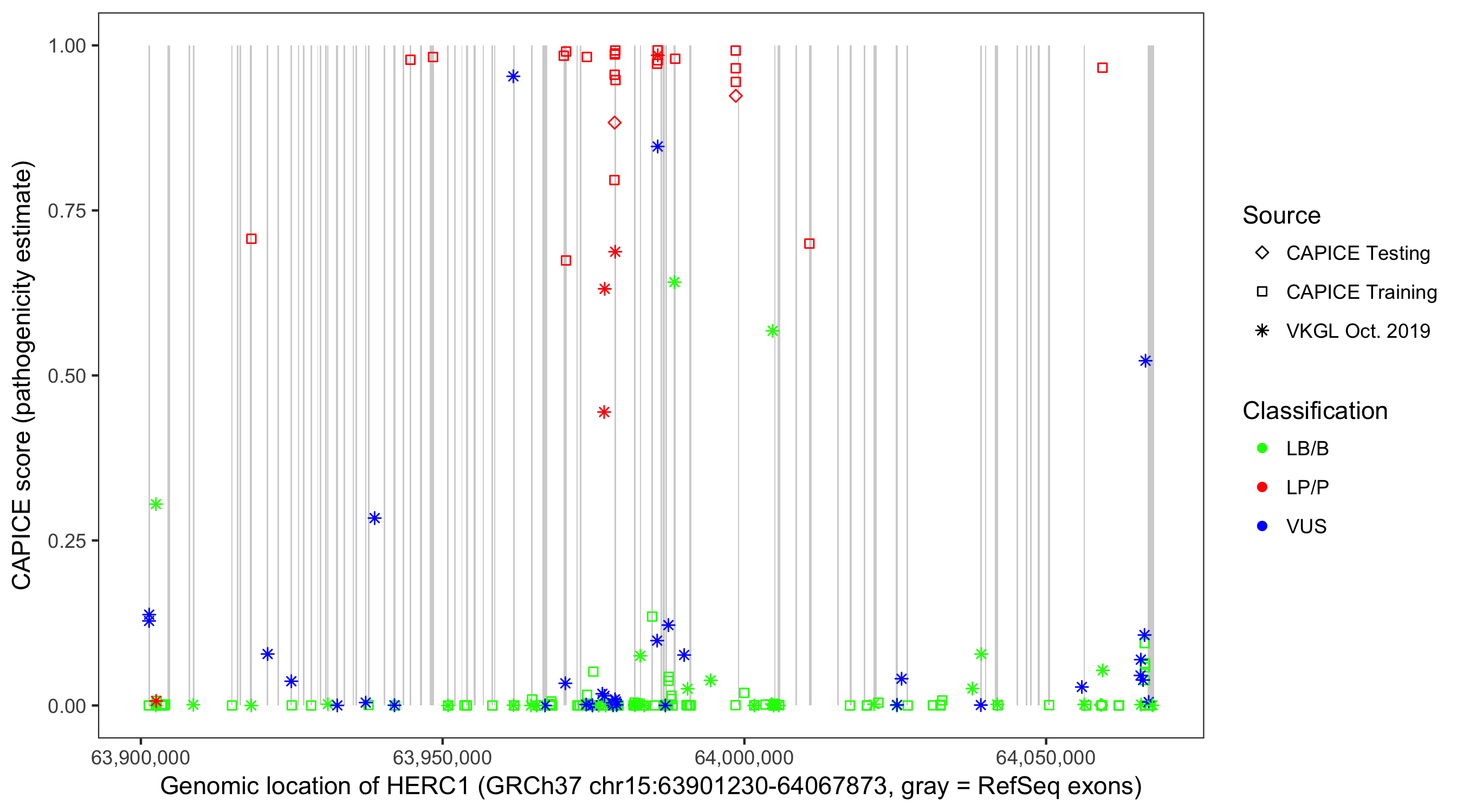 Shown are CAPICE train/test variants plus VKGL Oct 2019.