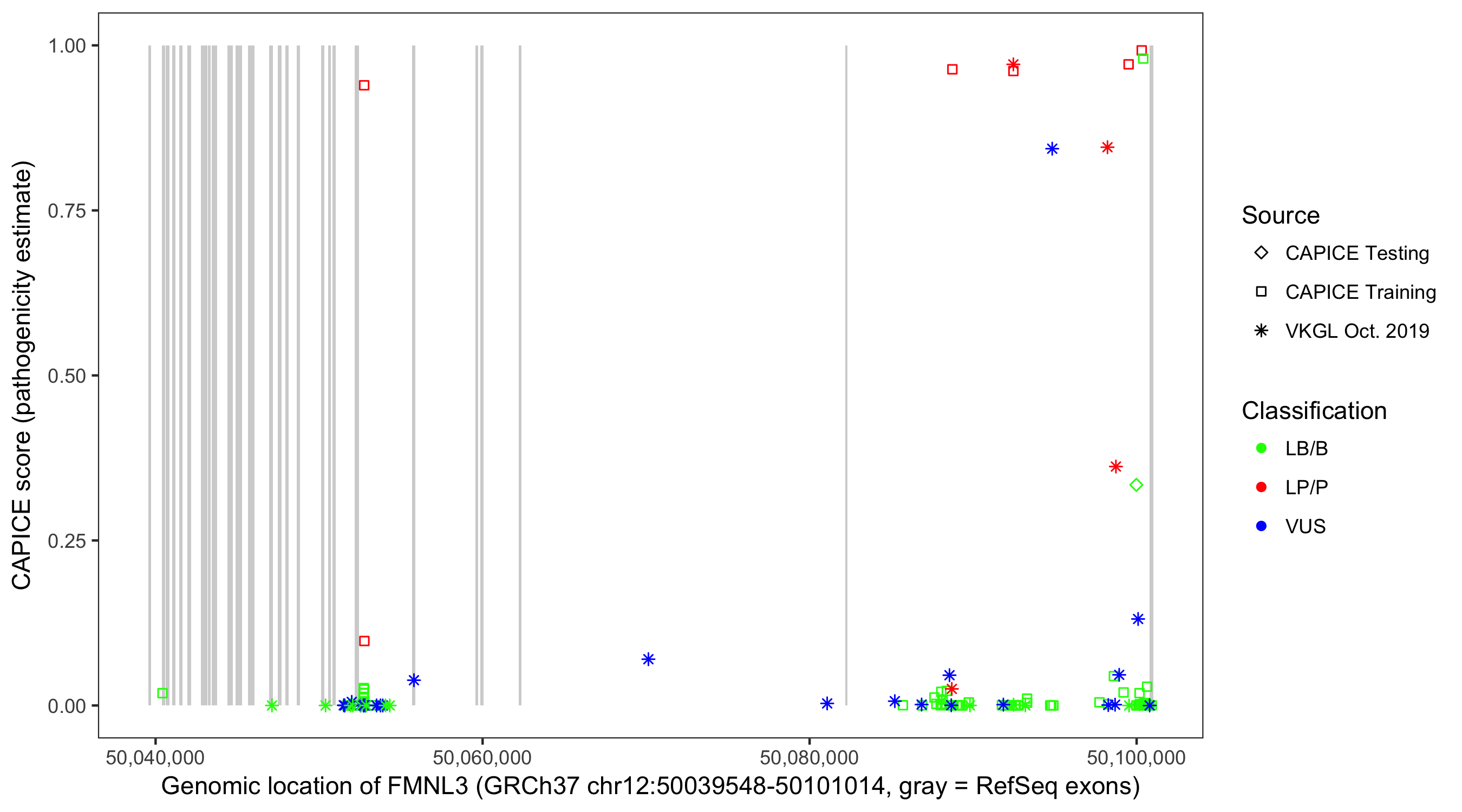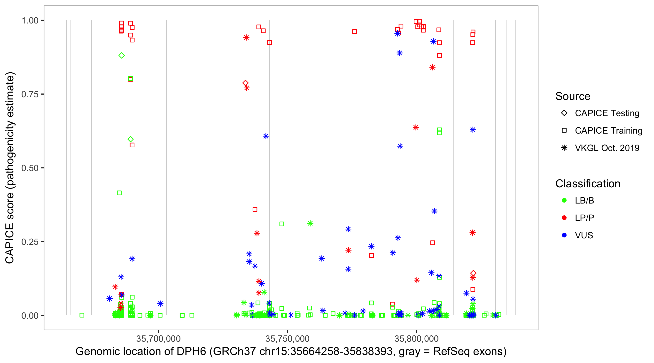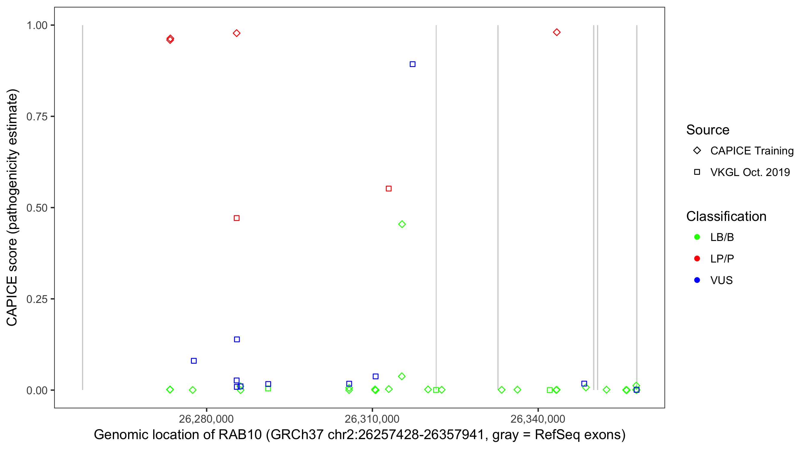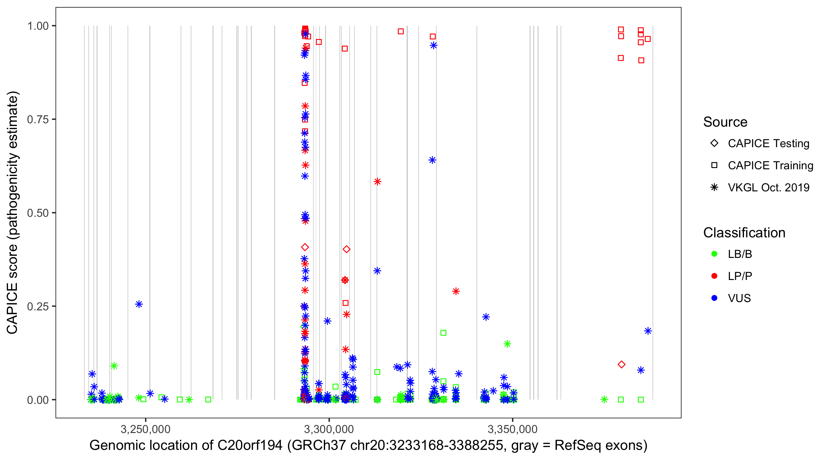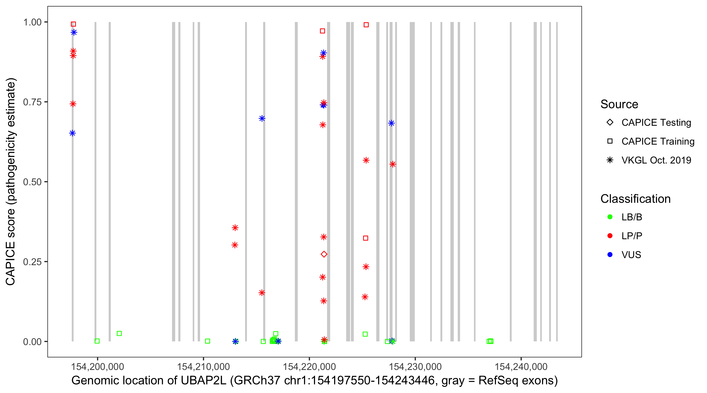 Shown are CAPICE train/test variants plus VKGL Oct 2019.