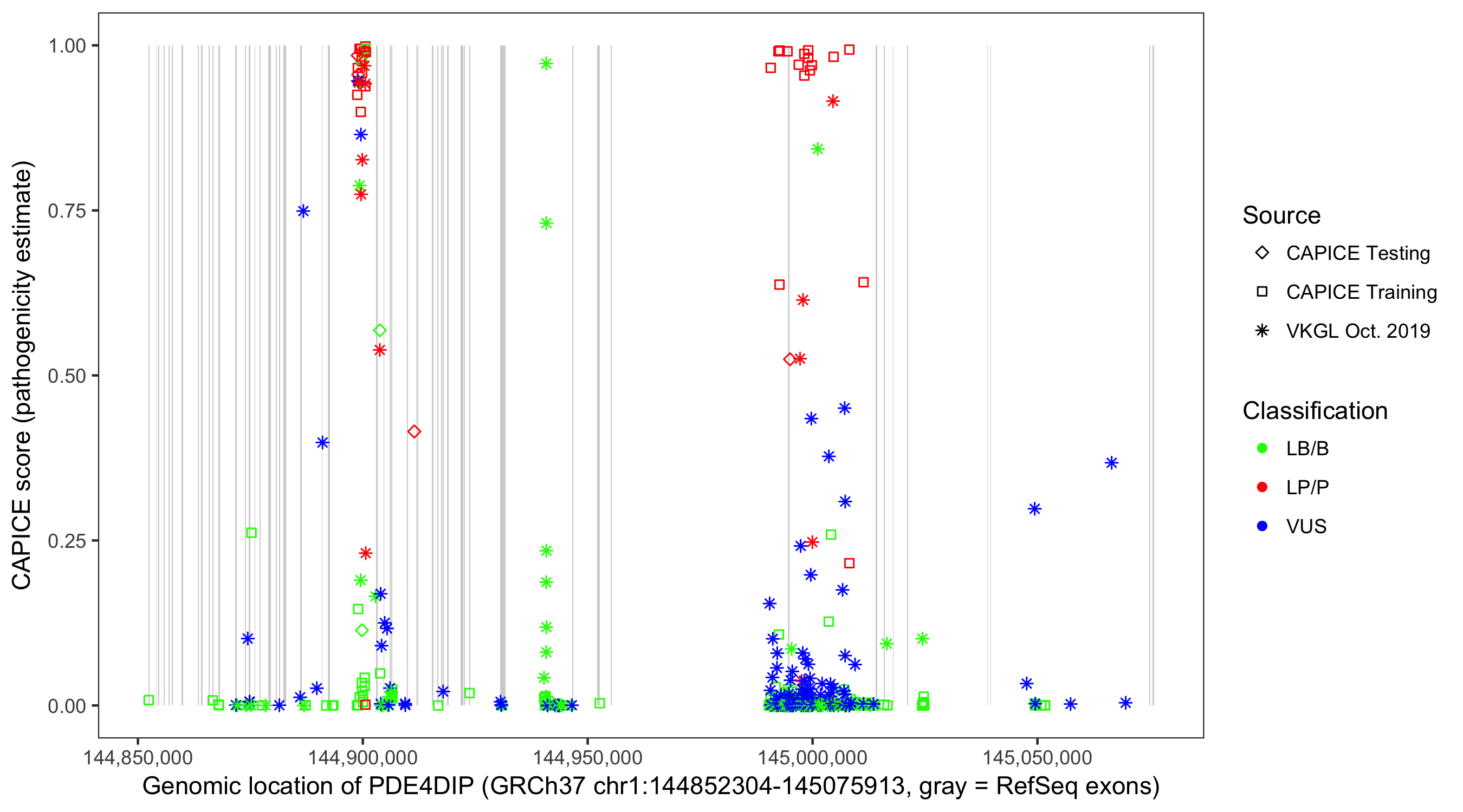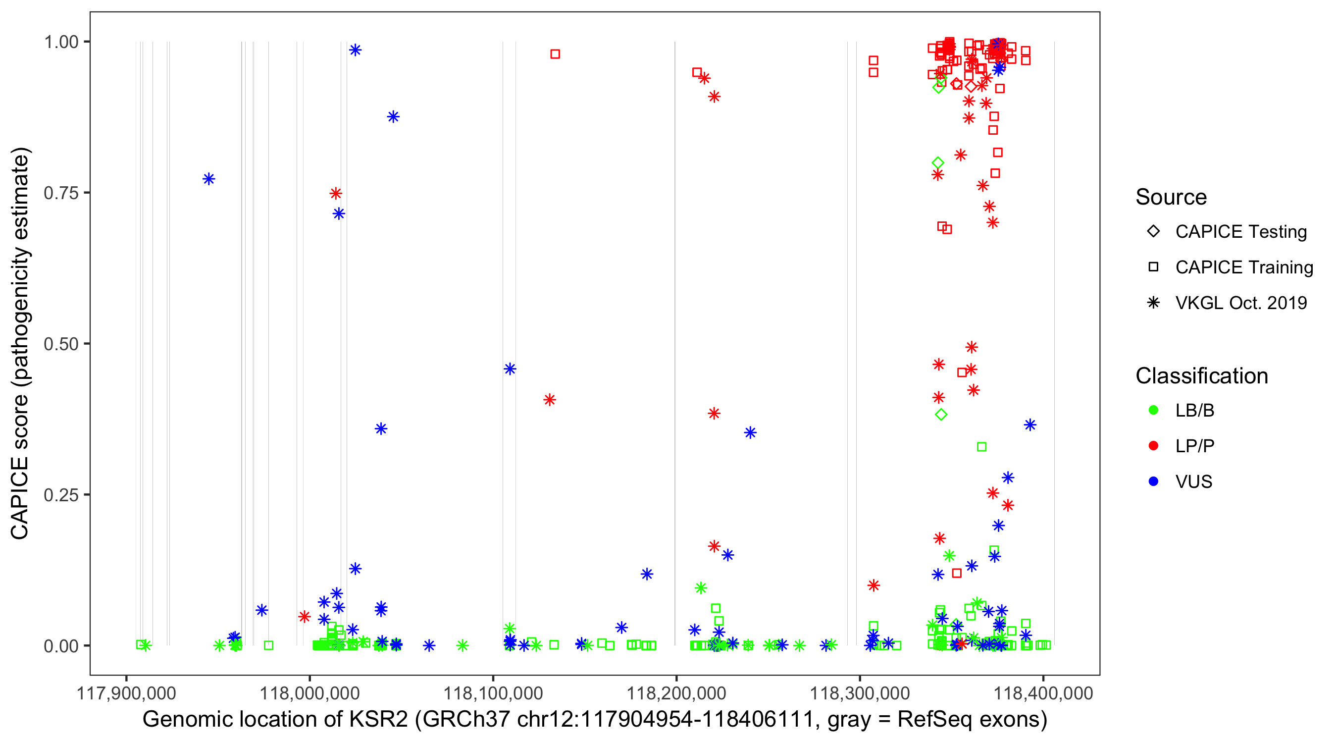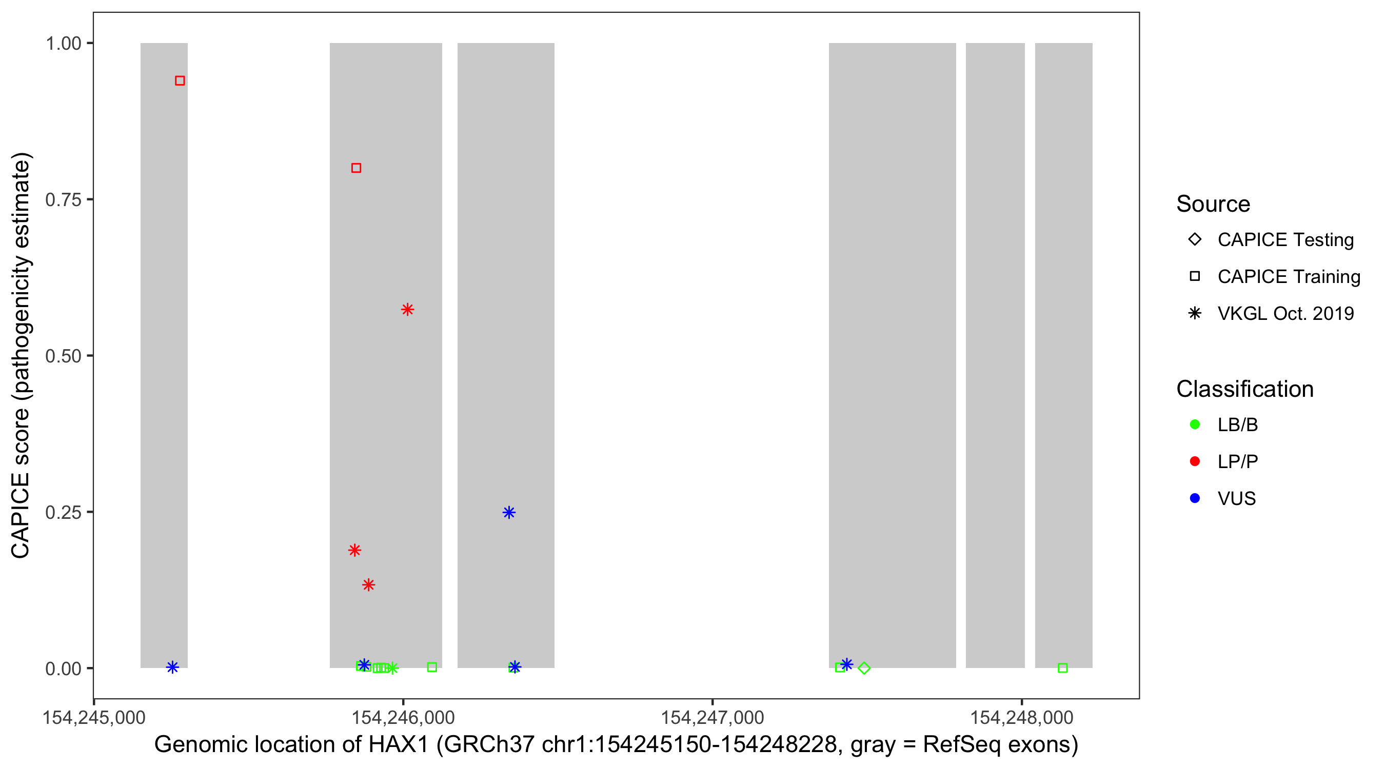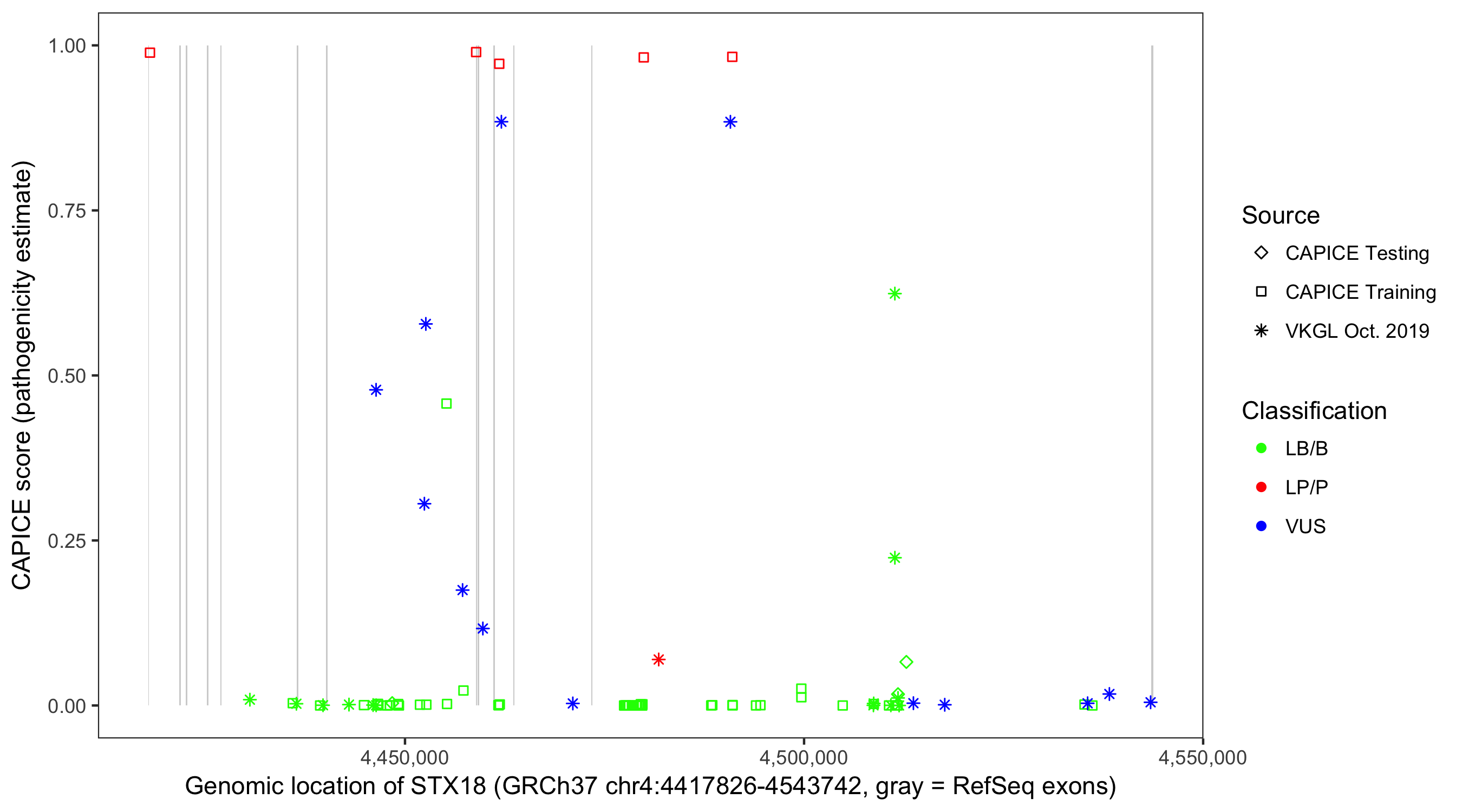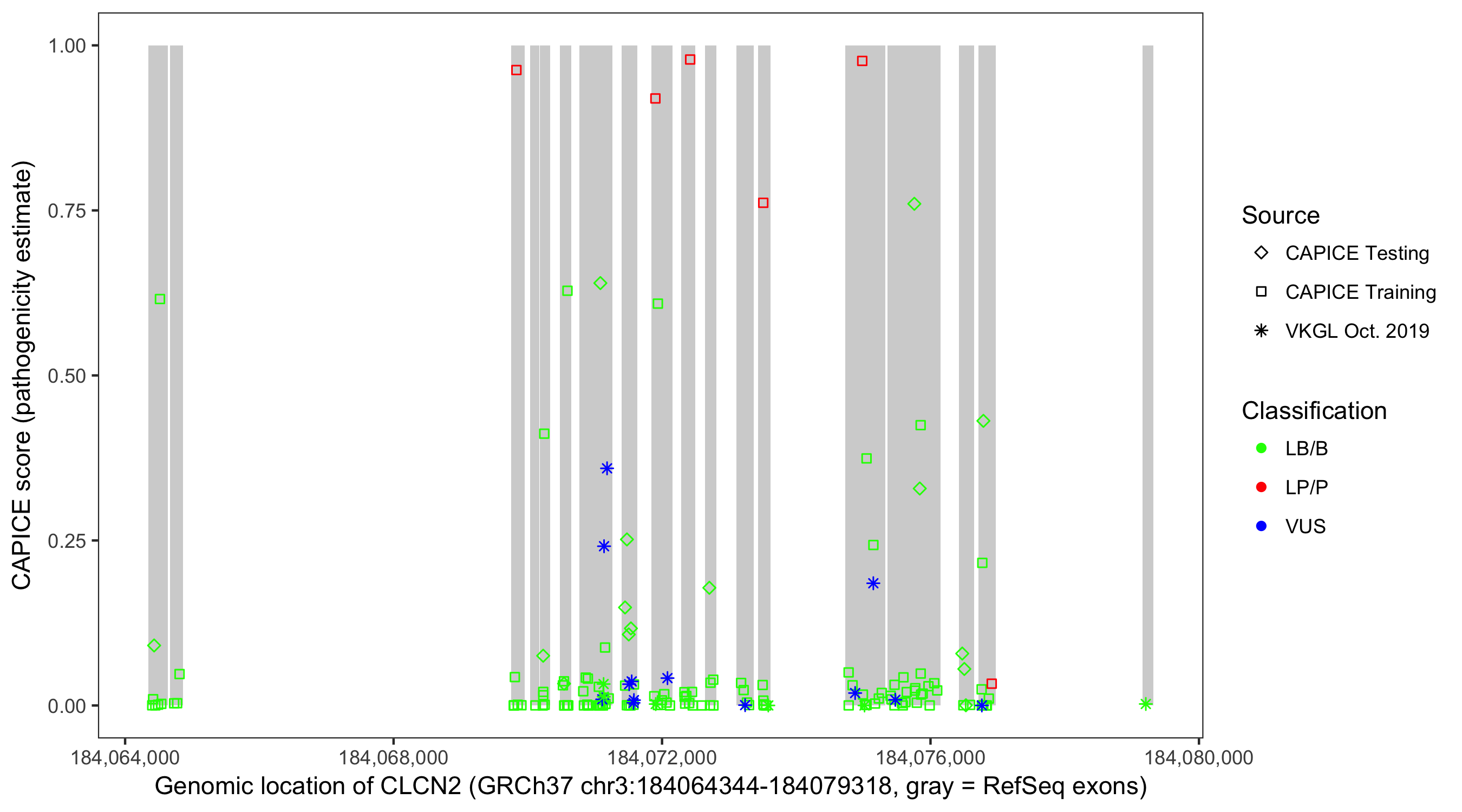 Shown are CAPICE train/test variants plus VKGL Oct 2019.