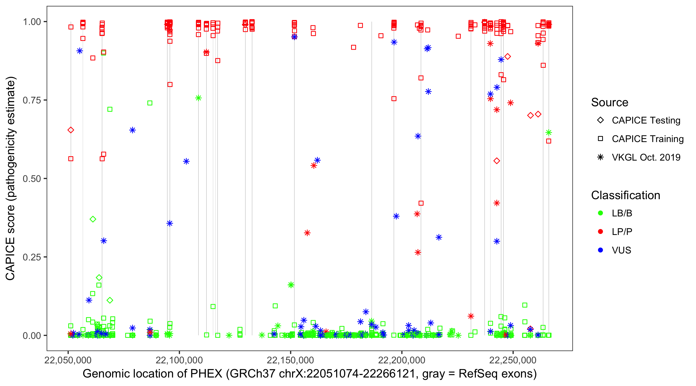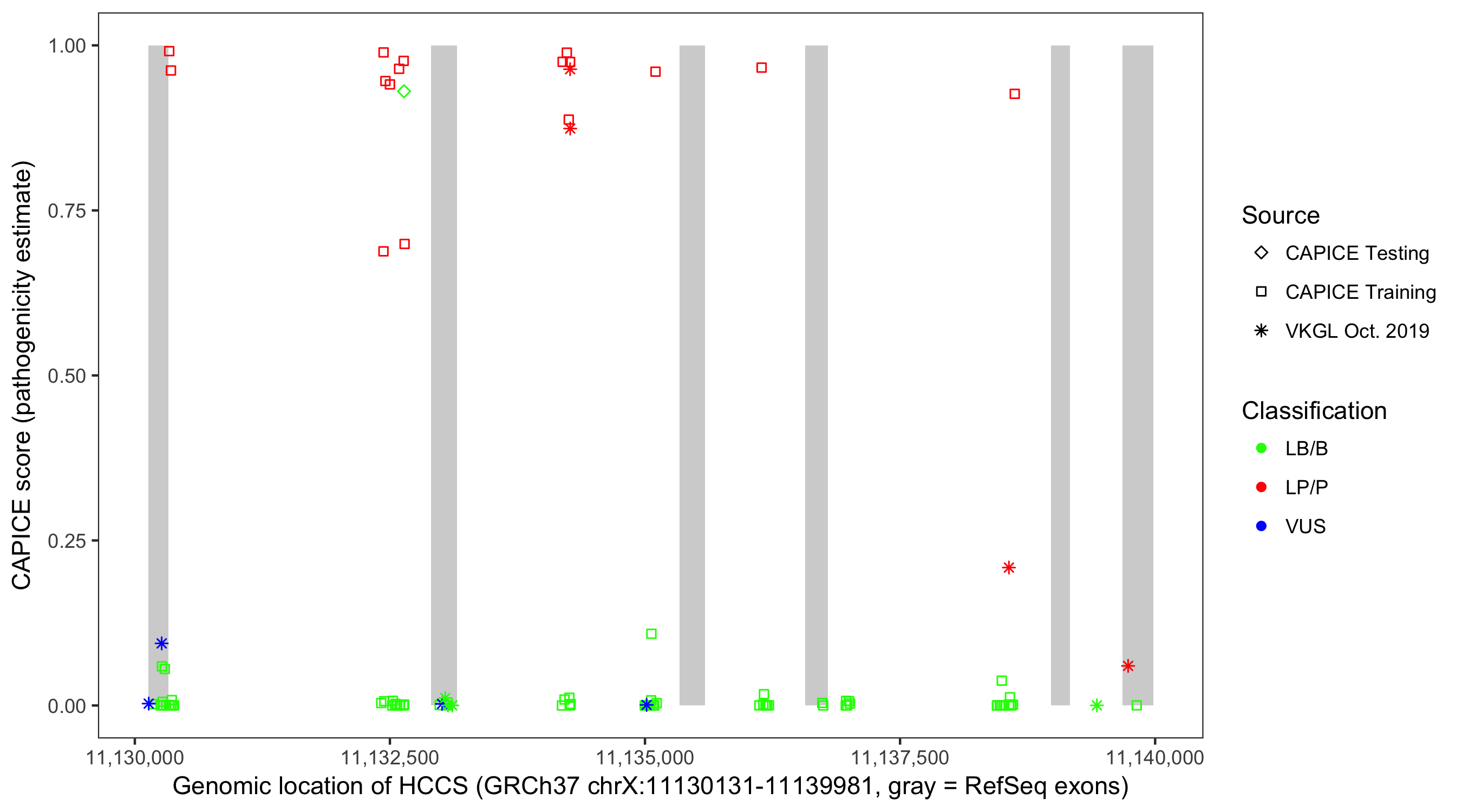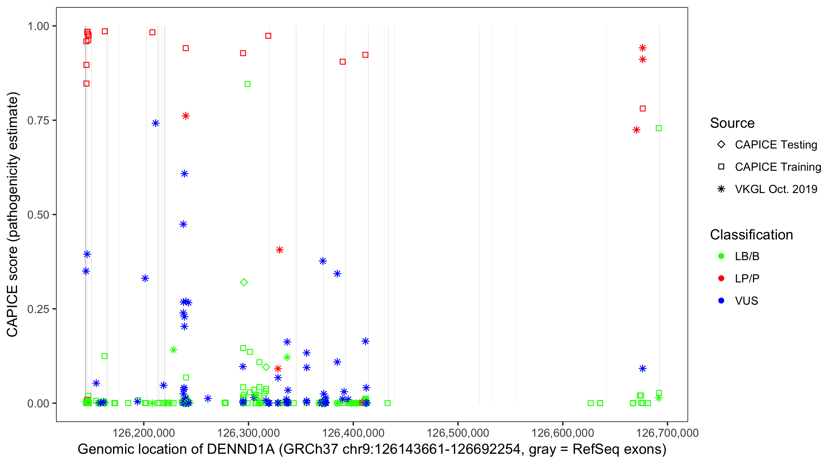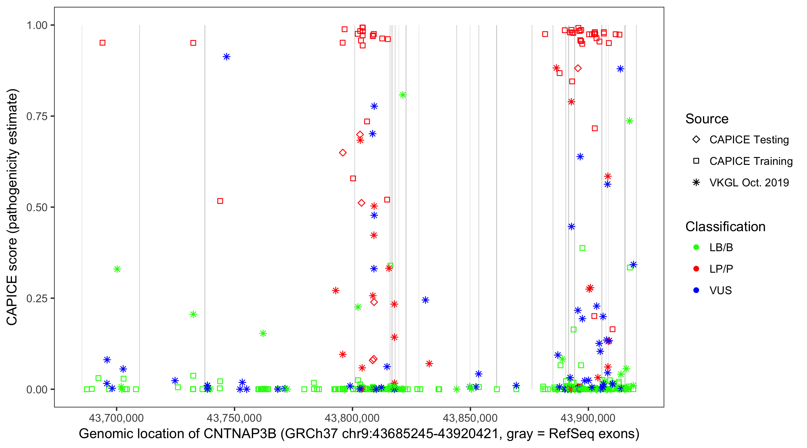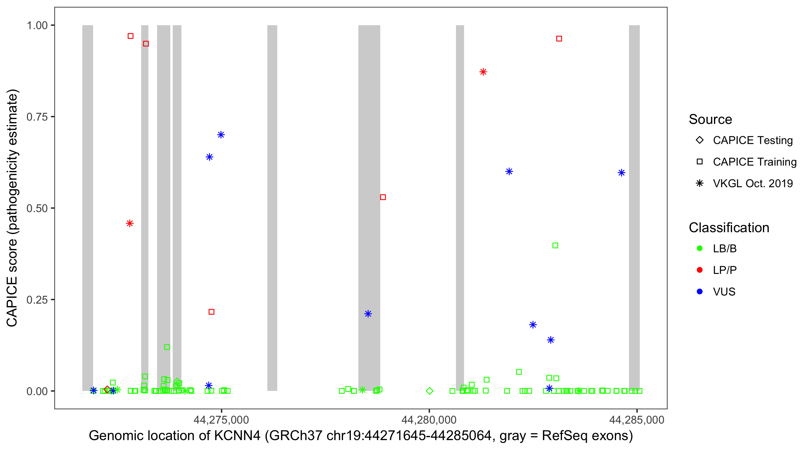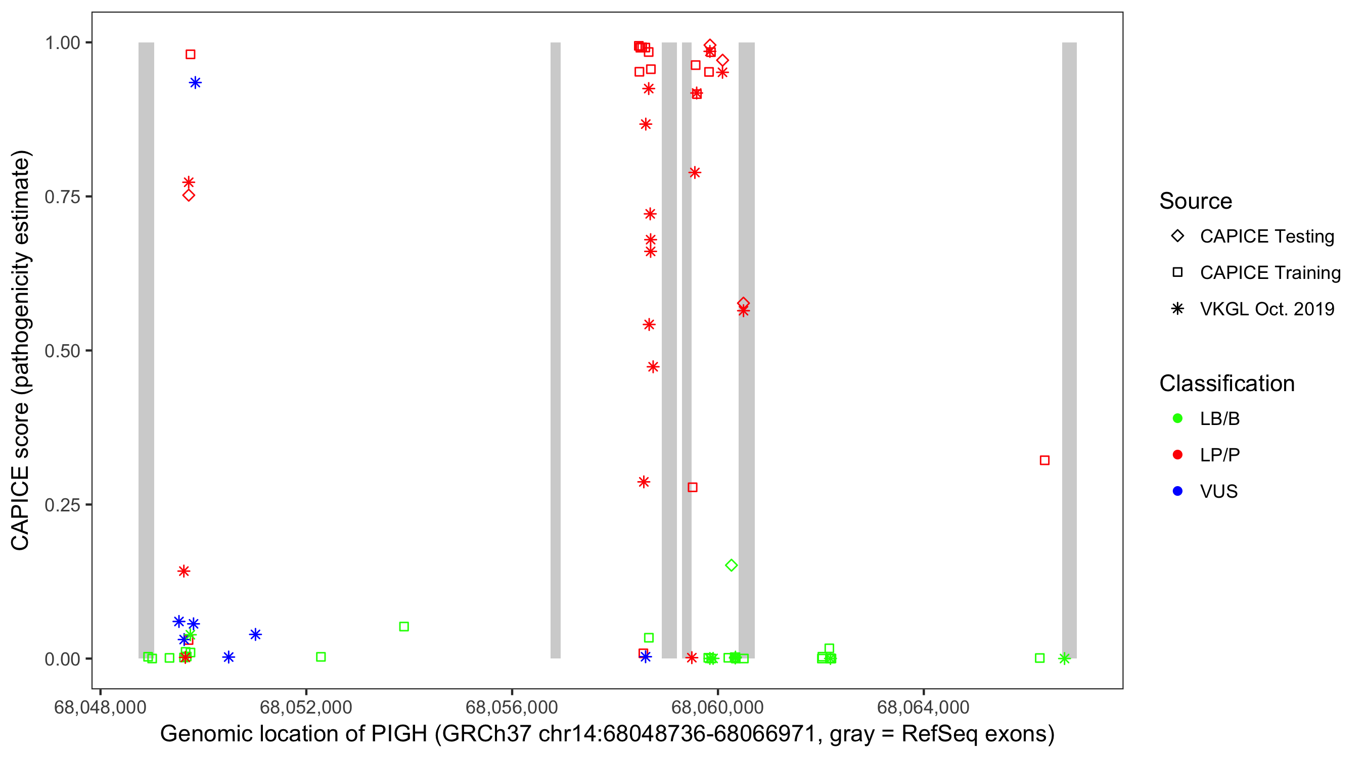 Shown are CAPICE train/test variants plus VKGL Oct 2019.