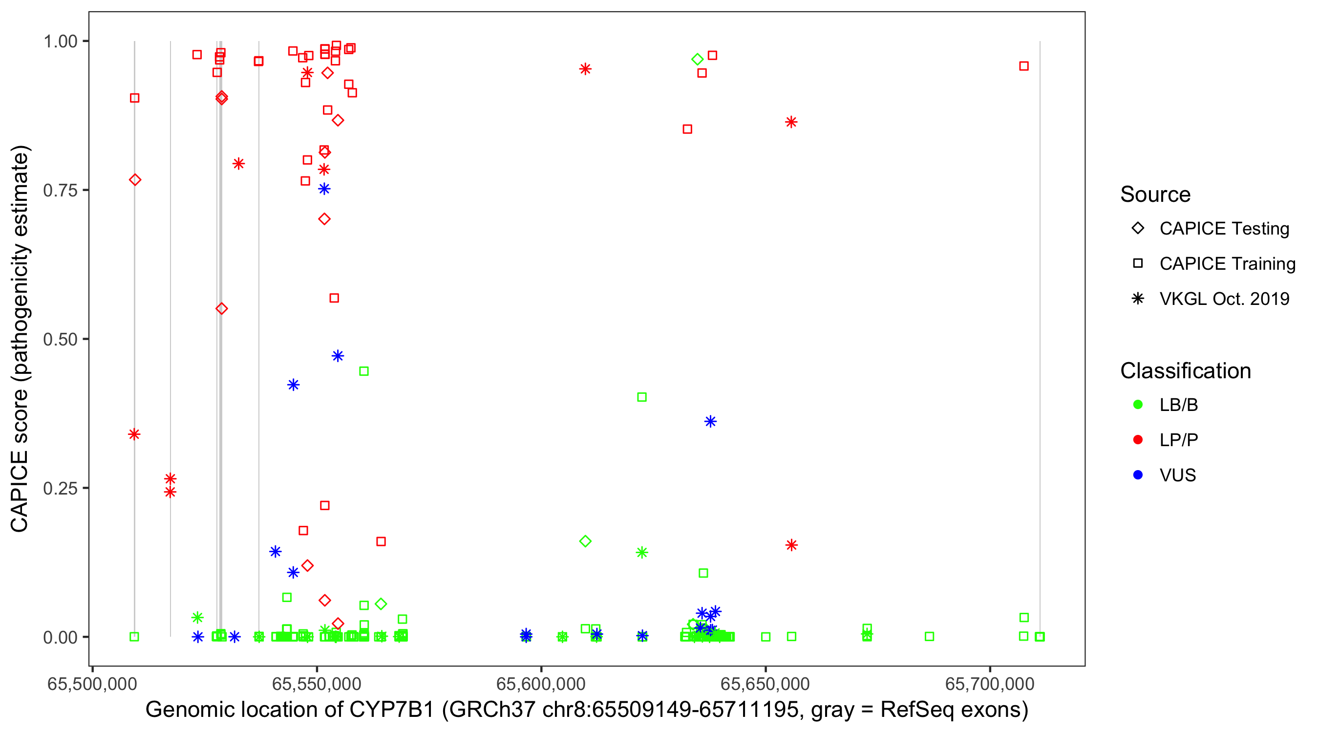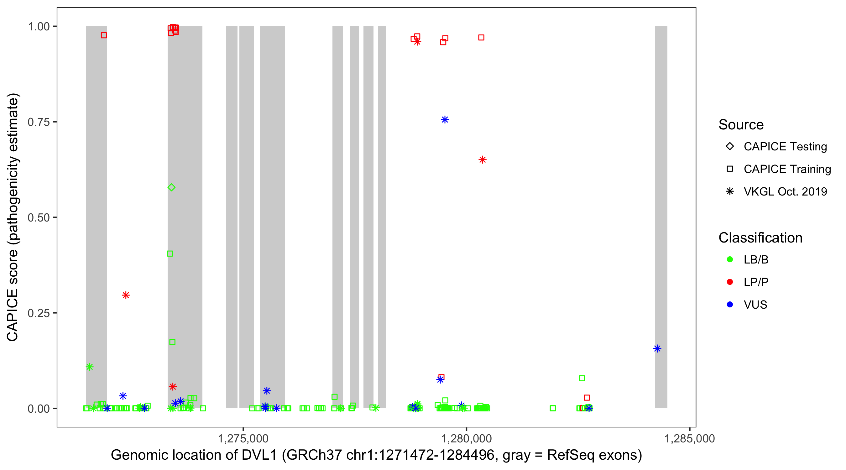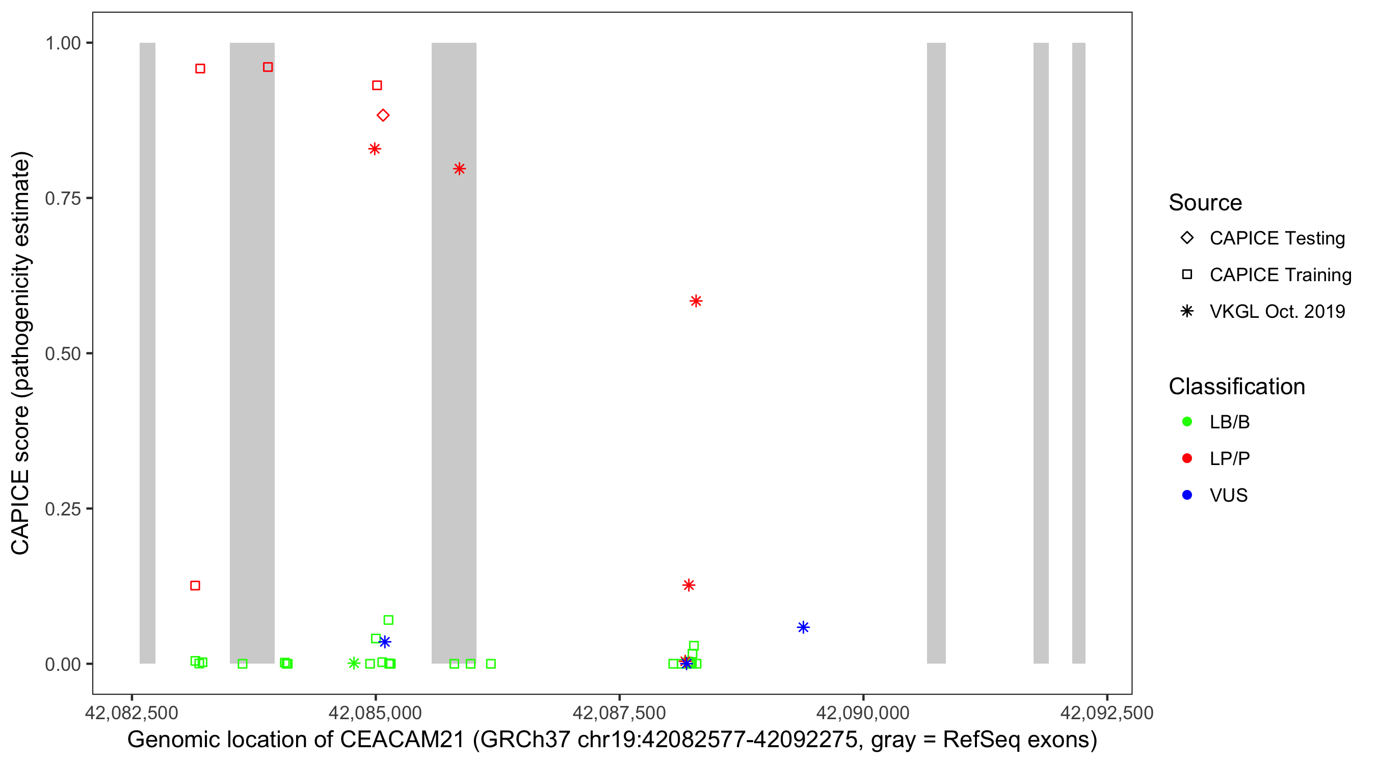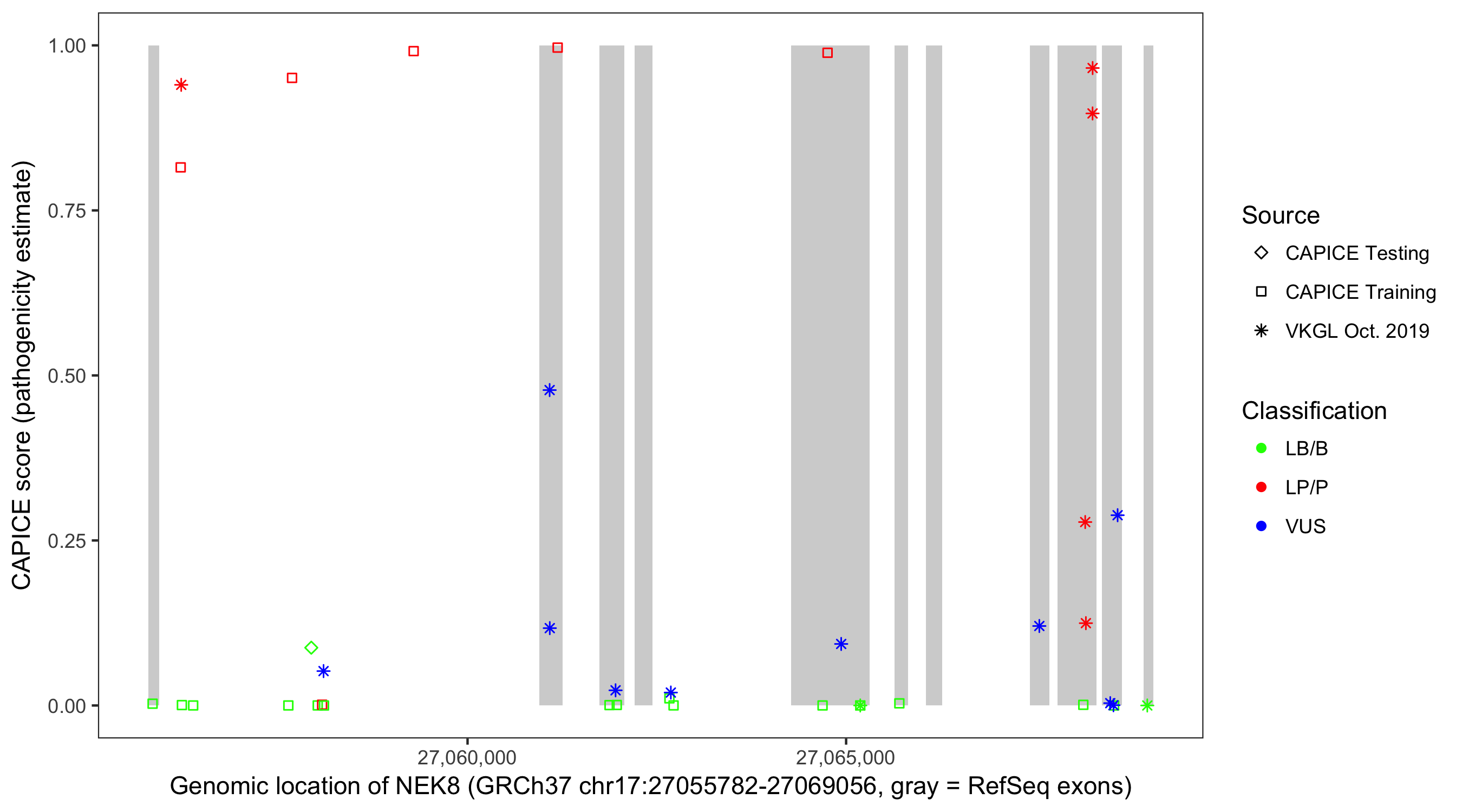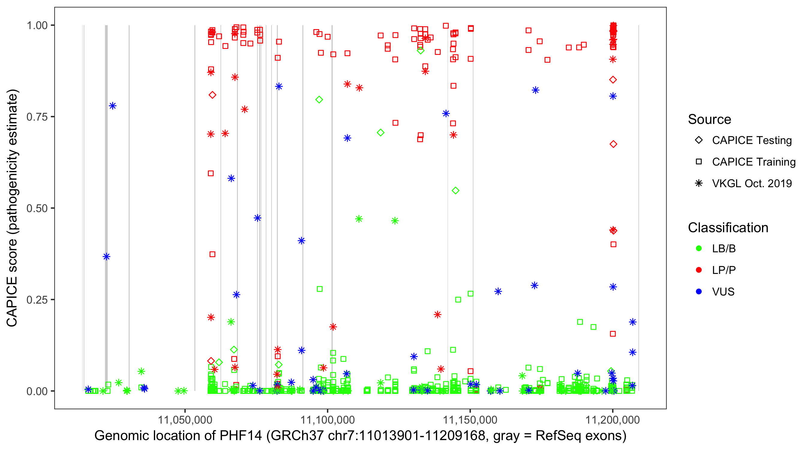 Shown are CAPICE train/test variants plus VKGL Oct 2019.