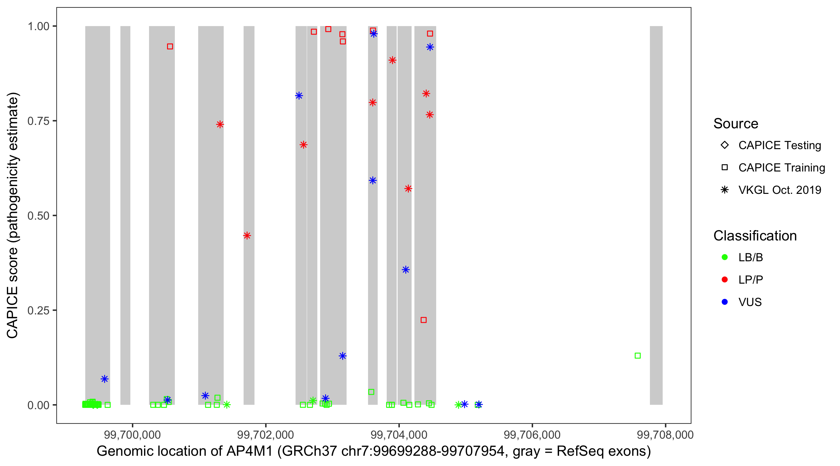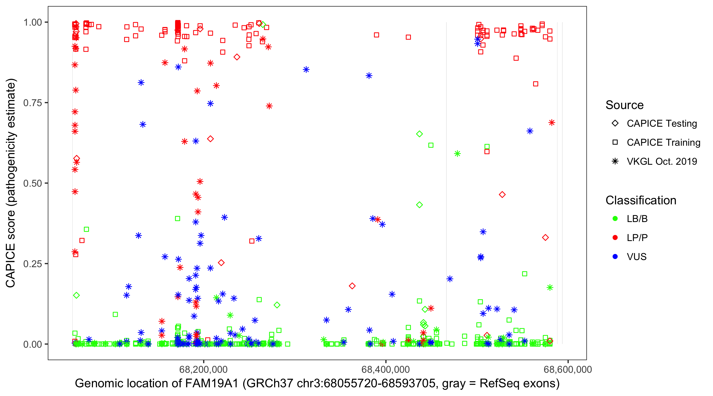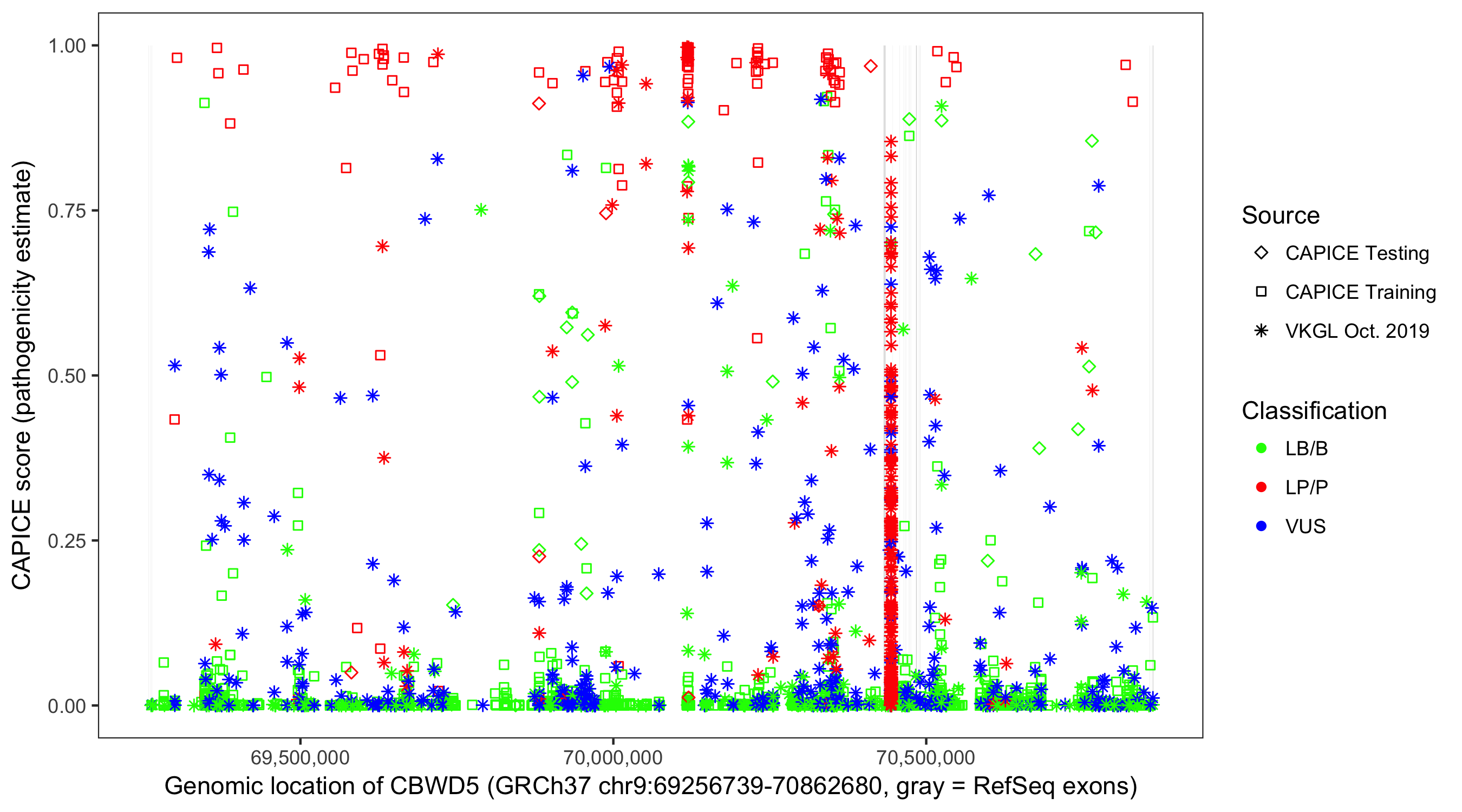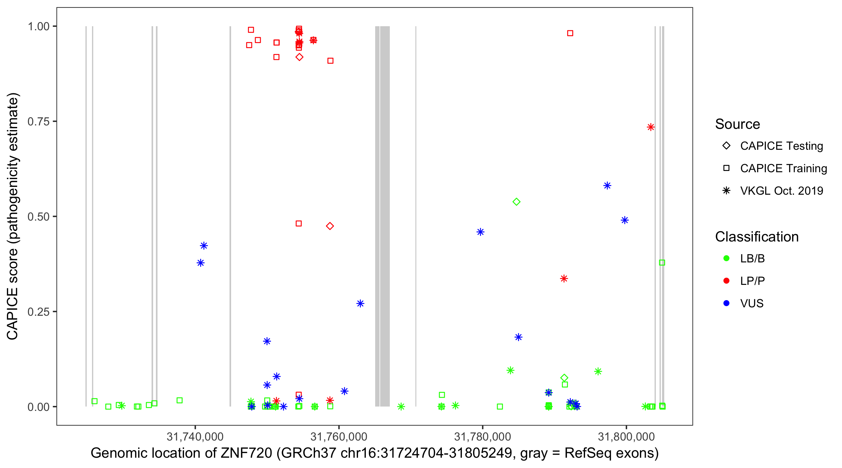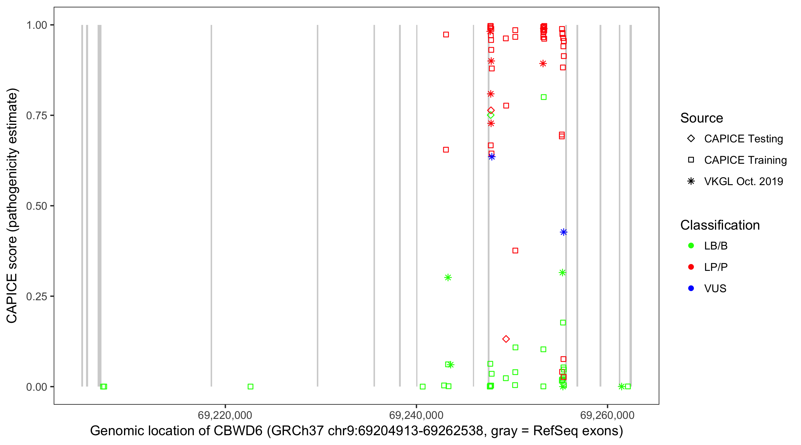 Shown are CAPICE train/test variants plus VKGL Oct 2019.