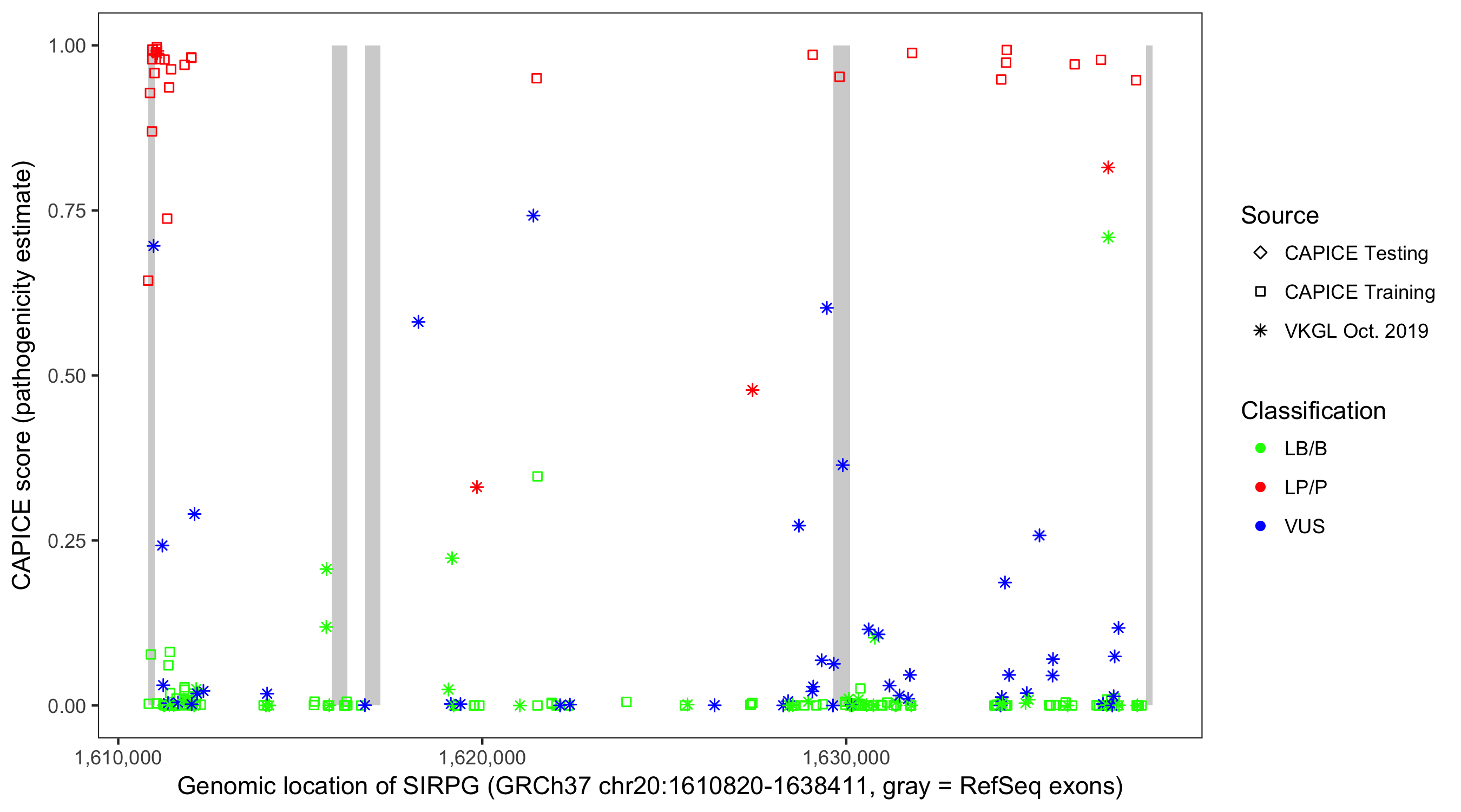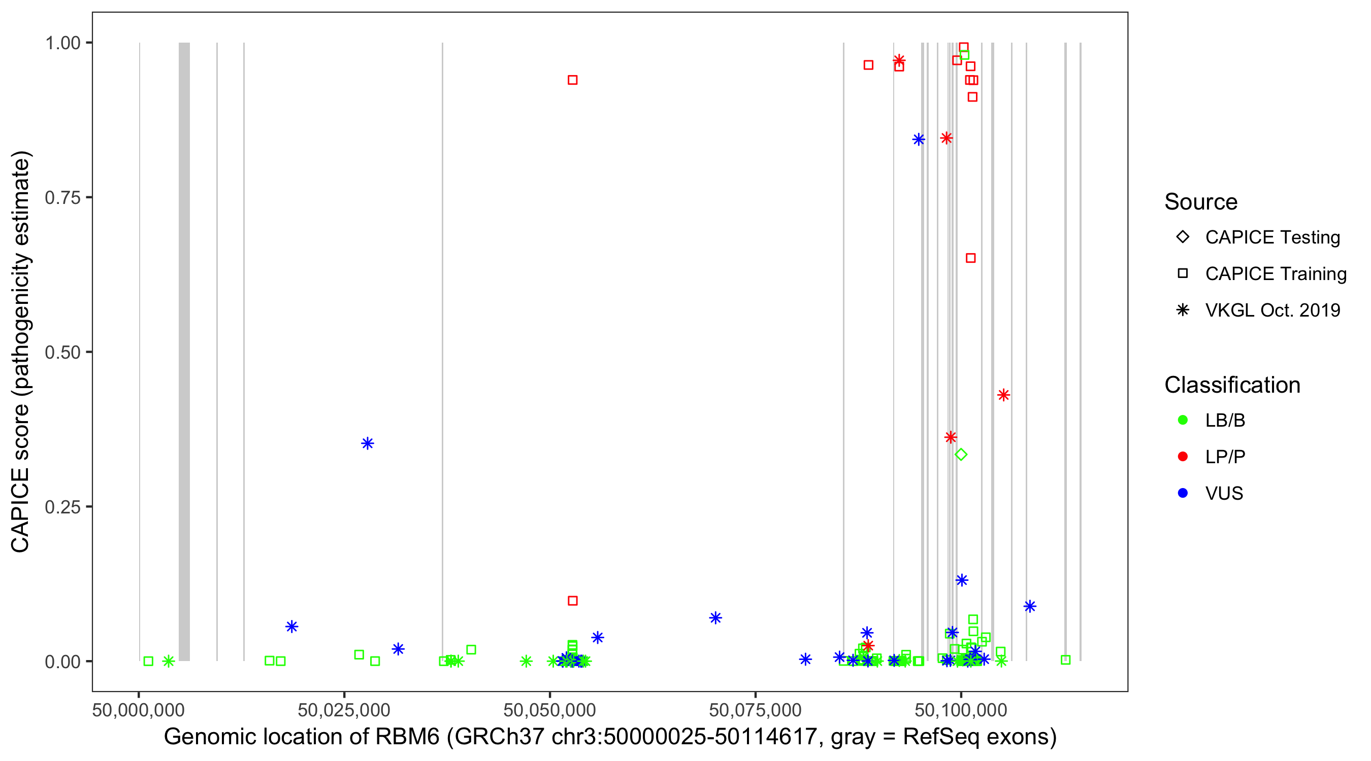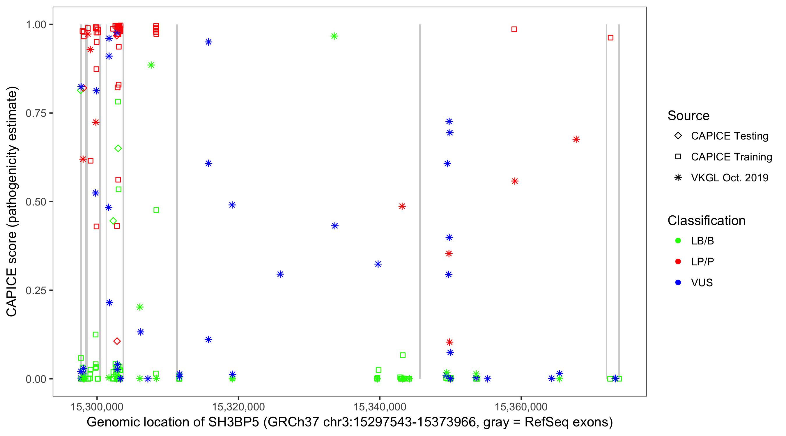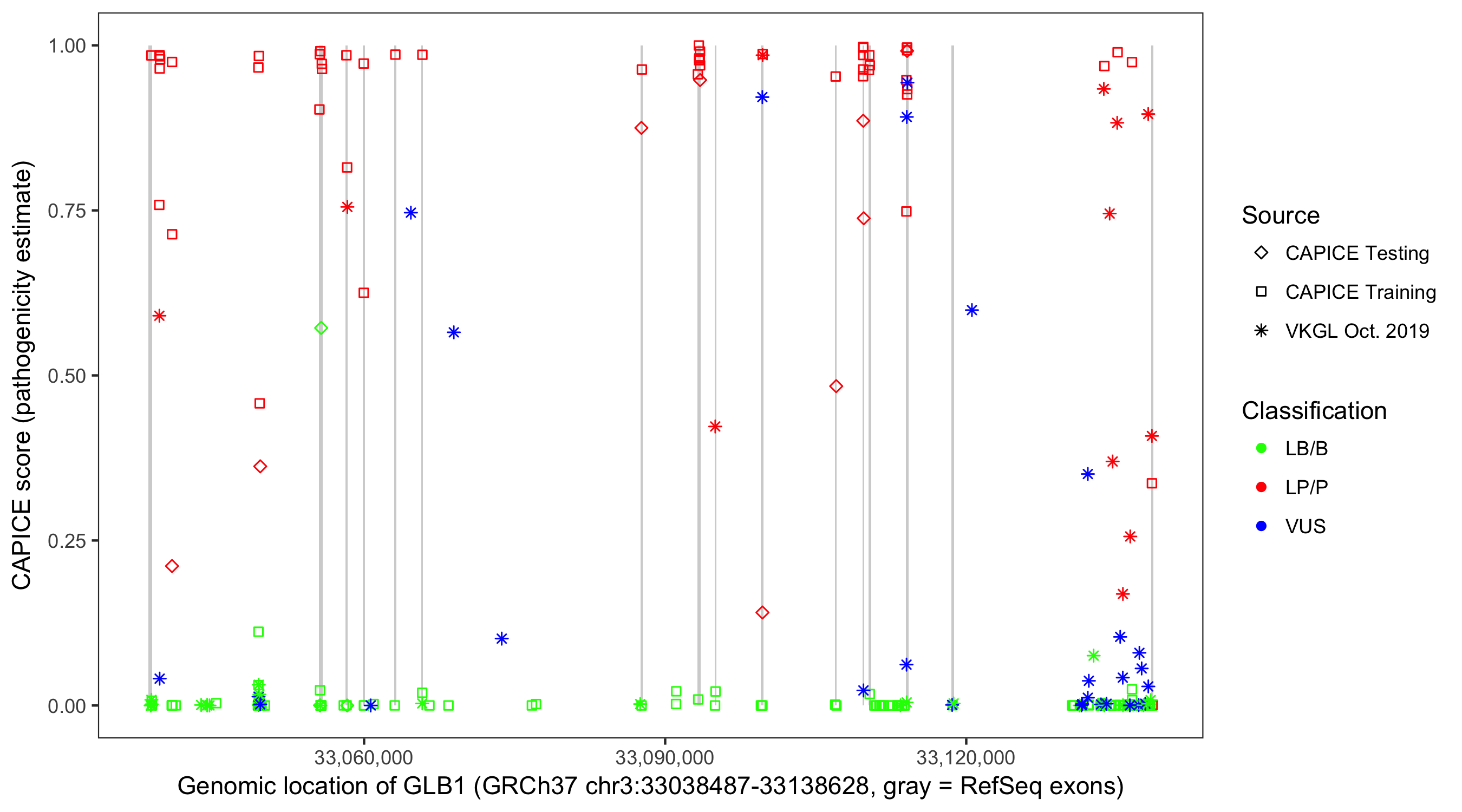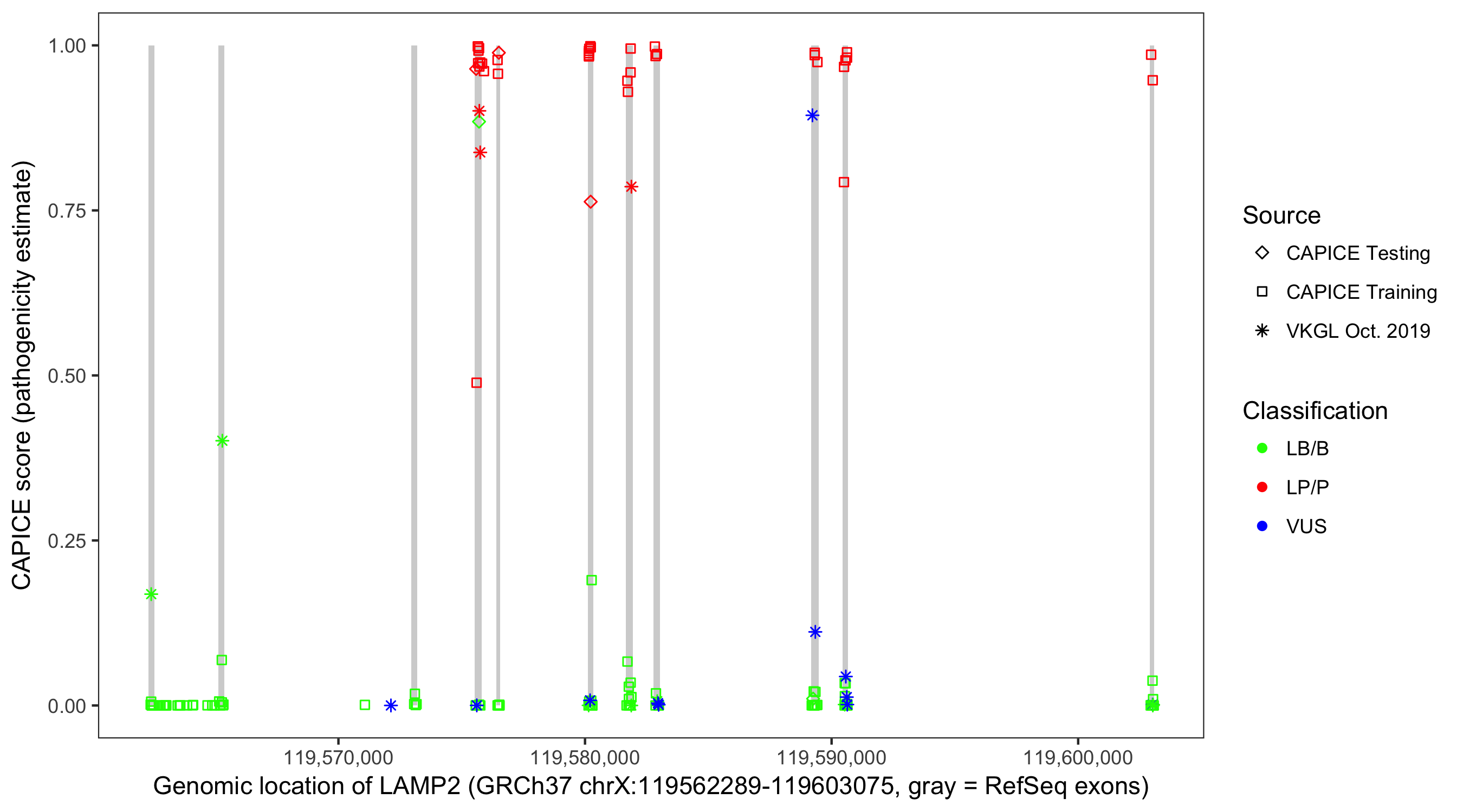 Shown are CAPICE train/test variants plus VKGL Oct 2019.