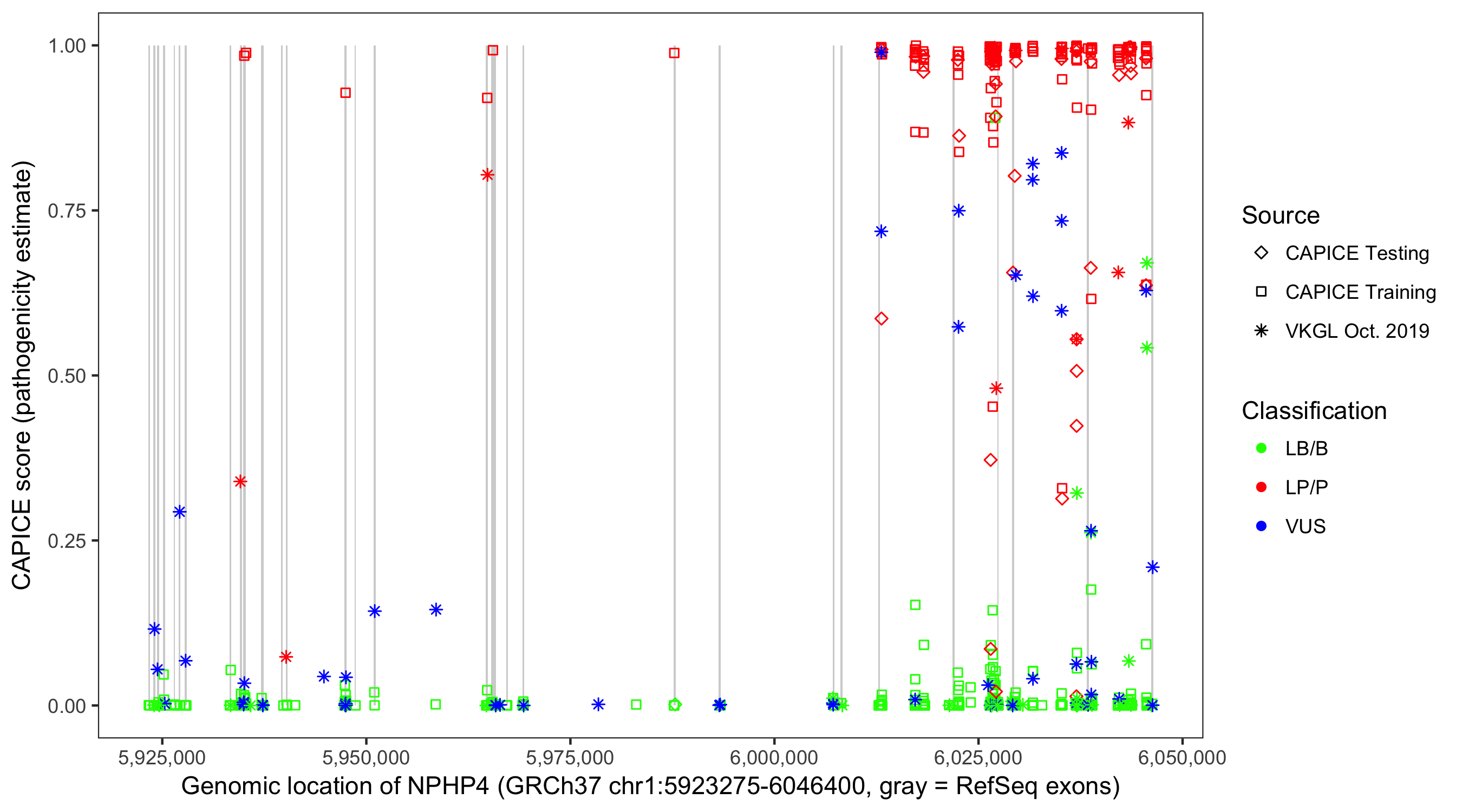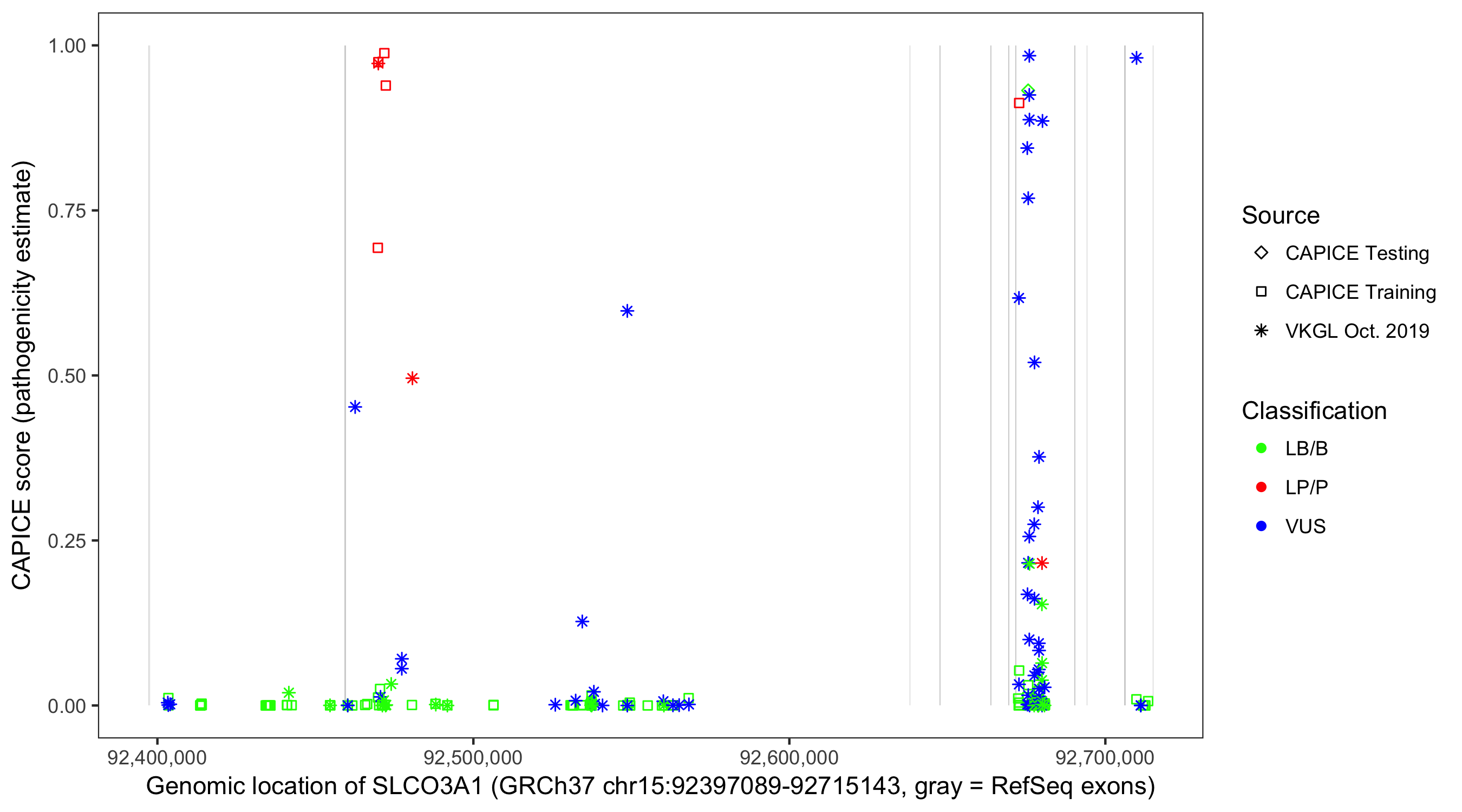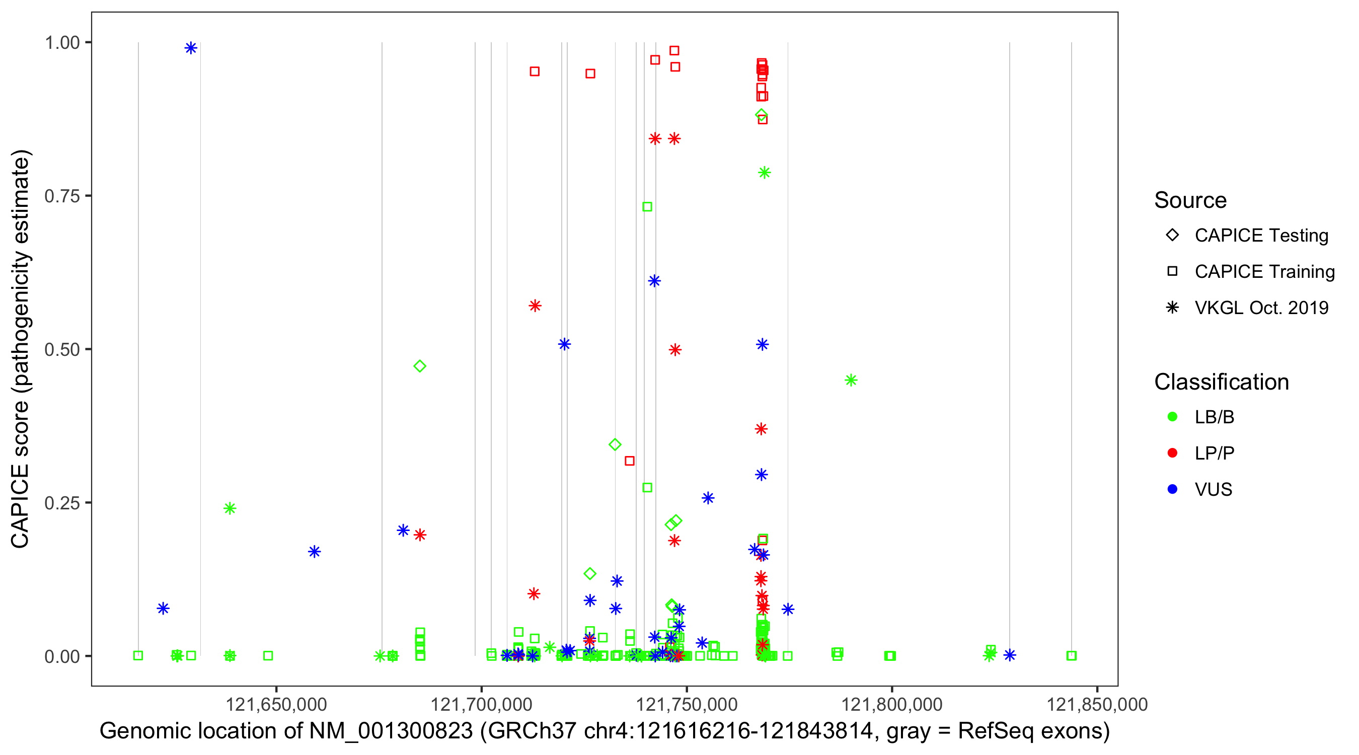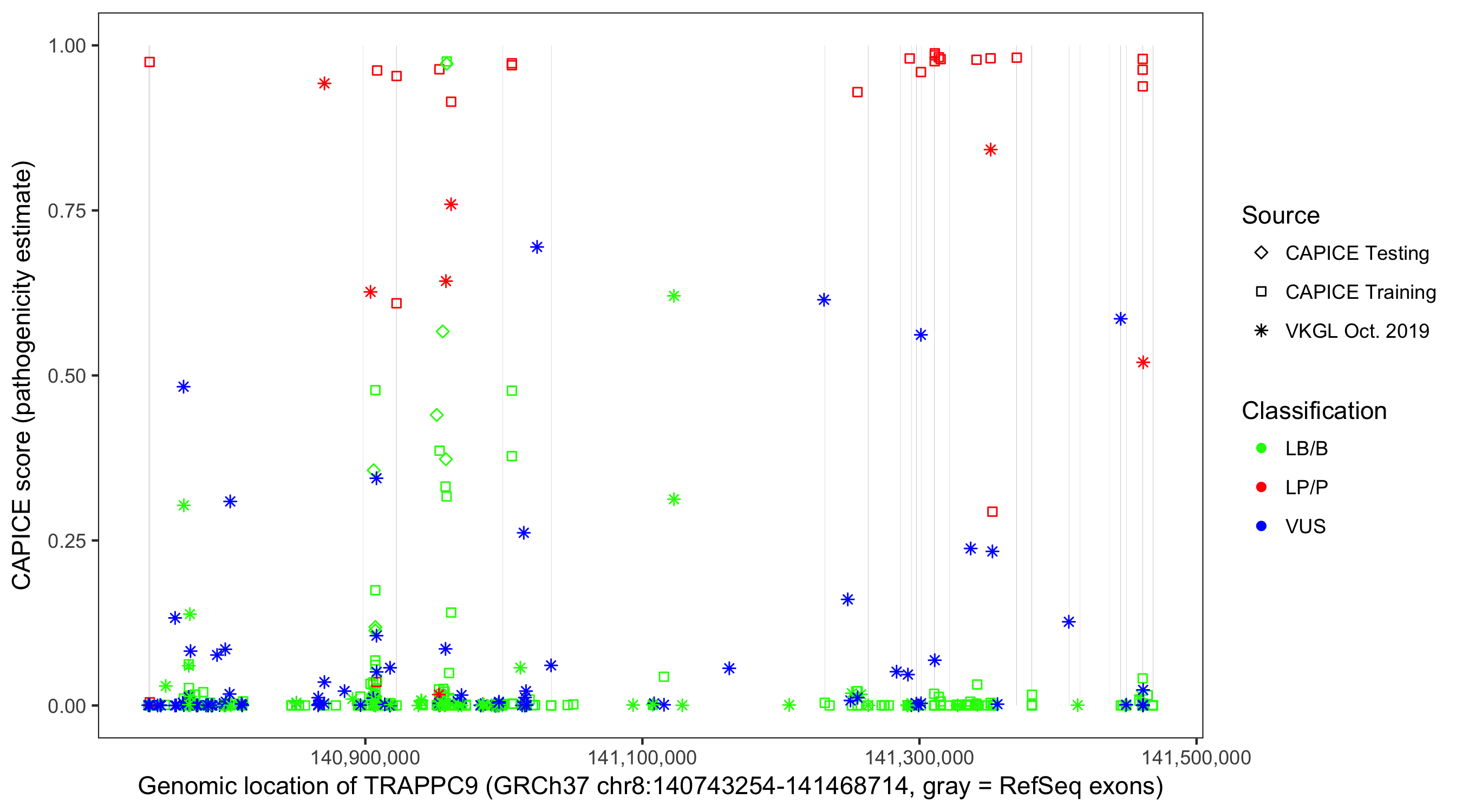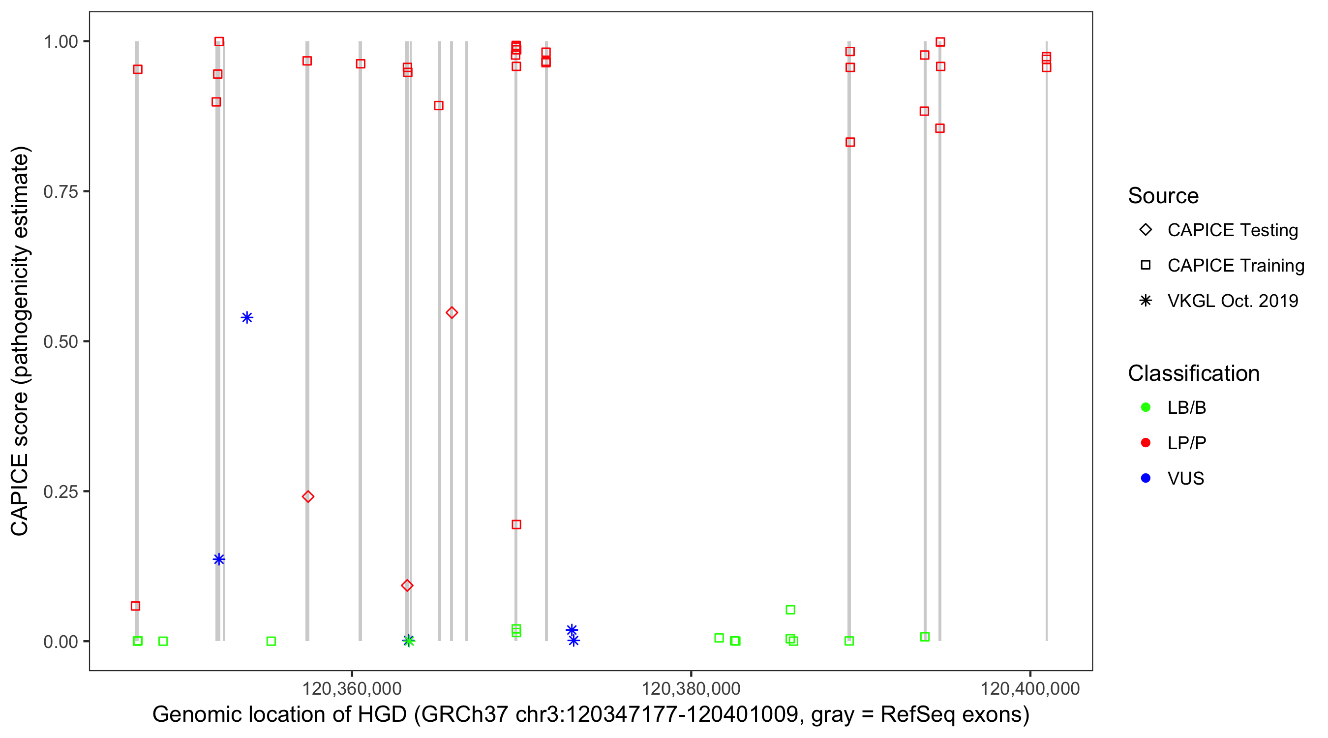 Shown are CAPICE train/test variants plus VKGL Oct 2019.