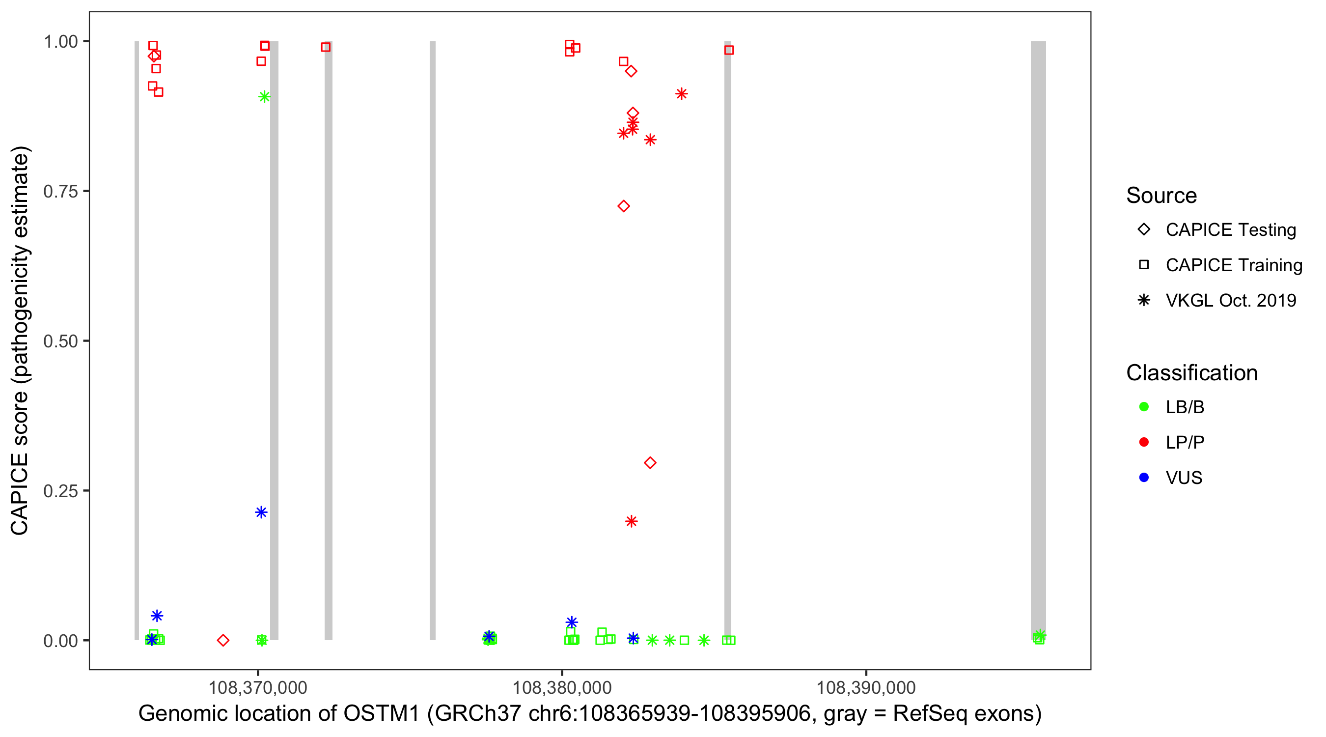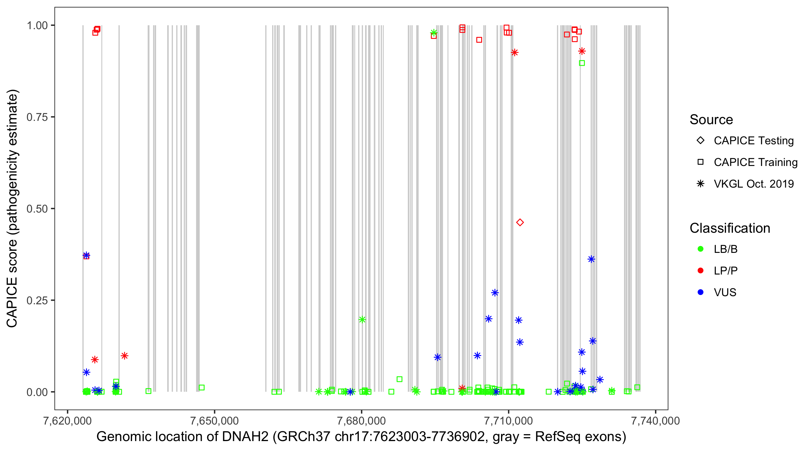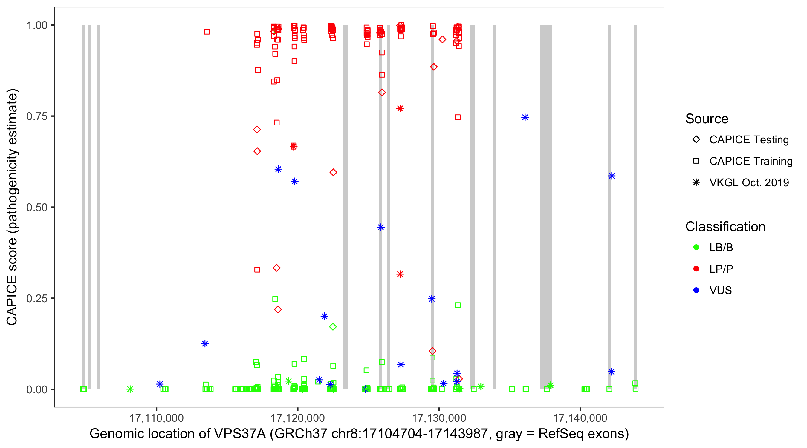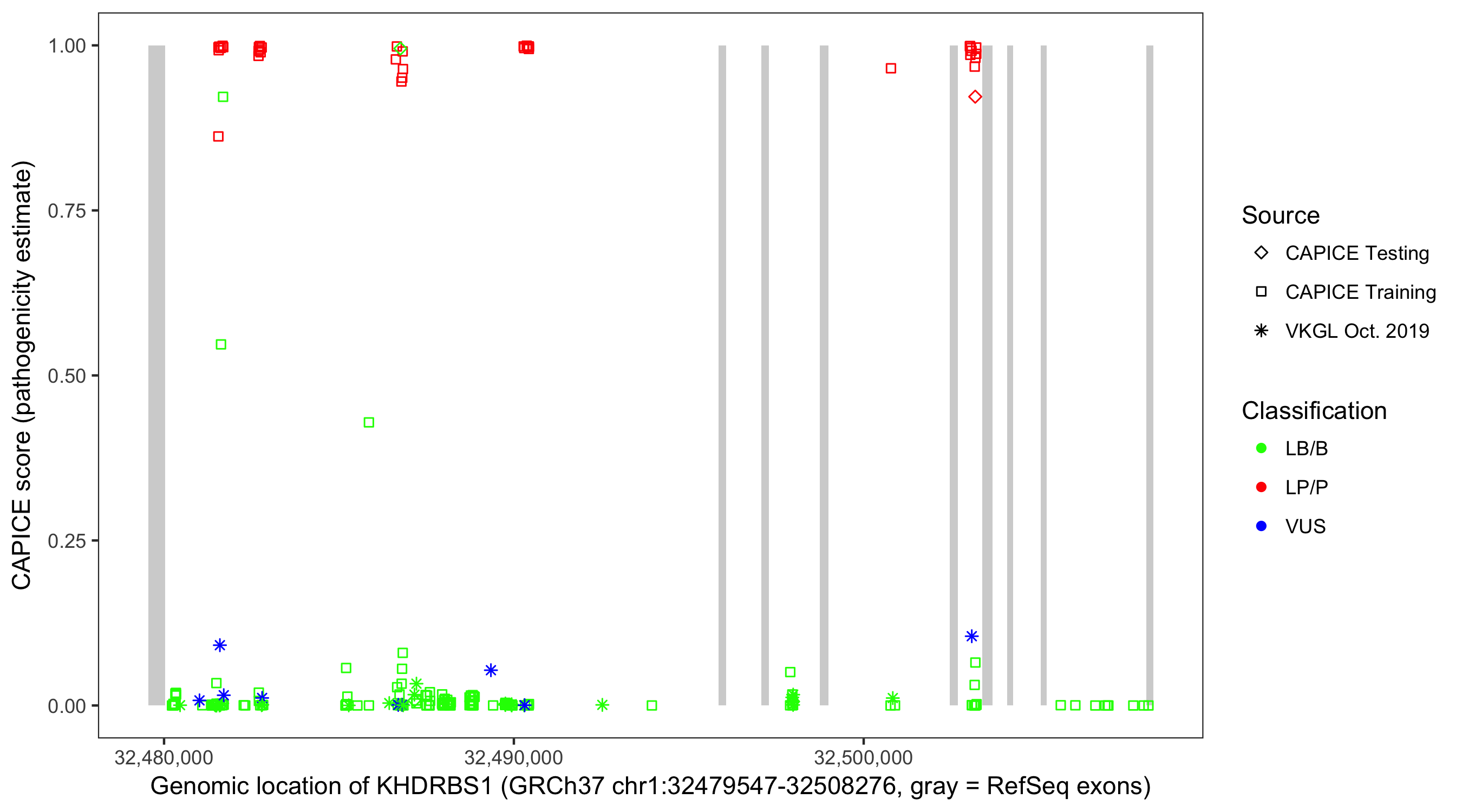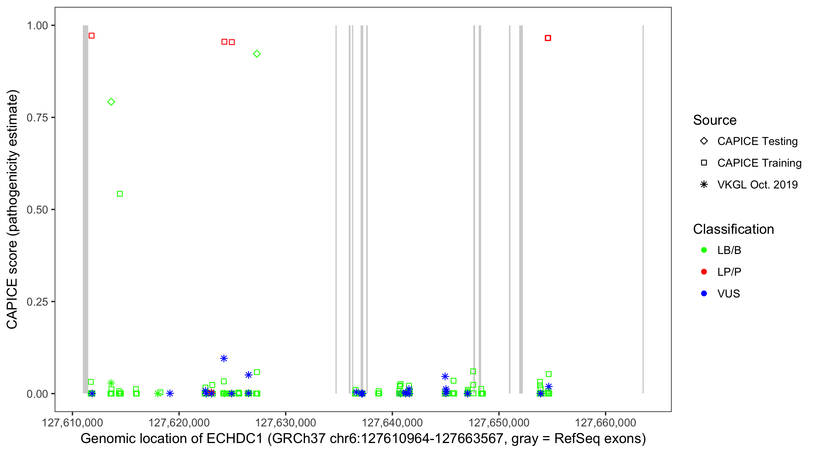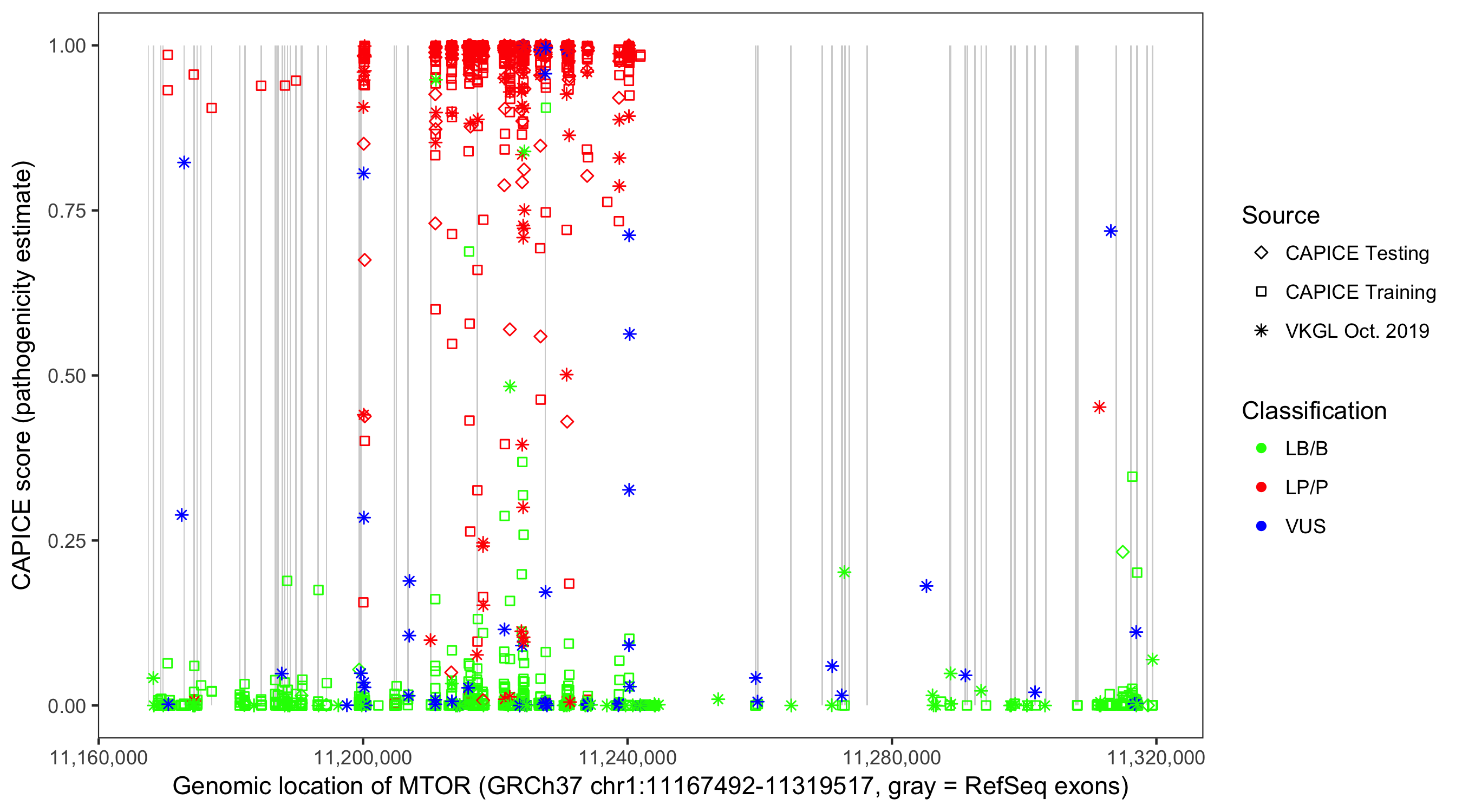Shown are CAPICE train/test variants plus VKGL Oct 2019.
