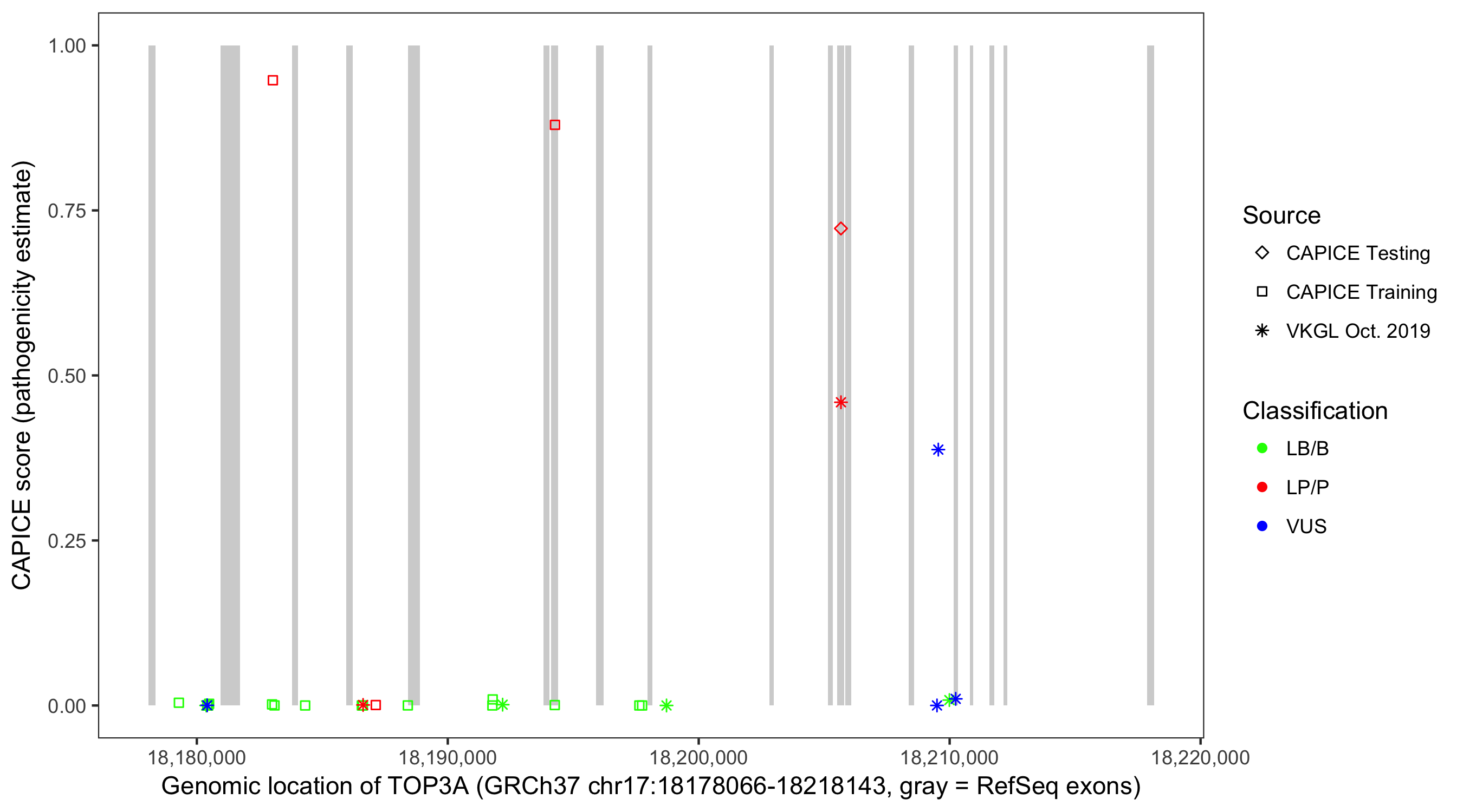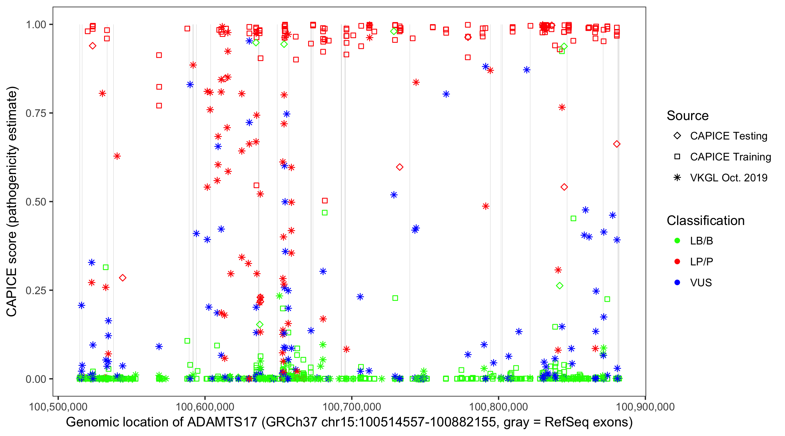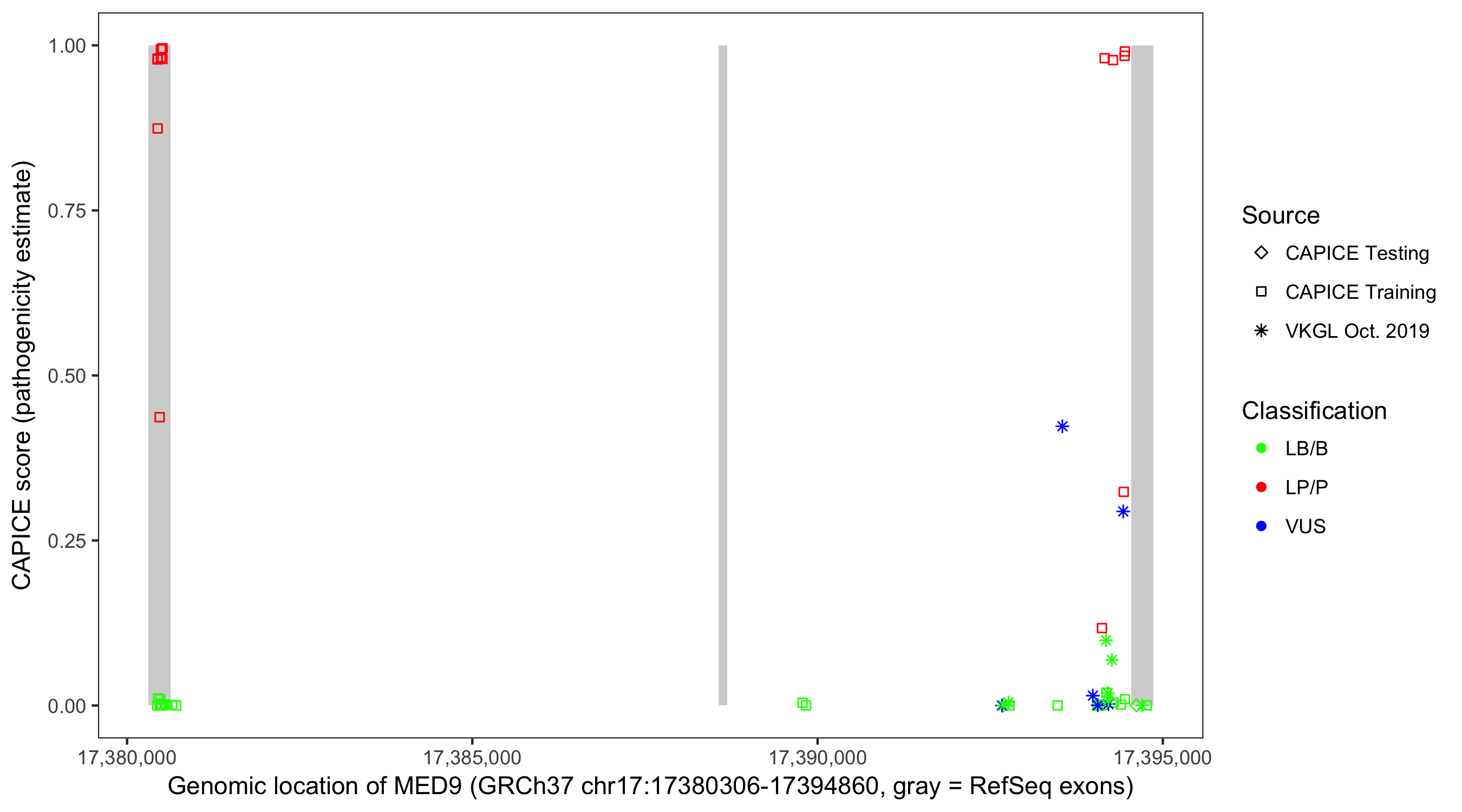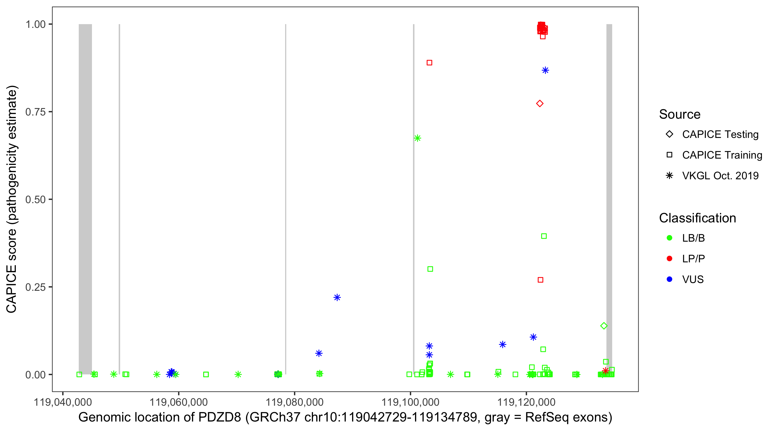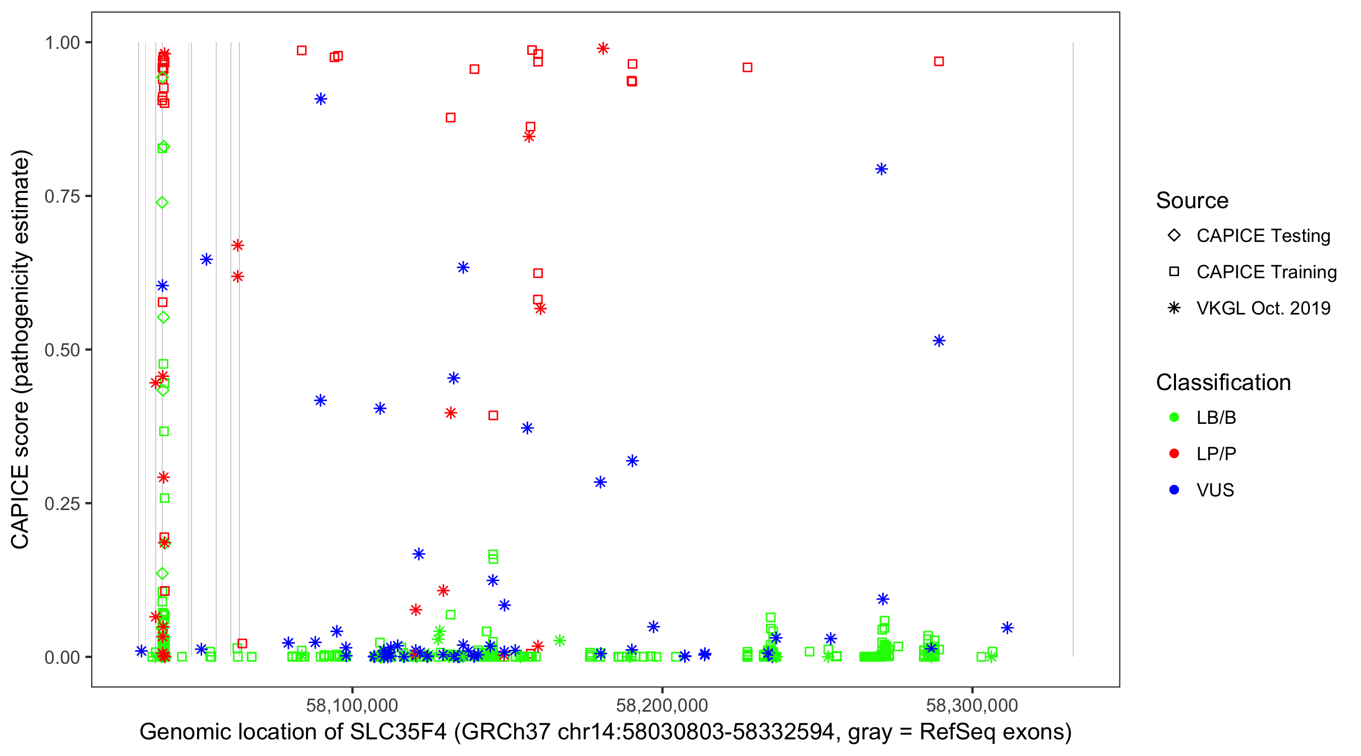 Shown are CAPICE train/test variants plus VKGL Oct 2019.