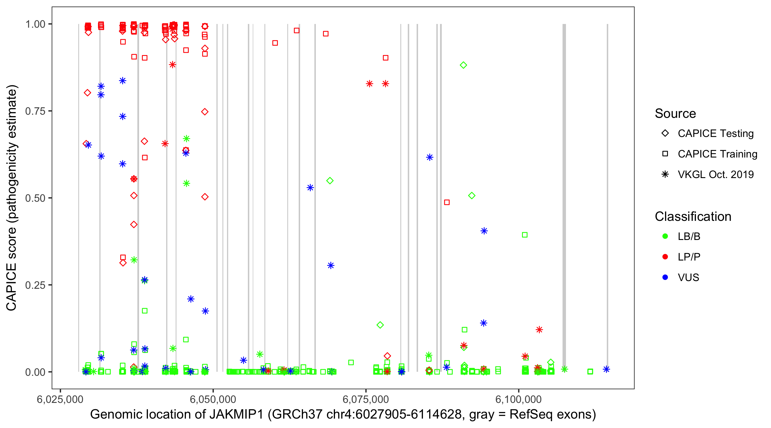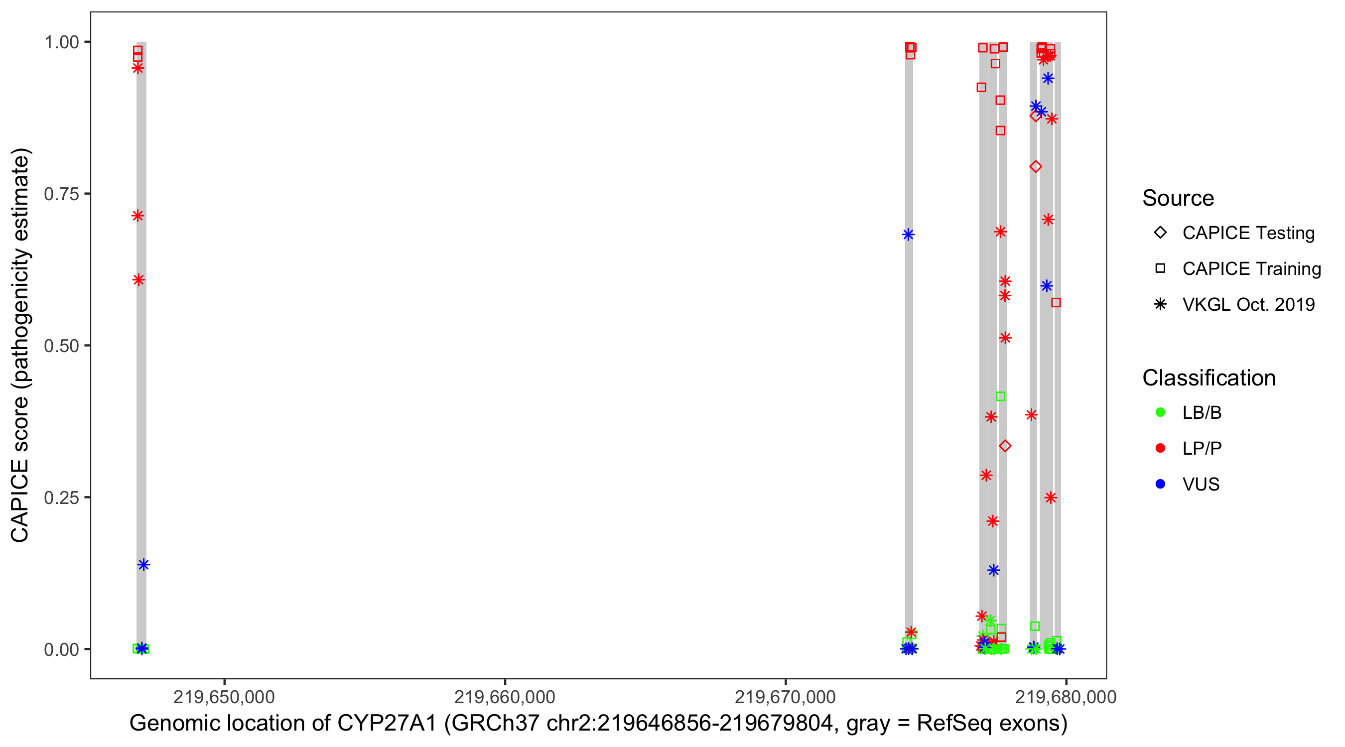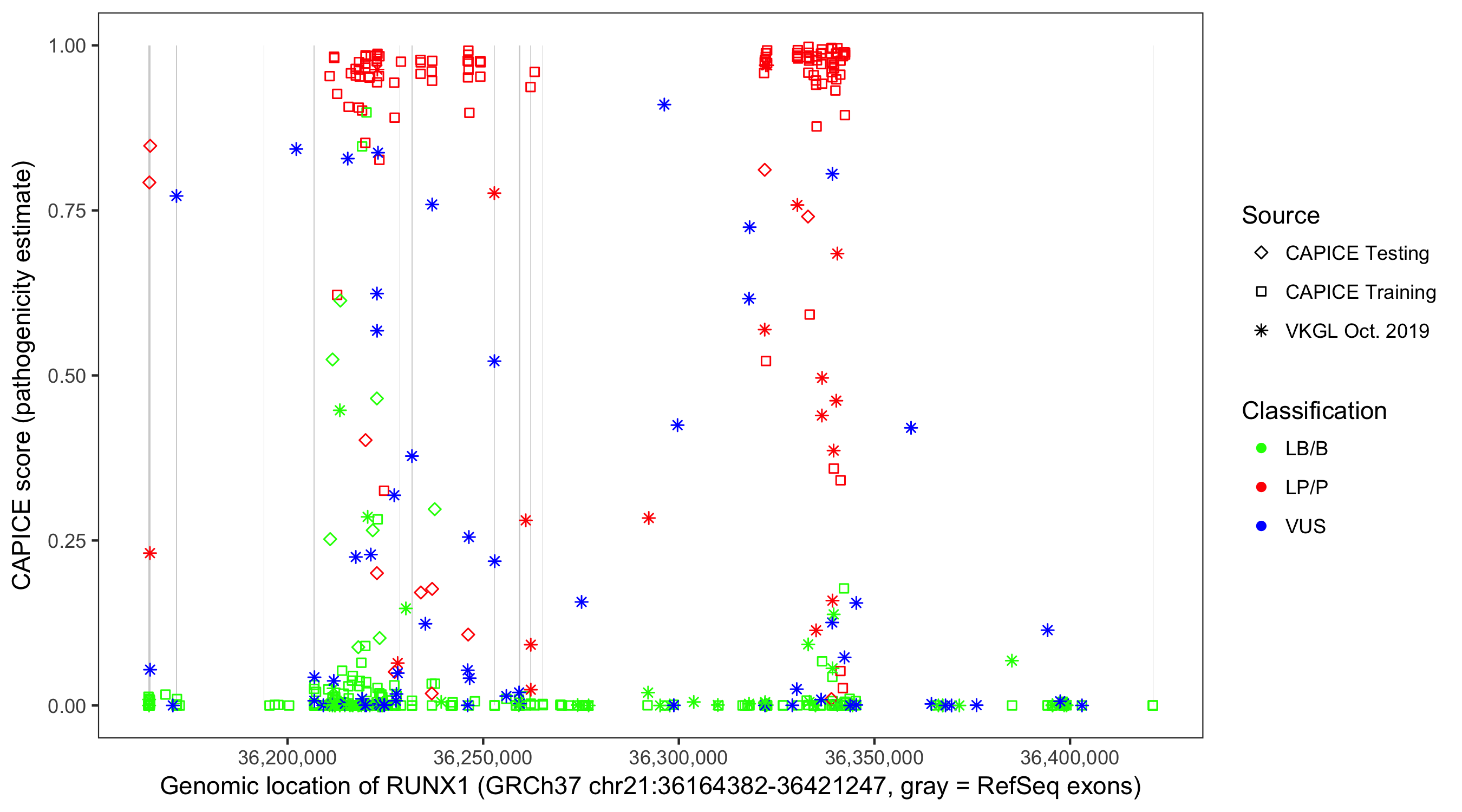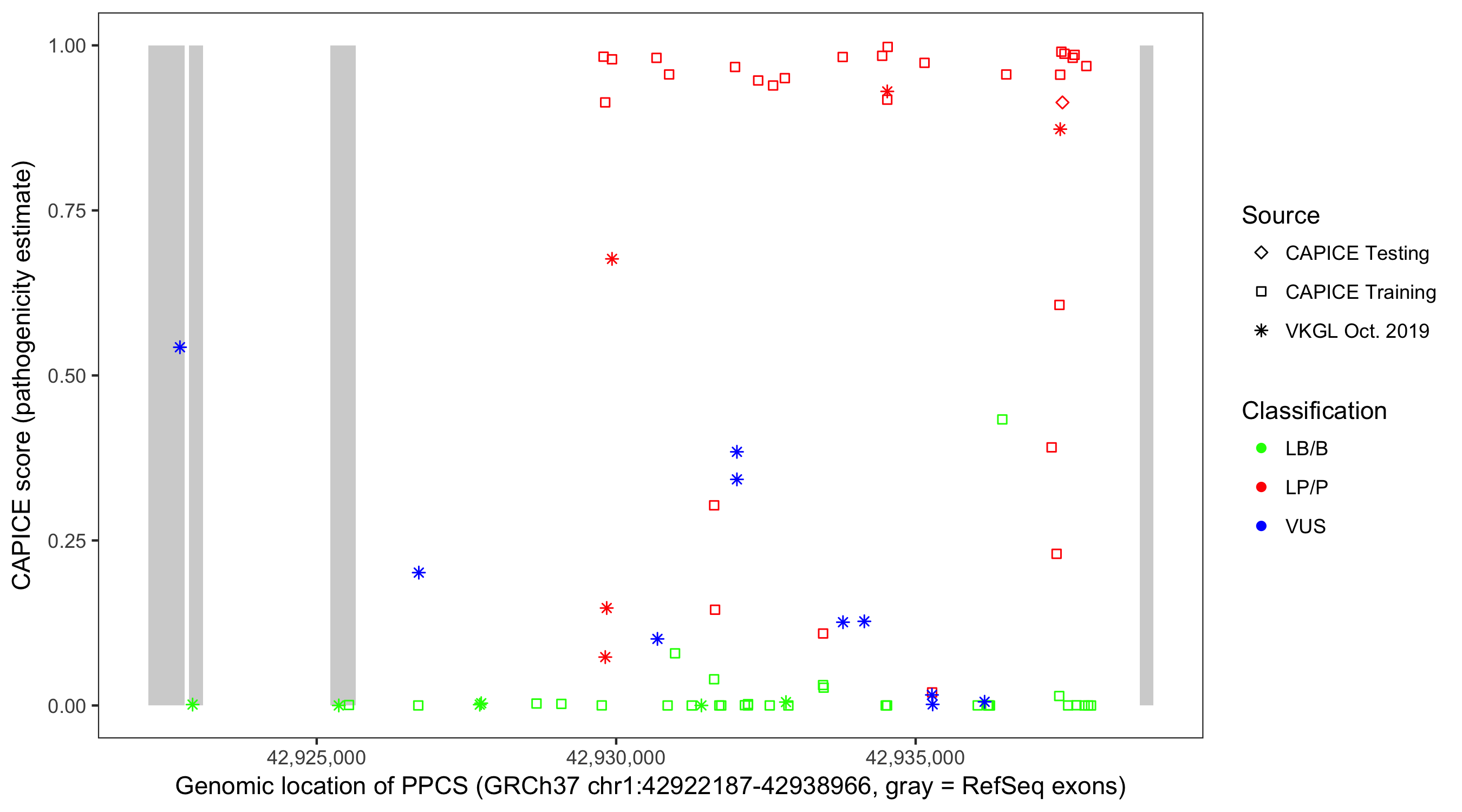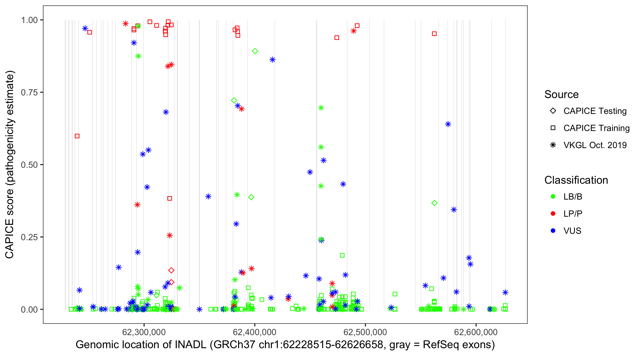 Shown are CAPICE train/test variants plus VKGL Oct 2019.
