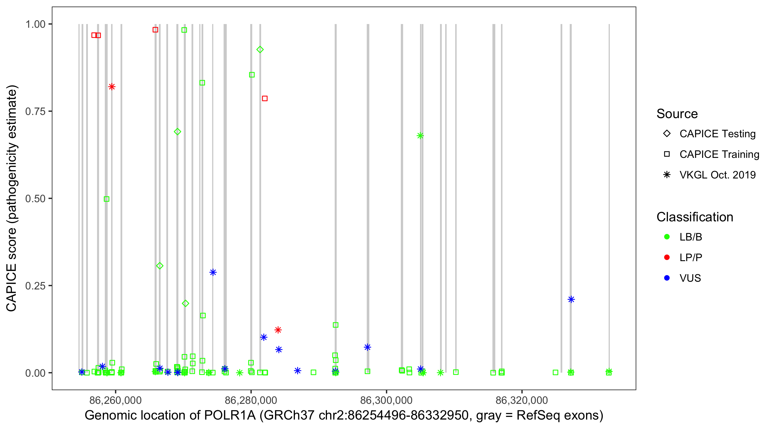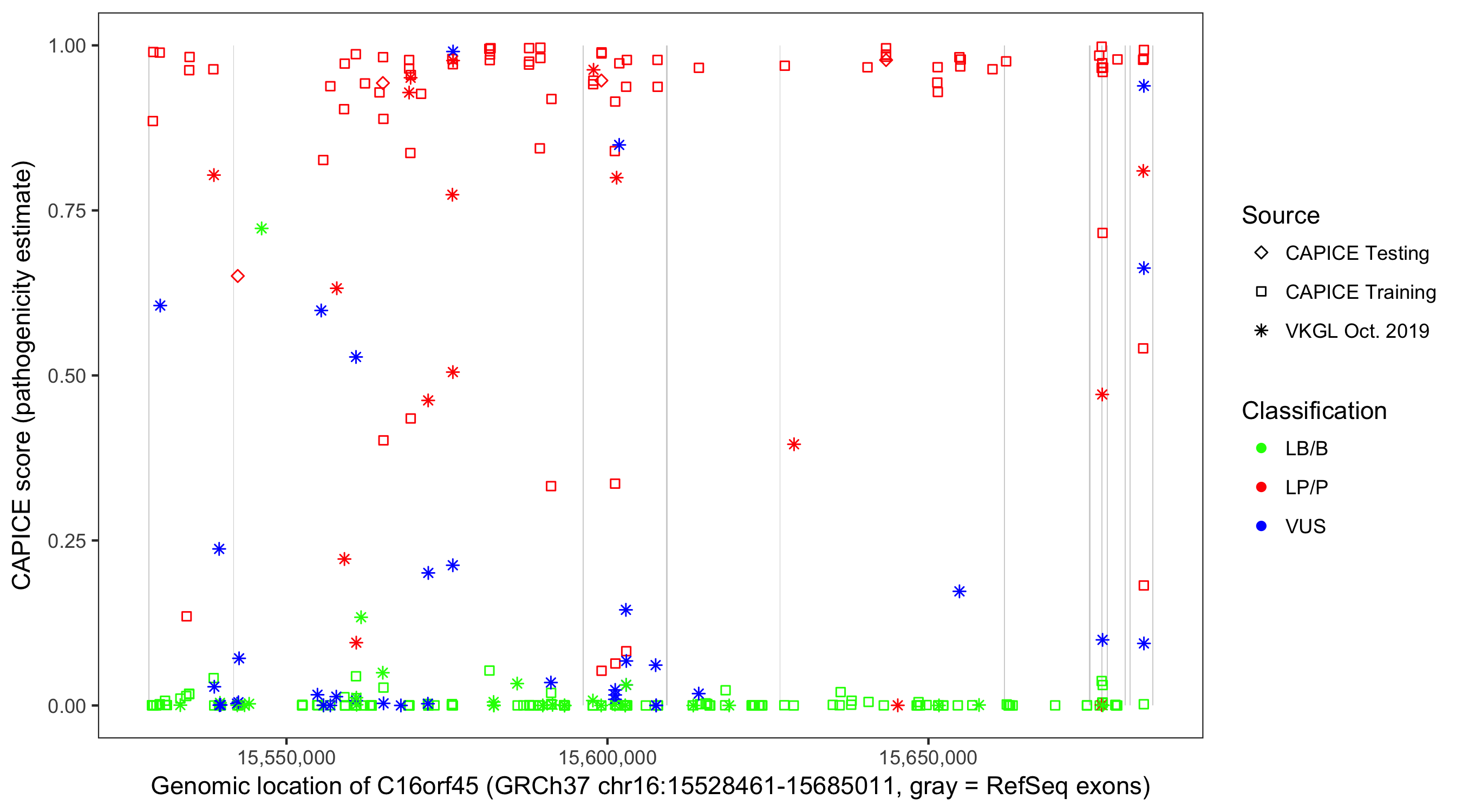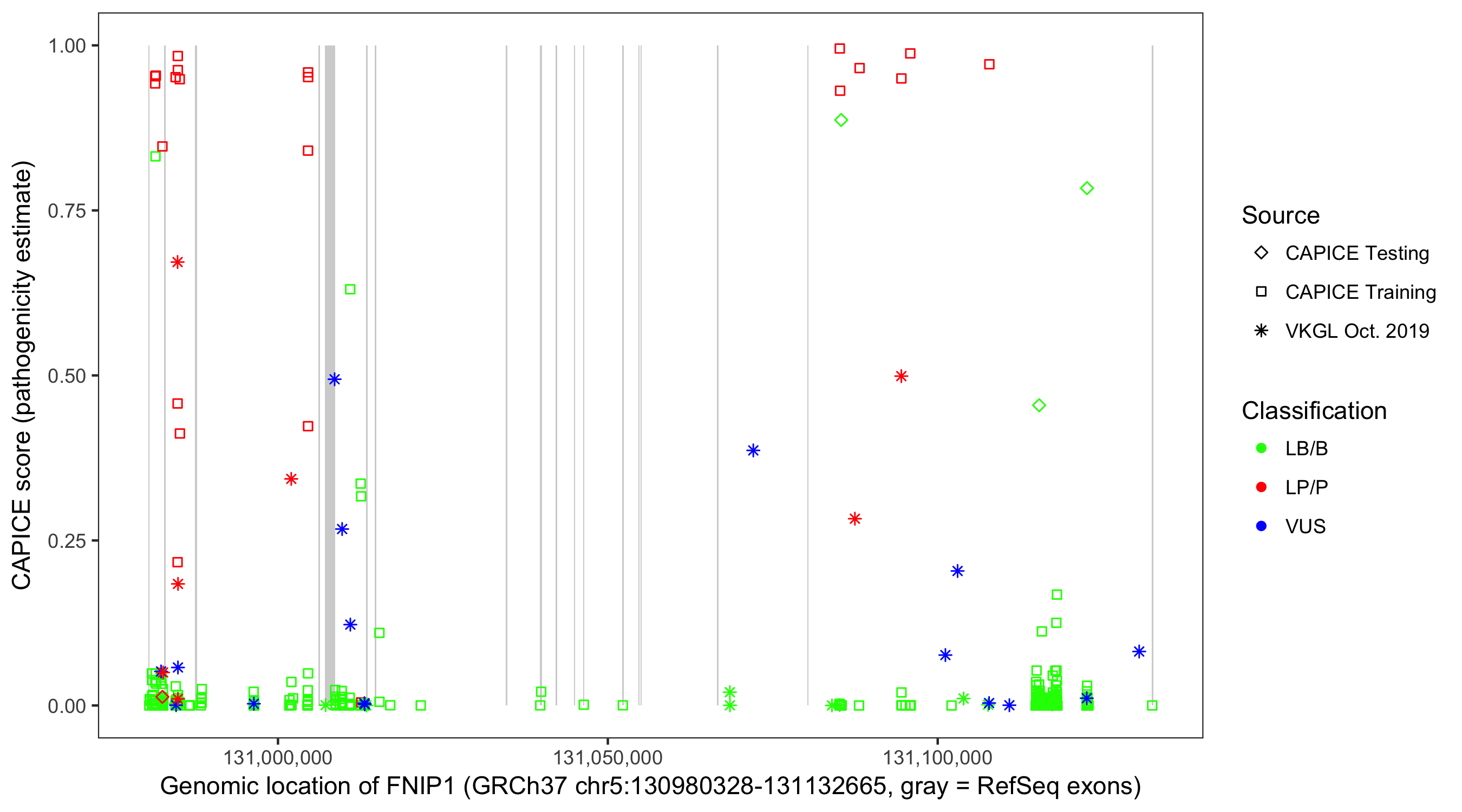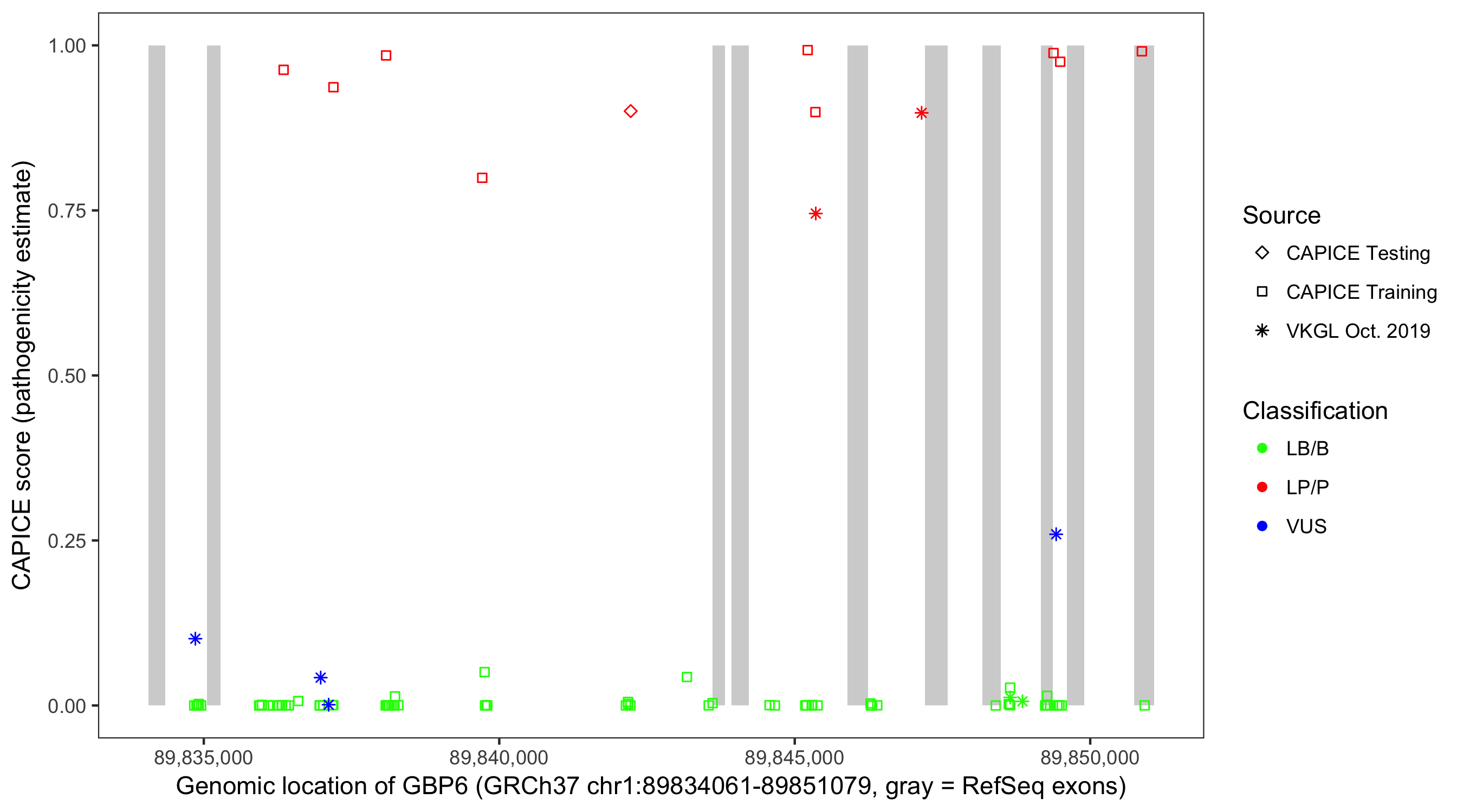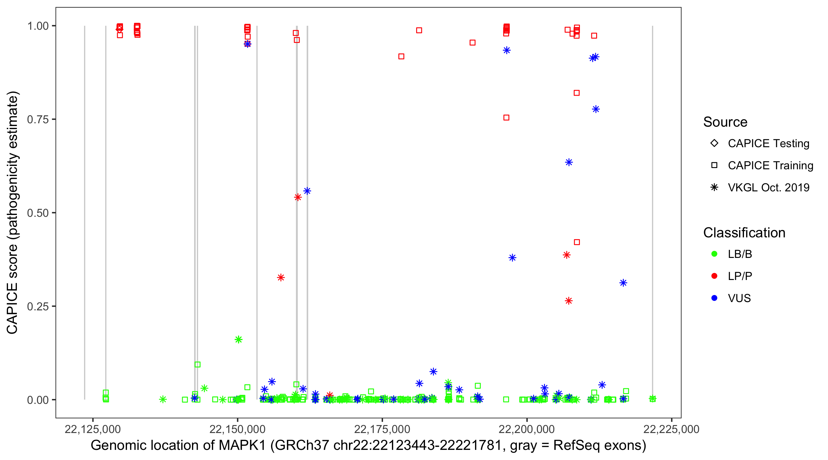 Shown are CAPICE train/test variants plus VKGL Oct 2019.