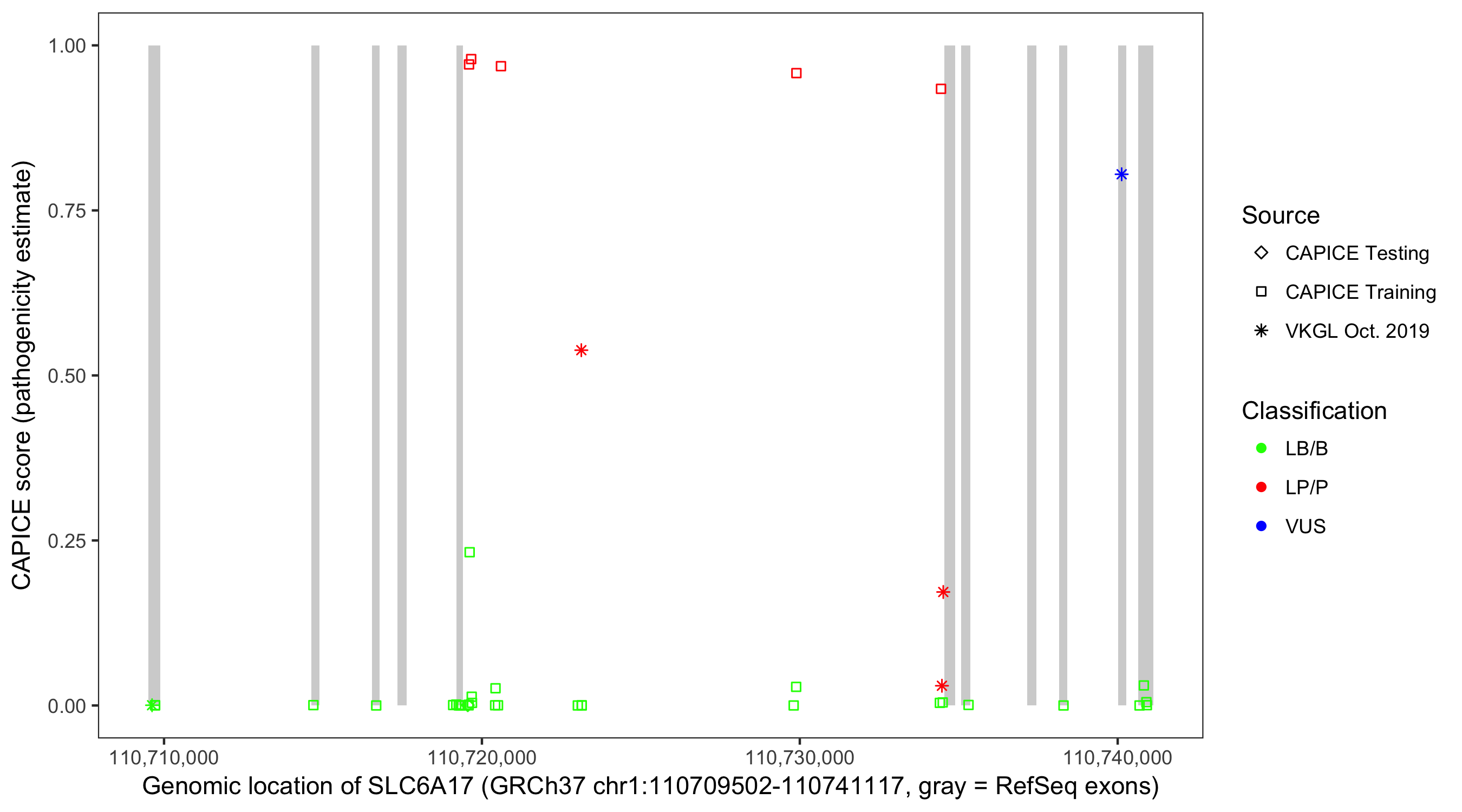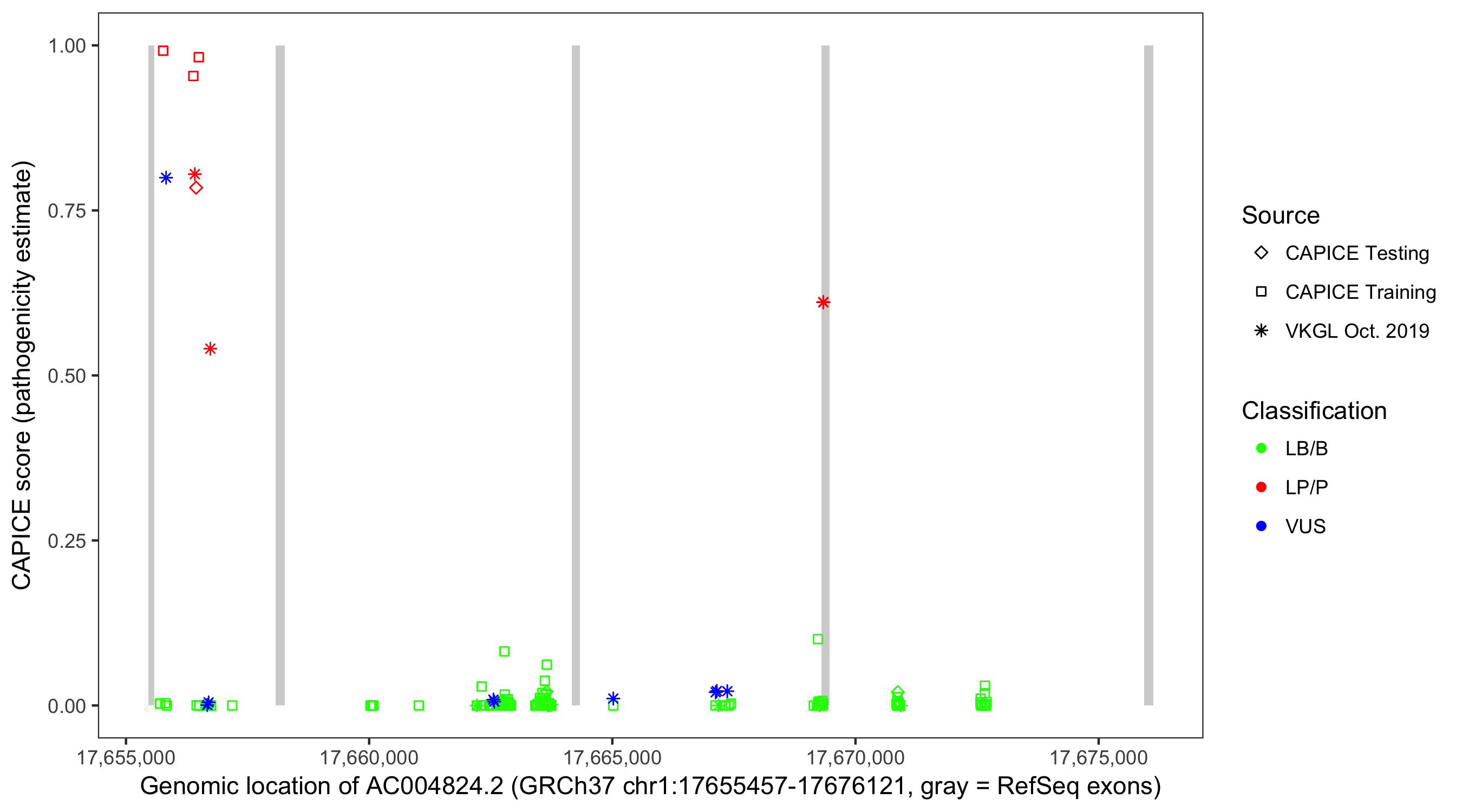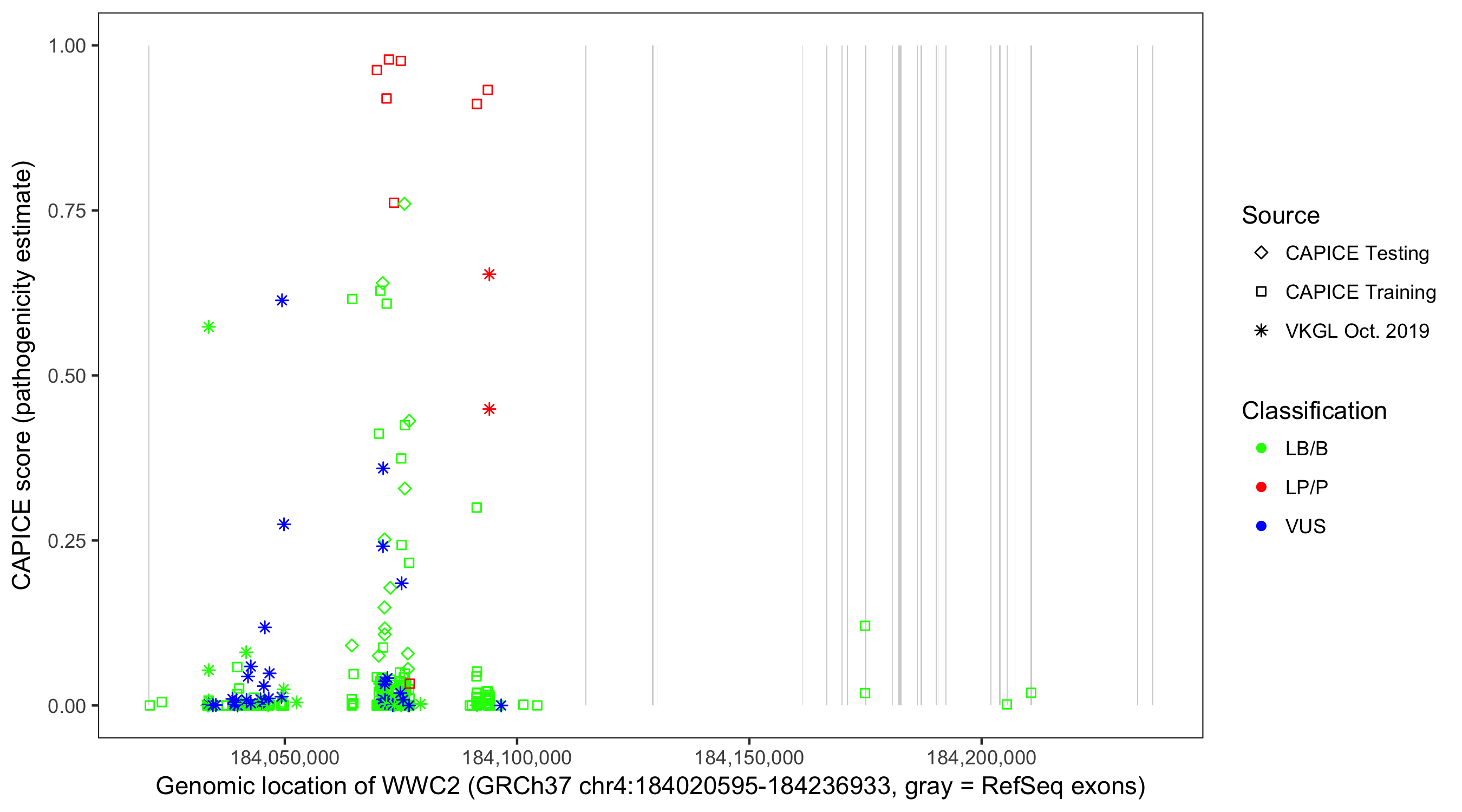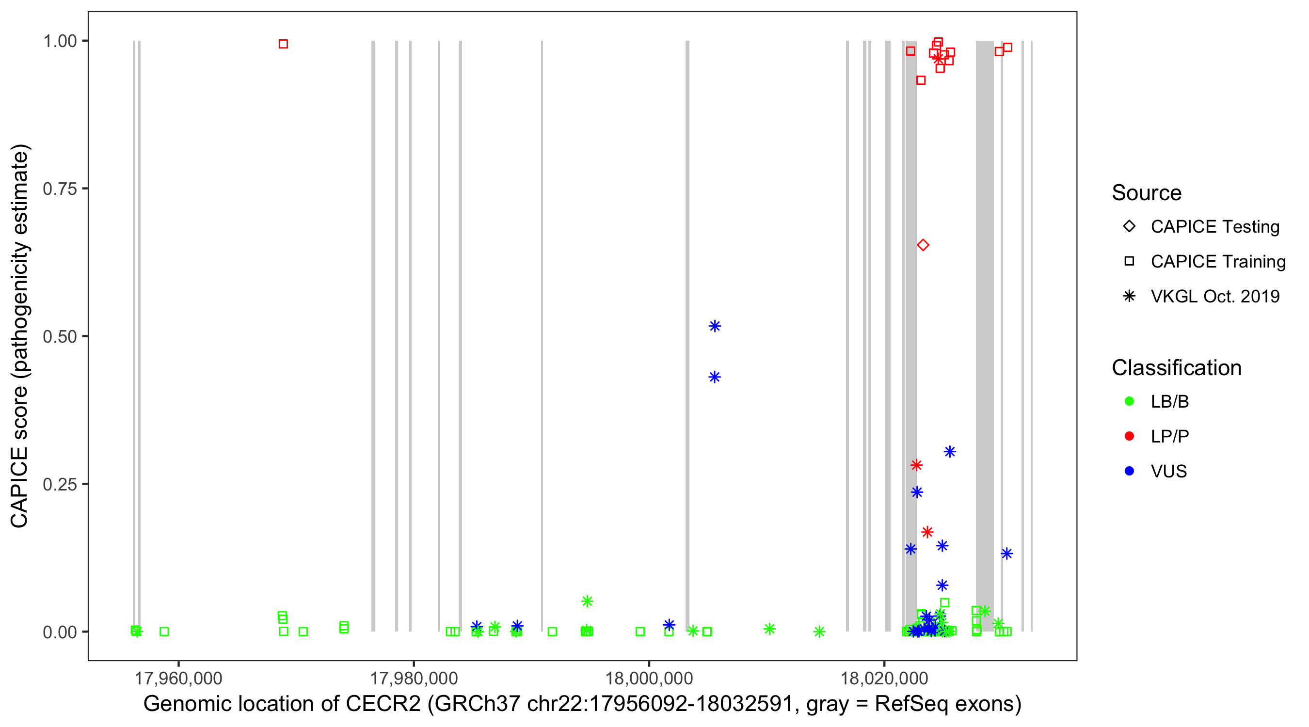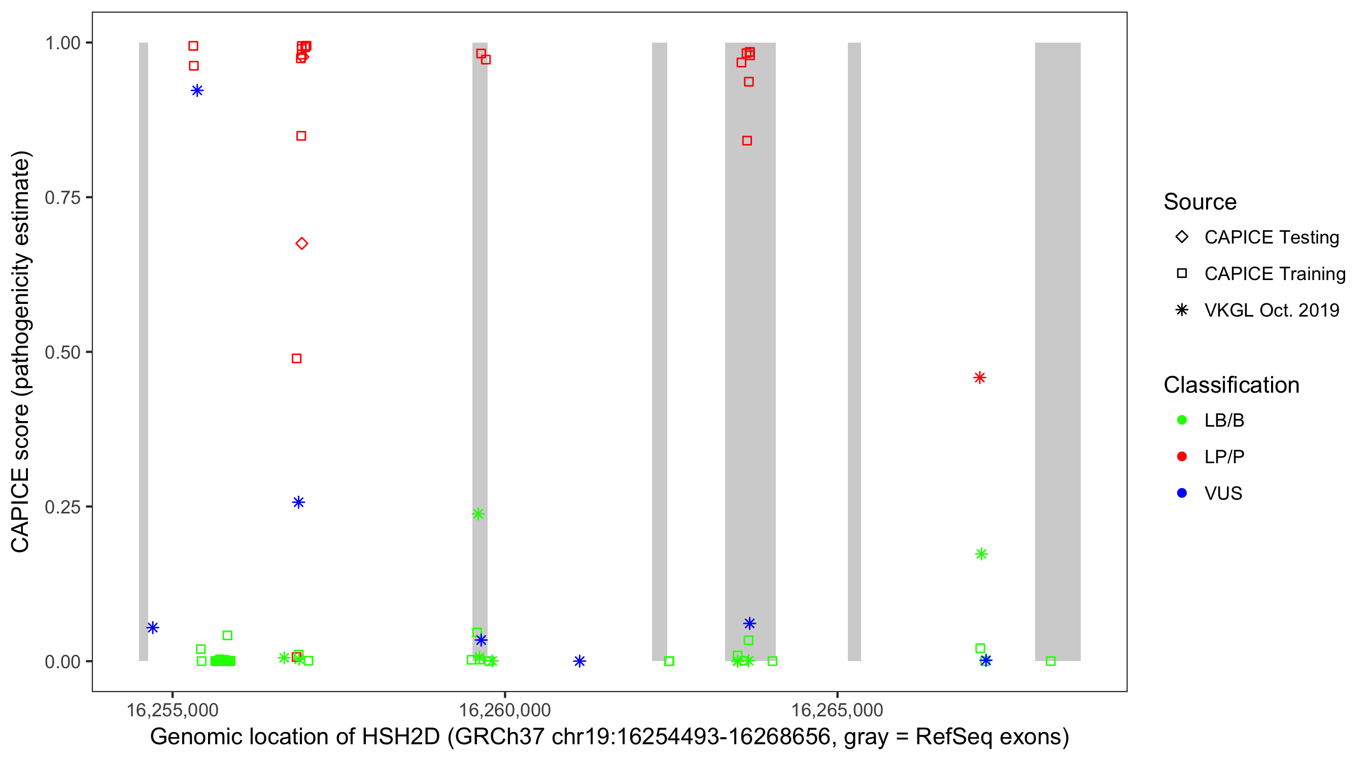 Shown are CAPICE train/test variants plus VKGL Oct 2019.