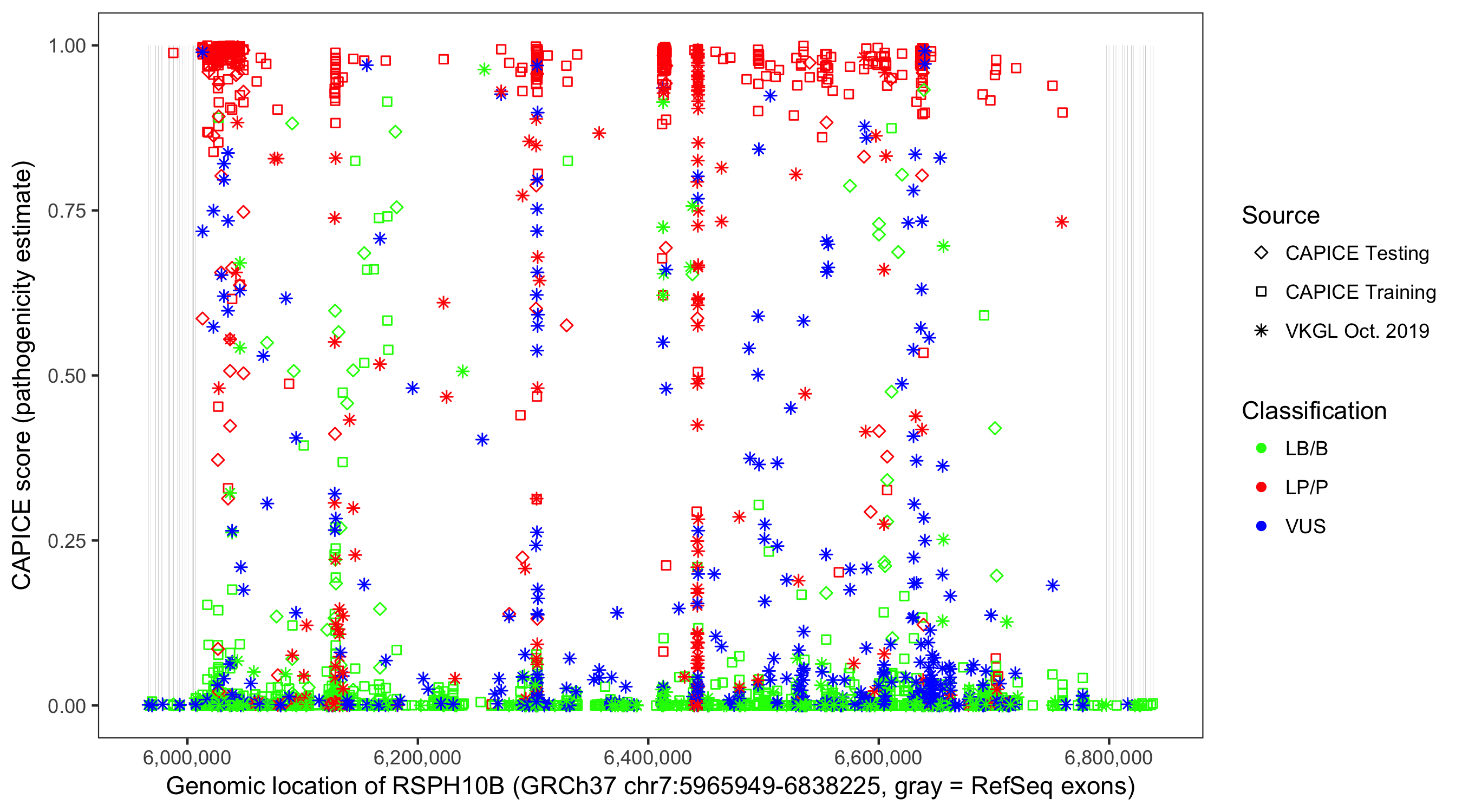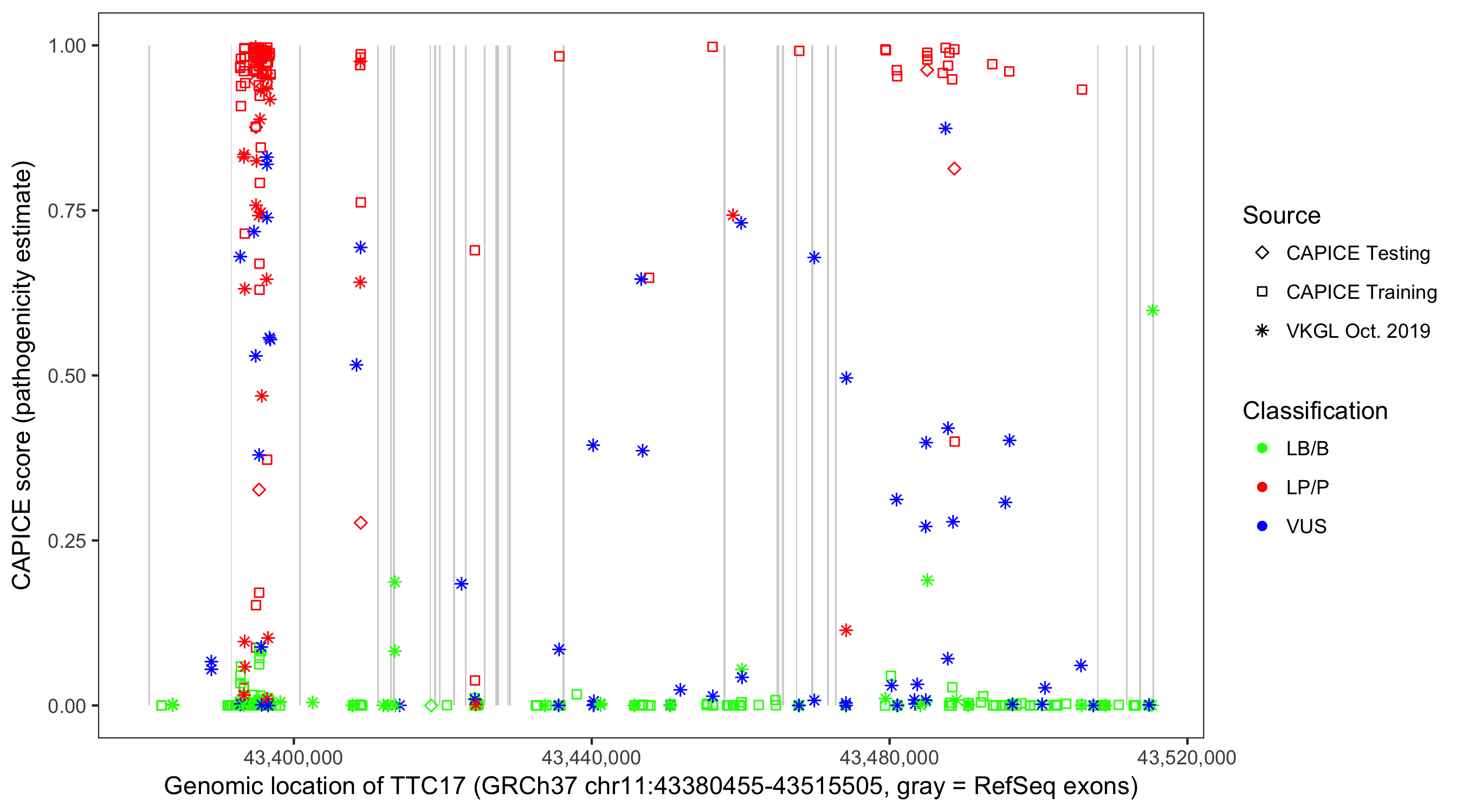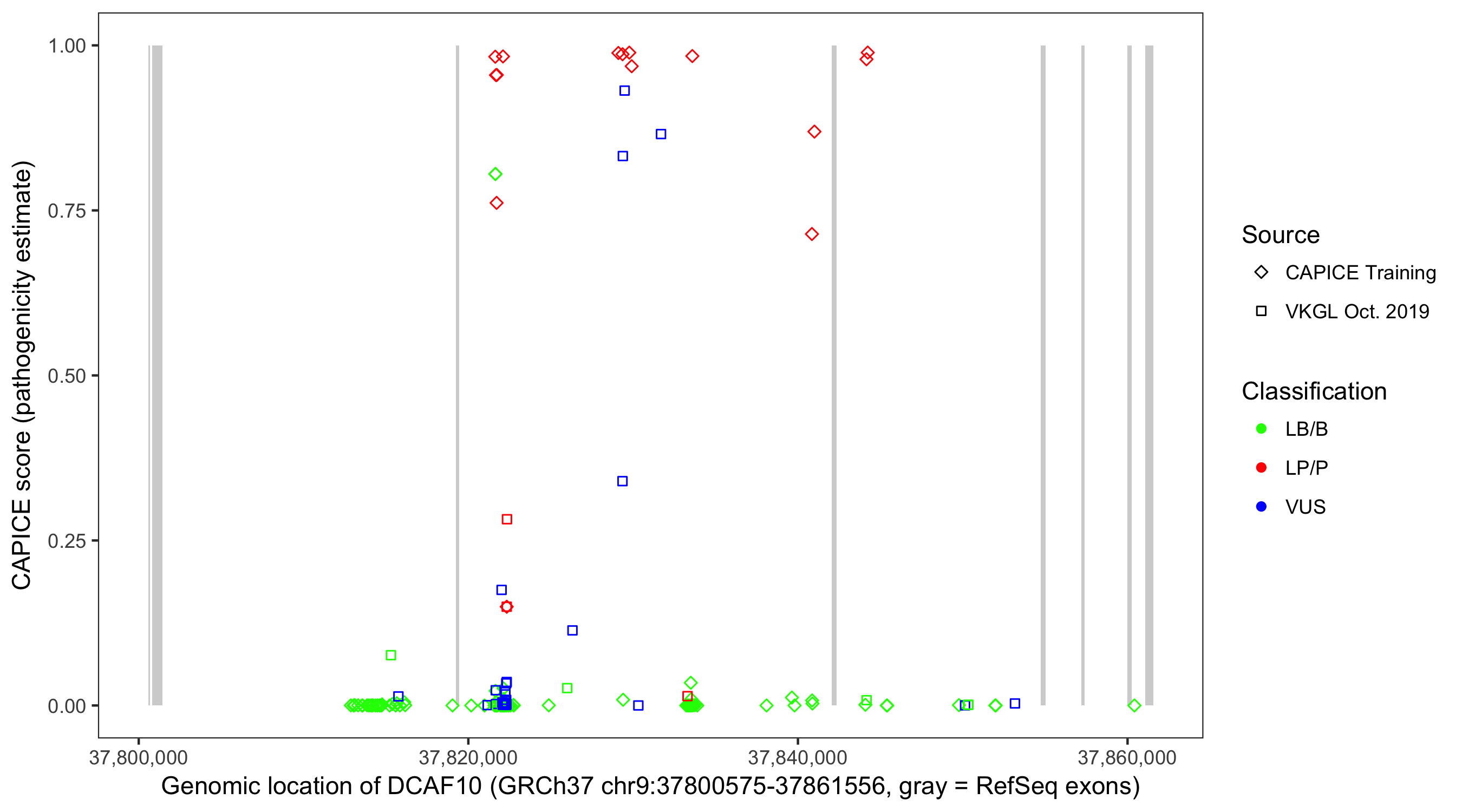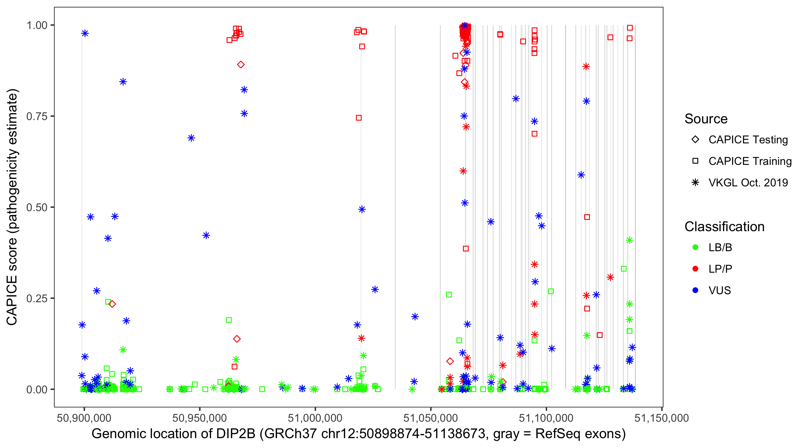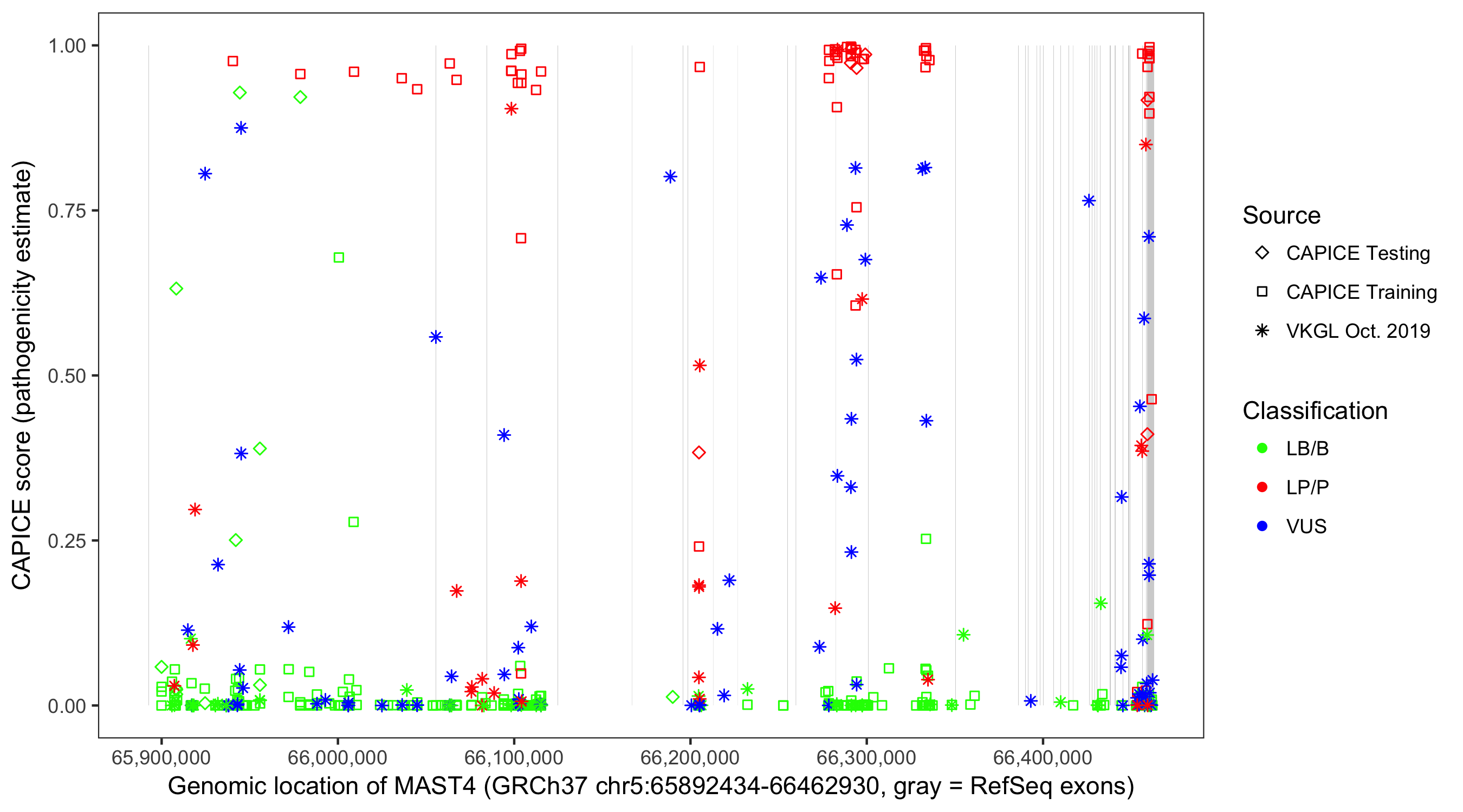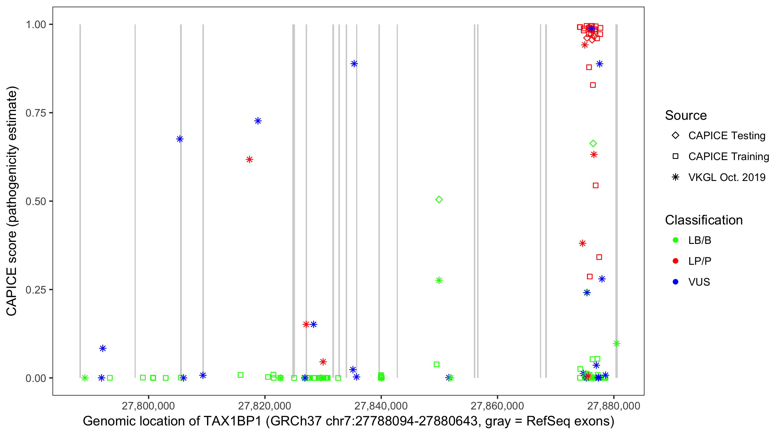 Shown are CAPICE train/test variants plus VKGL Oct 2019.