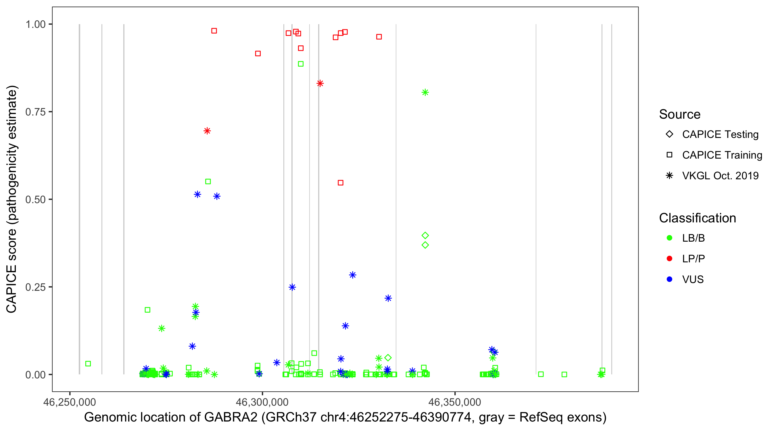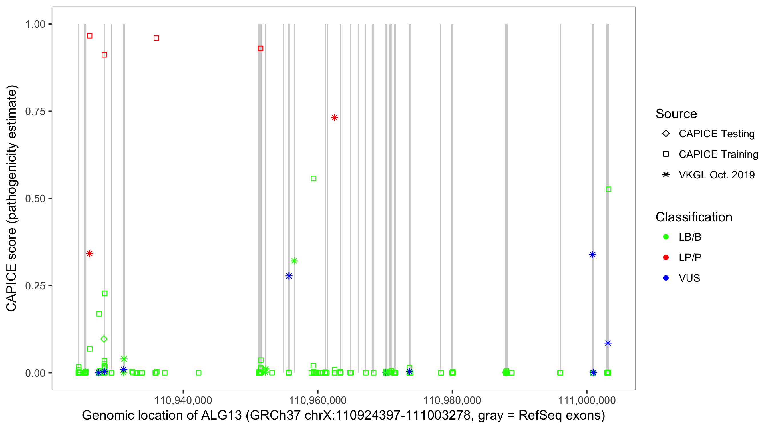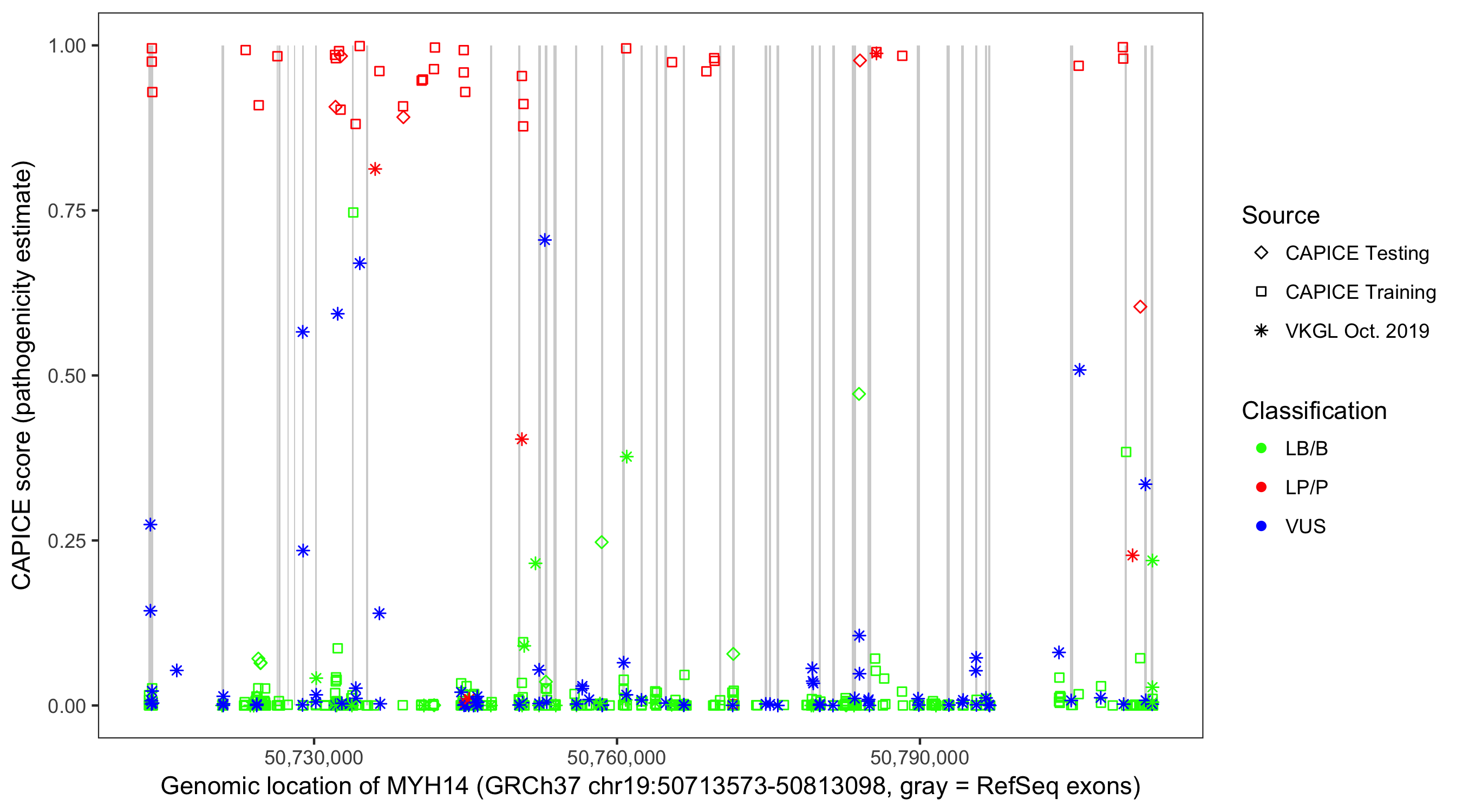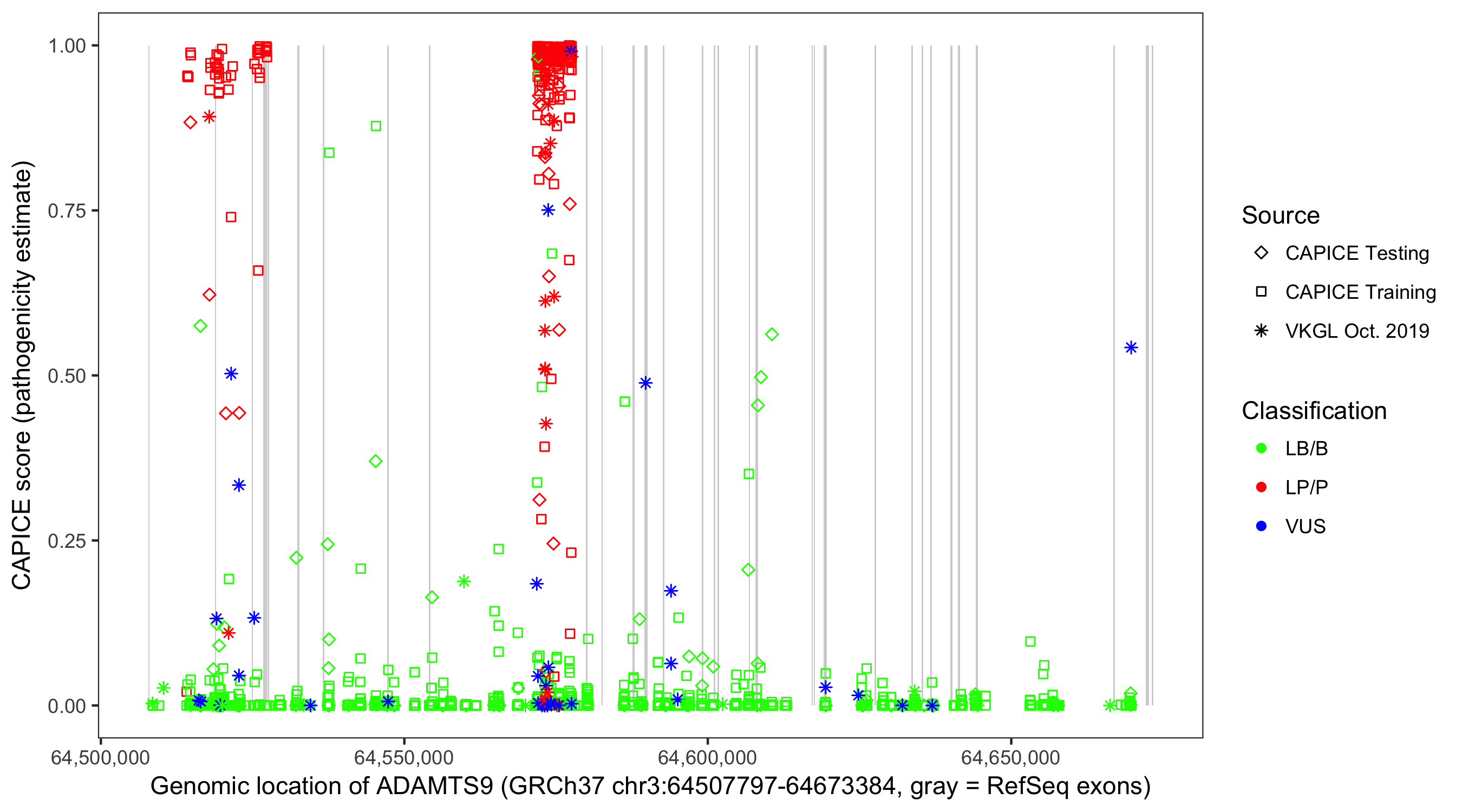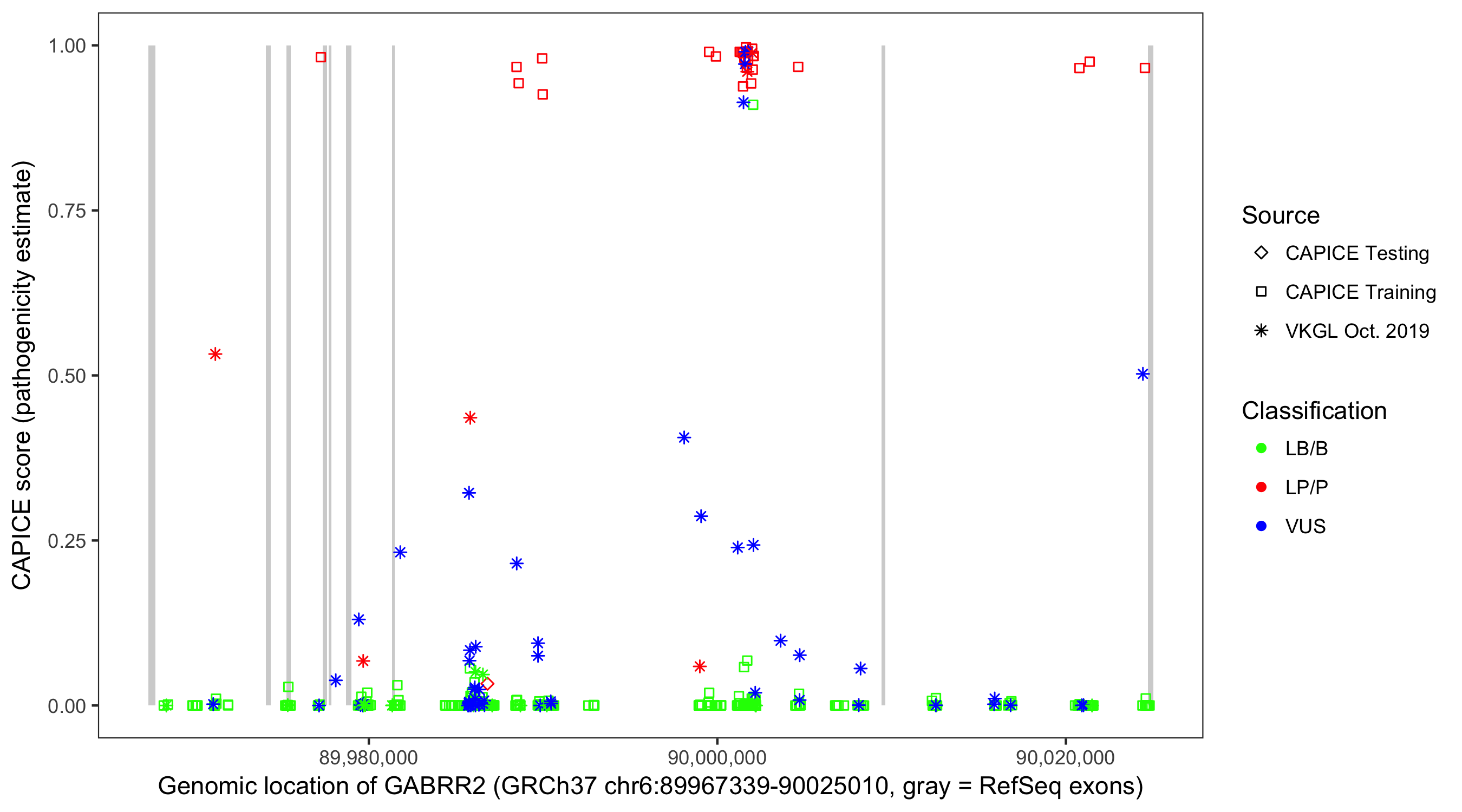 Shown are CAPICE train/test variants plus VKGL Oct 2019.