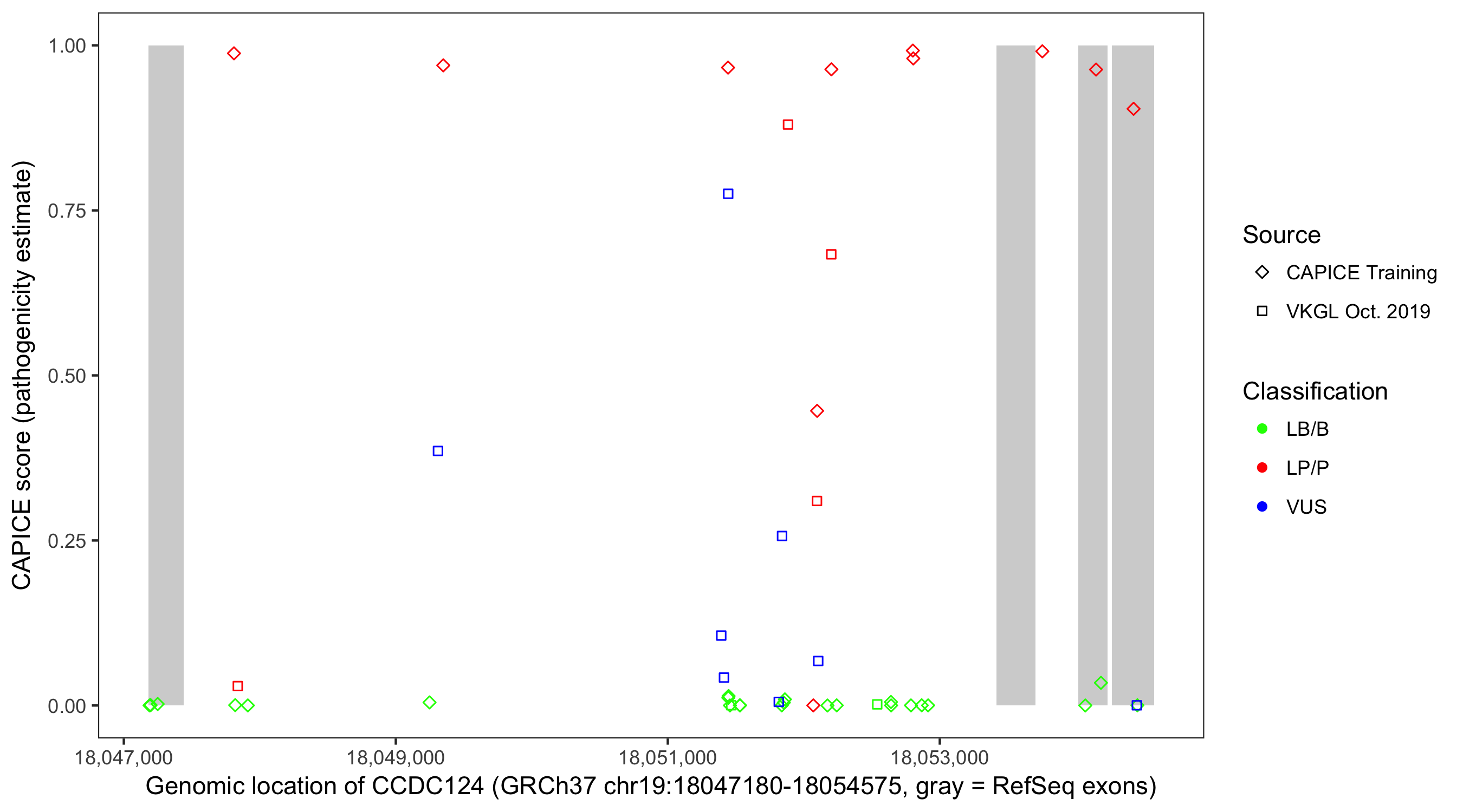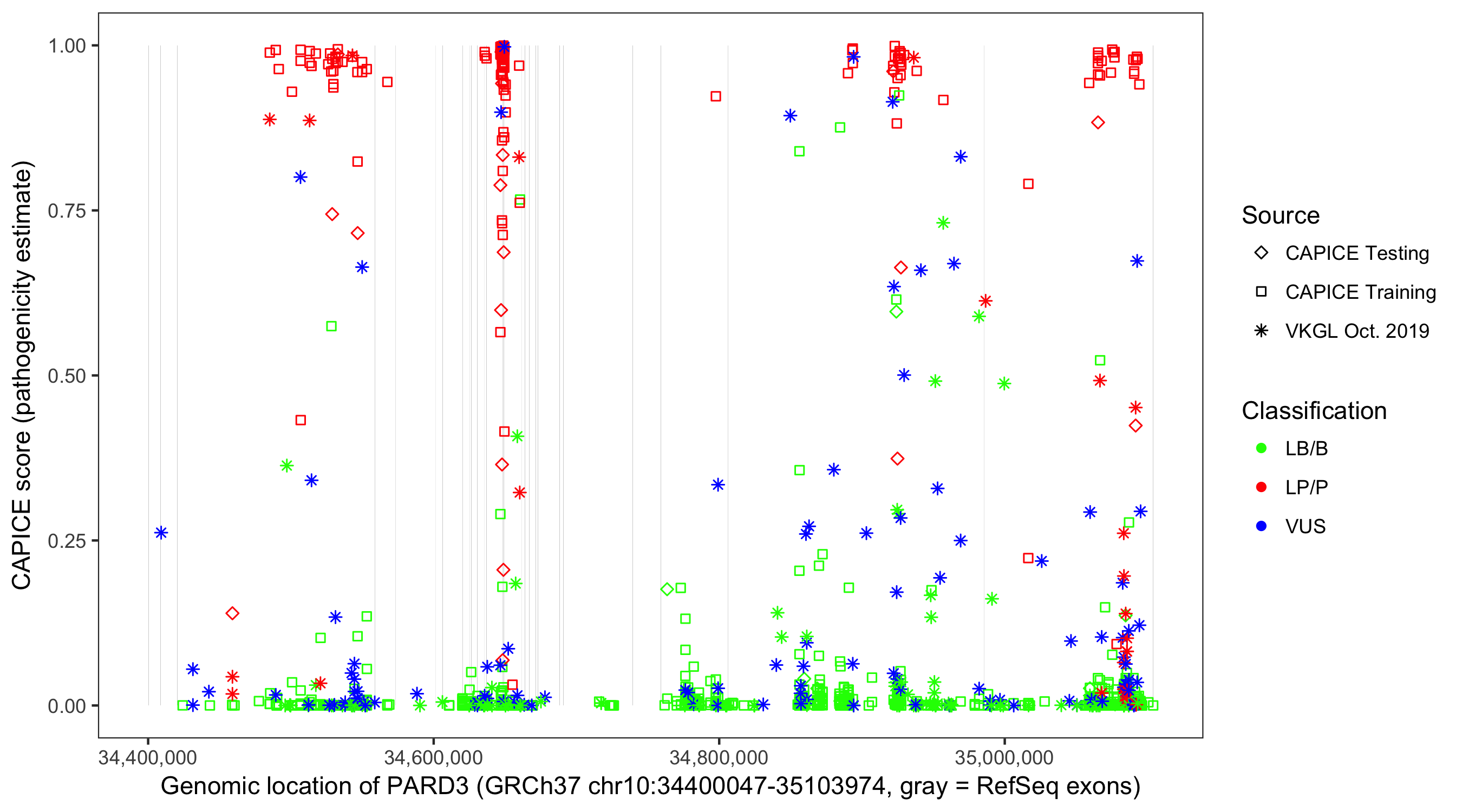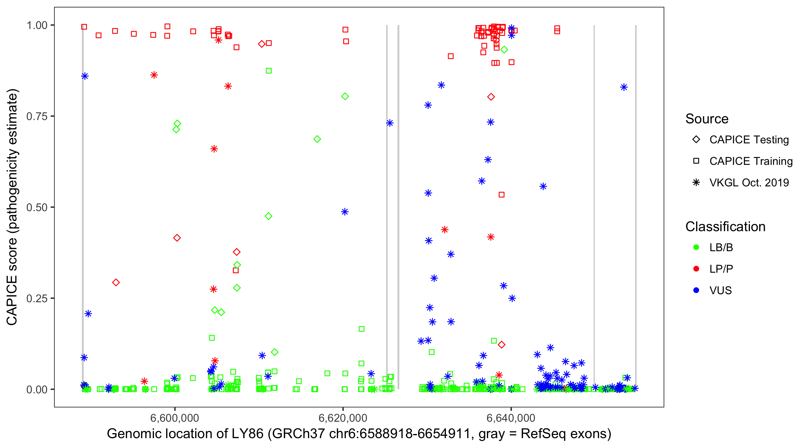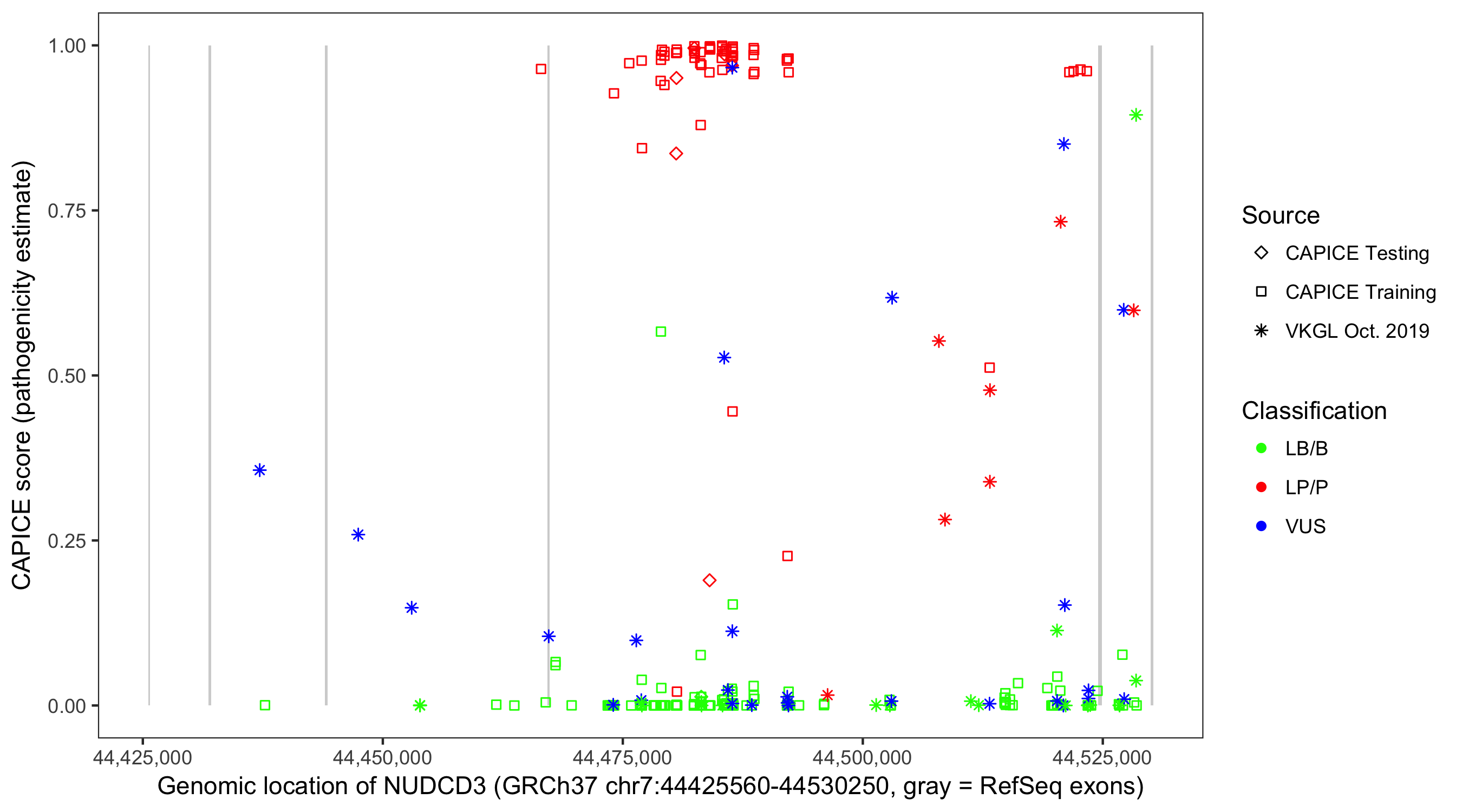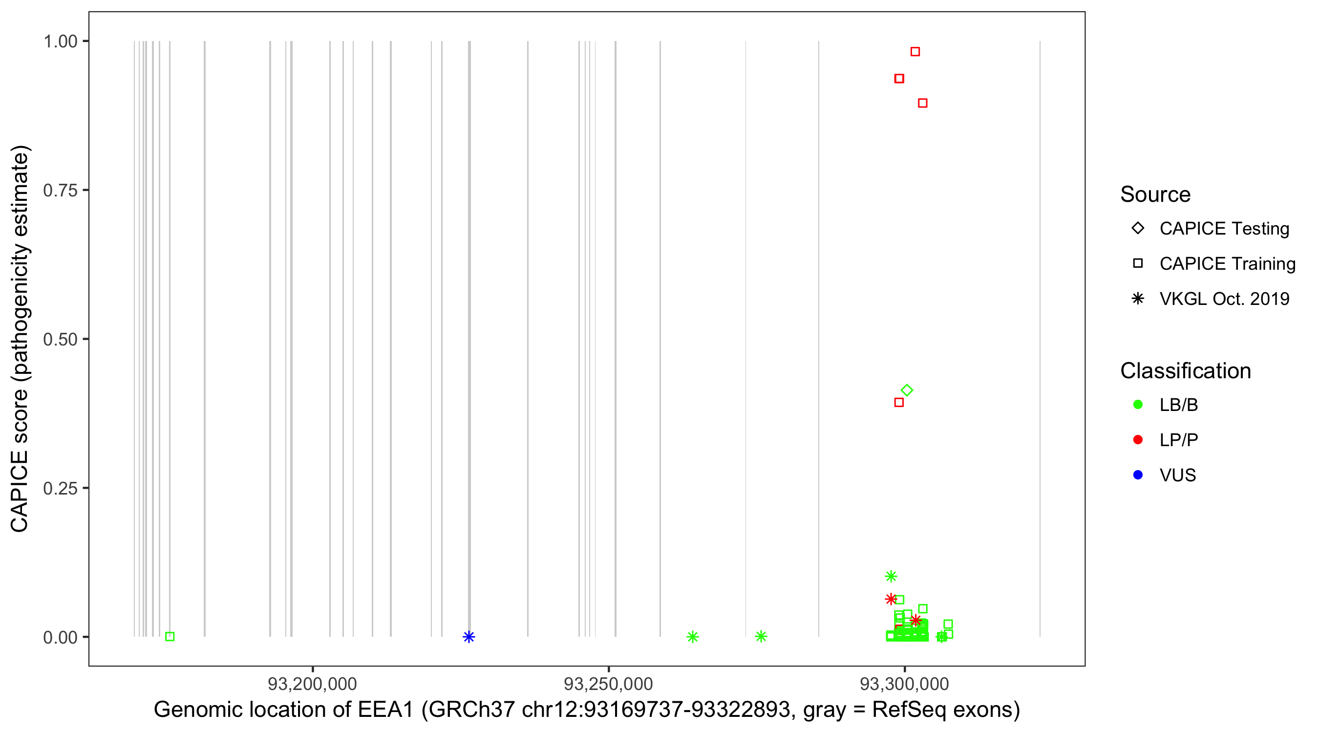 Shown are CAPICE train/test variants plus VKGL Oct 2019.