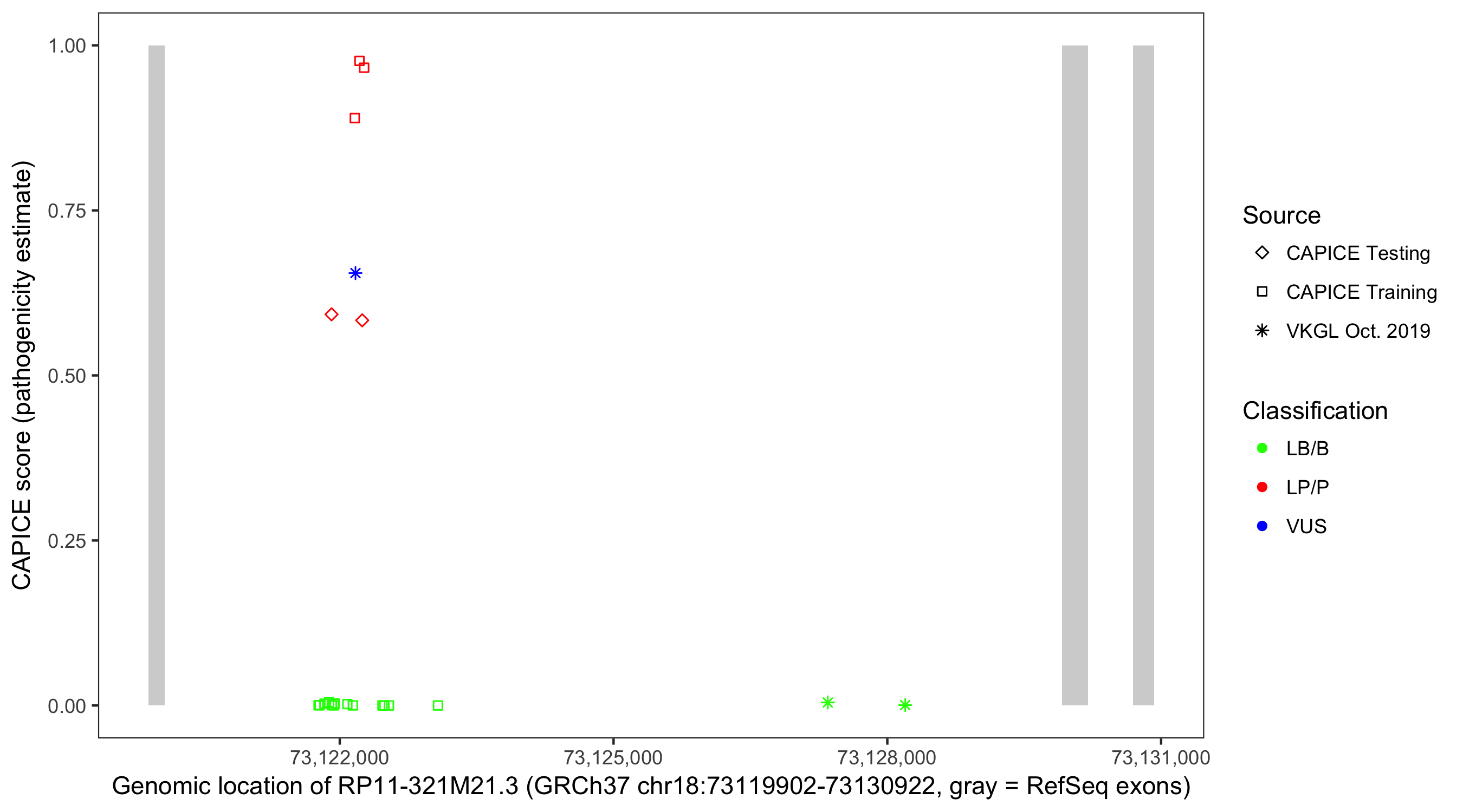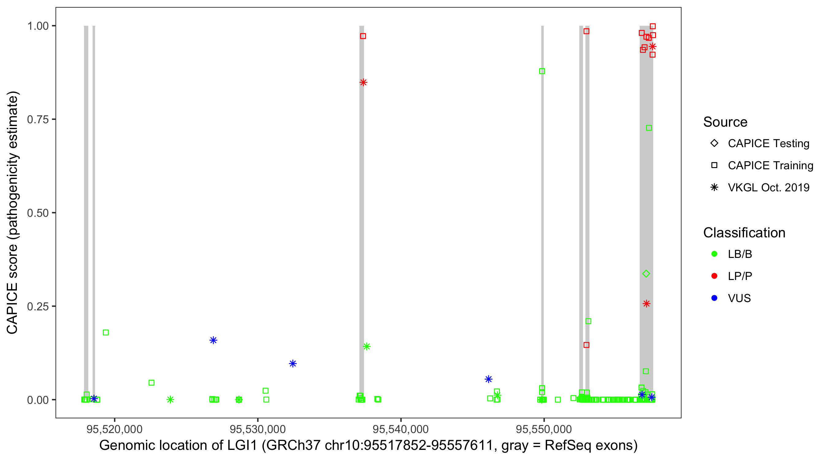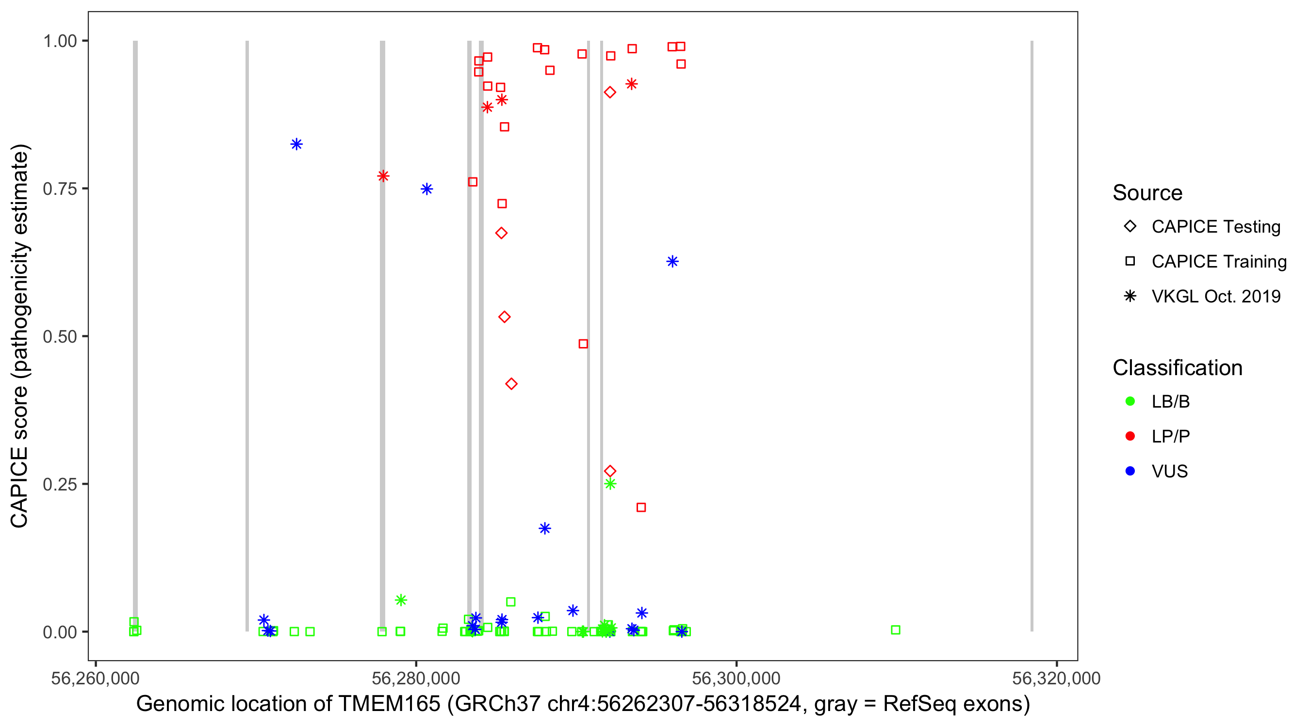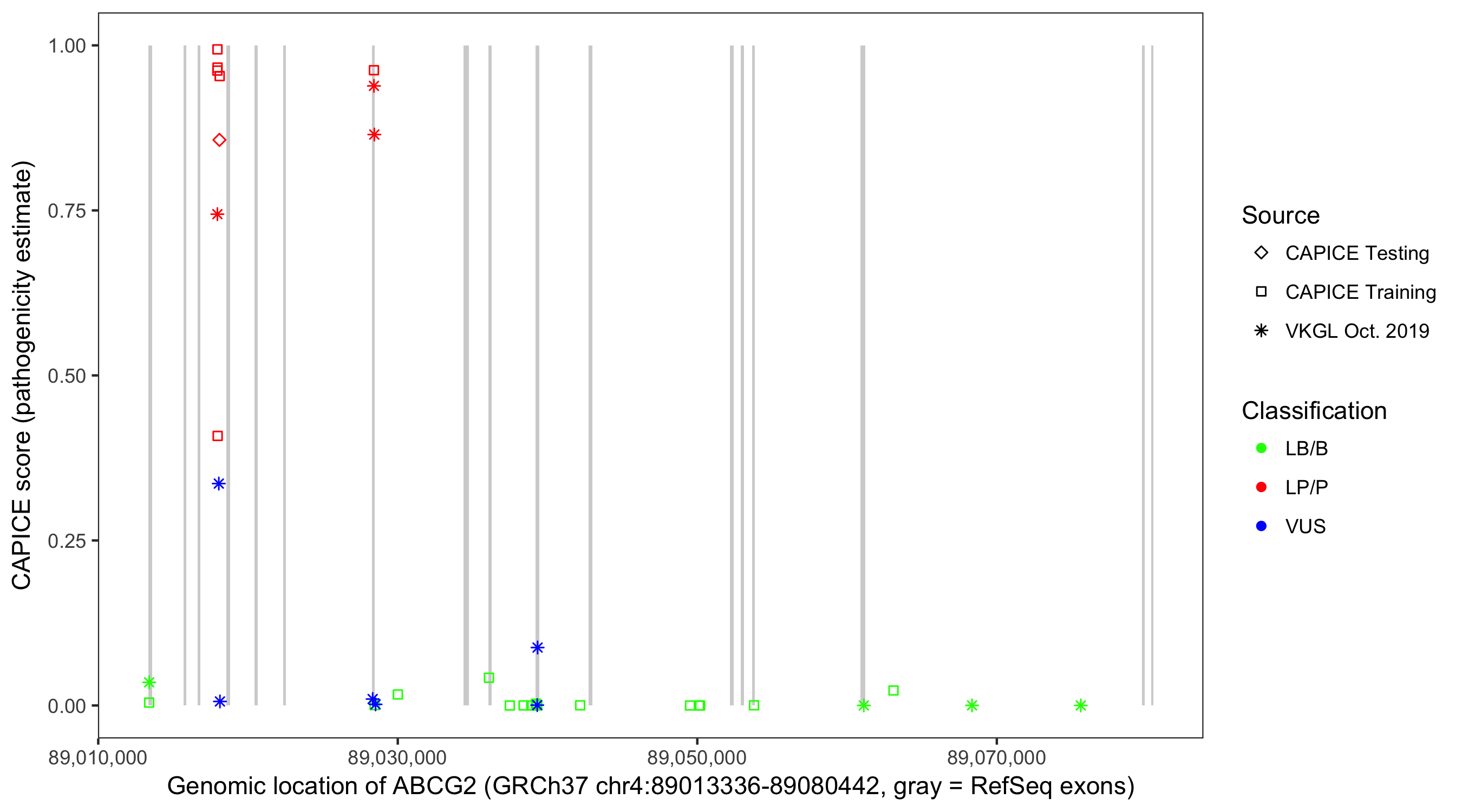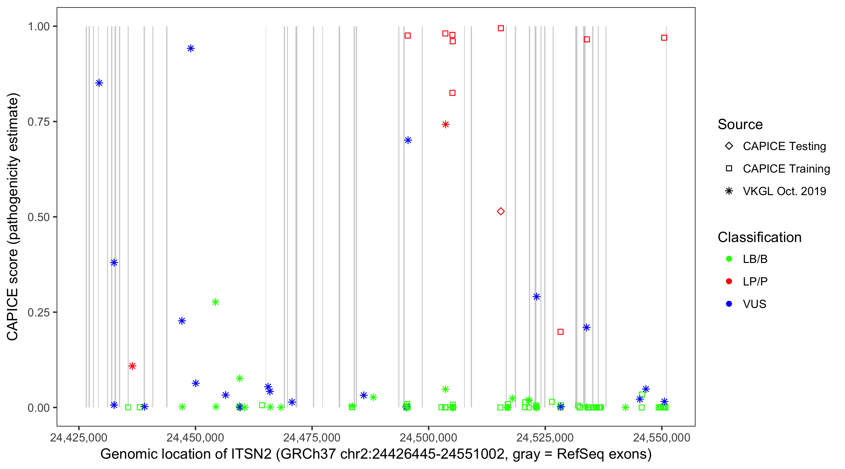 Shown are CAPICE train/test variants plus VKGL Oct 2019.