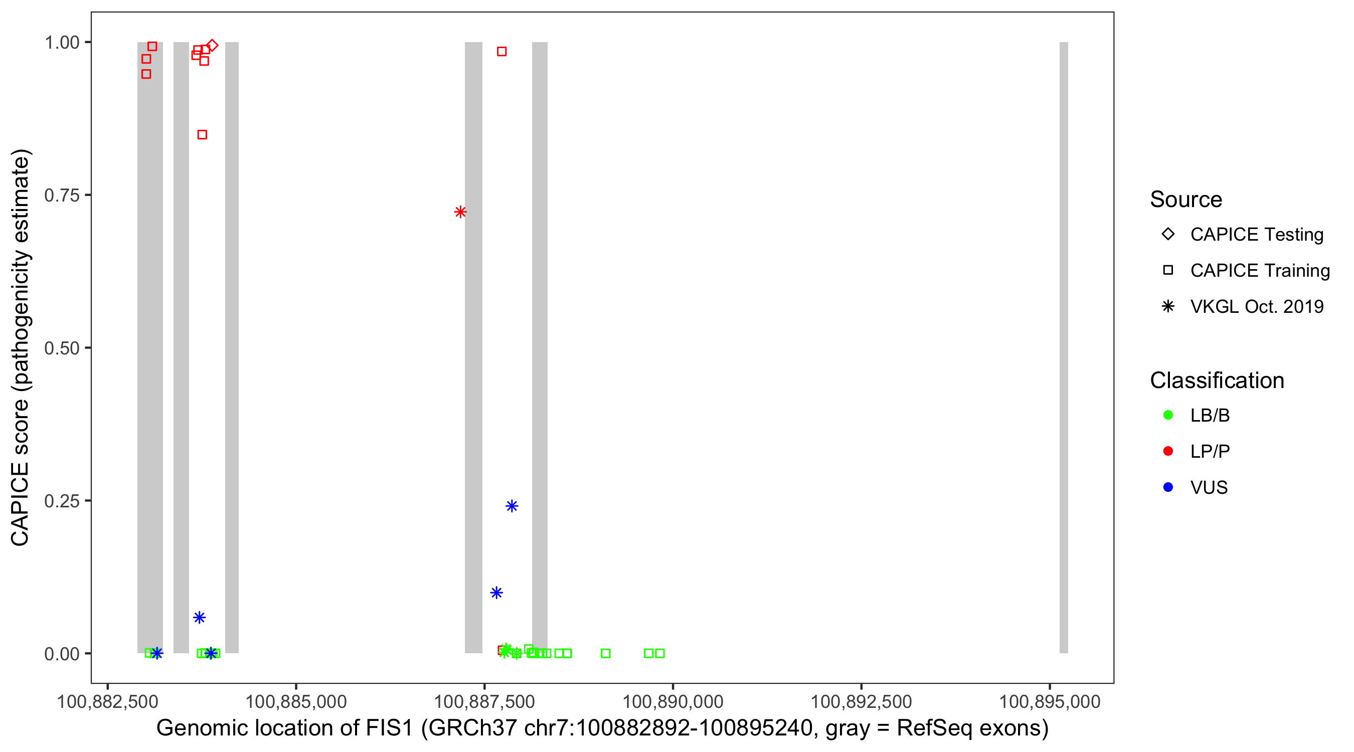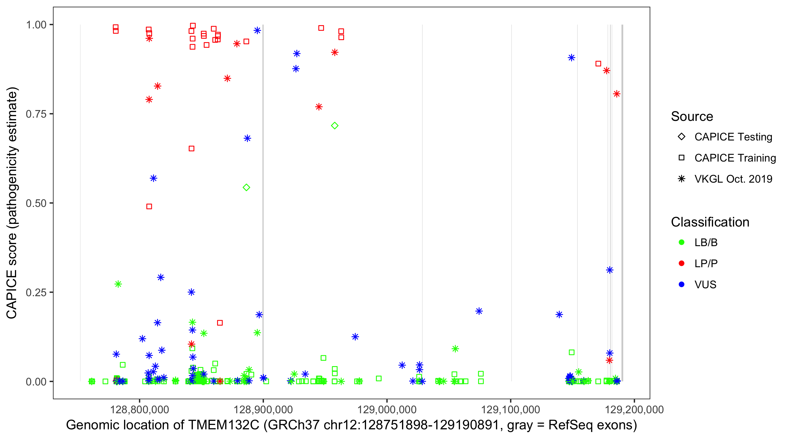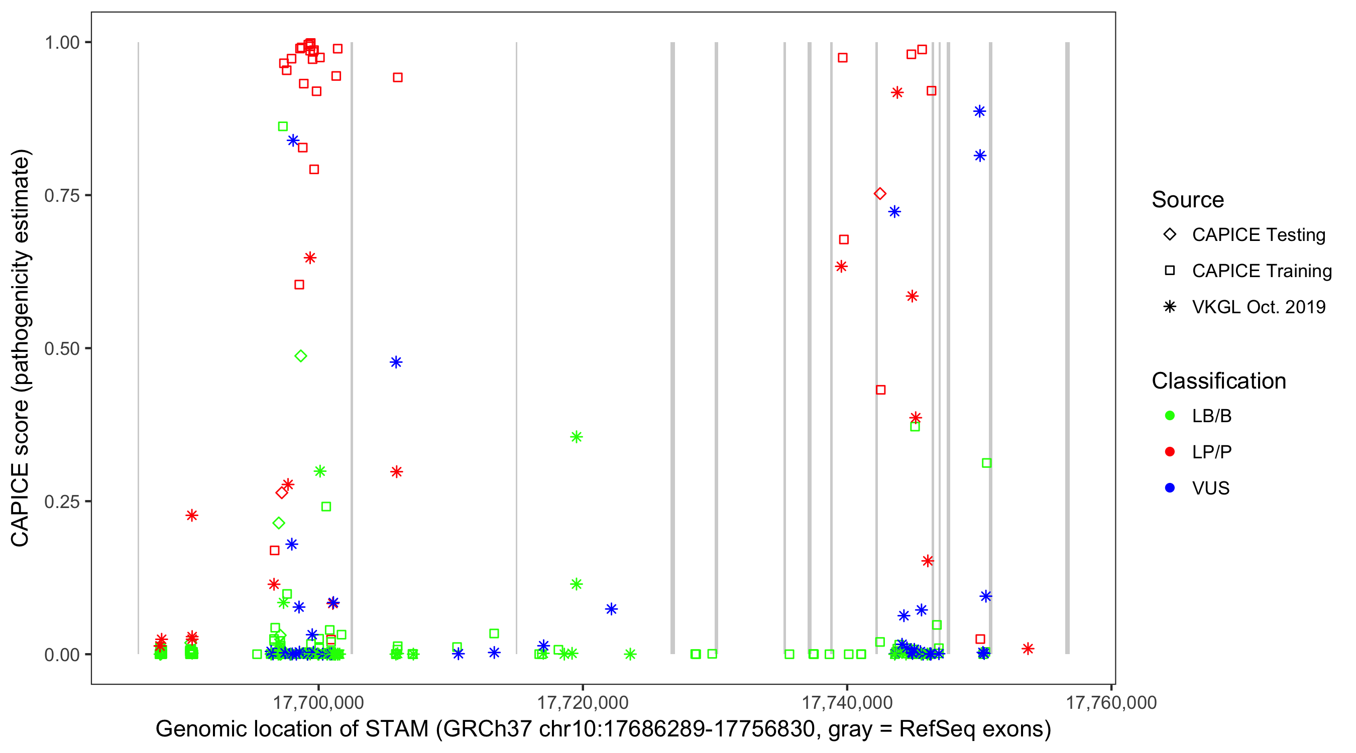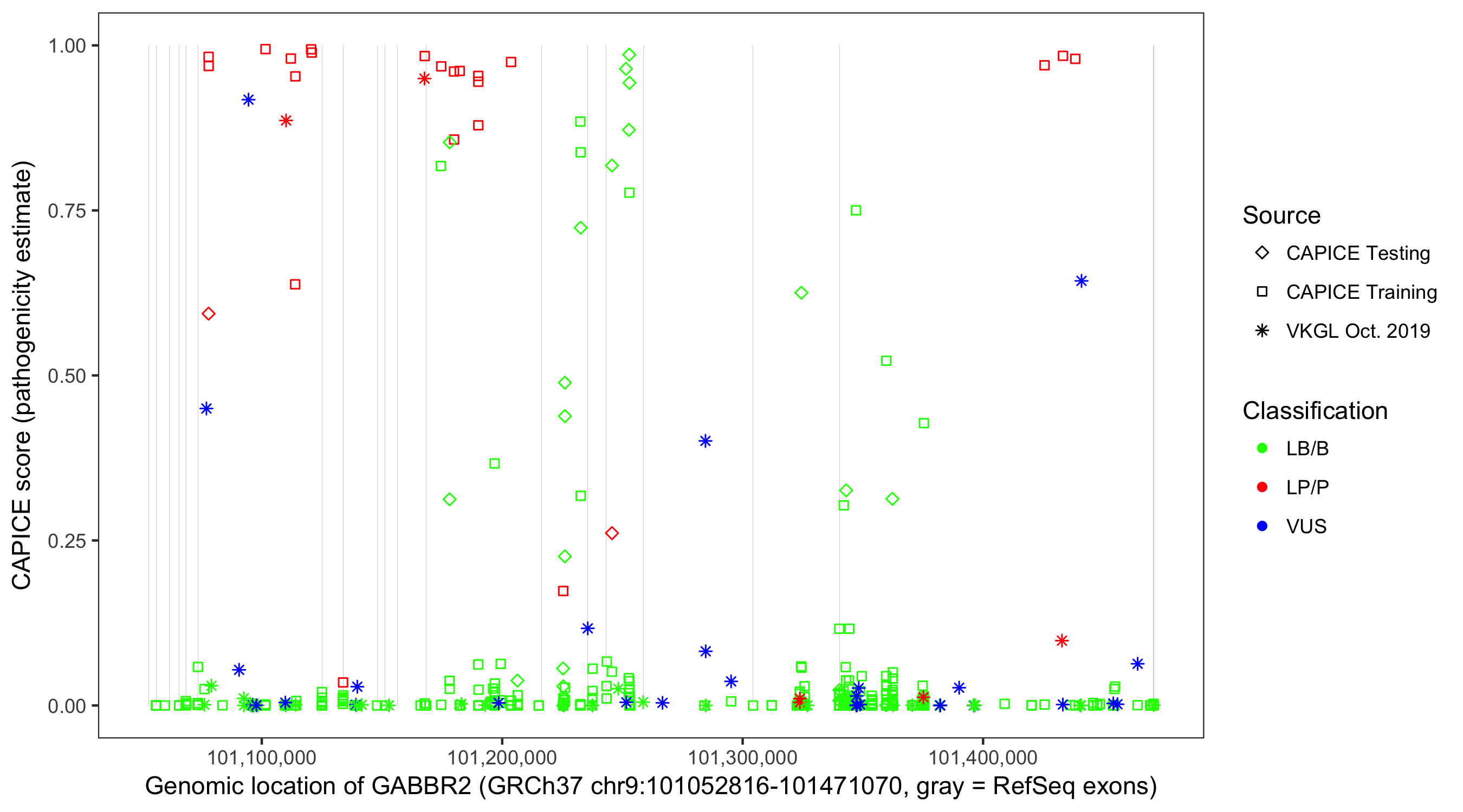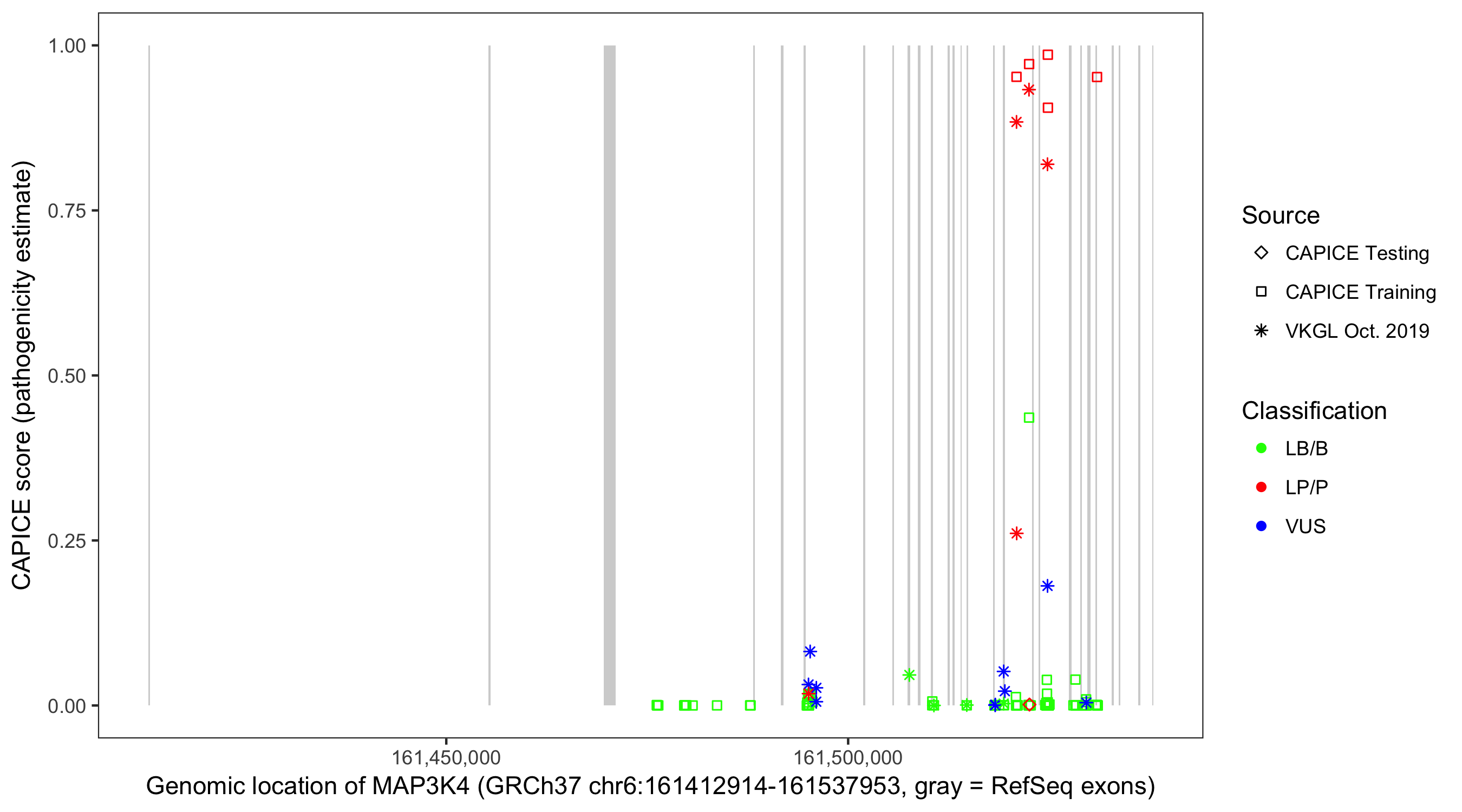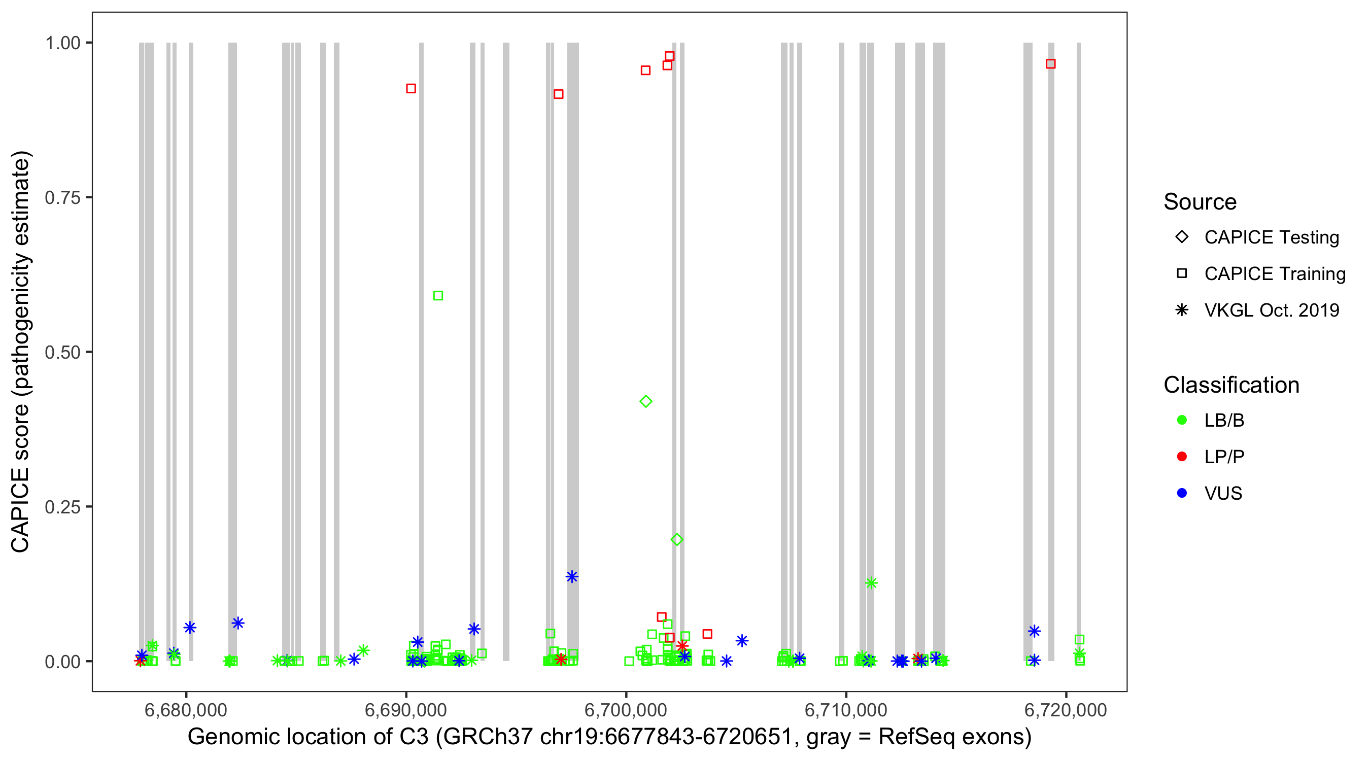 Shown are CAPICE train/test variants plus VKGL Oct 2019.