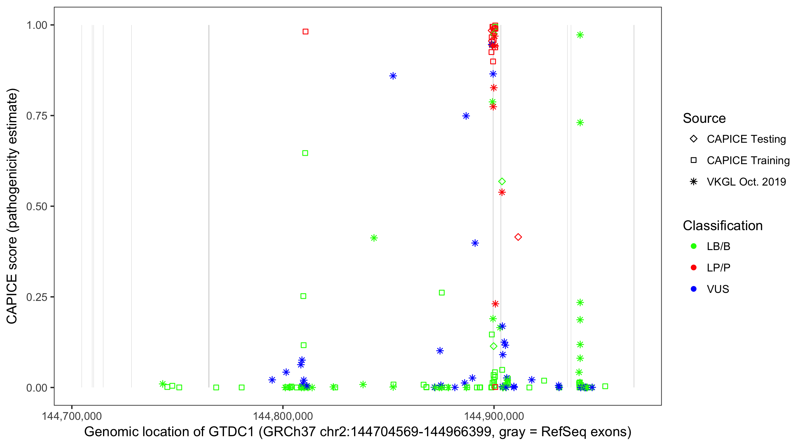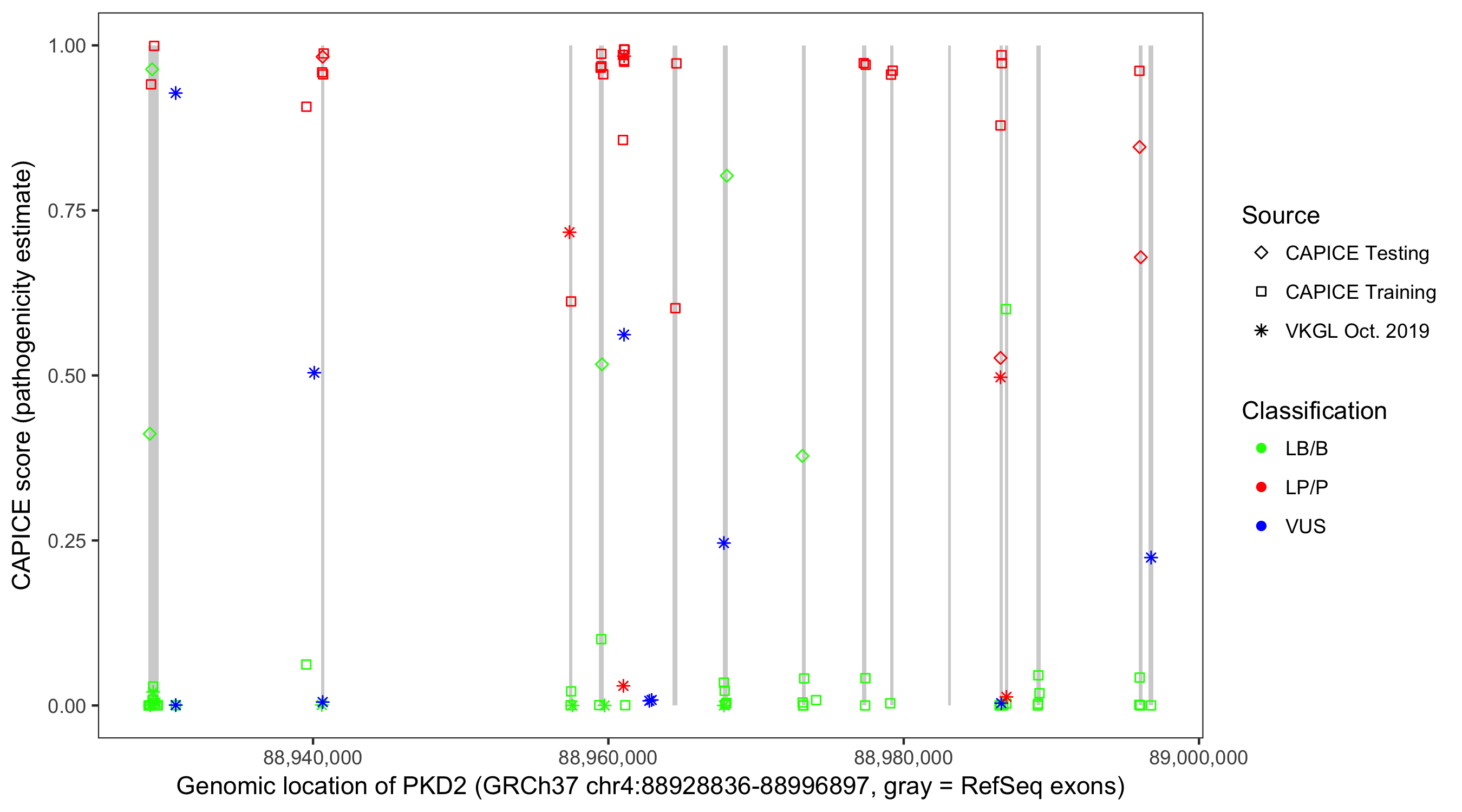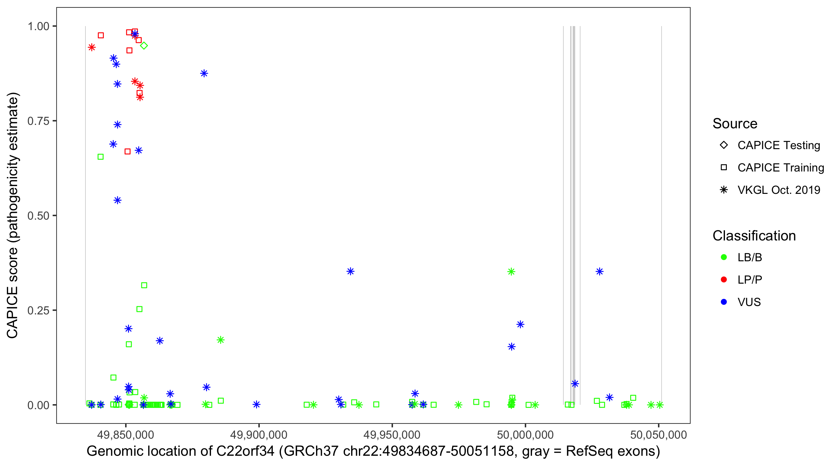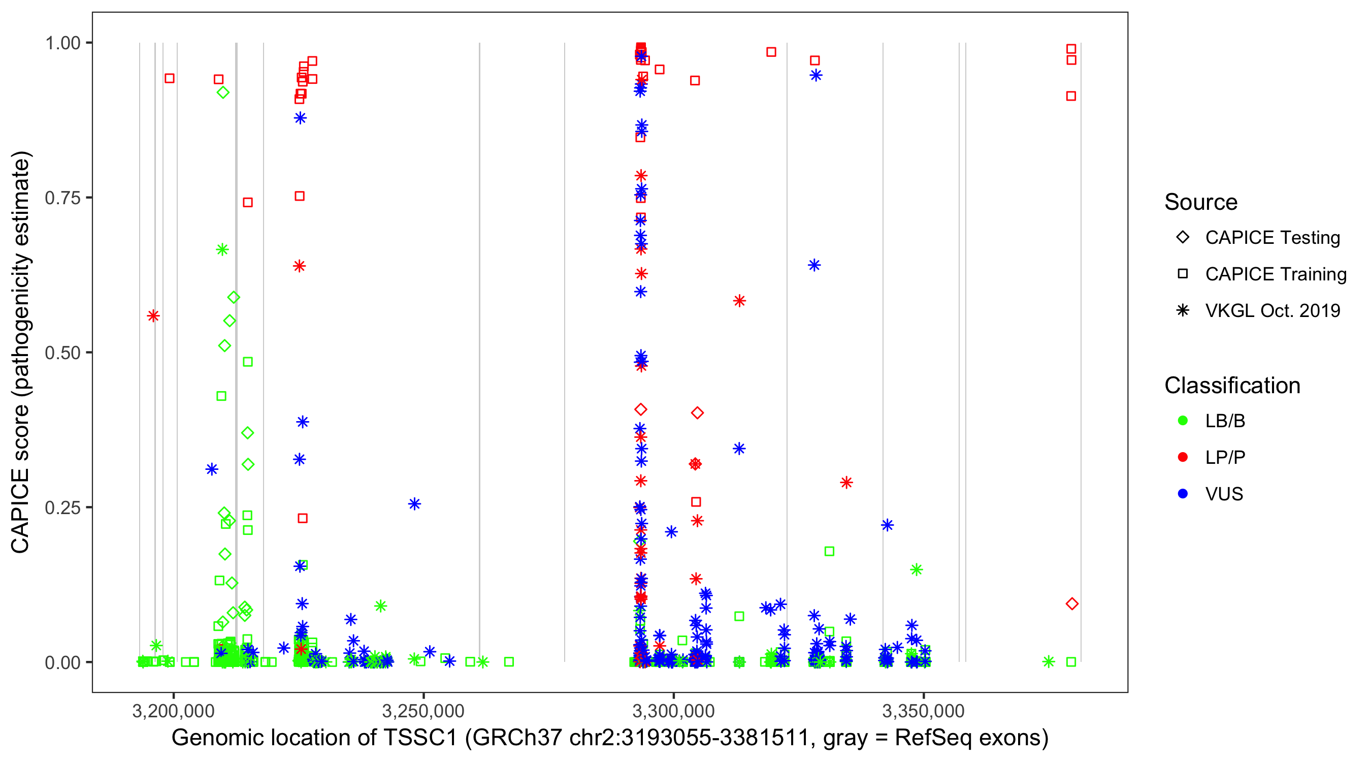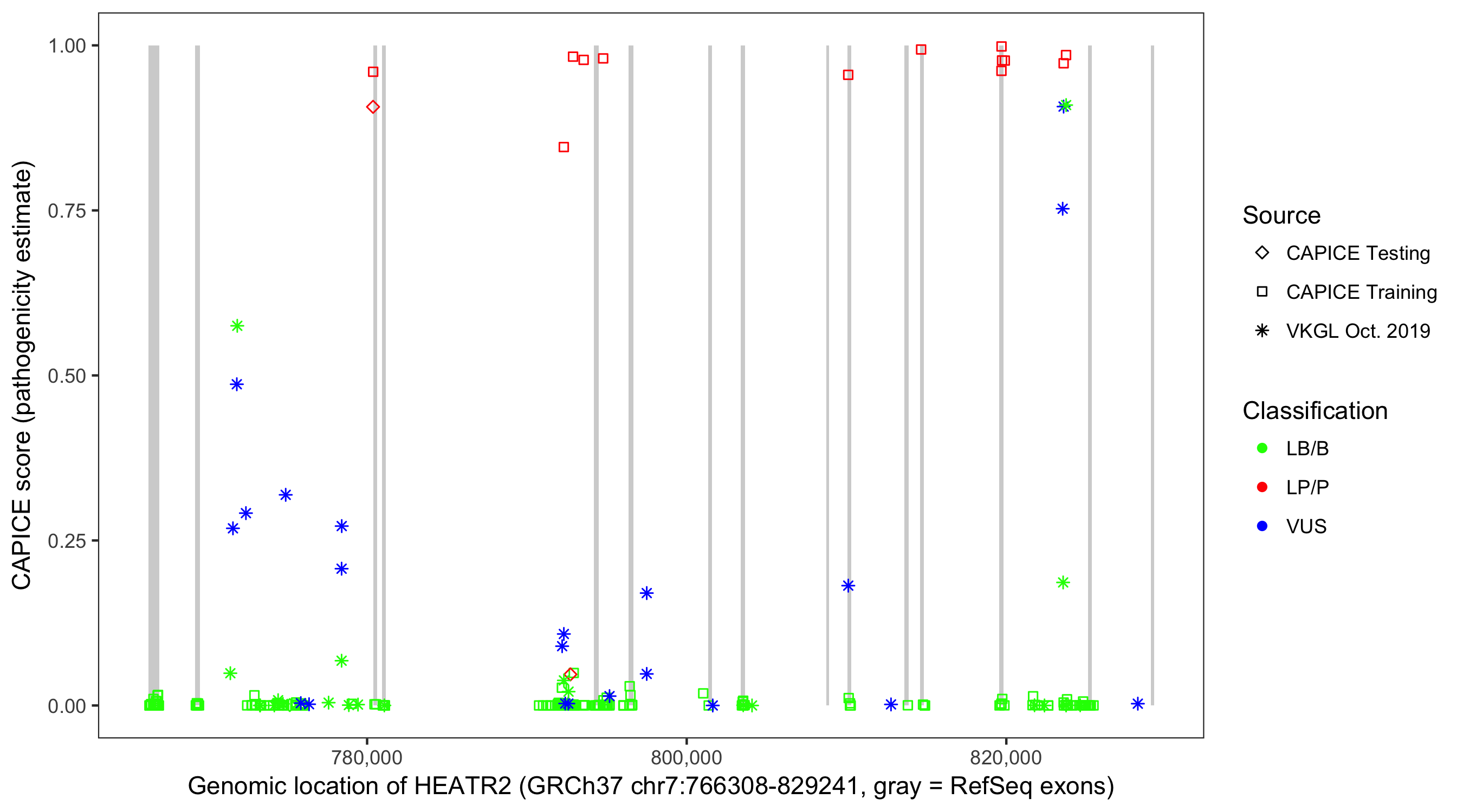Shown are CAPICE train/test variants plus VKGL Oct 2019.
