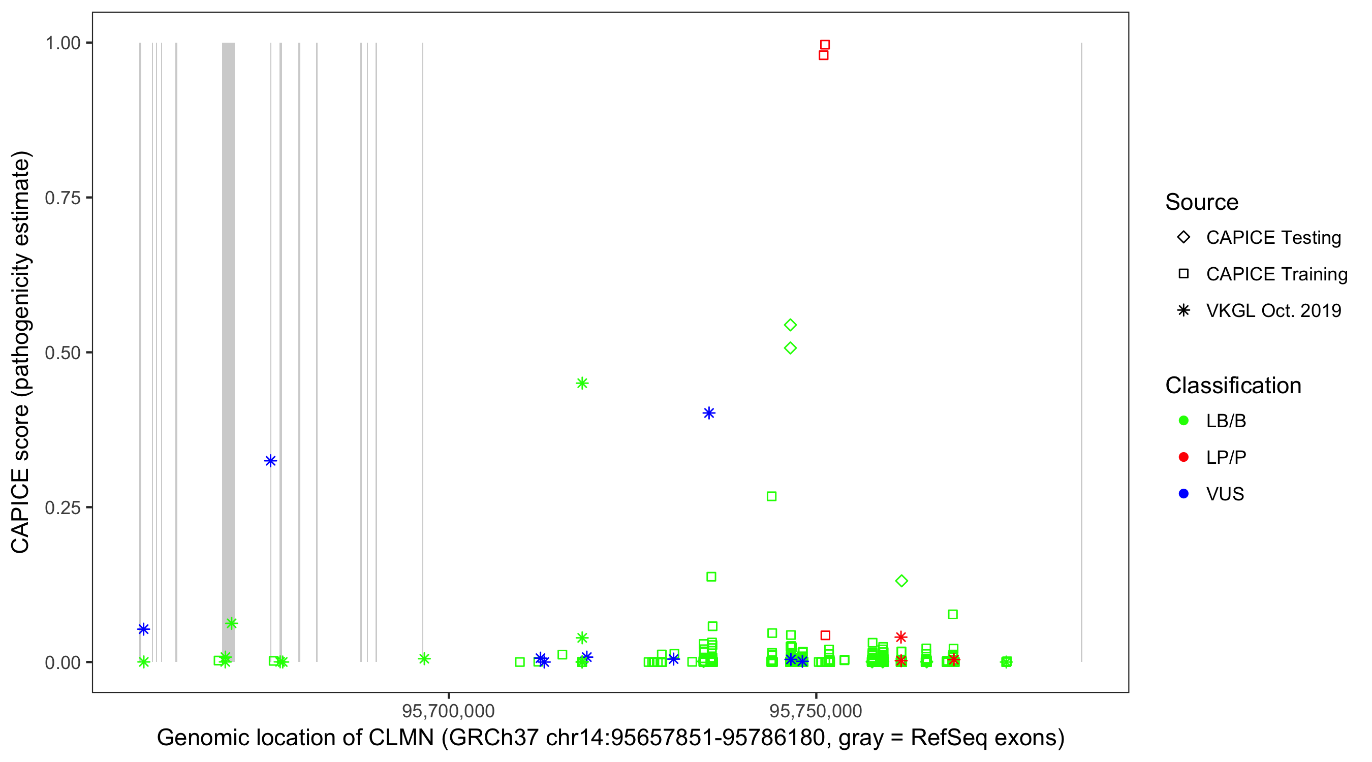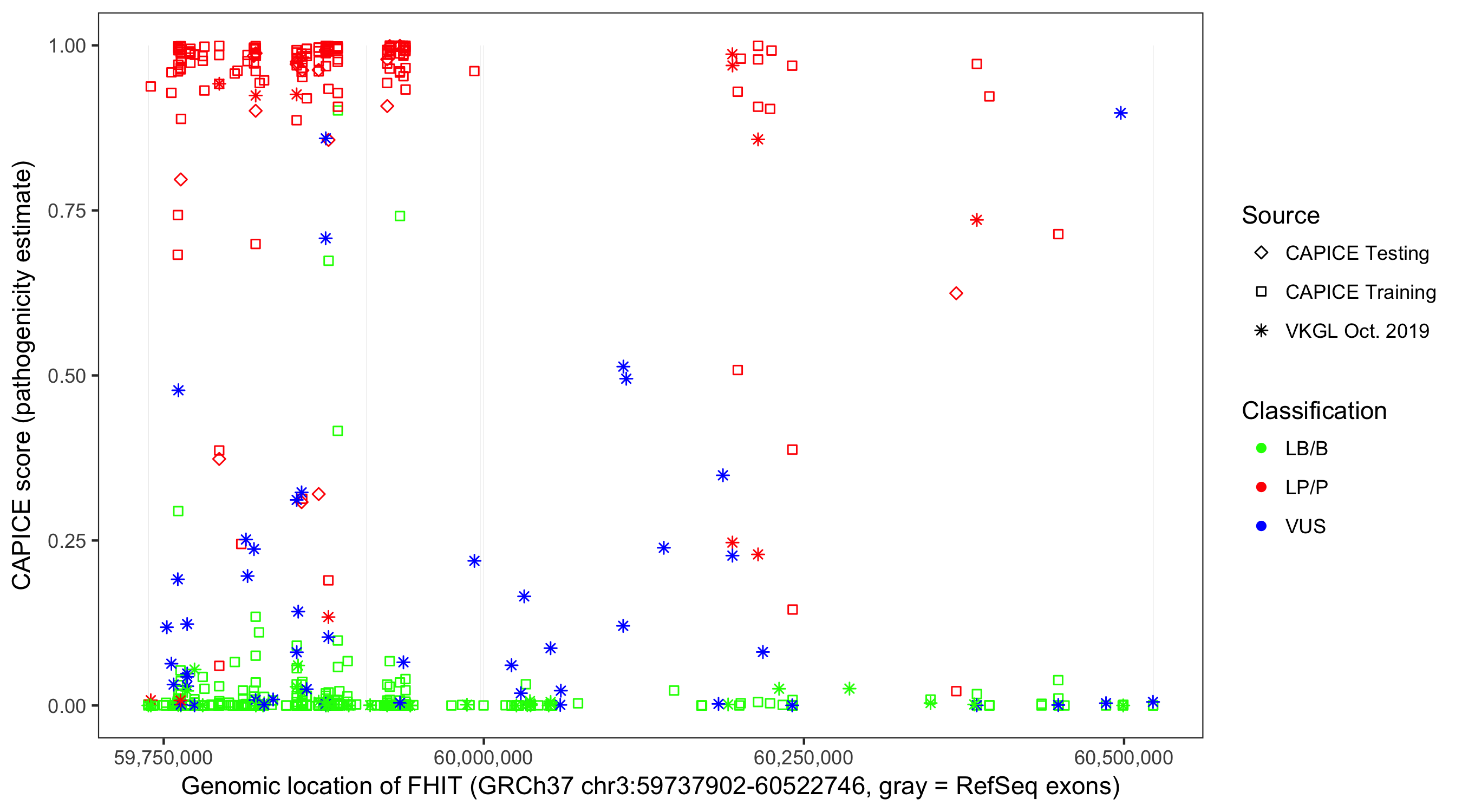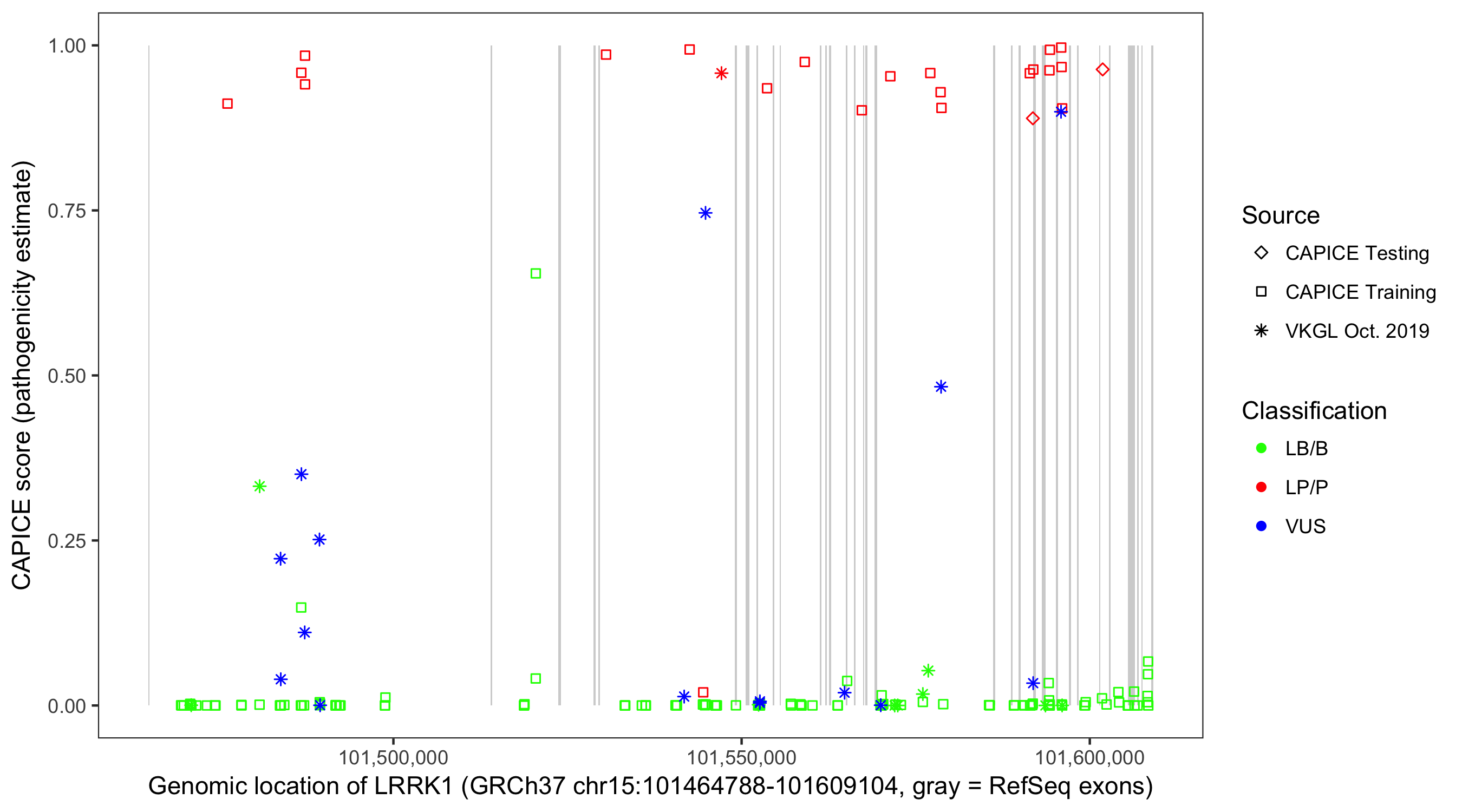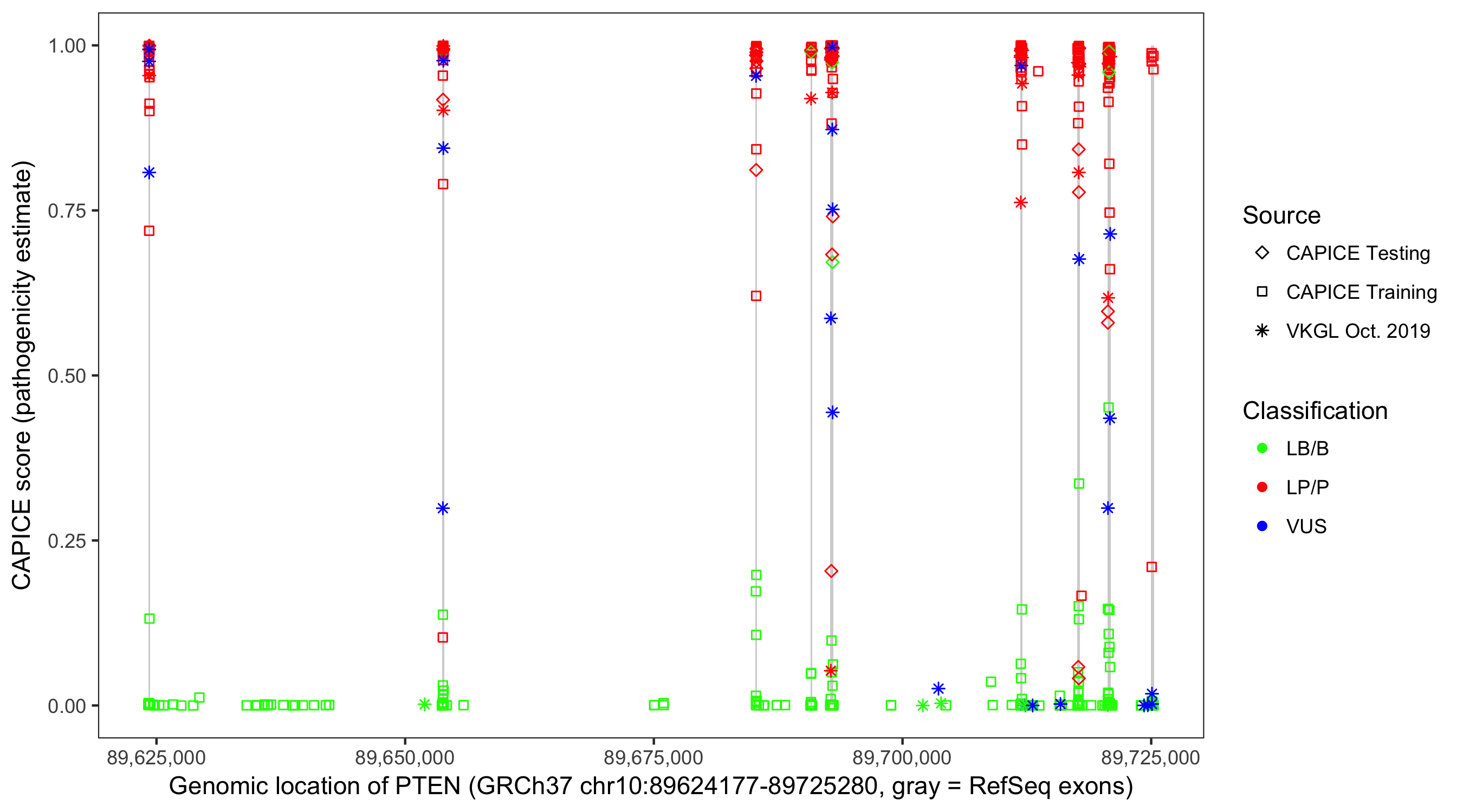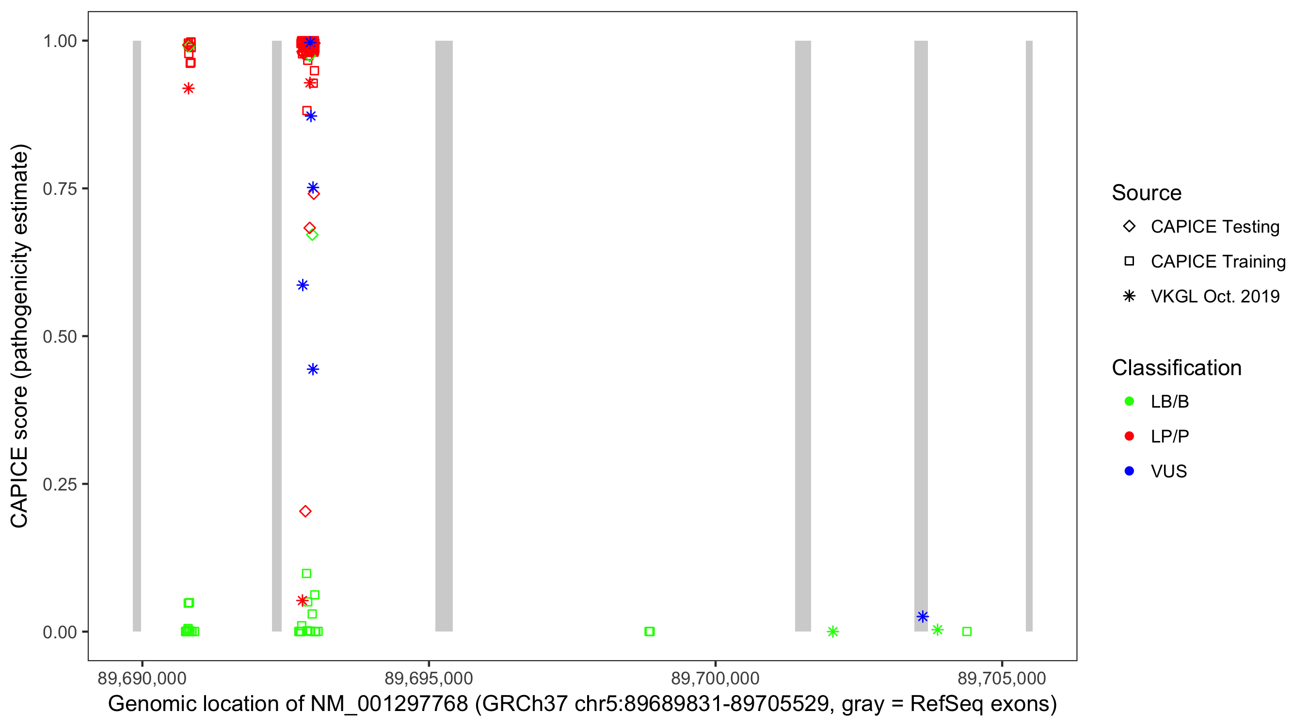 Shown are CAPICE train/test variants plus VKGL Oct 2019.