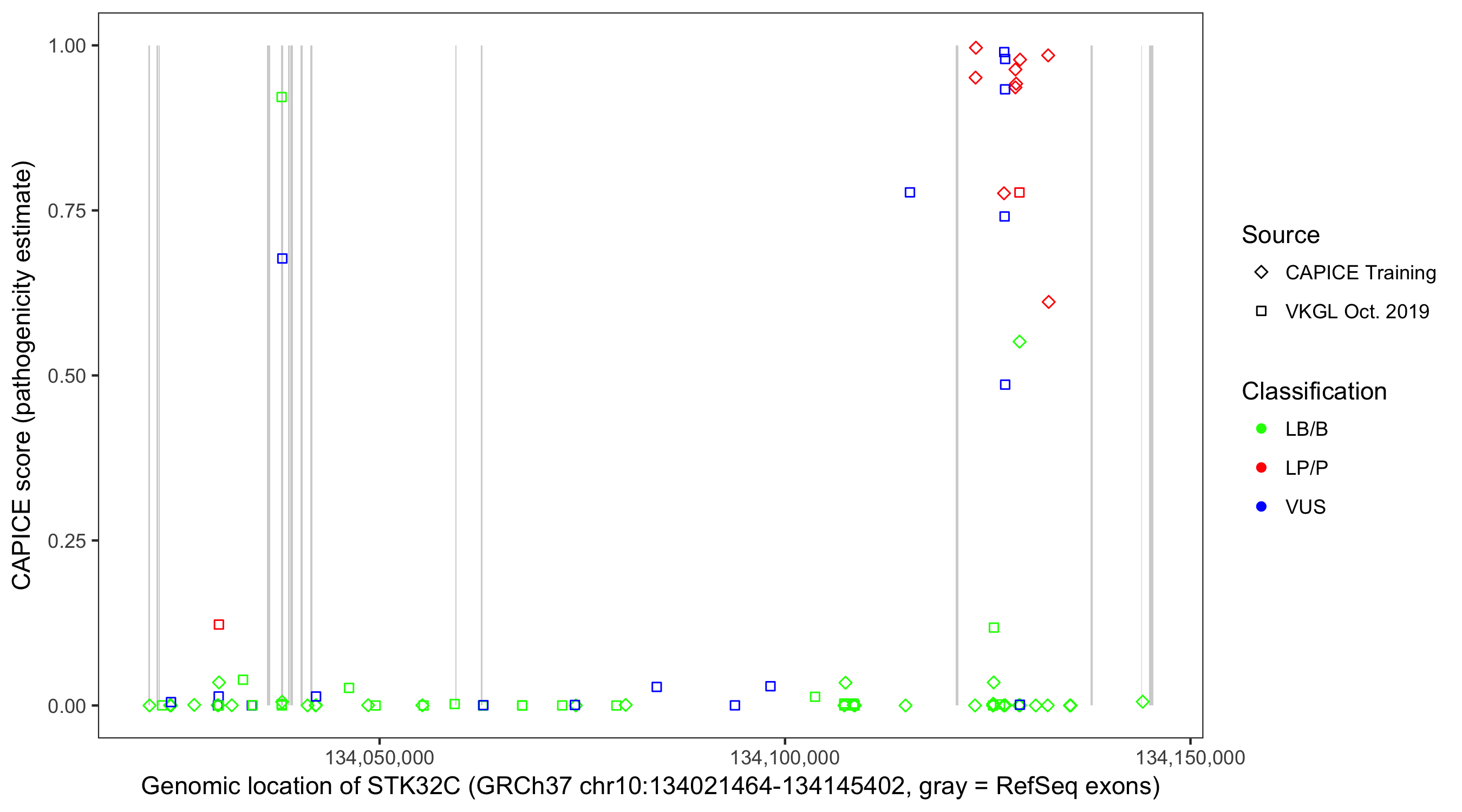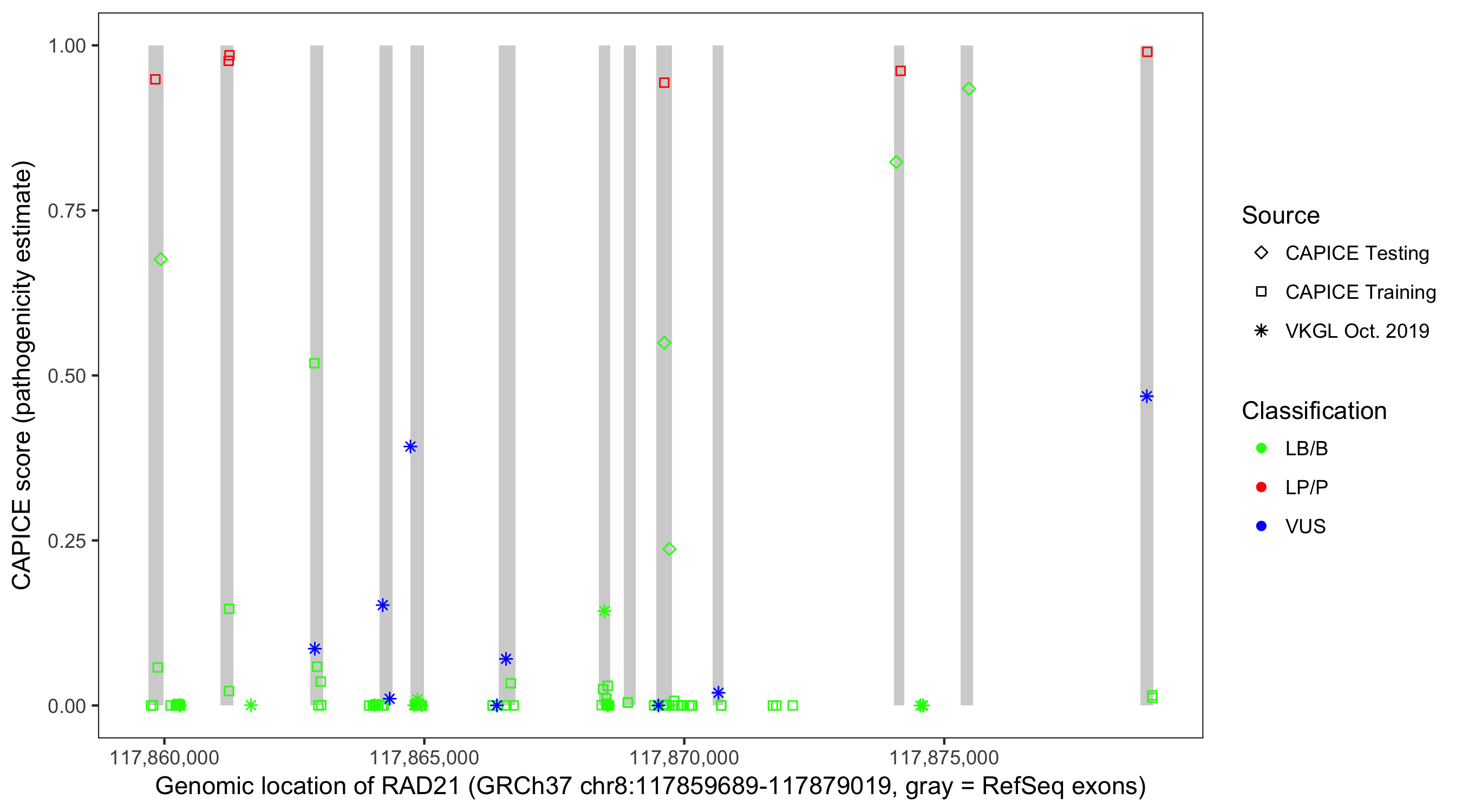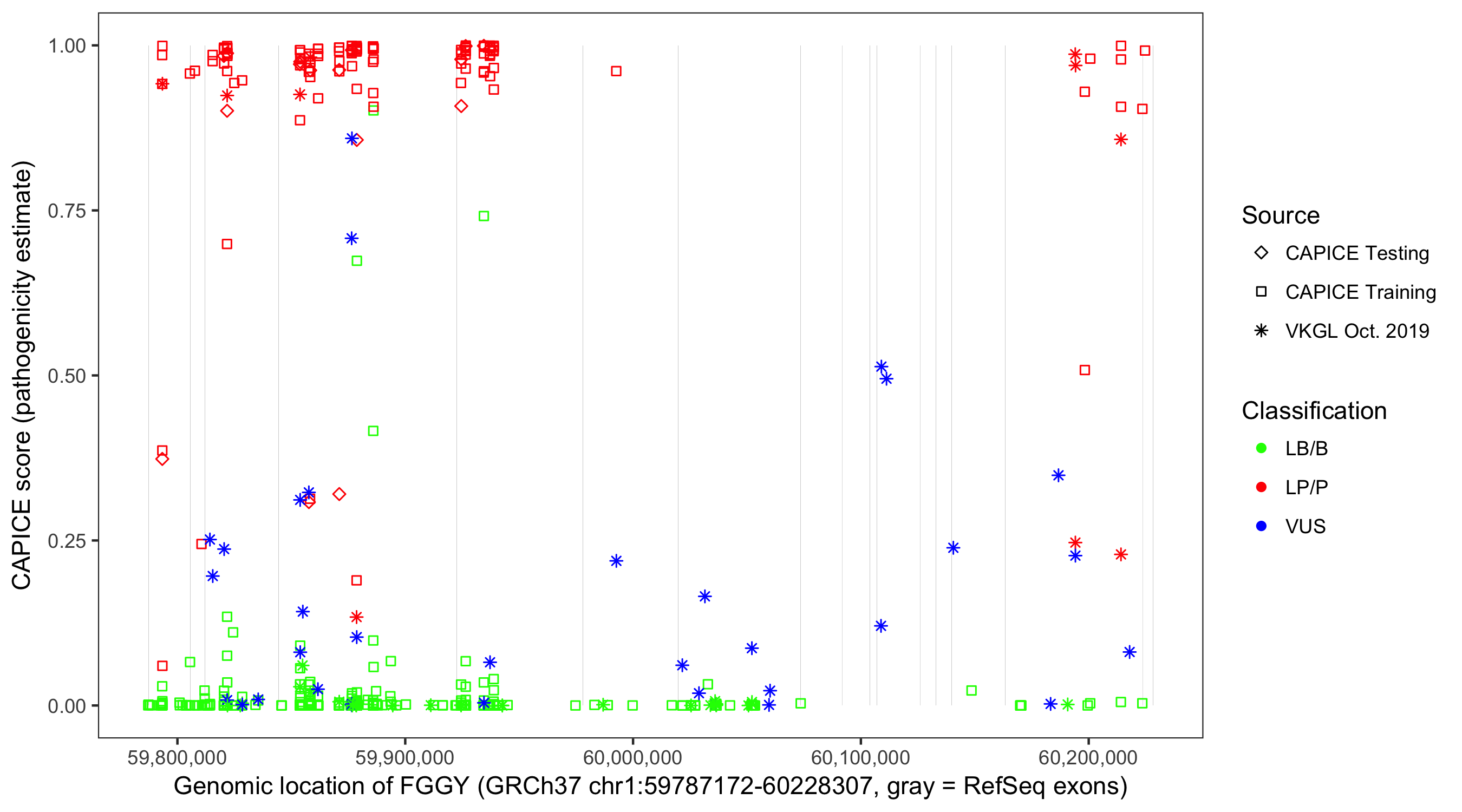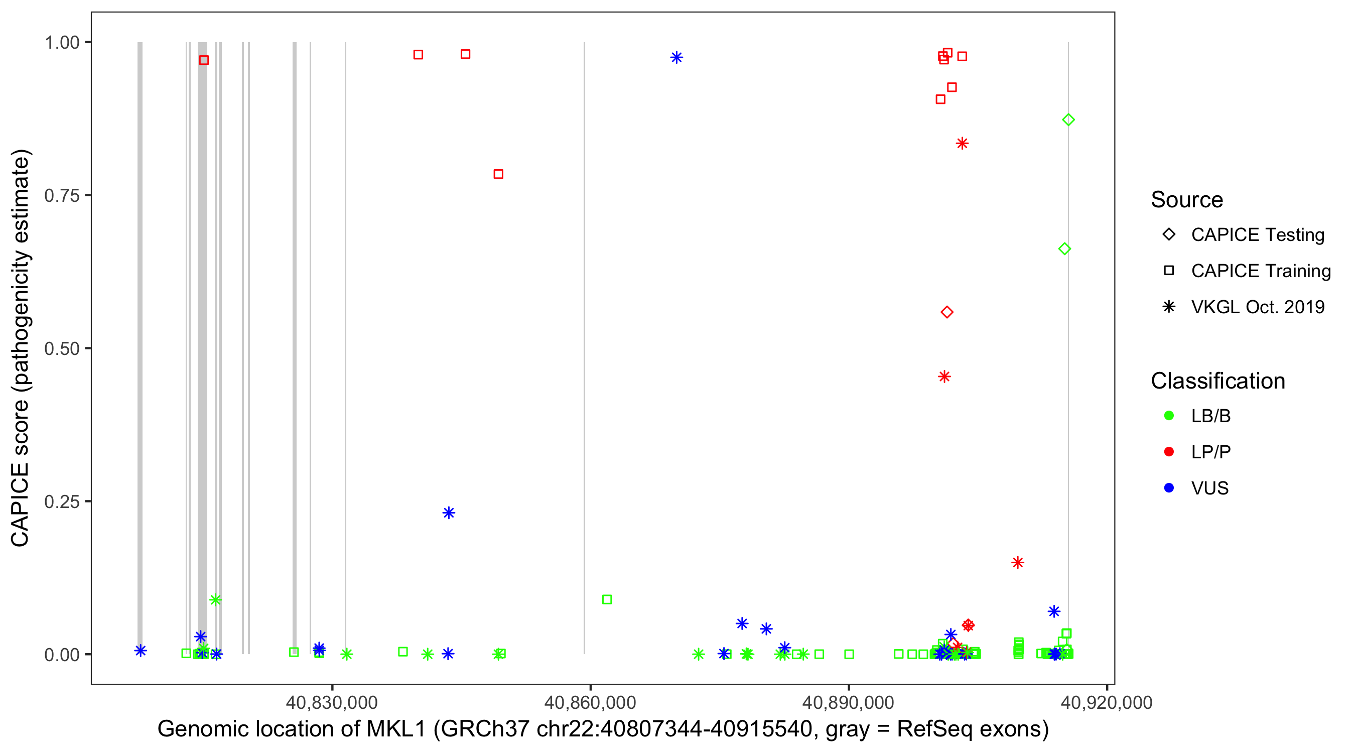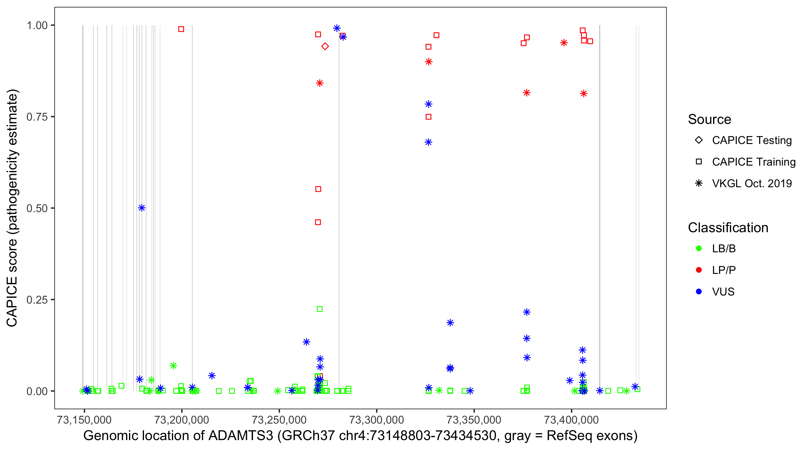 Shown are CAPICE train/test variants plus VKGL Oct 2019.