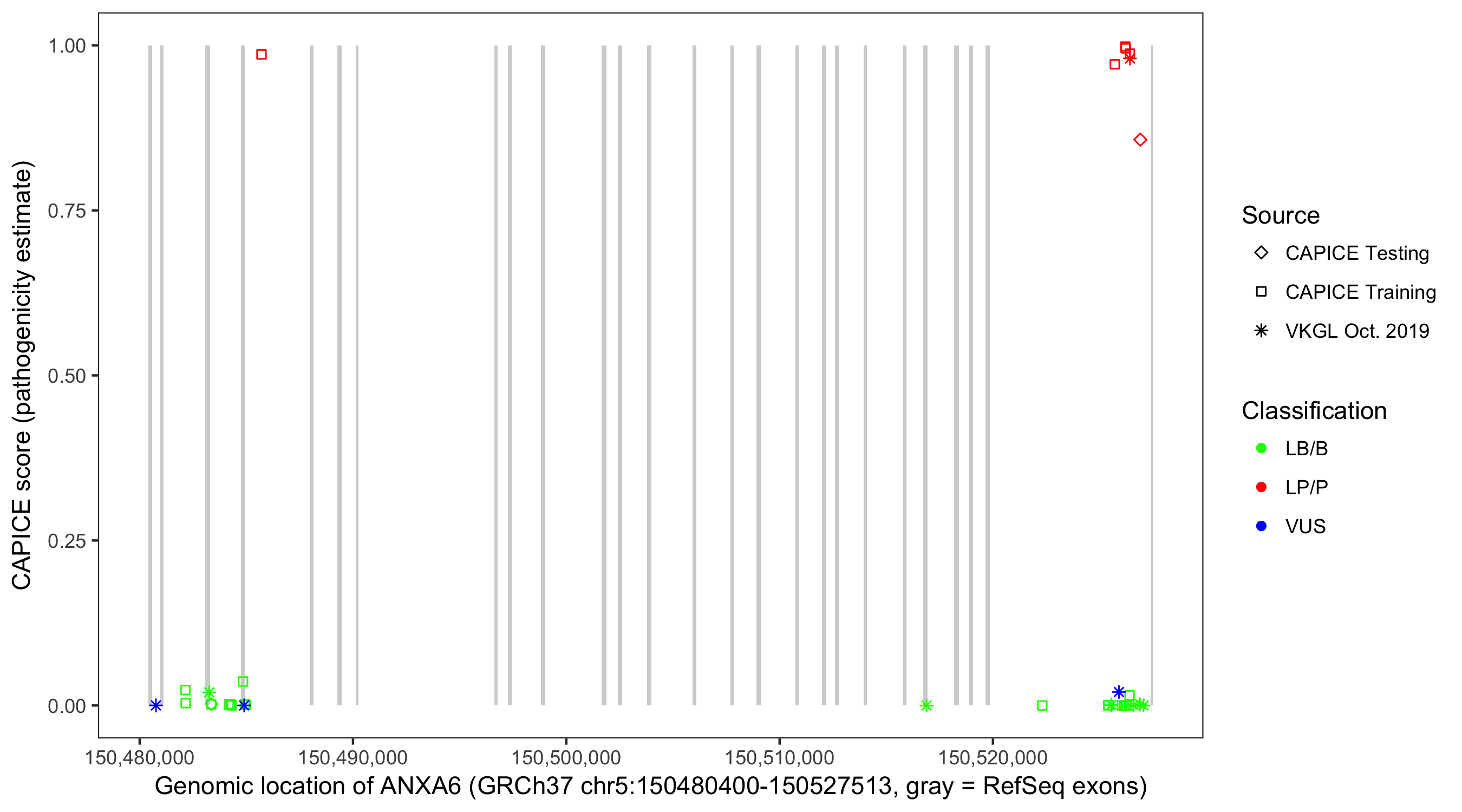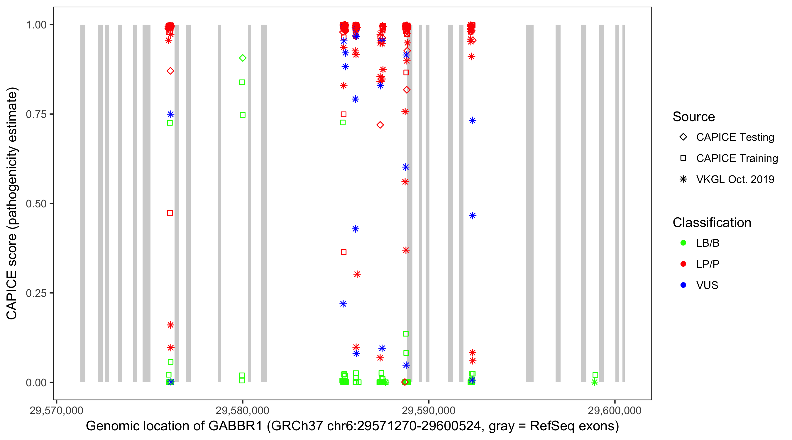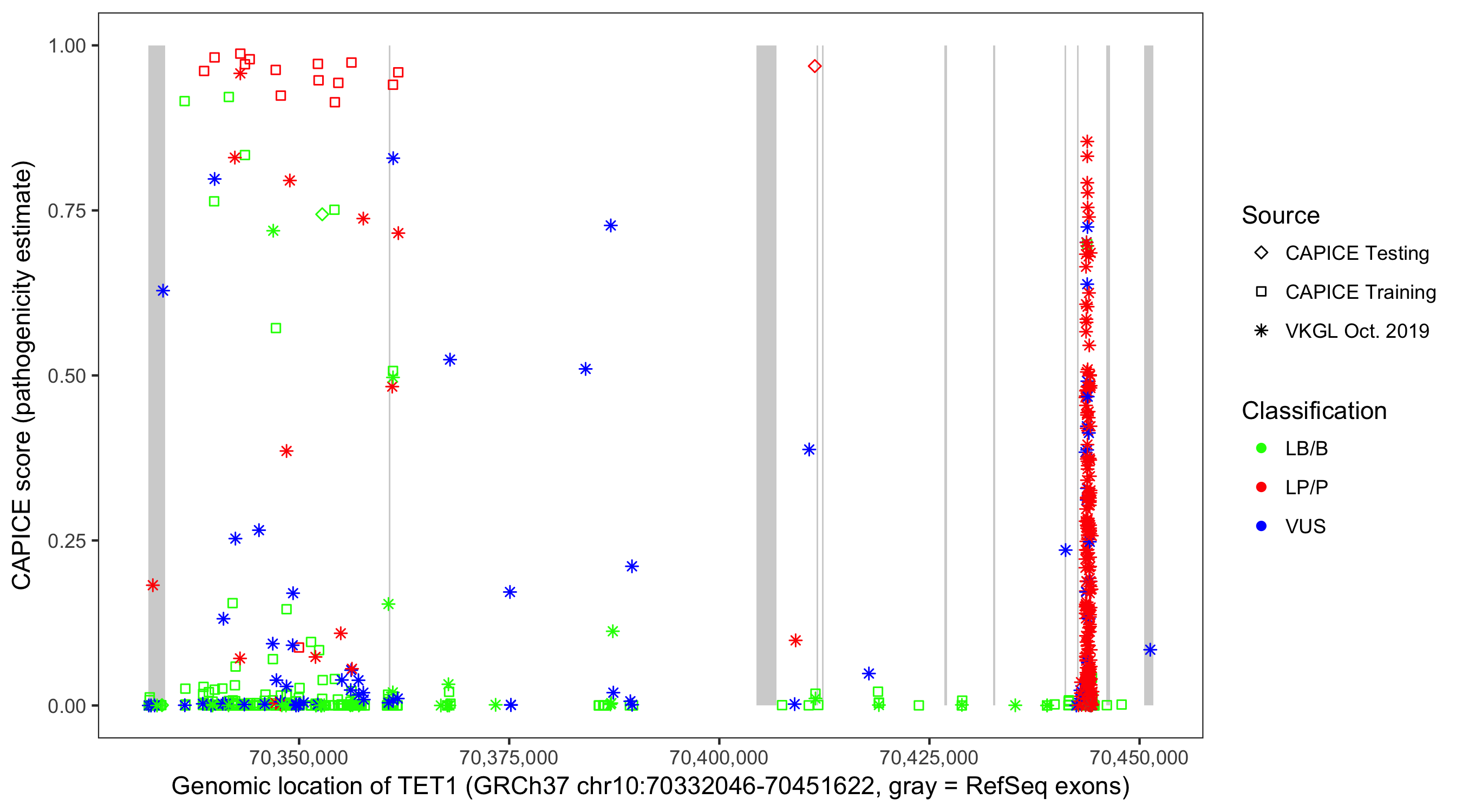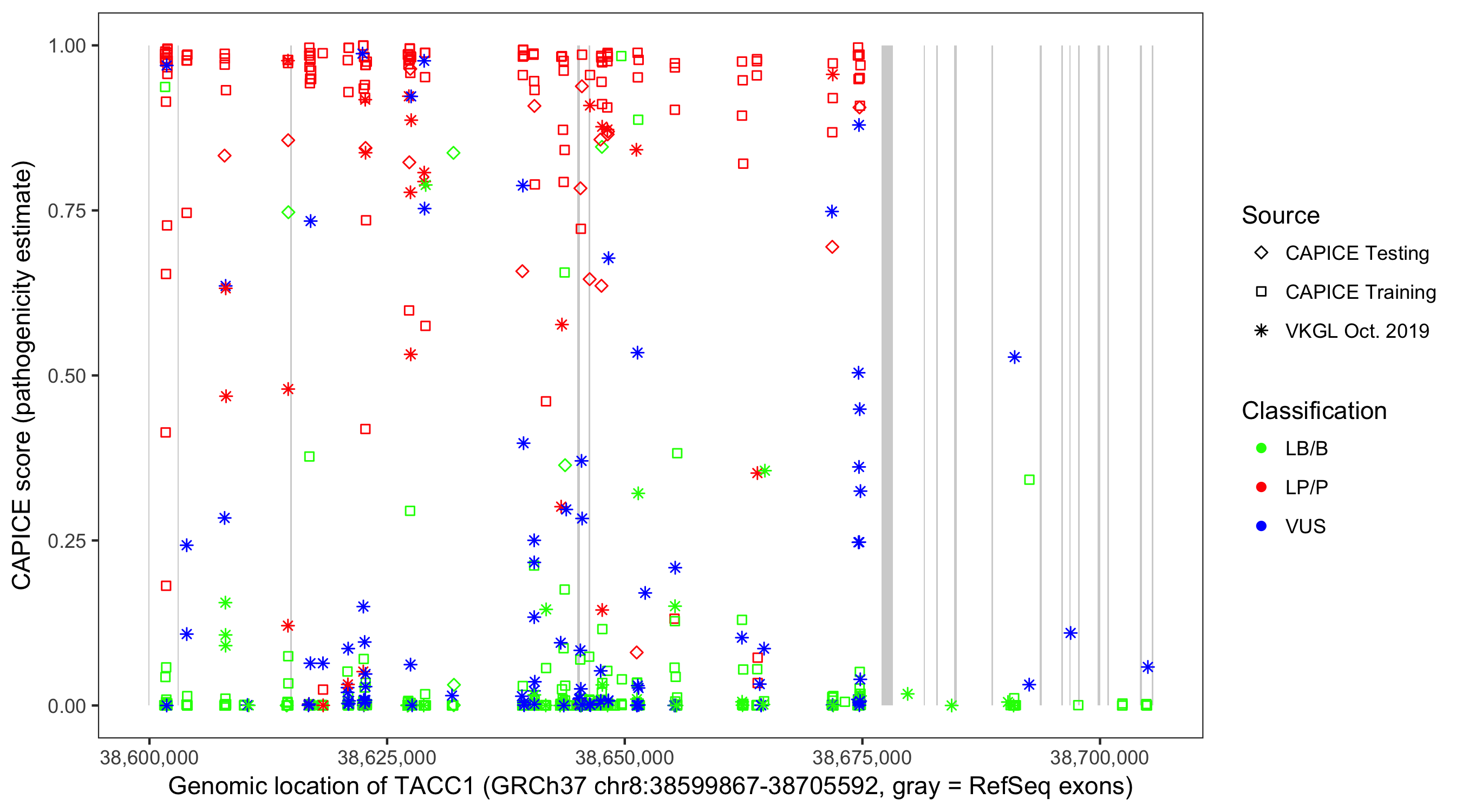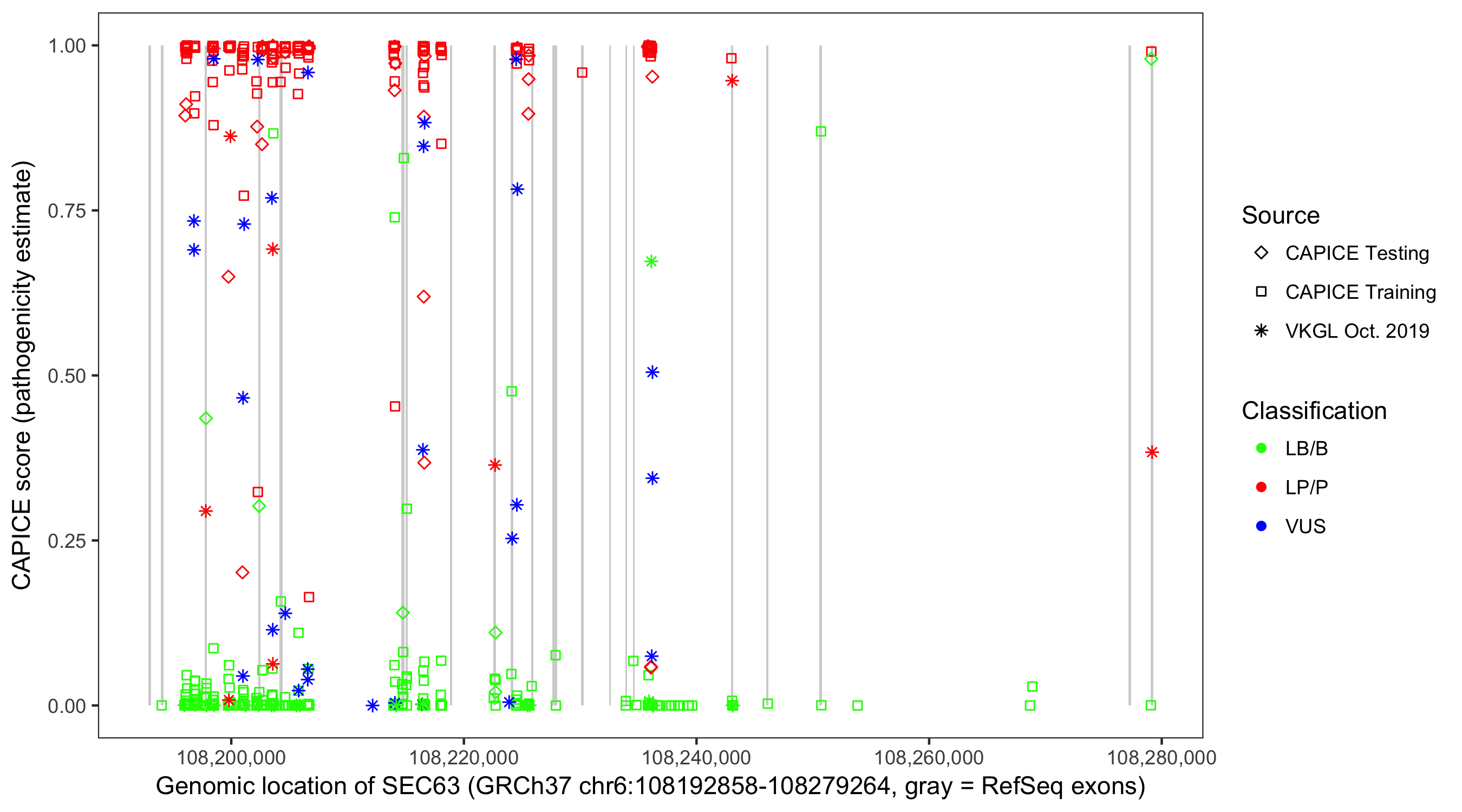 Shown are CAPICE train/test variants plus VKGL Oct 2019.