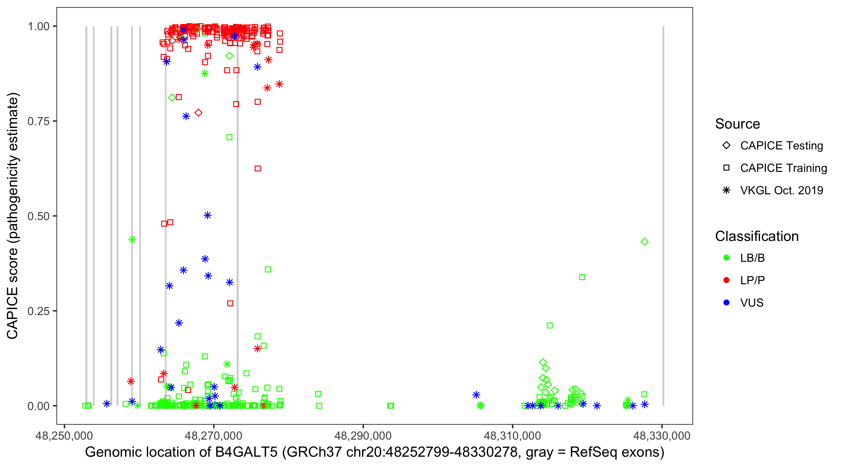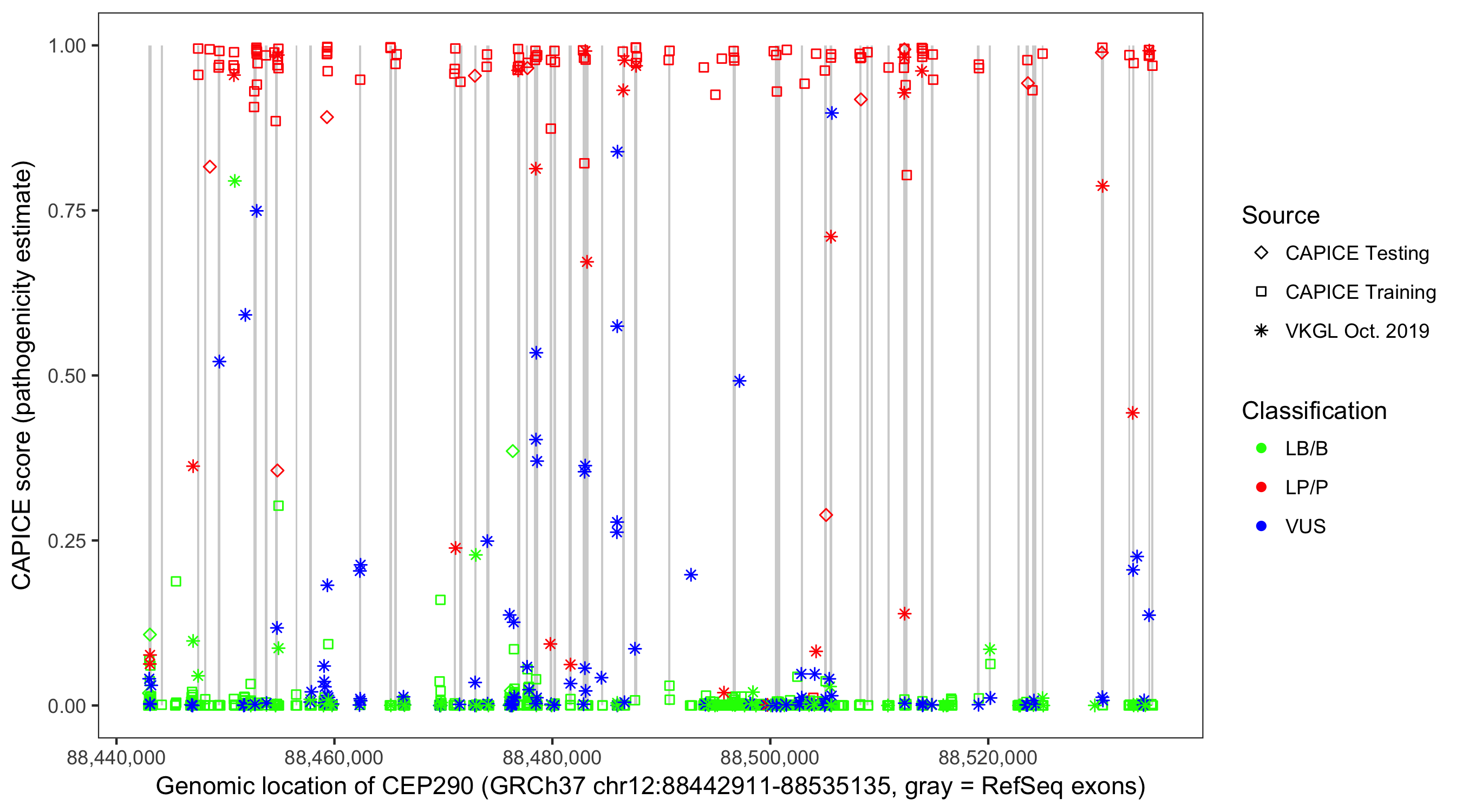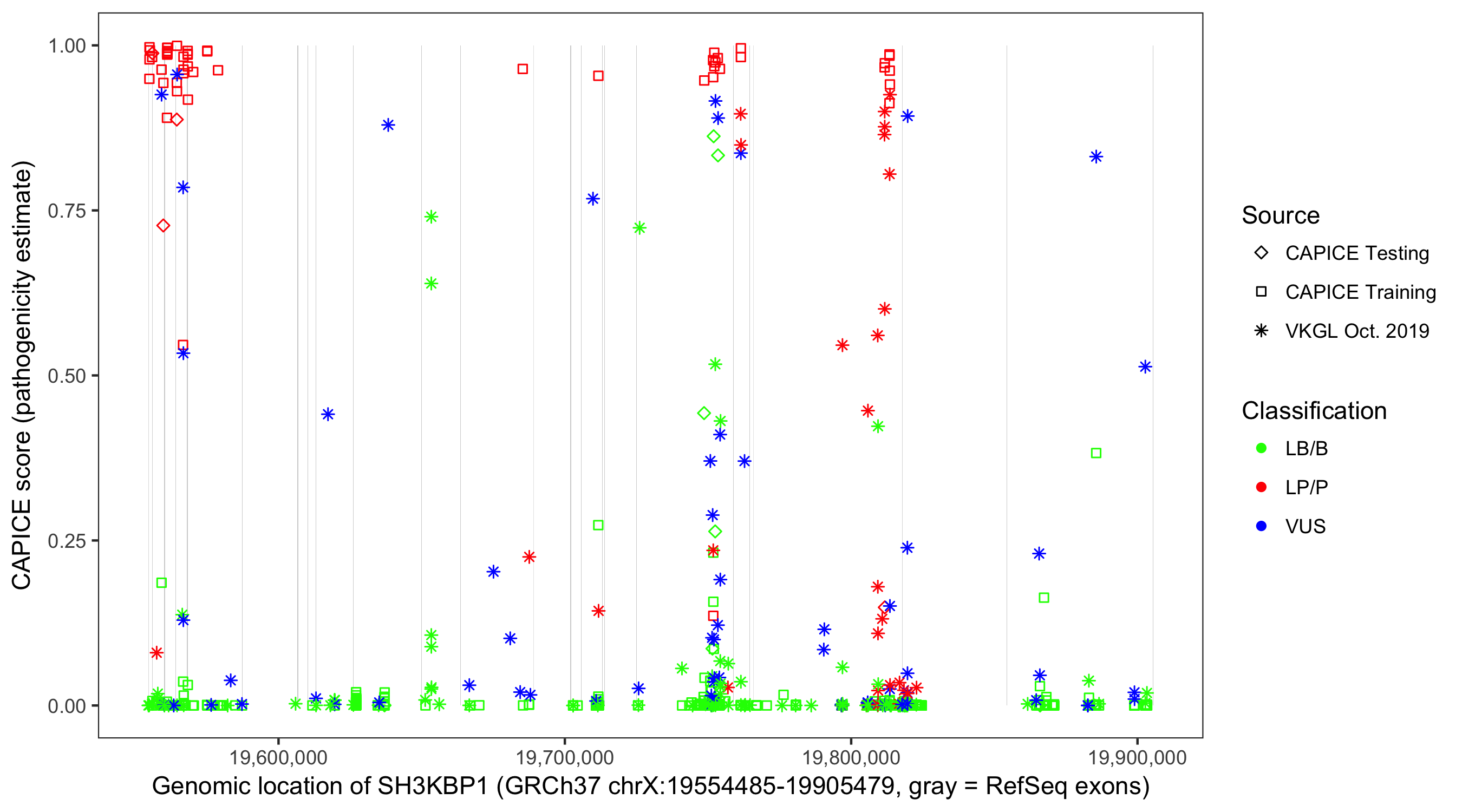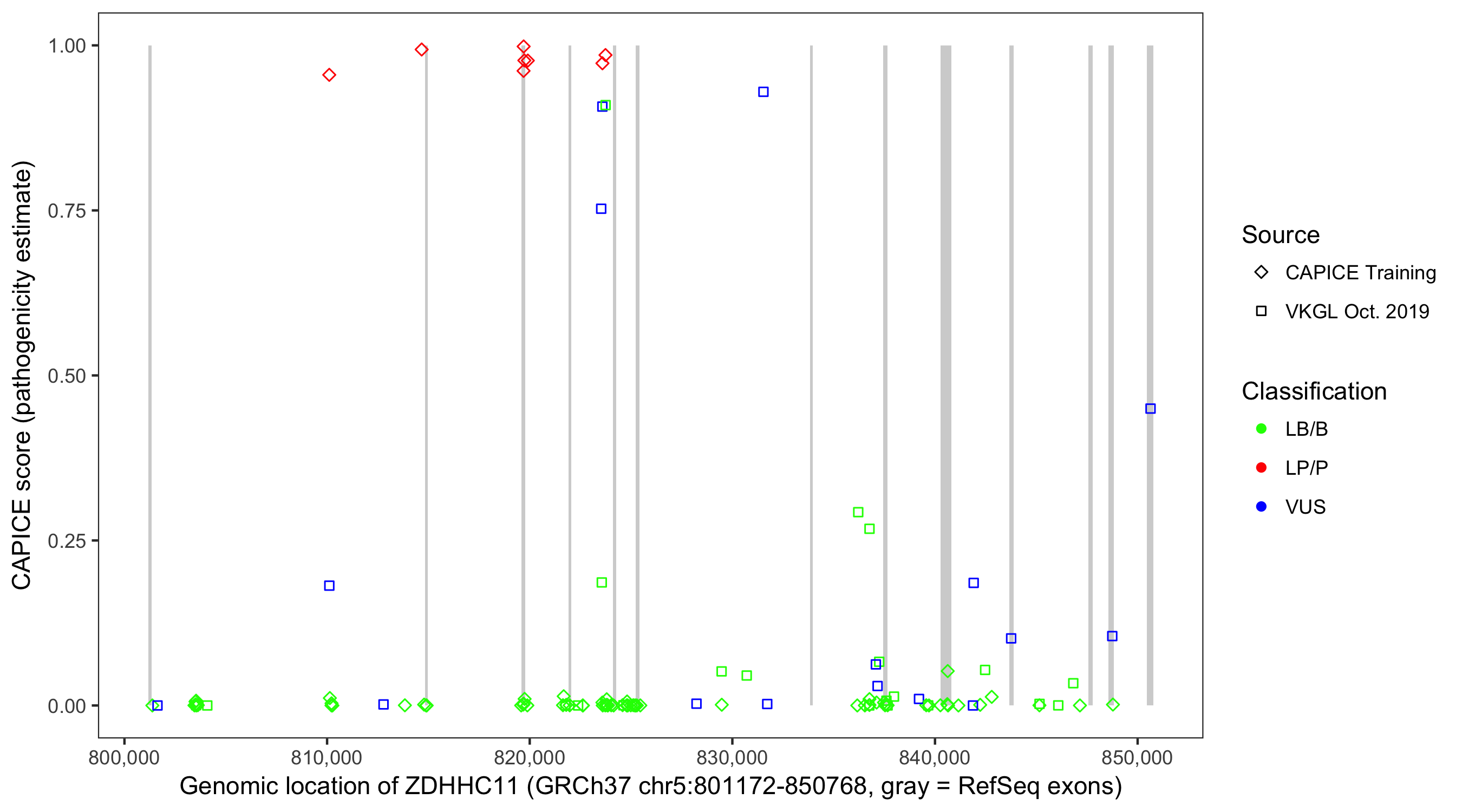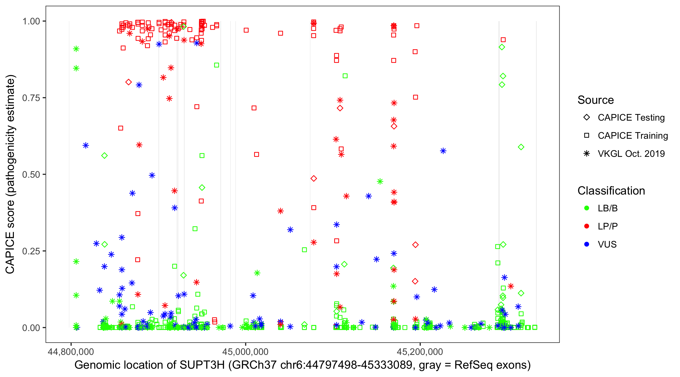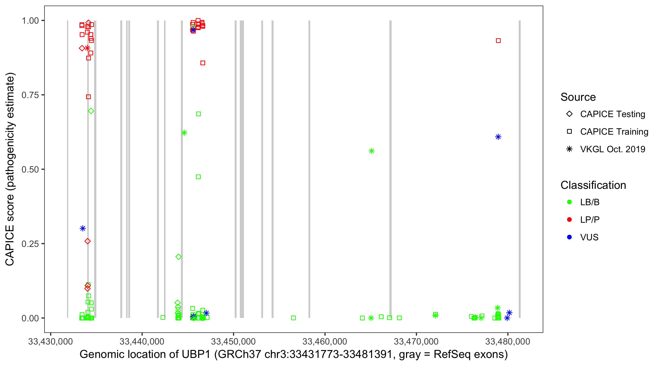 Shown are CAPICE train/test variants plus VKGL Oct 2019.