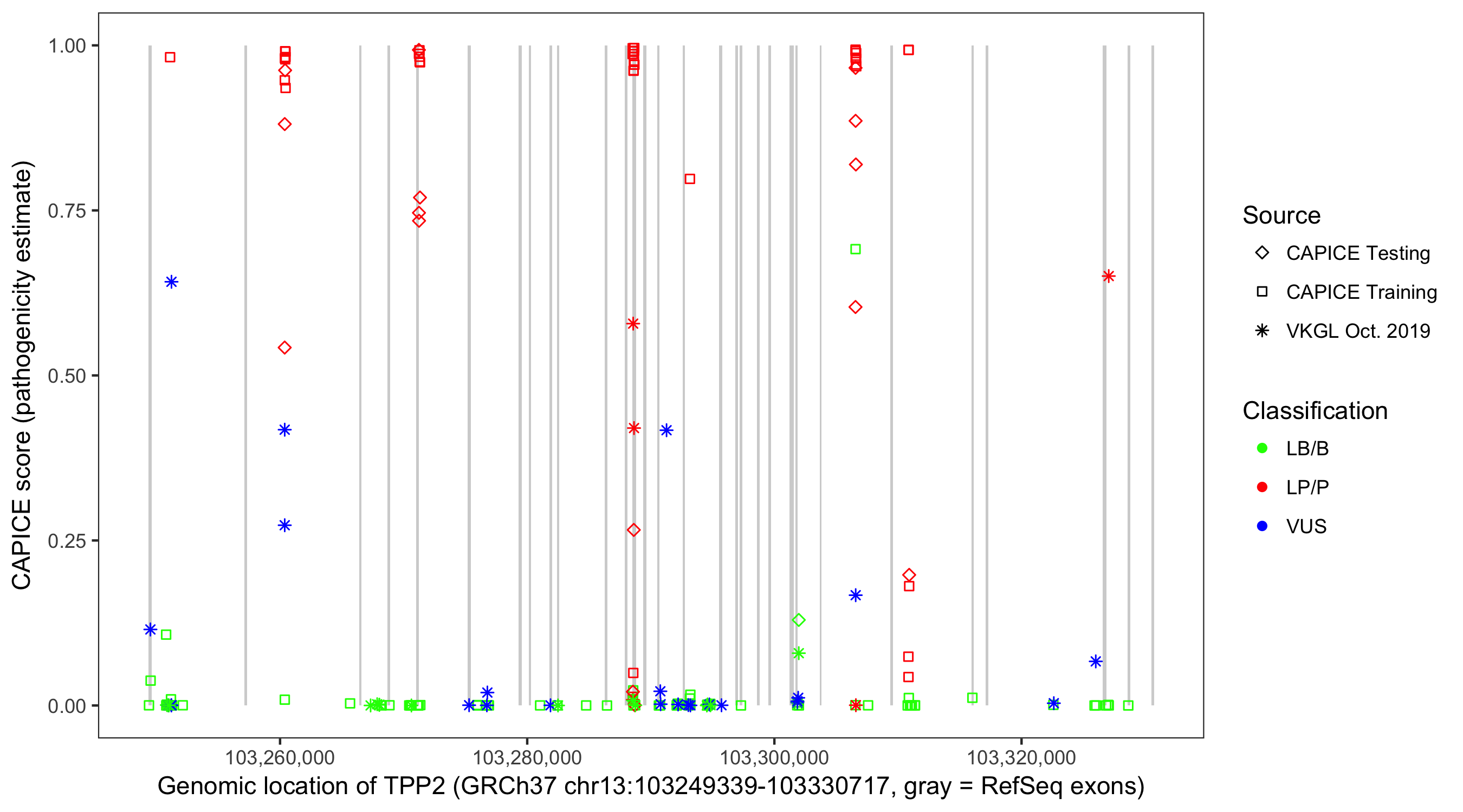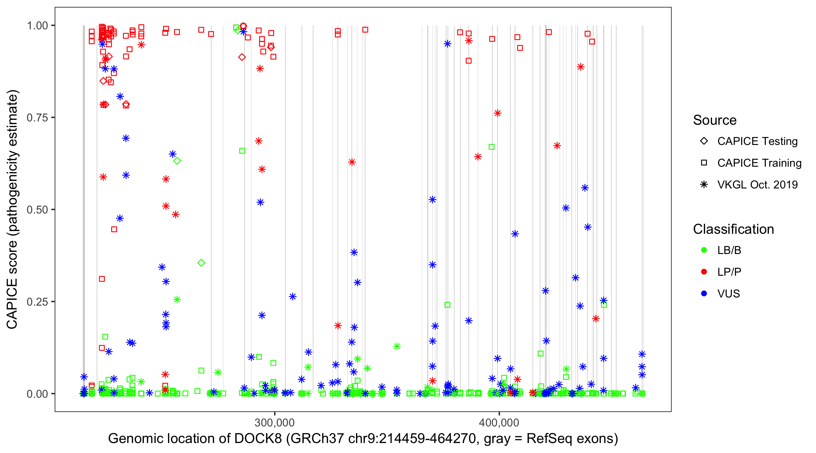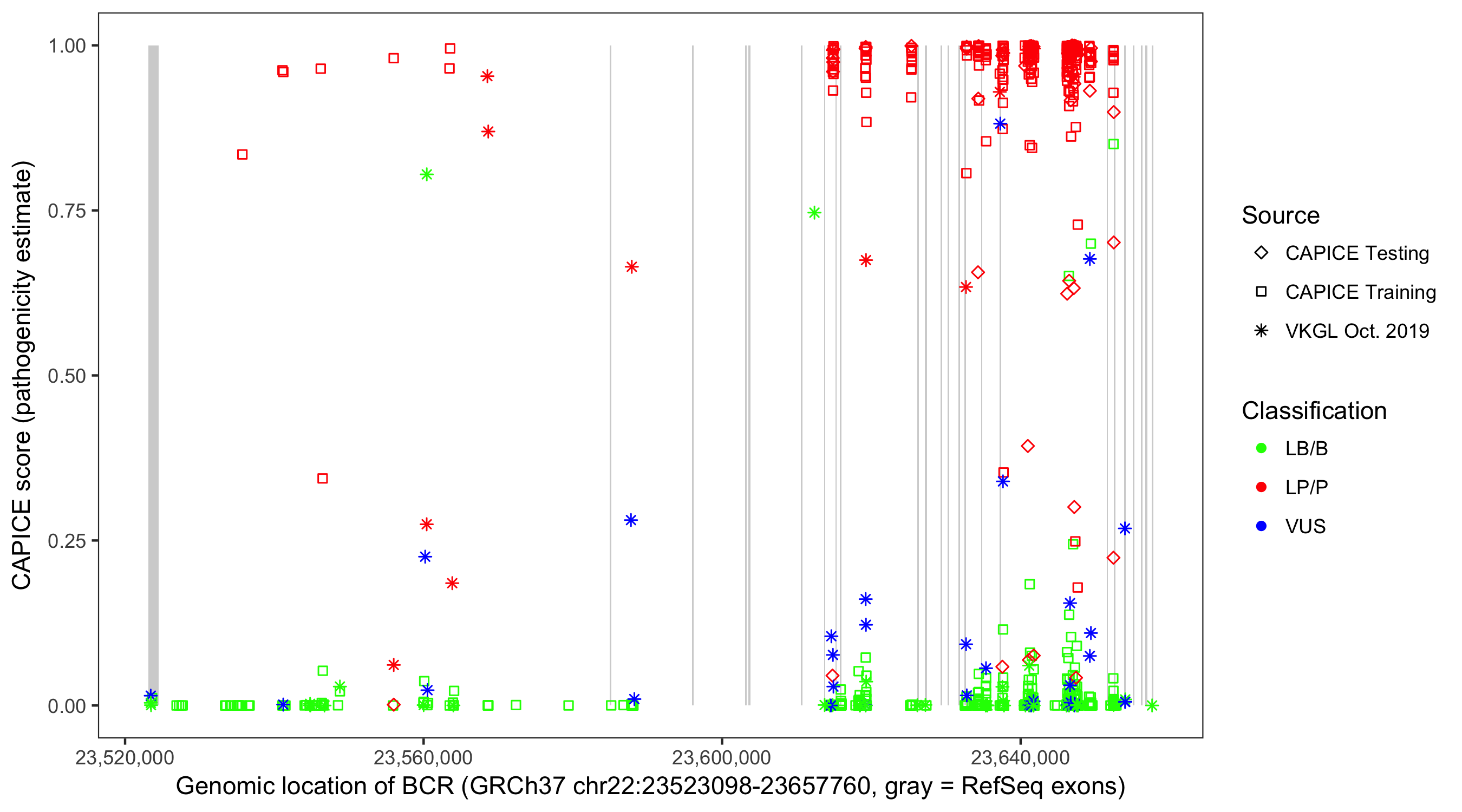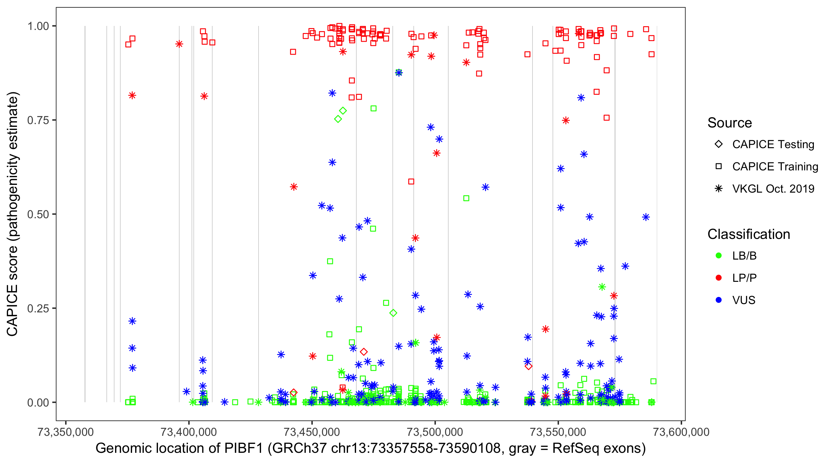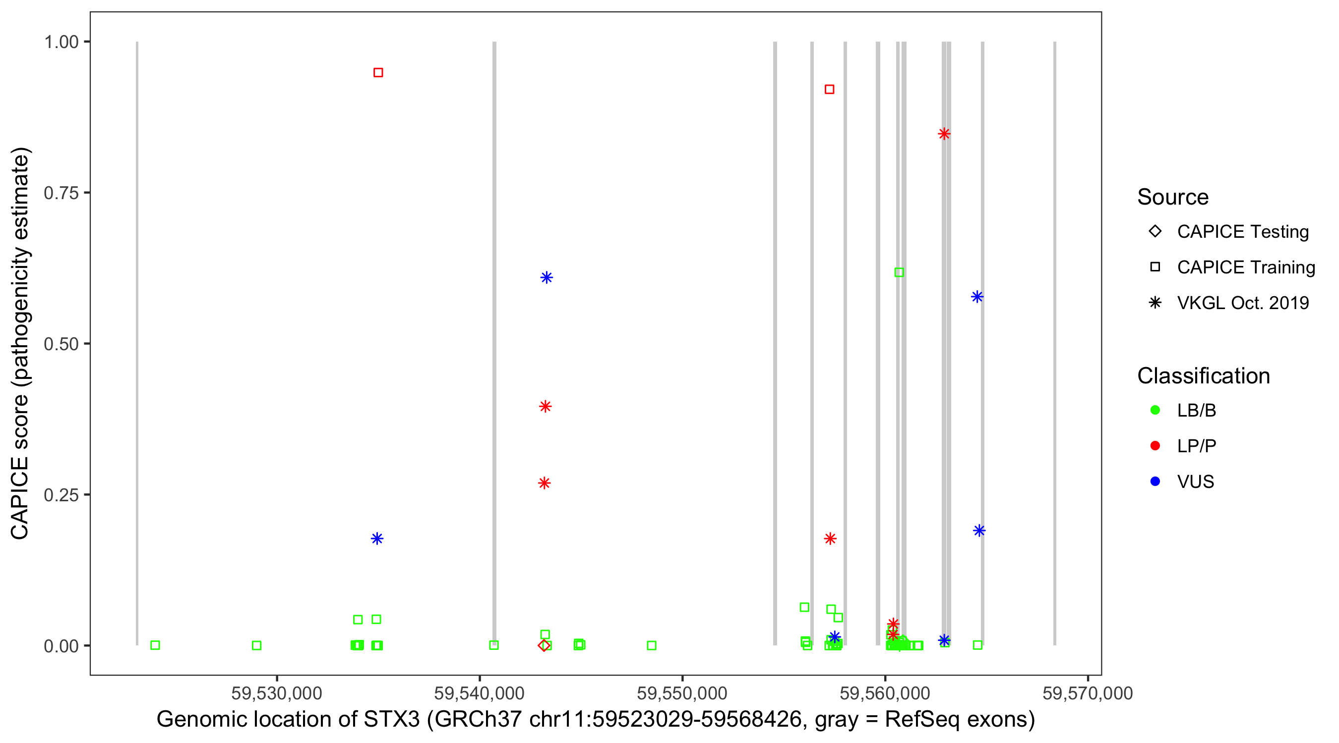 Shown are CAPICE train/test variants plus VKGL Oct 2019.