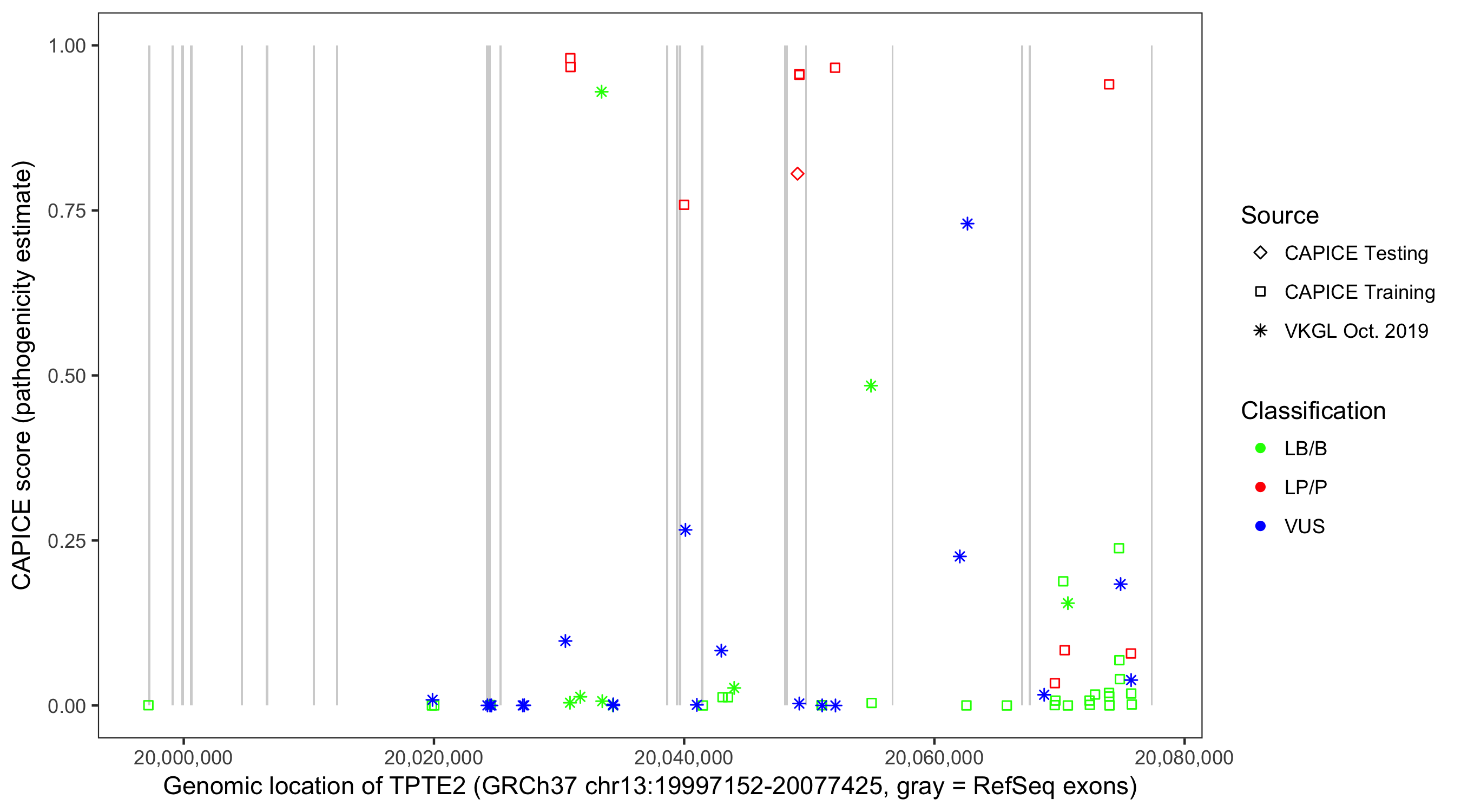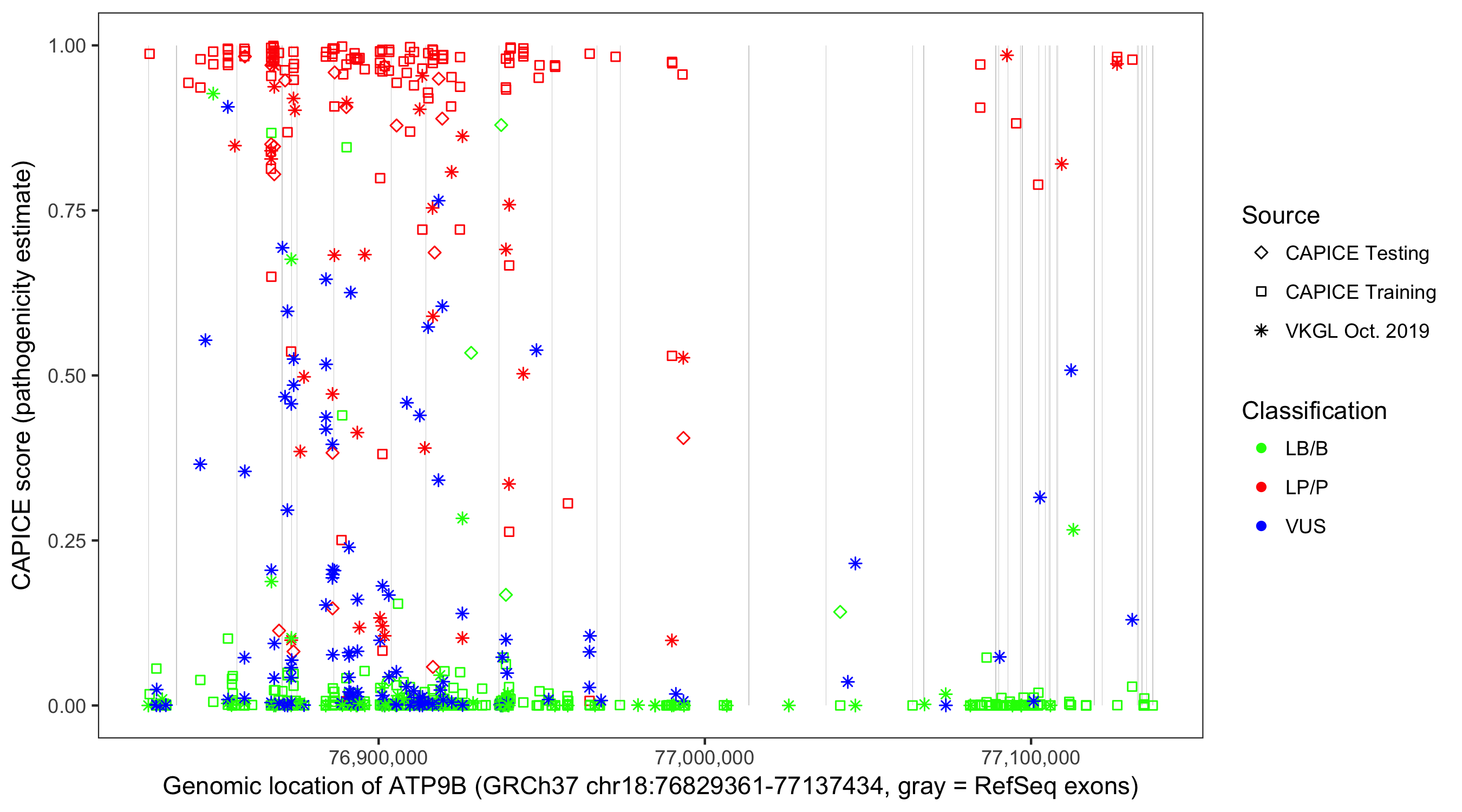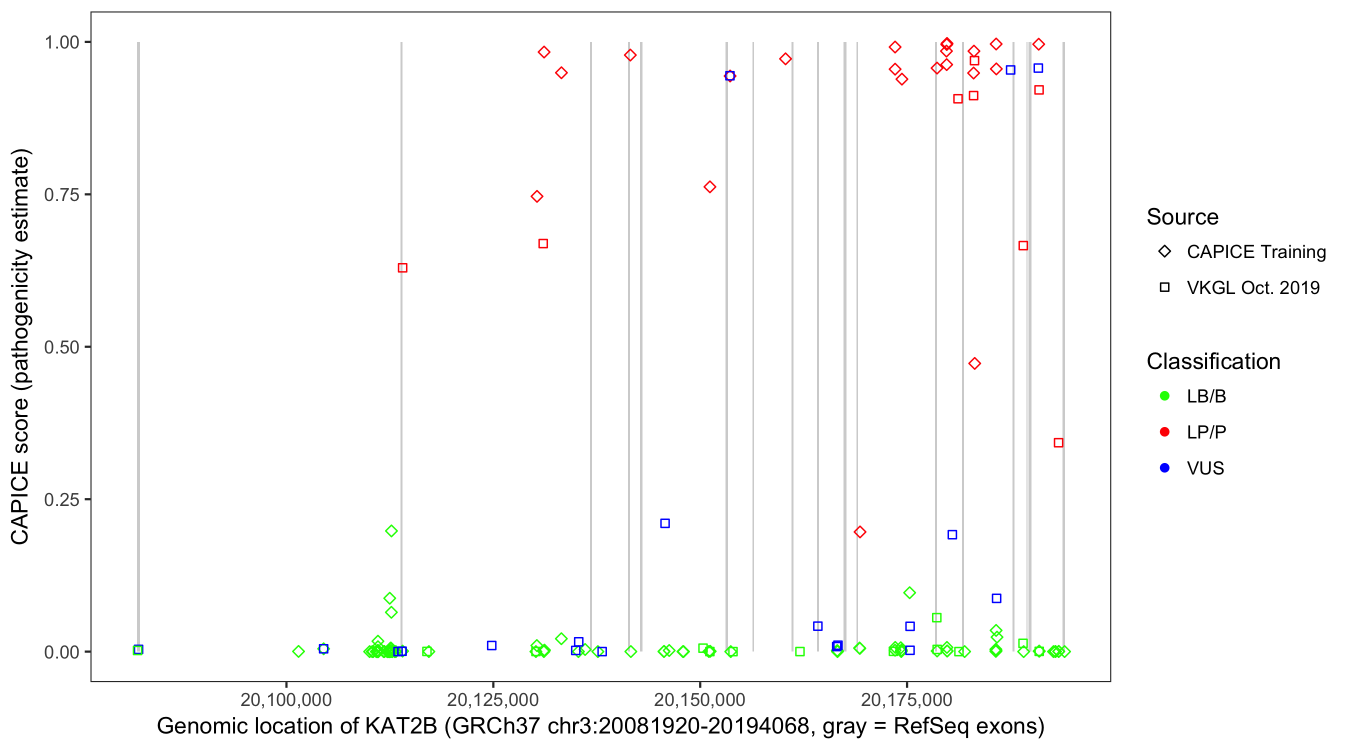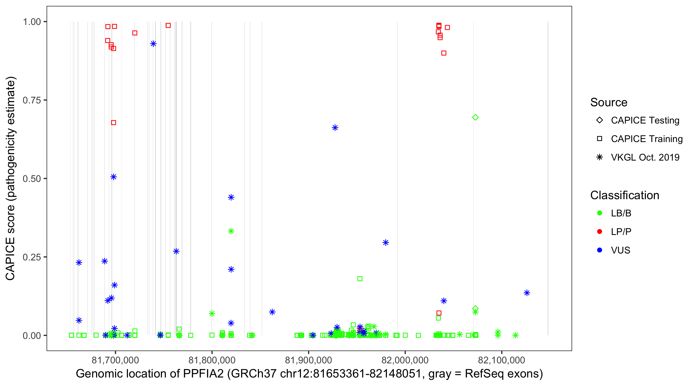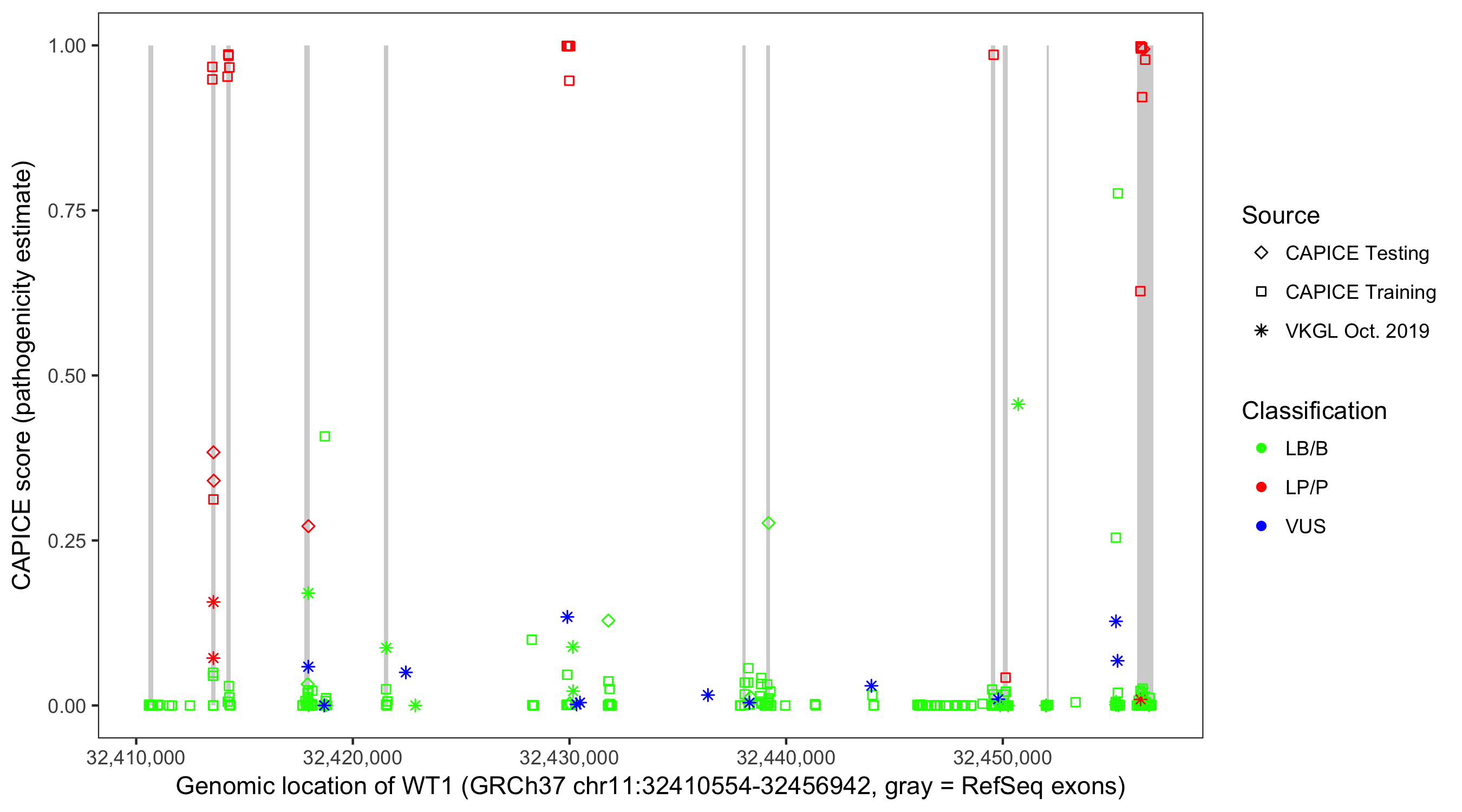 Shown are CAPICE train/test variants plus VKGL Oct 2019.