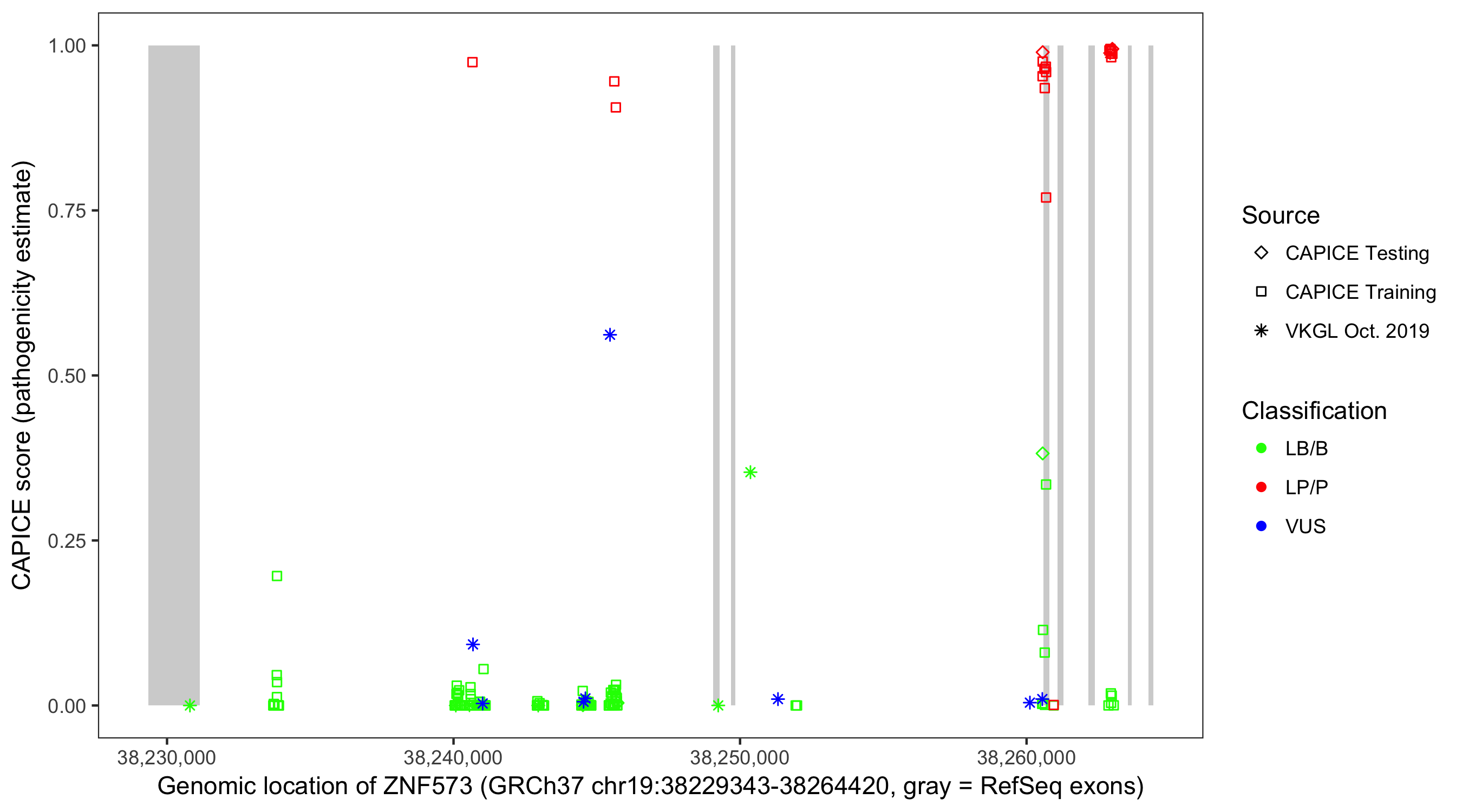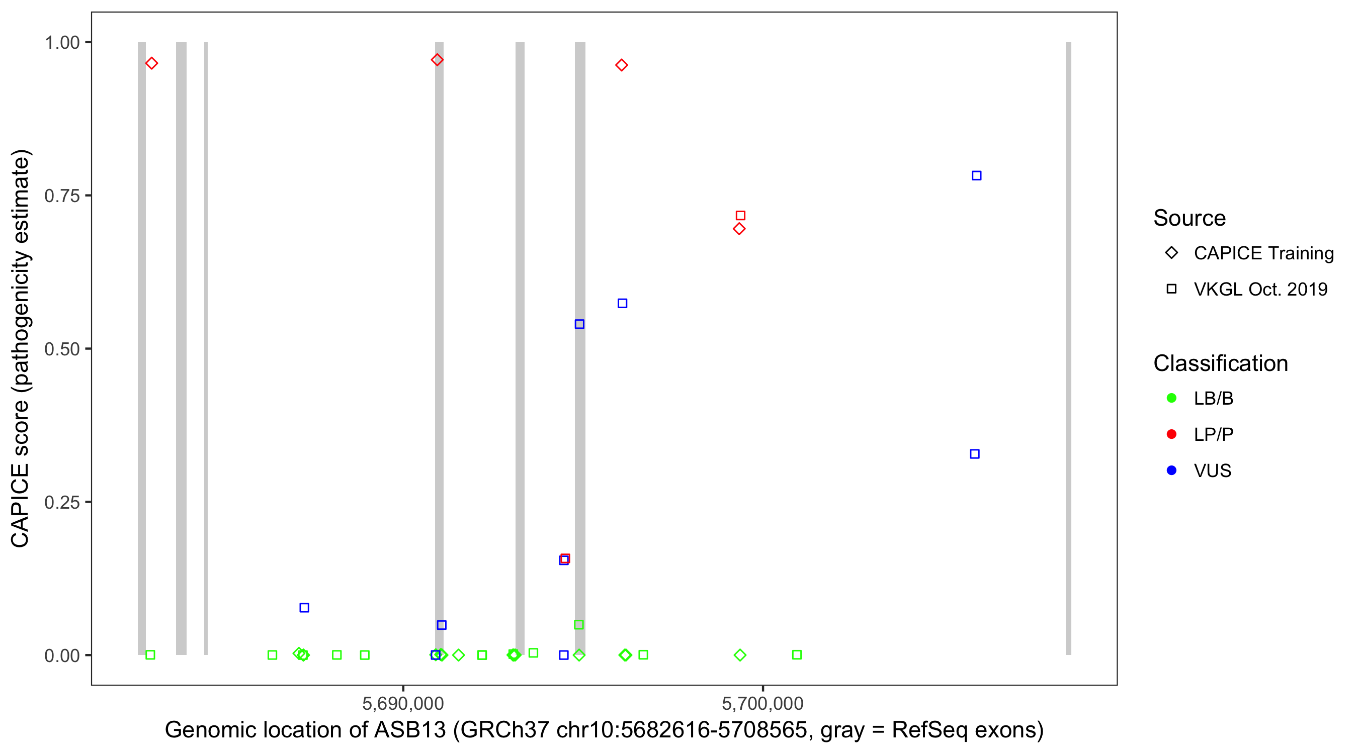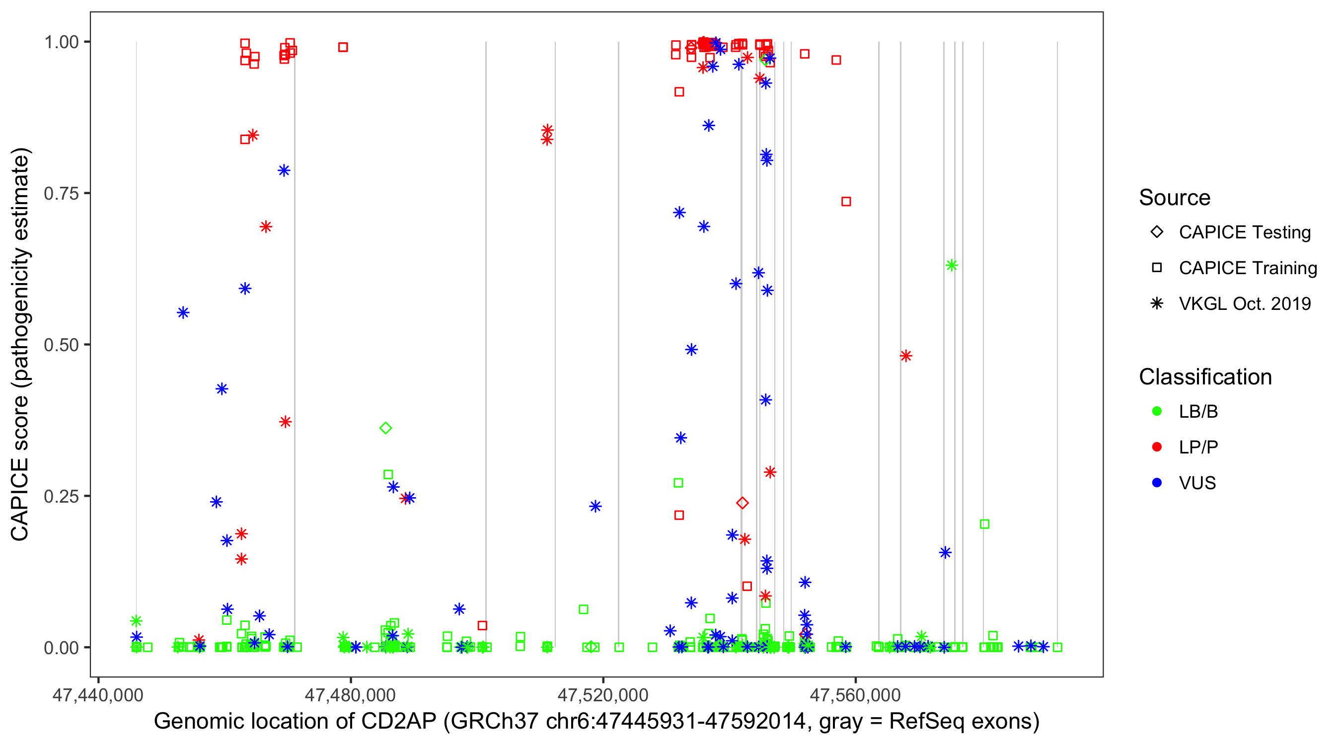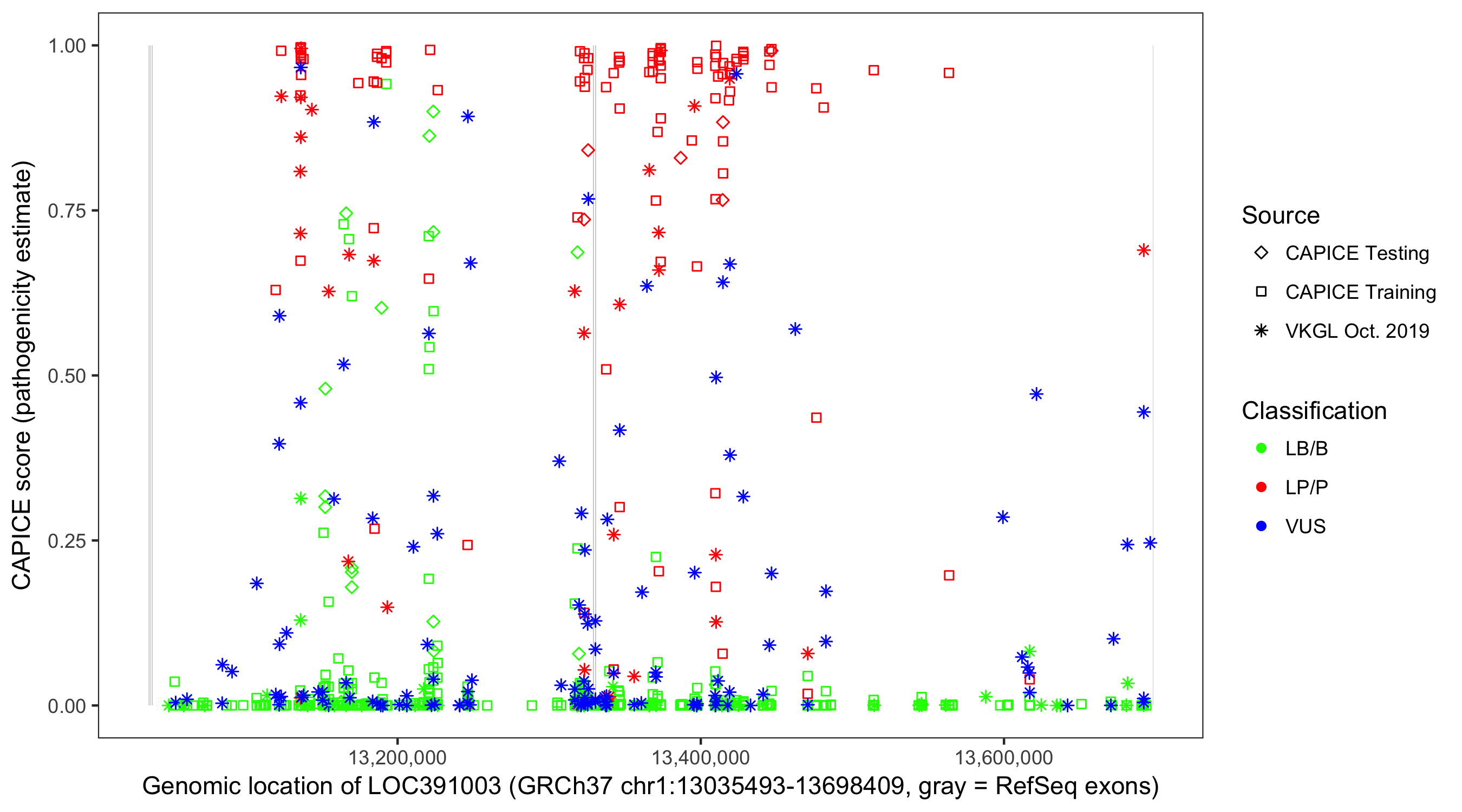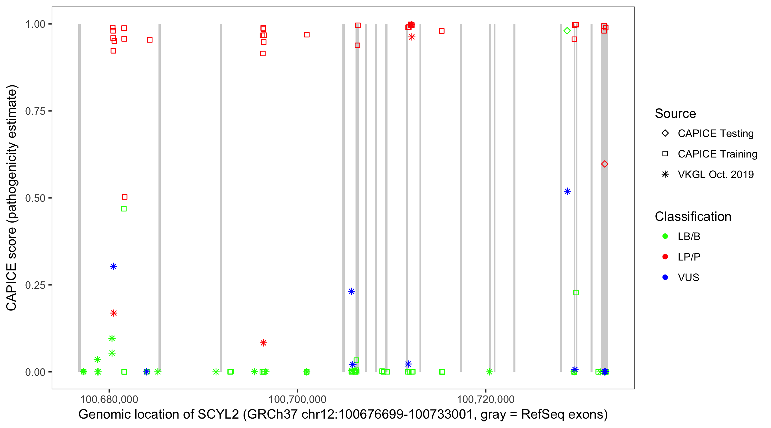 Shown are CAPICE train/test variants plus VKGL Oct 2019.