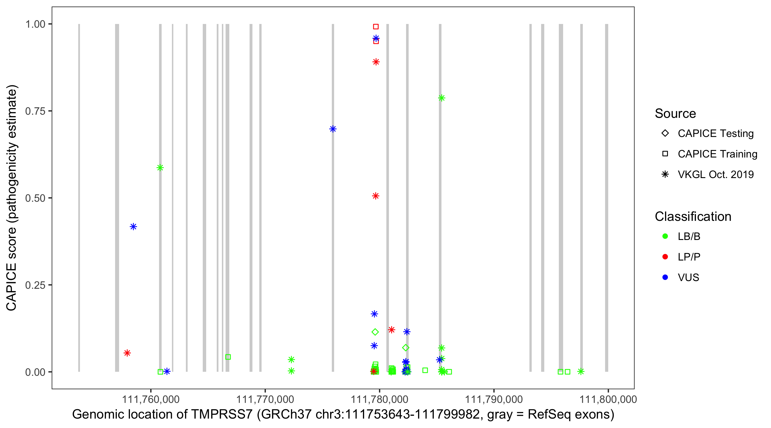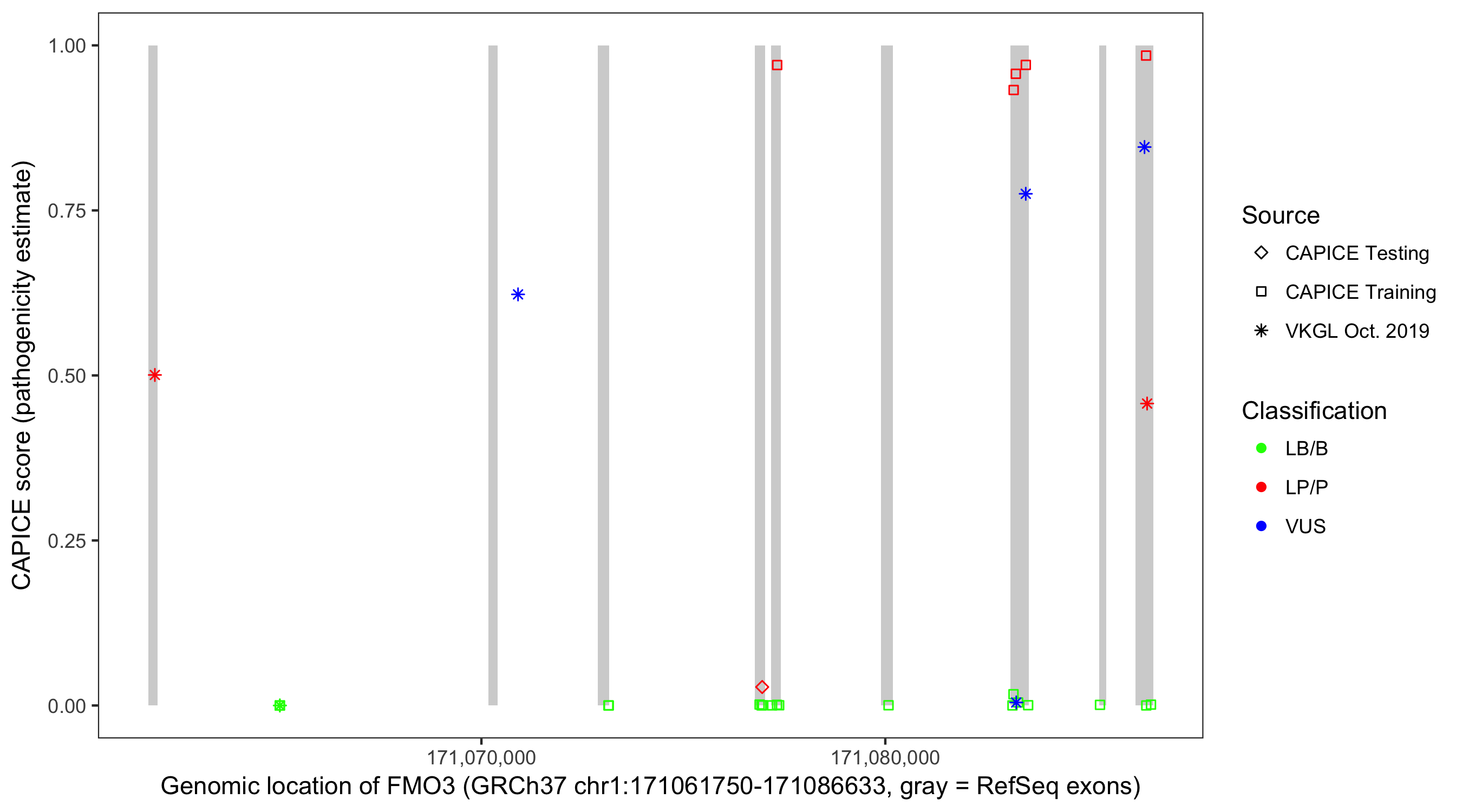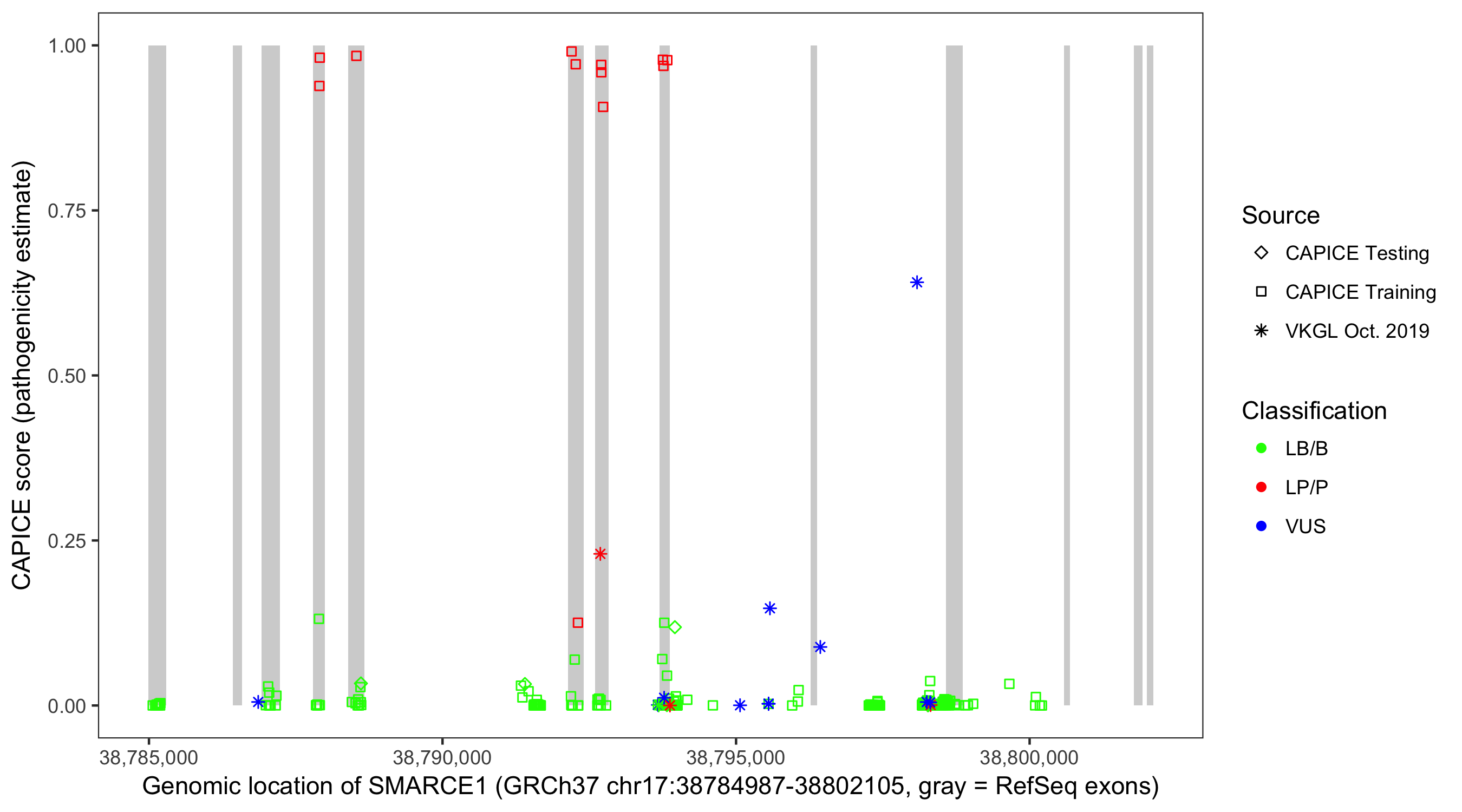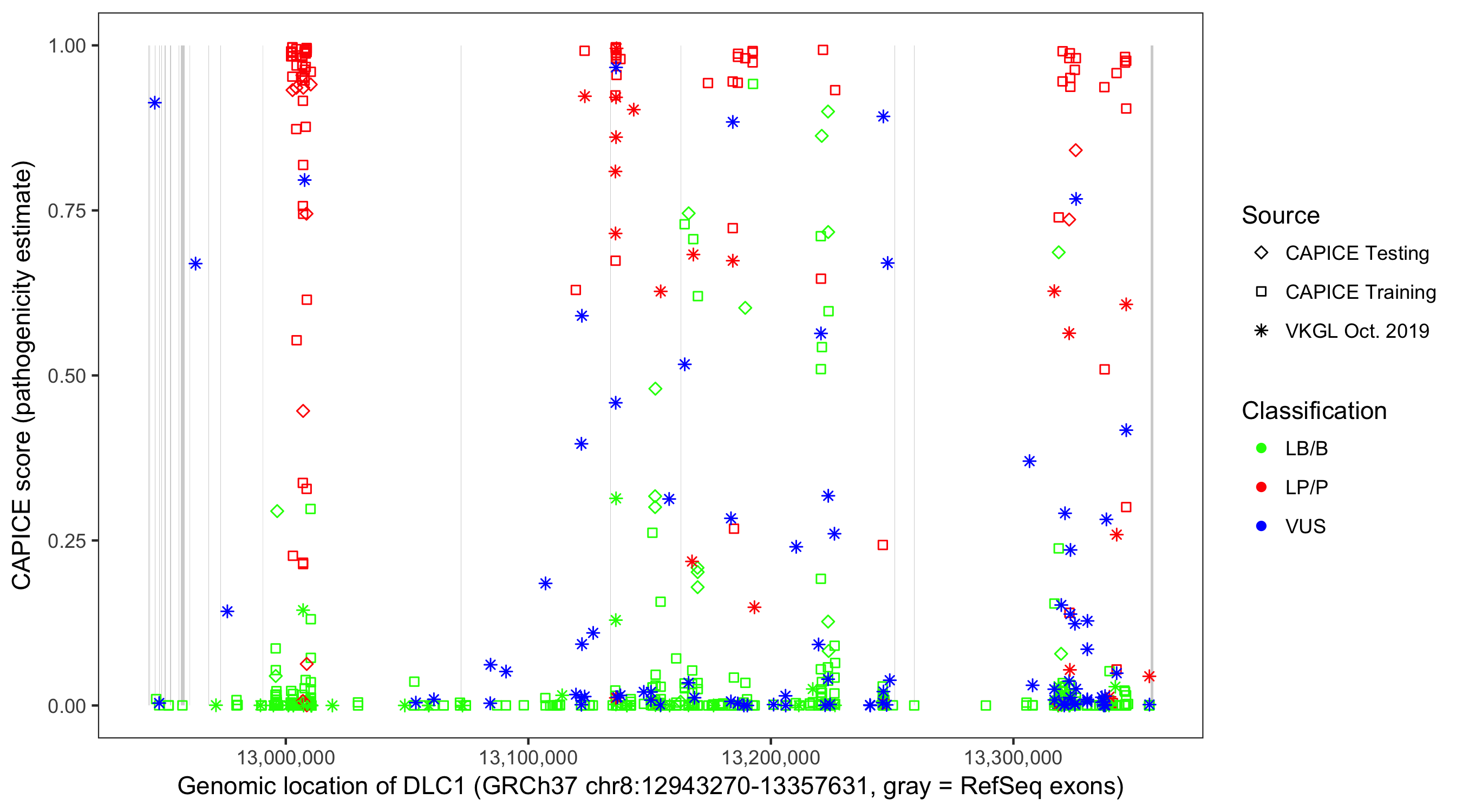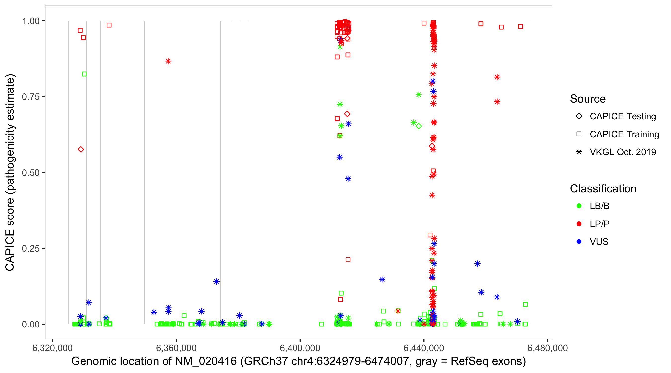 Shown are CAPICE train/test variants plus VKGL Oct 2019.