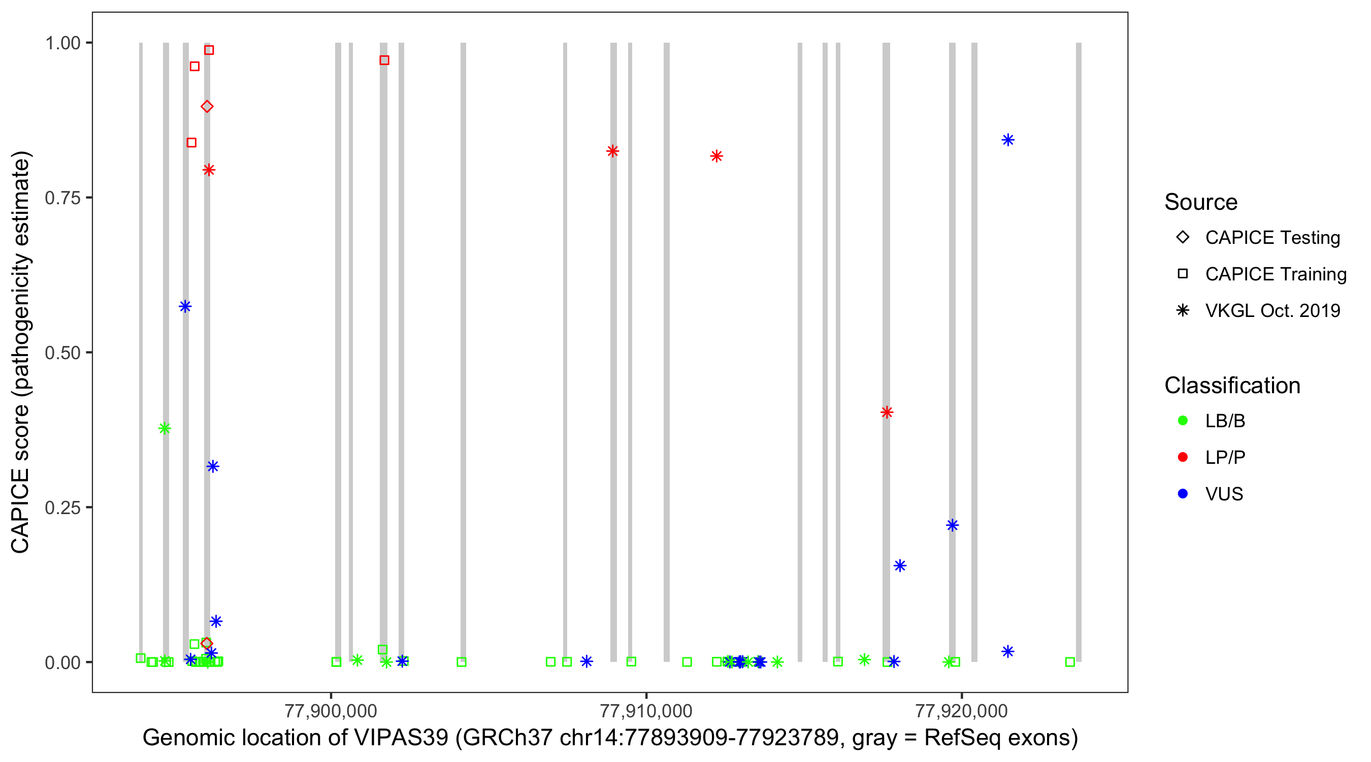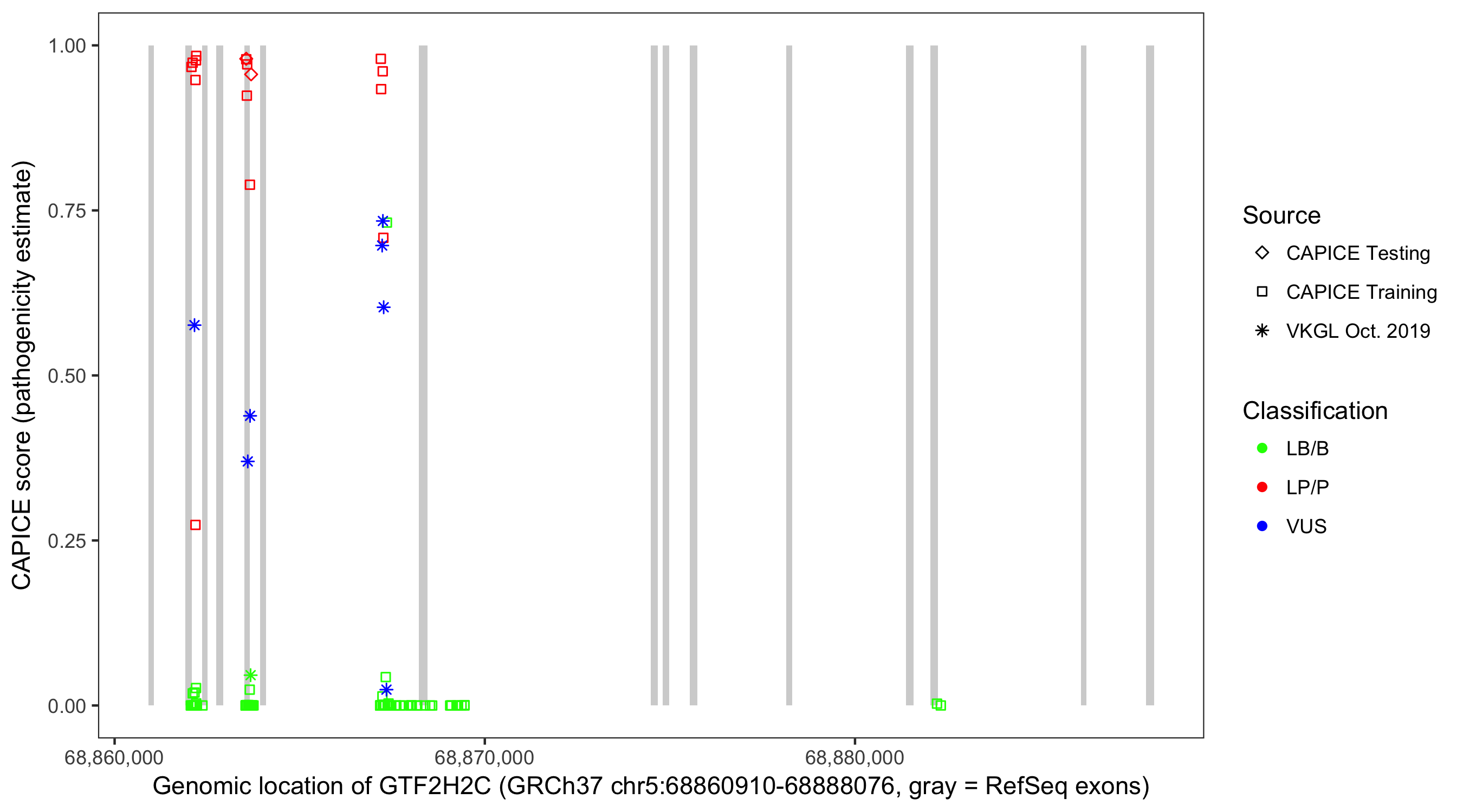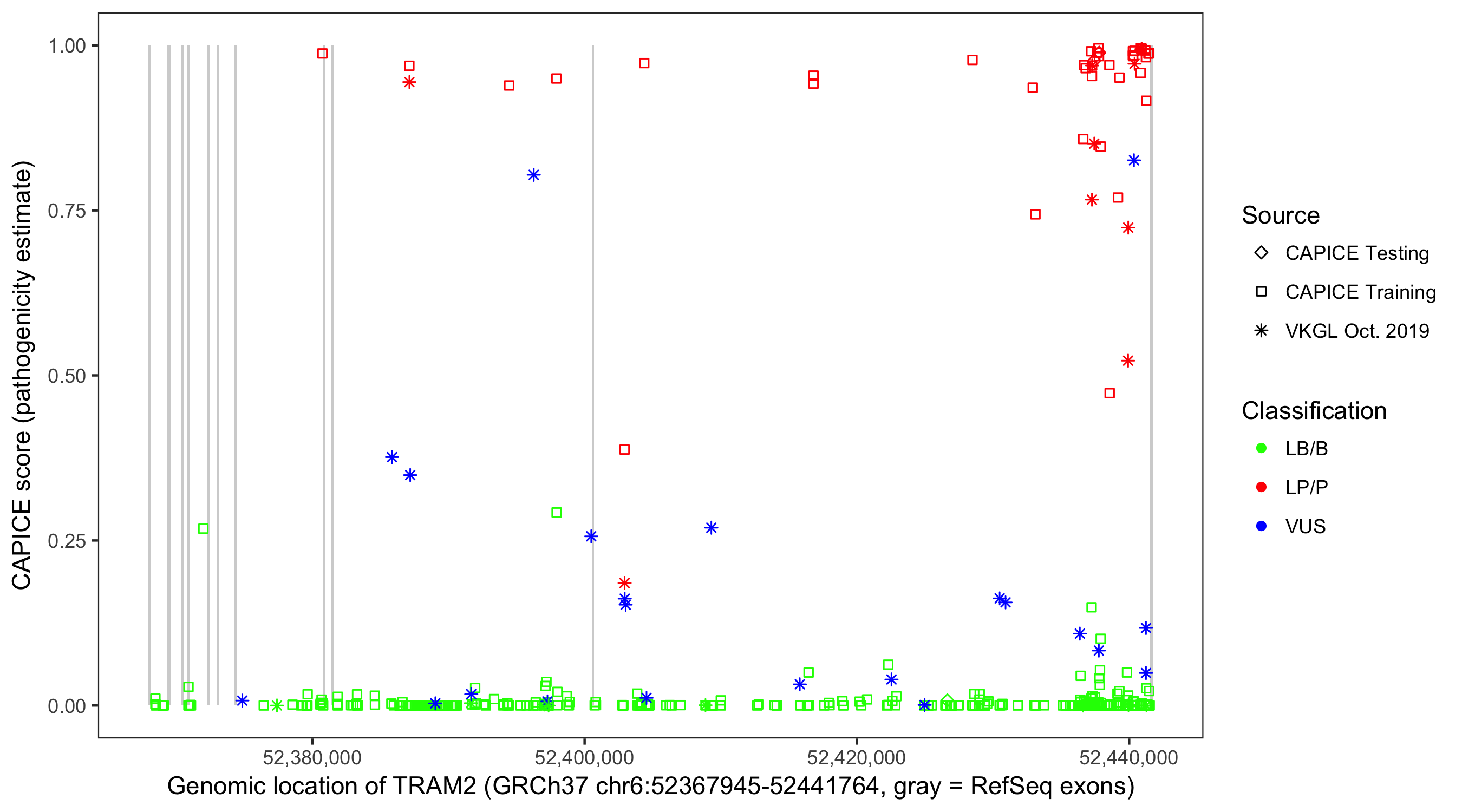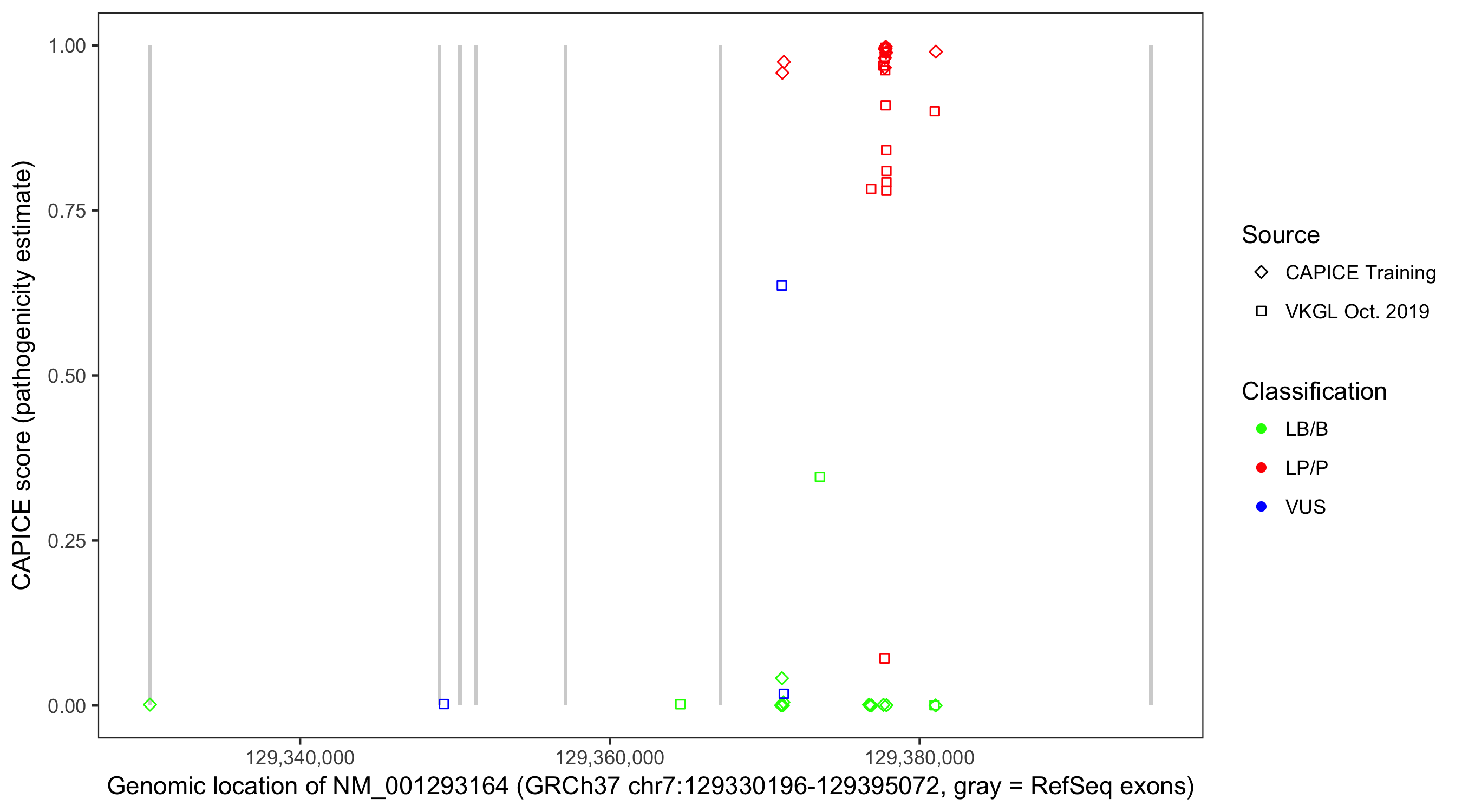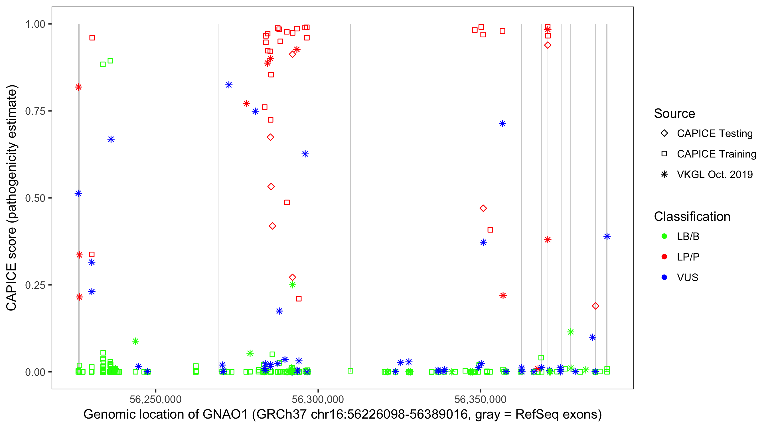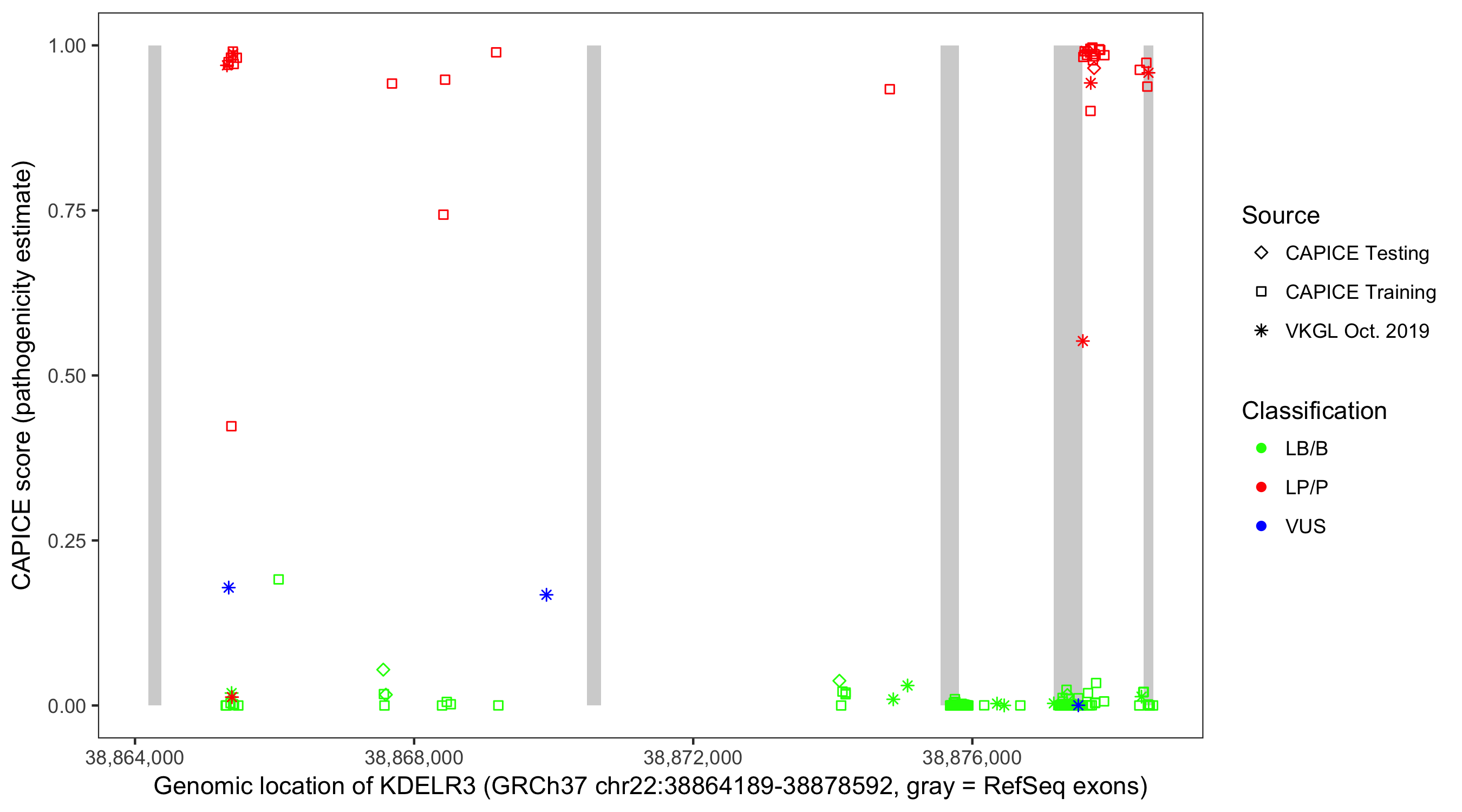 Shown are CAPICE train/test variants plus VKGL Oct 2019.