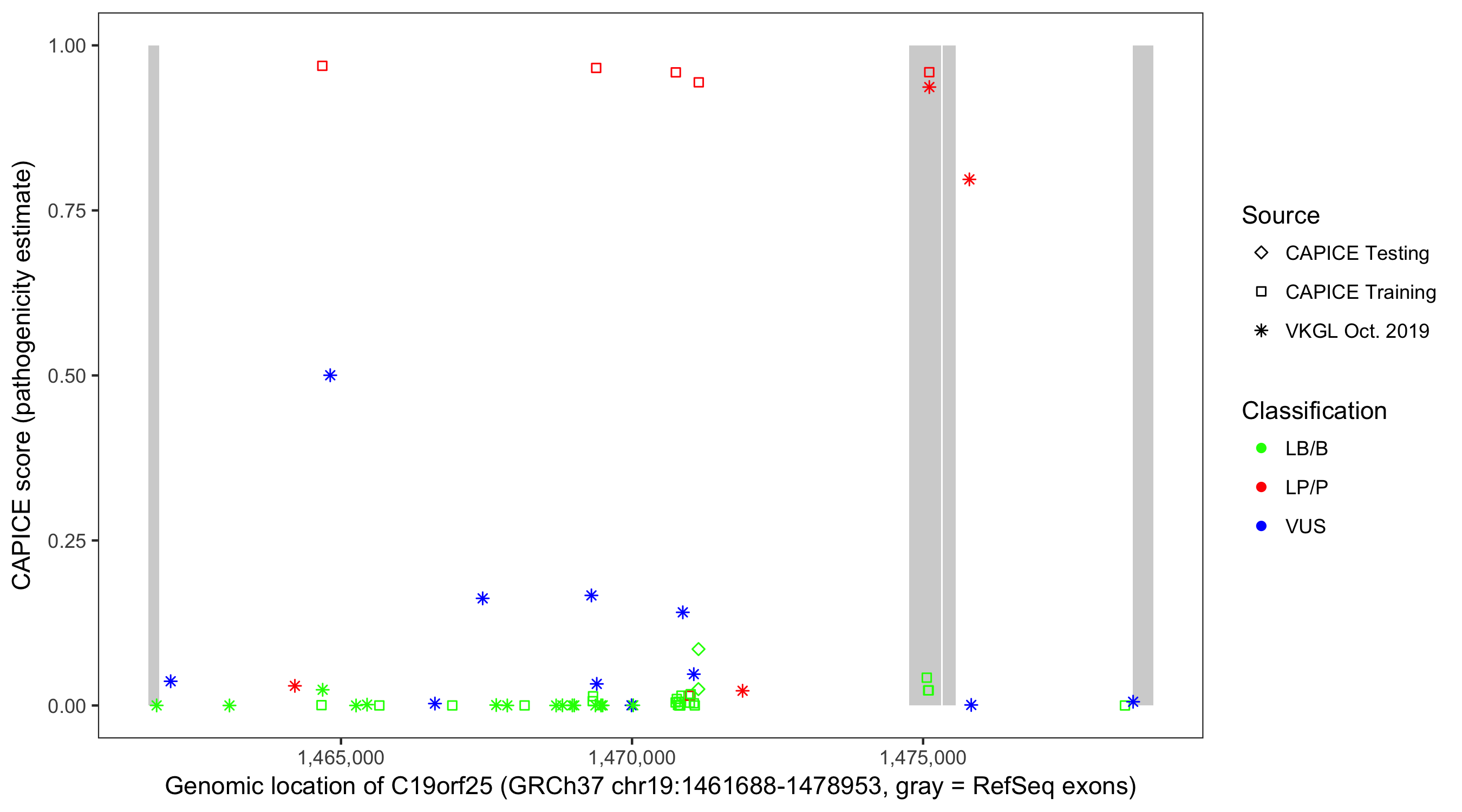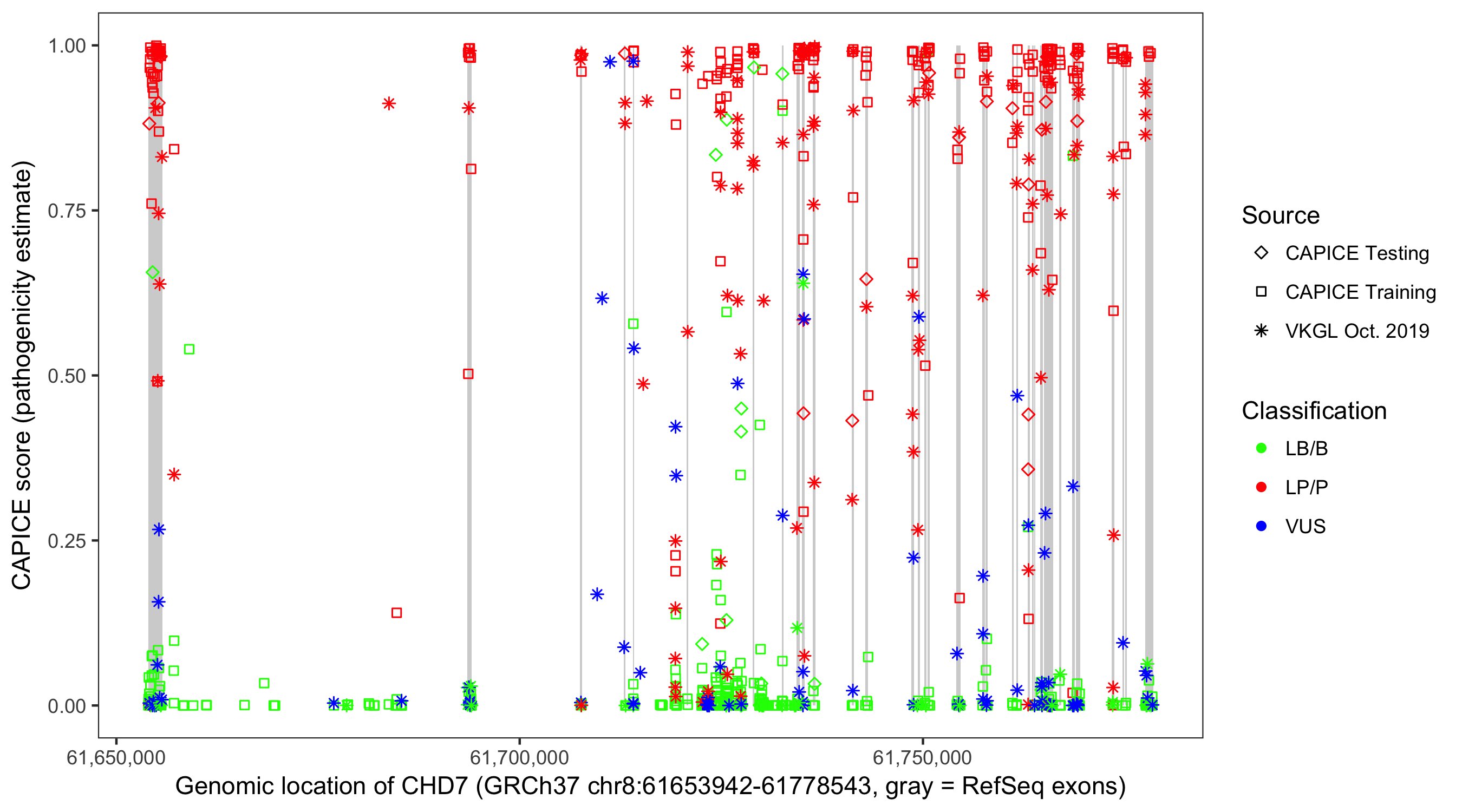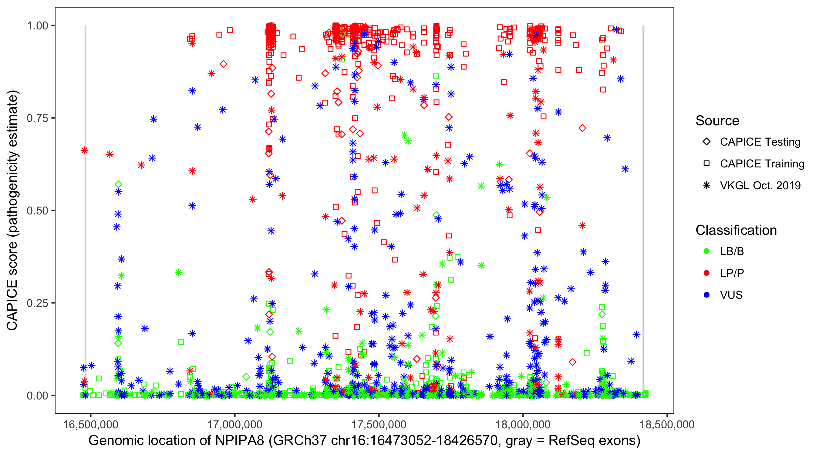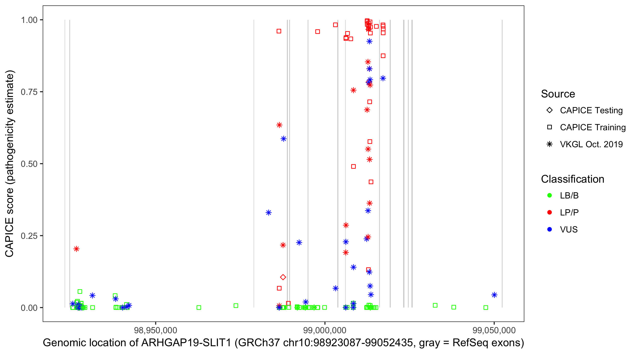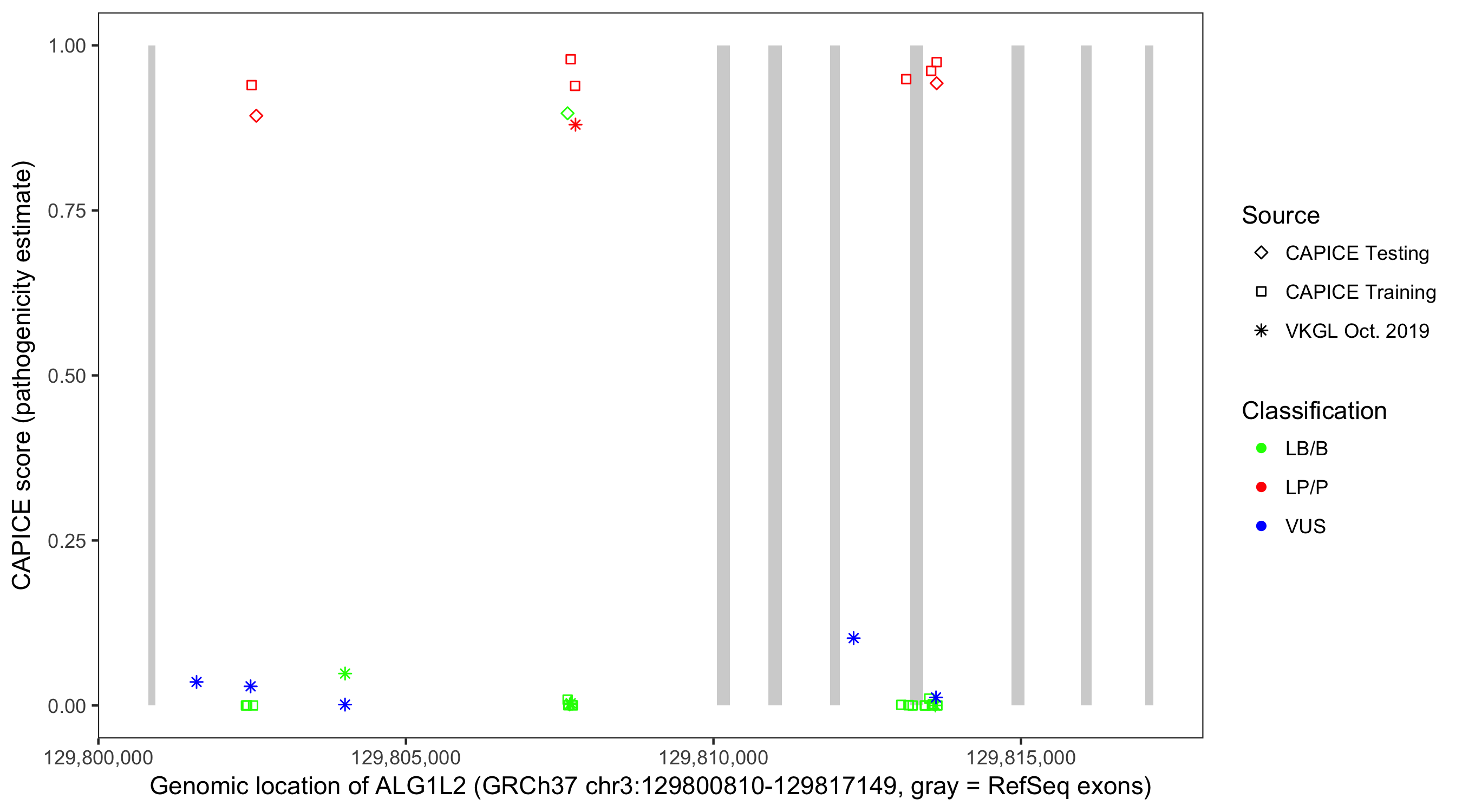 Shown are CAPICE train/test variants plus VKGL Oct 2019.