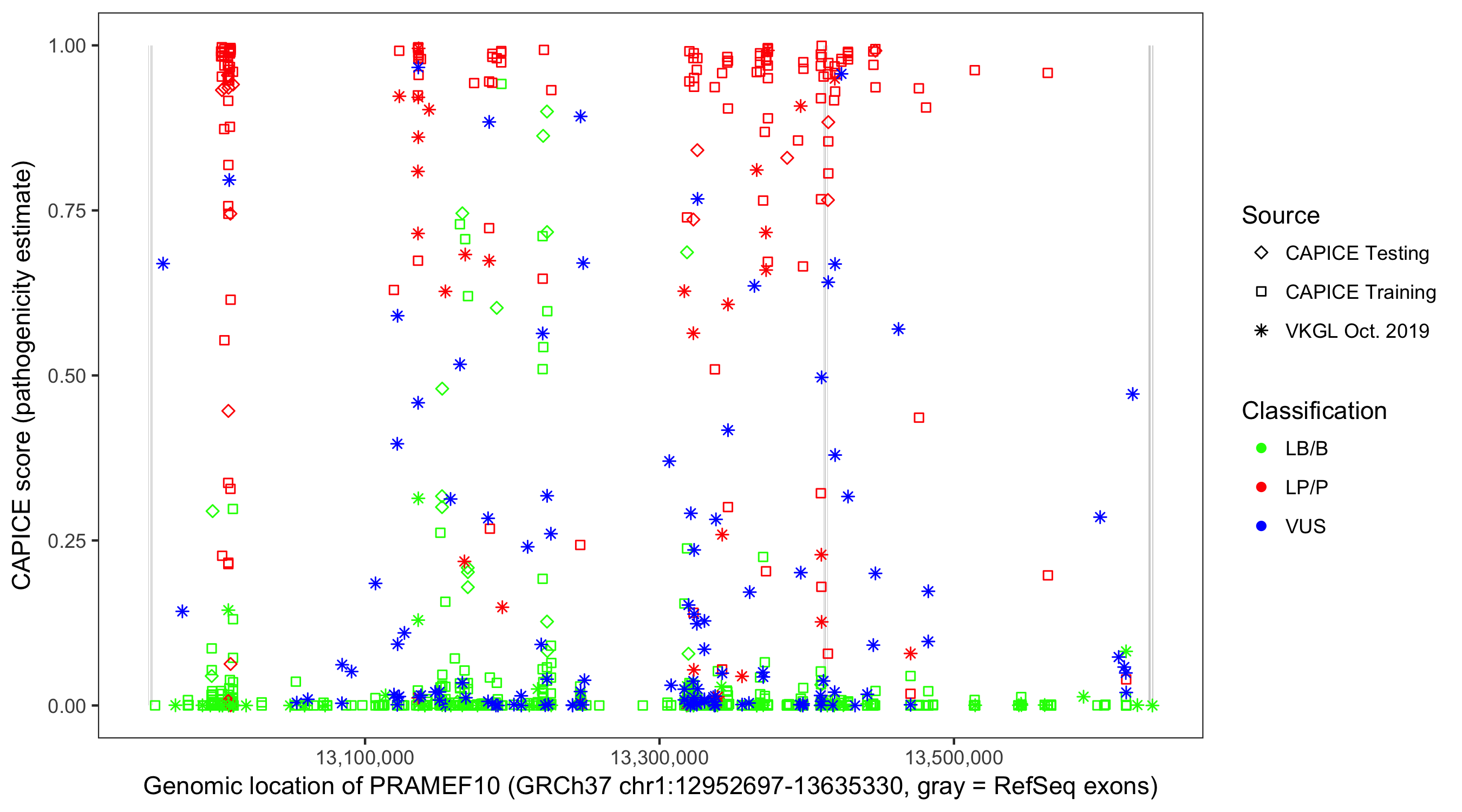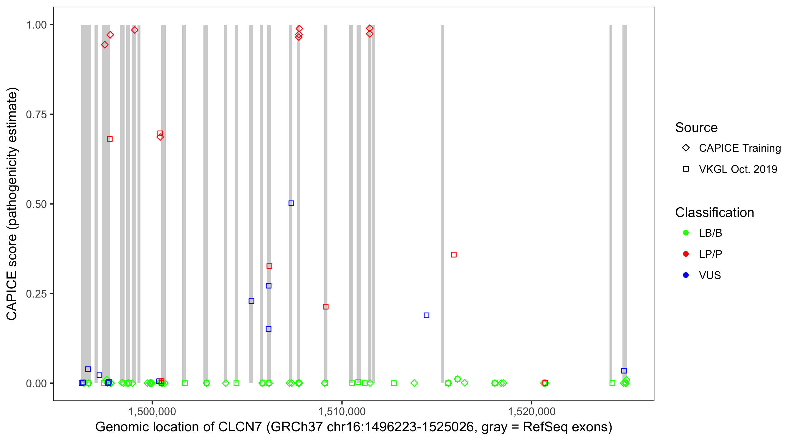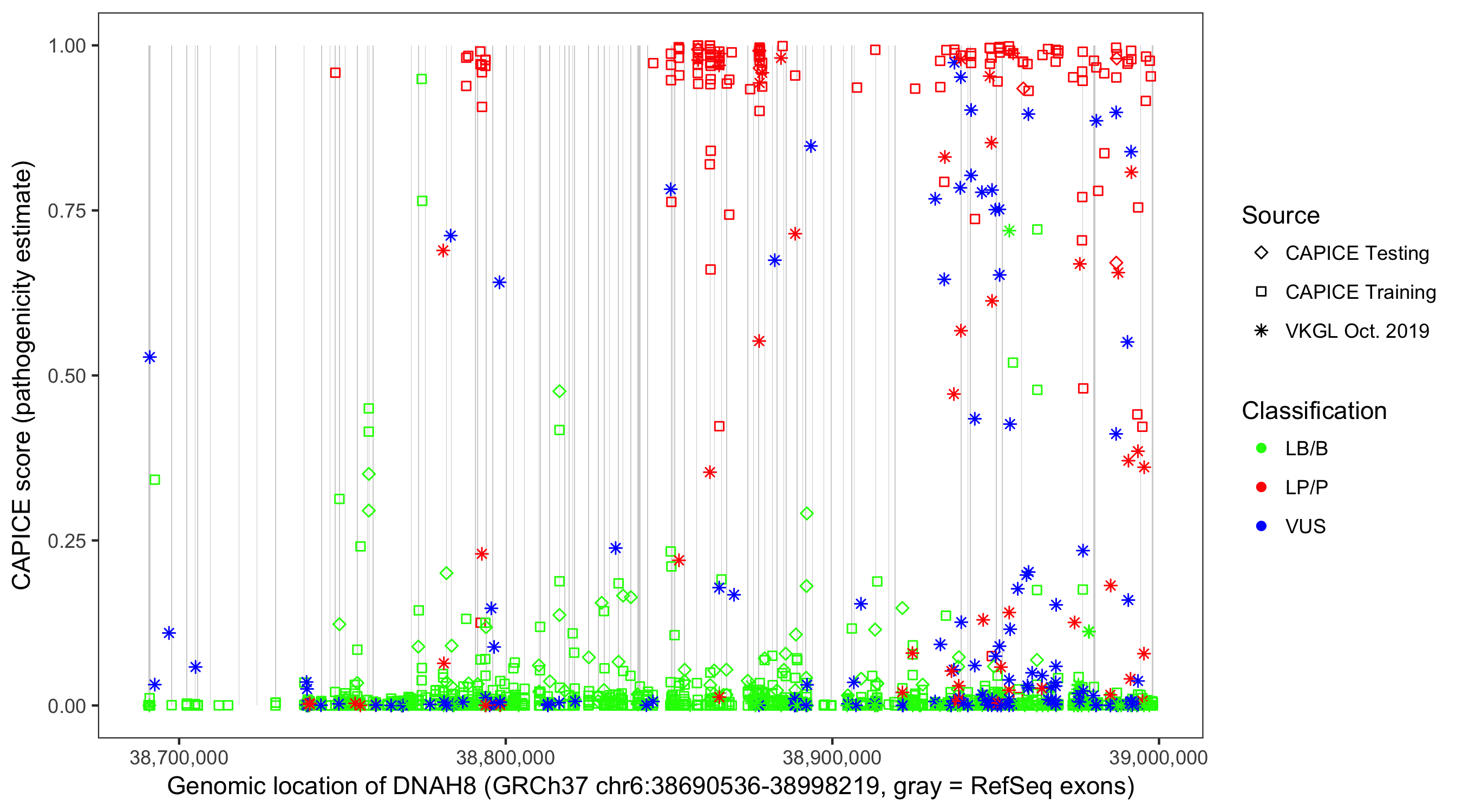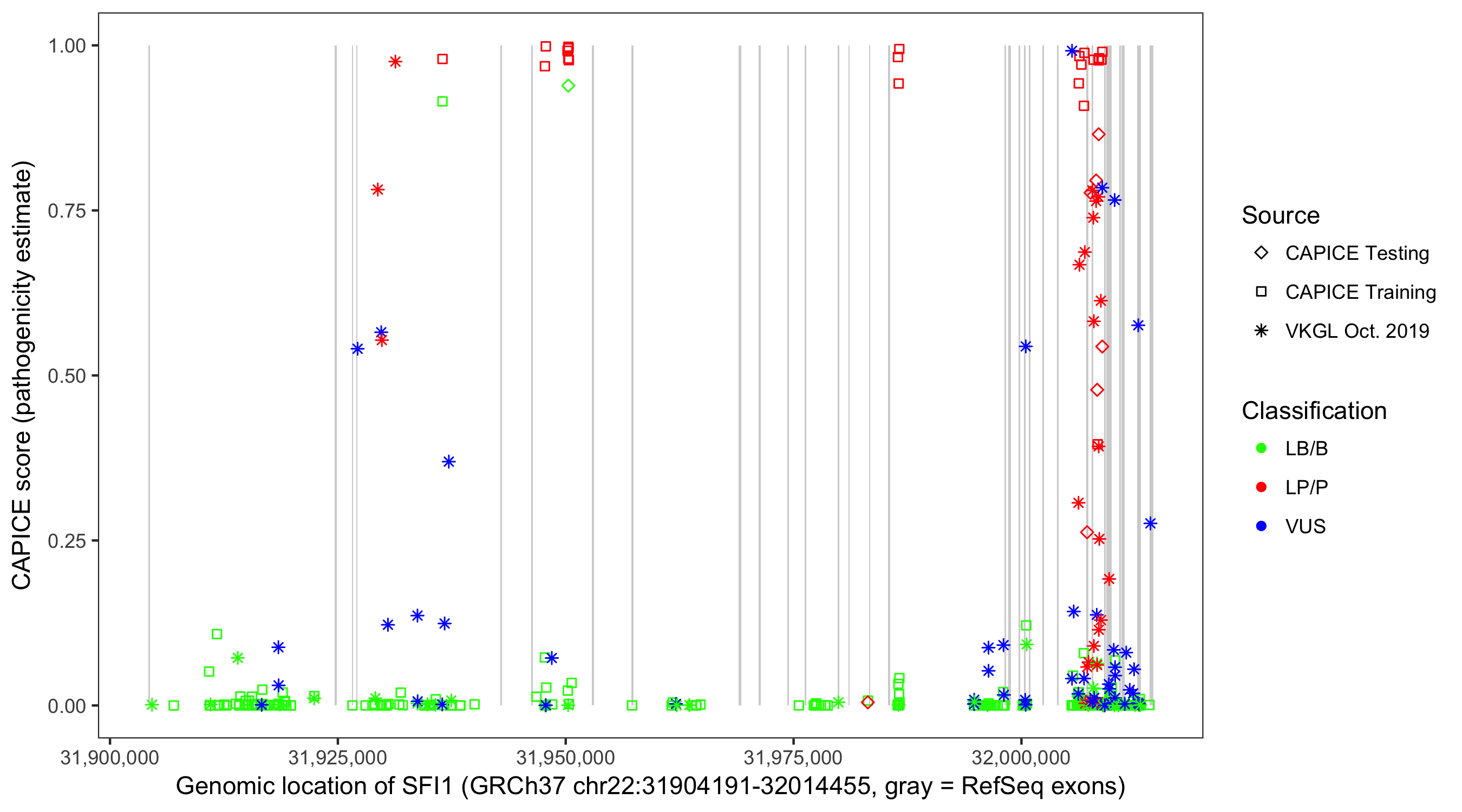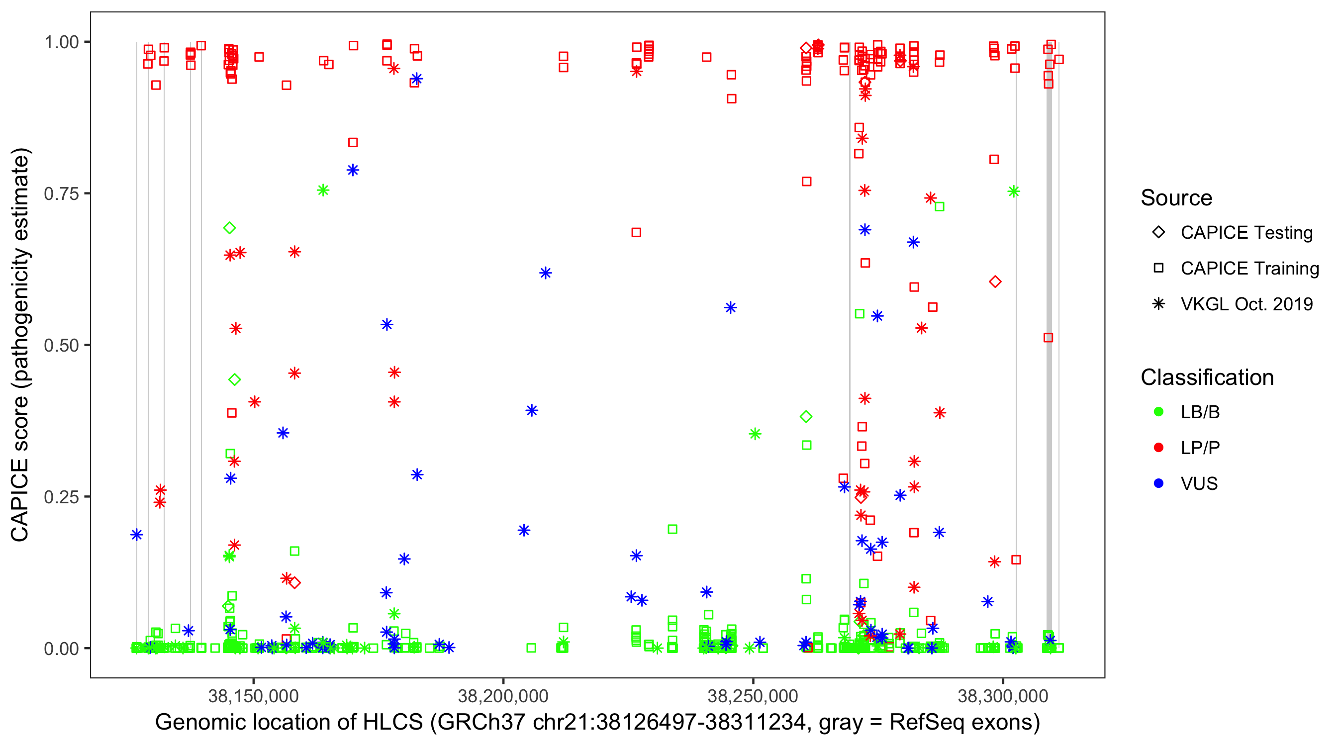 Shown are CAPICE train/test variants plus VKGL Oct 2019.