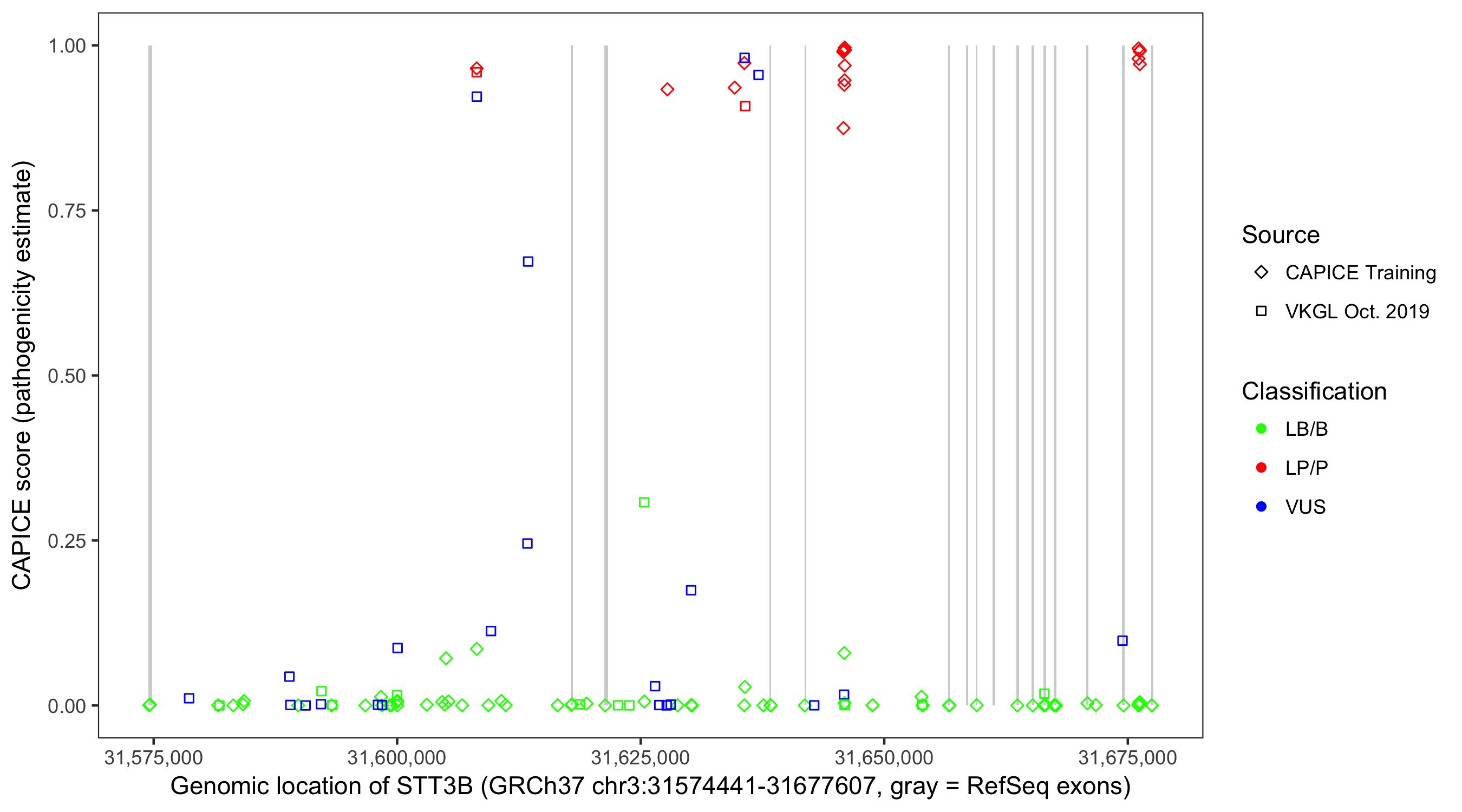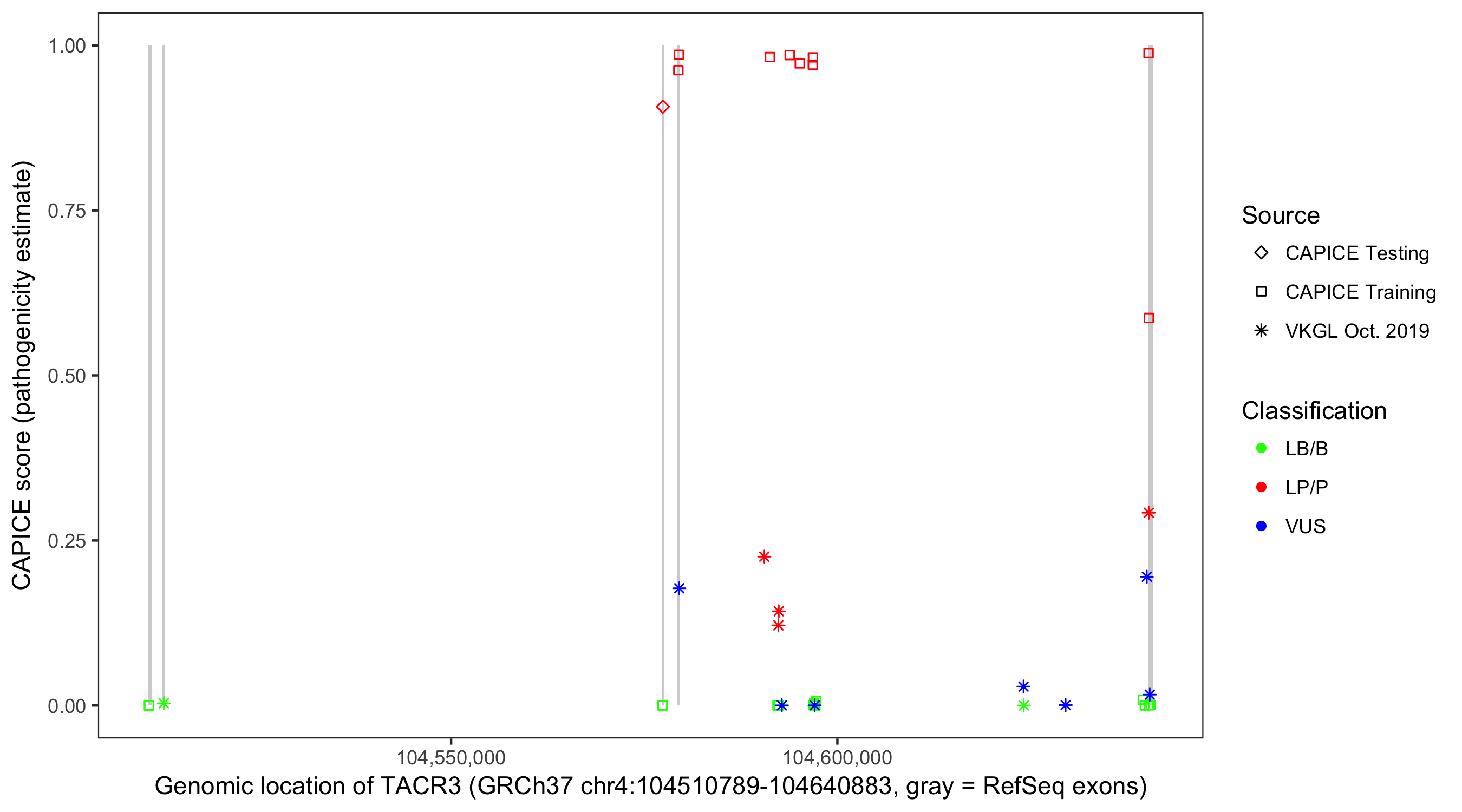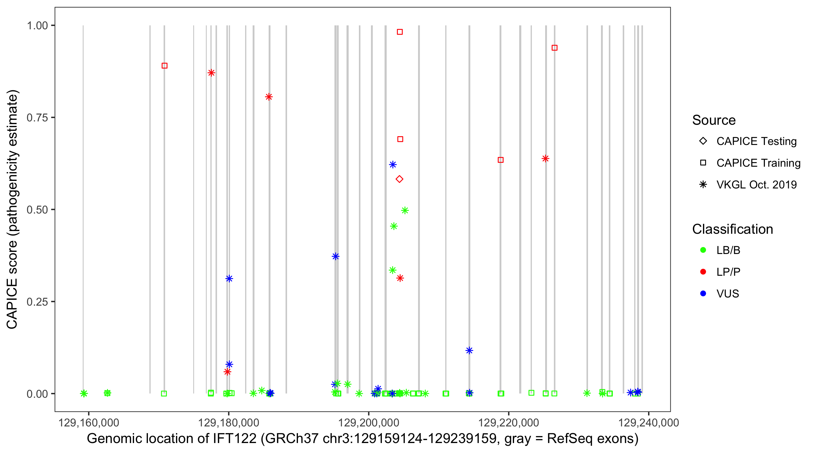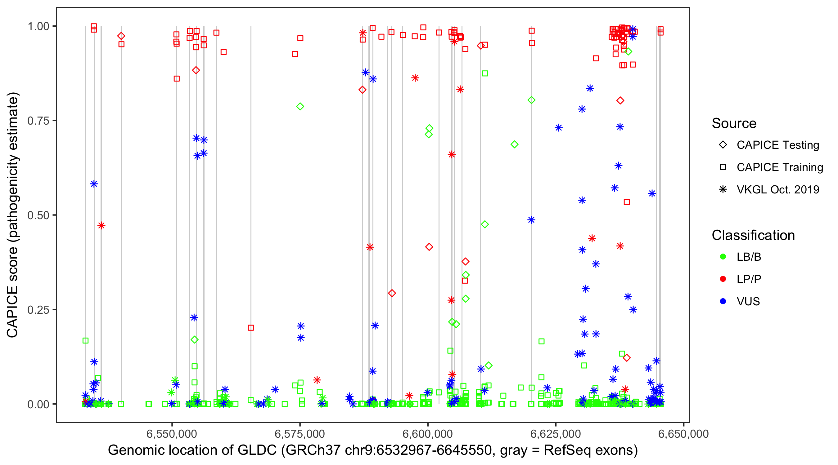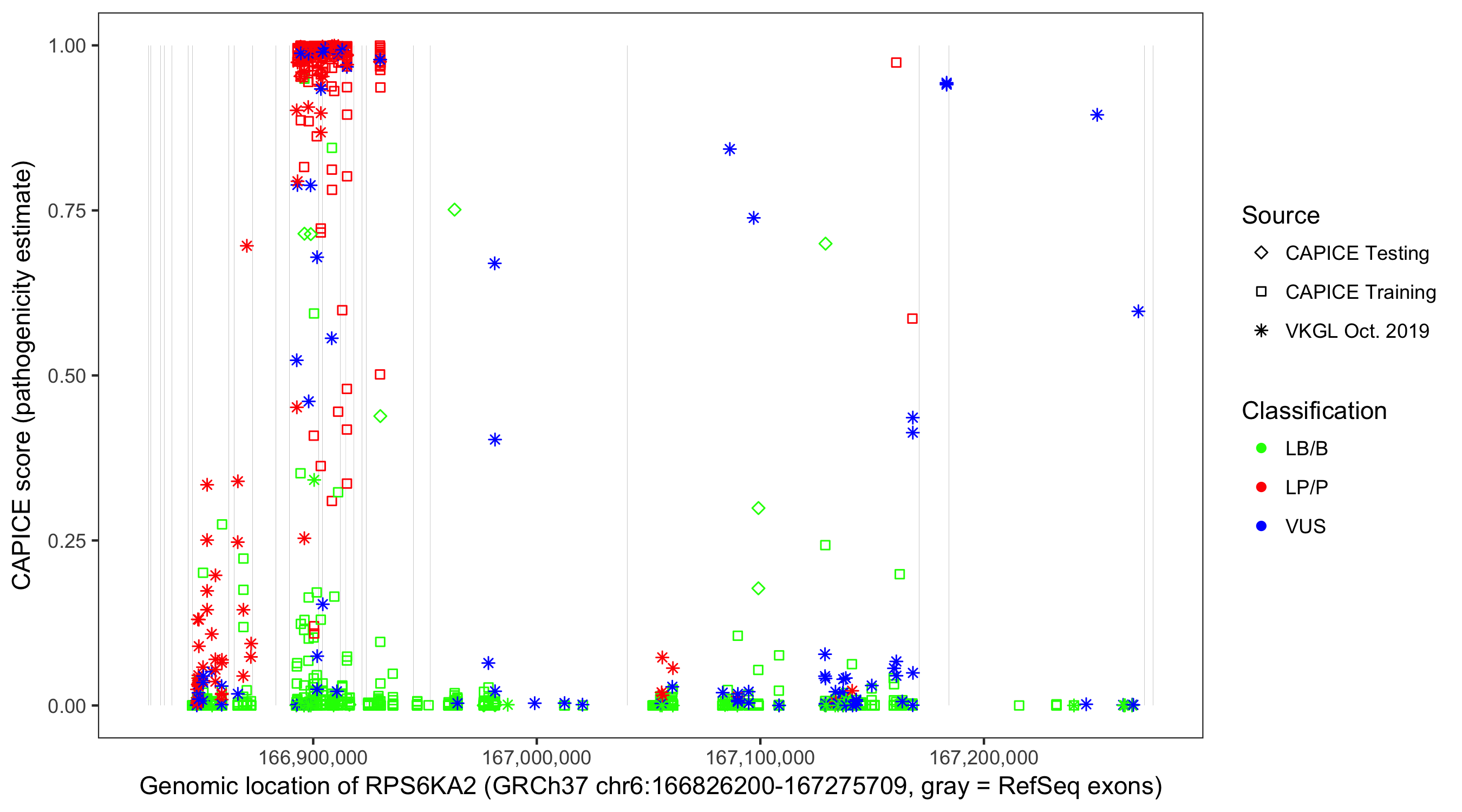 Shown are CAPICE train/test variants plus VKGL Oct 2019.